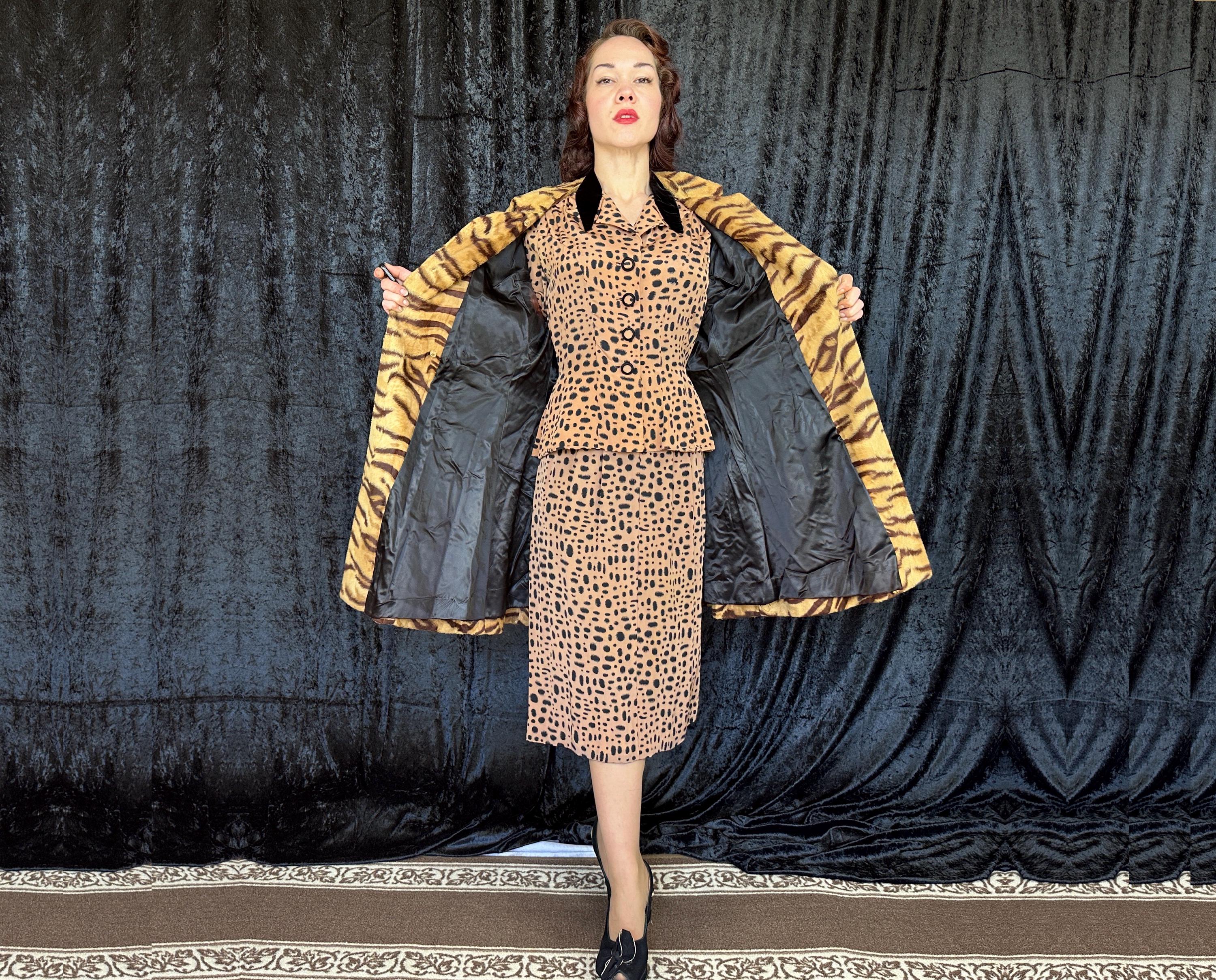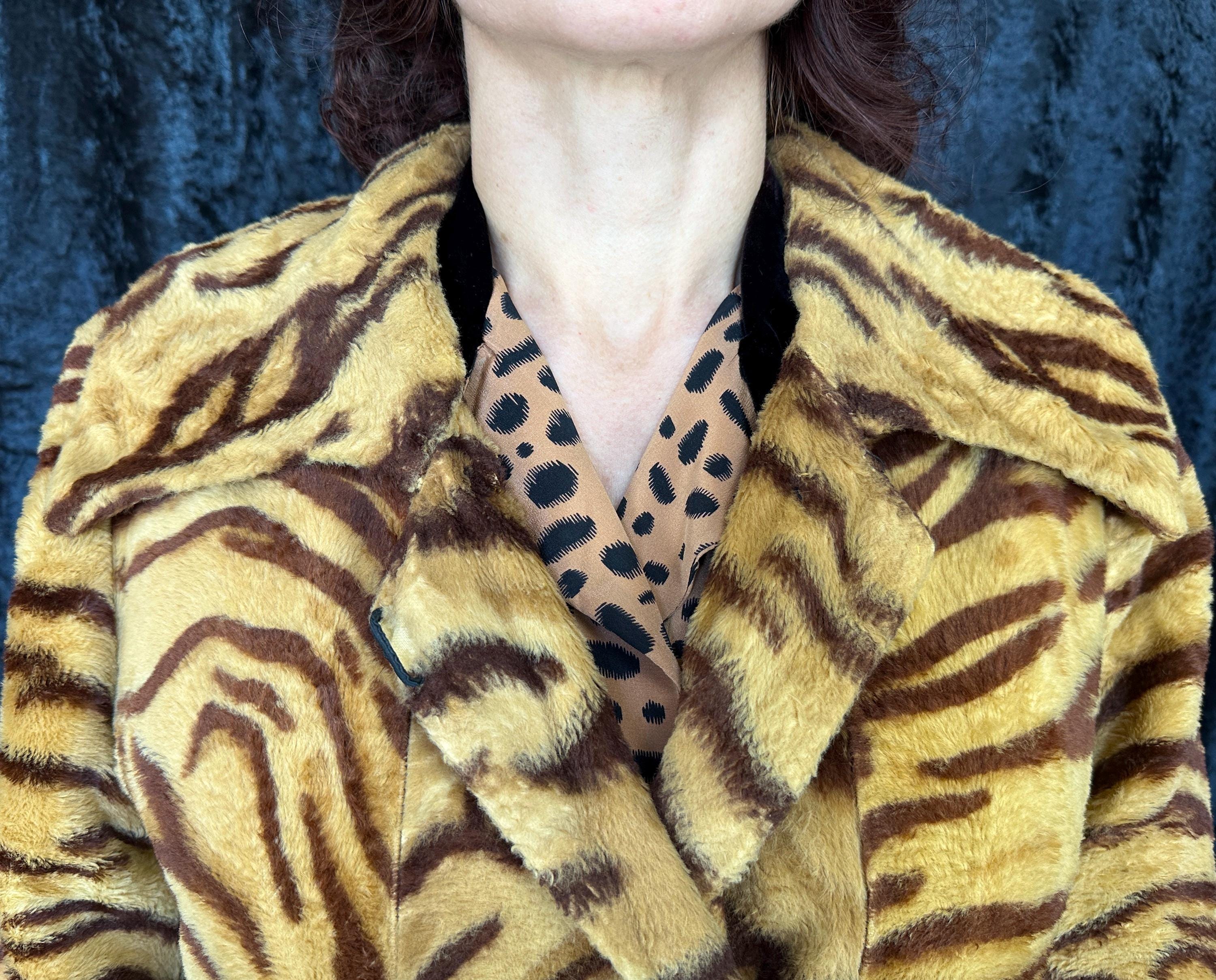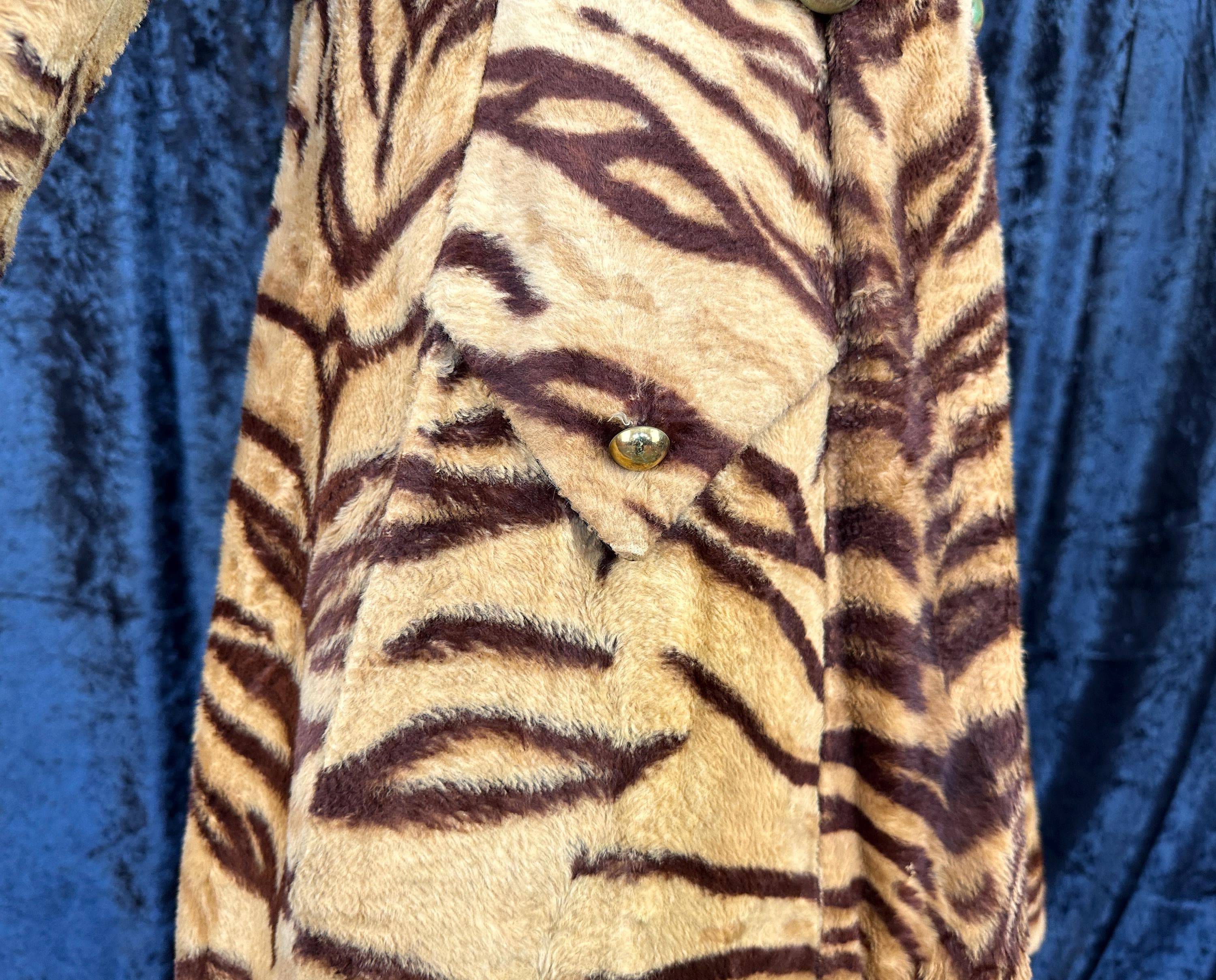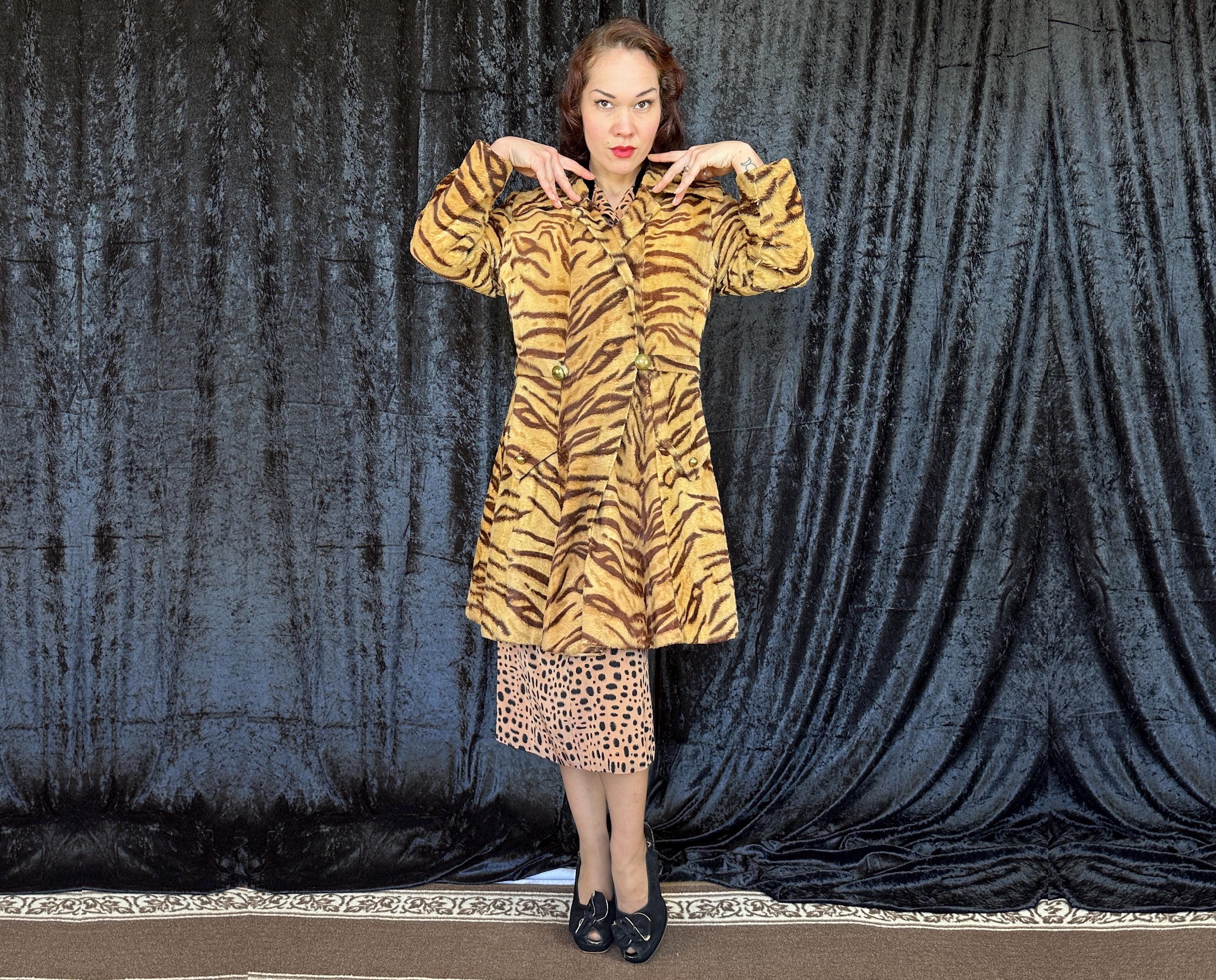Take a walk on the wild with this 1960s coat and show that sassy snarl! Fully lined with black rayon satin, the outer shell is a cozy short nap faux tiger fur. It has a wide lapel that can be worn bundled up or with the notched points laid out and side seam pockets are decorated with flaps topped with brass buttons. A self-belt lays across the back and part way on the front with the ends adorned with larger brass buttons and are just shy of meeting. Hidden snaps are used in addition to the neck and waist buttons. From "Roos/Atkins". This coat is in great vintage condition, the buttons show wear but no holes, stains, or odors to note.