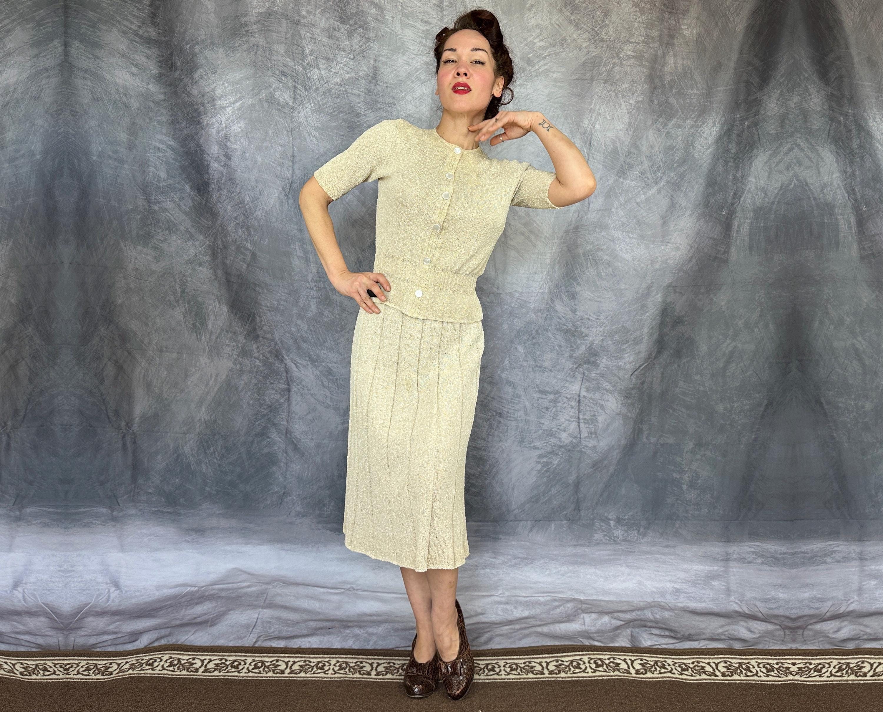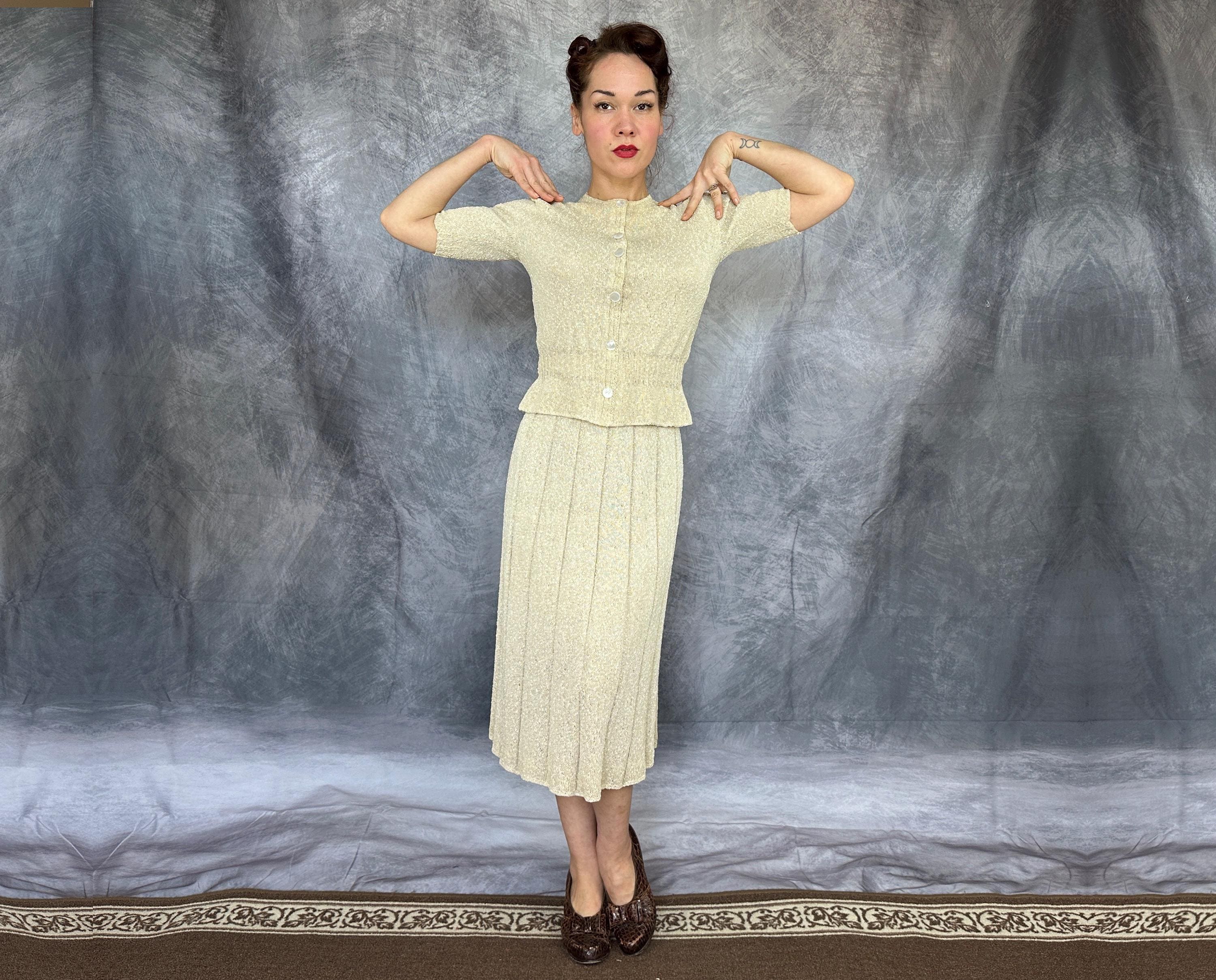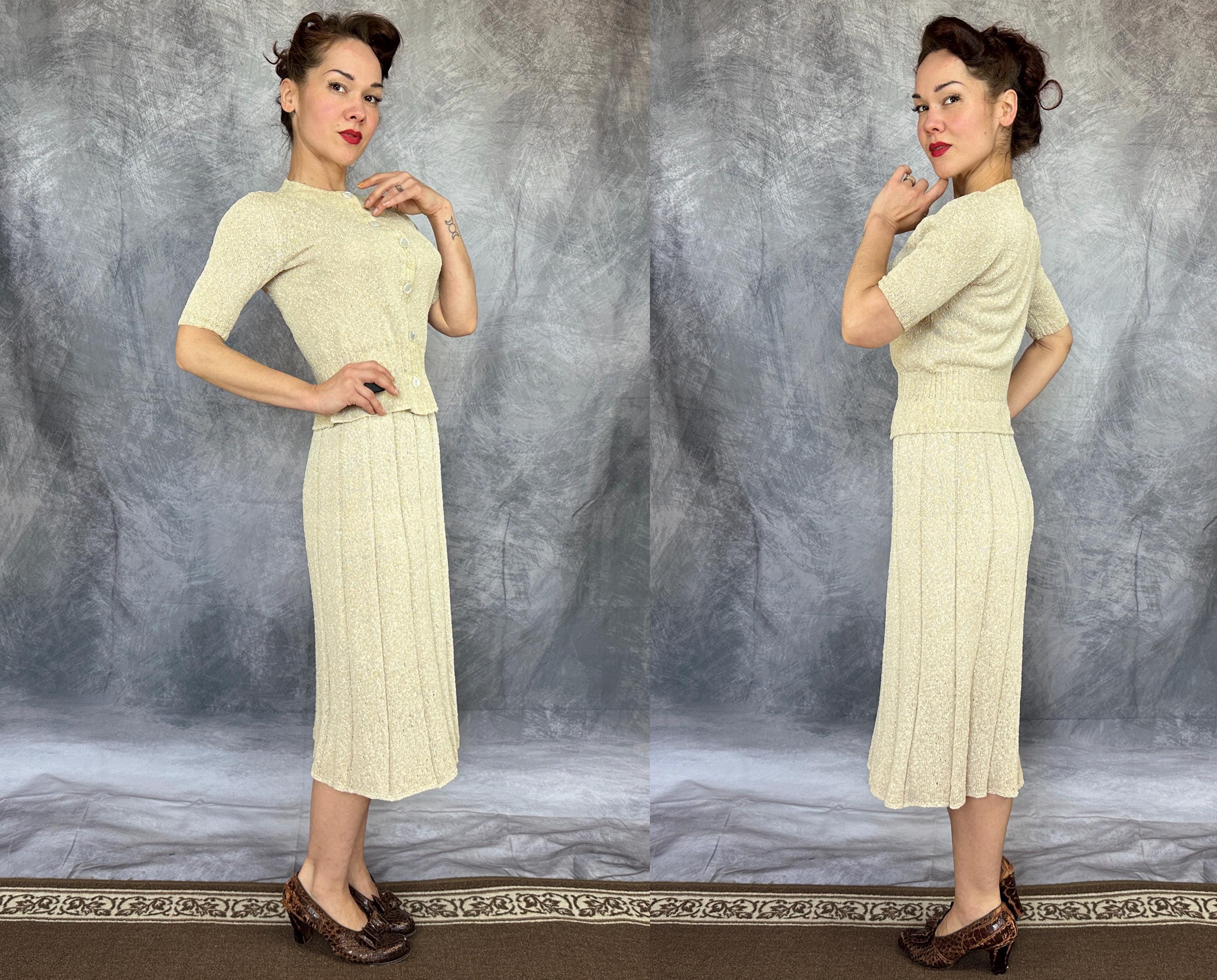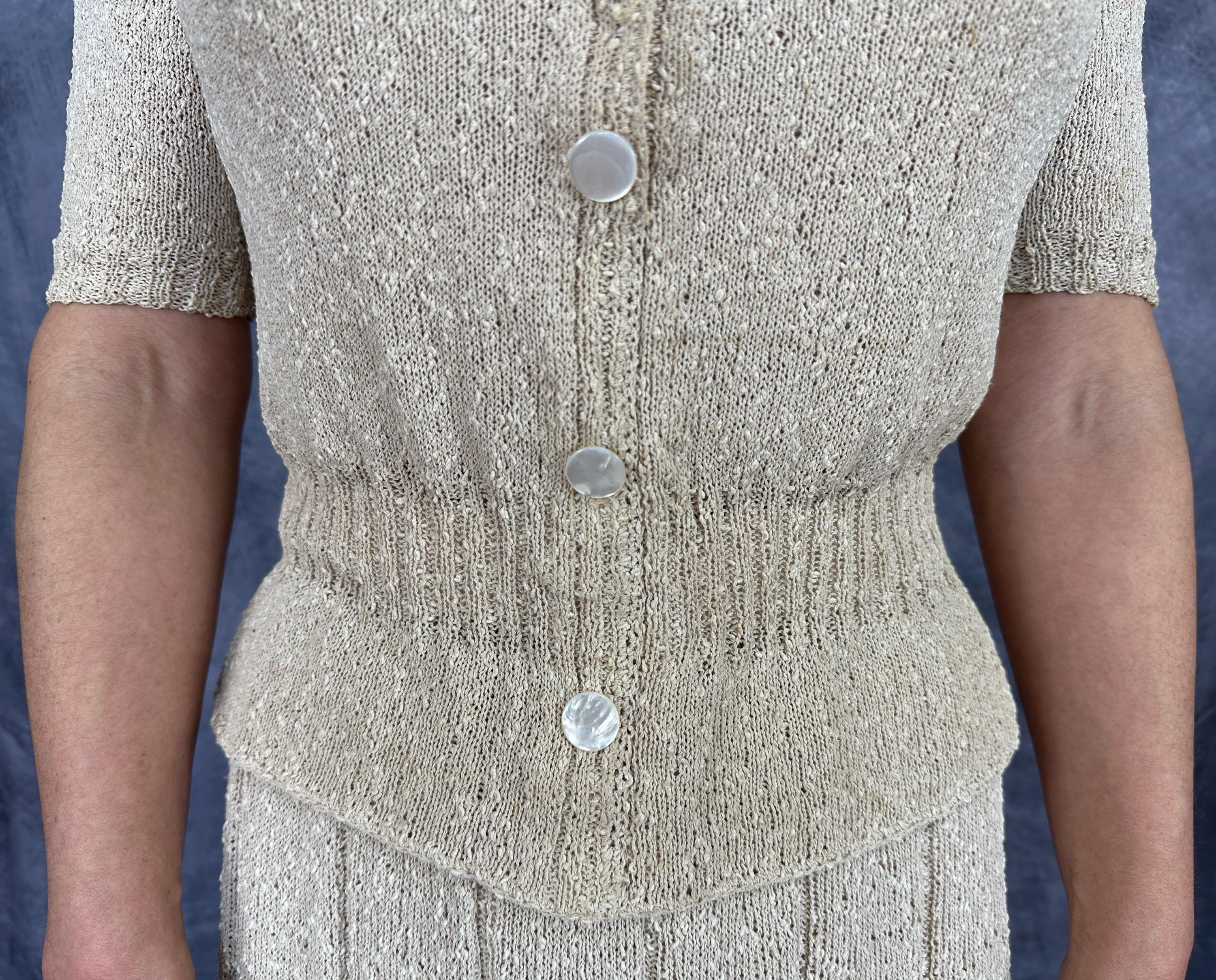 You'll be as alluring as a siren on a tropical beach in this 1940s knit set! The rayon boucle combines the silky drape of rayon with the curve loving stretch of knit for a match in paradise only further emphasized by it's colour reminiscent of white sandy beaches. The top features decorative shell buttons with snaps behind as the real closure and a wide ribbed waist with a small peplum and sleeves with lightly gathered shoulders and more petite ribbing. The skirt has a full elastic waist and is striped with narrow ribbing allowing wide bands of the main stitch. This set is in great vintage condition, with no holes, stains, or odors to note.