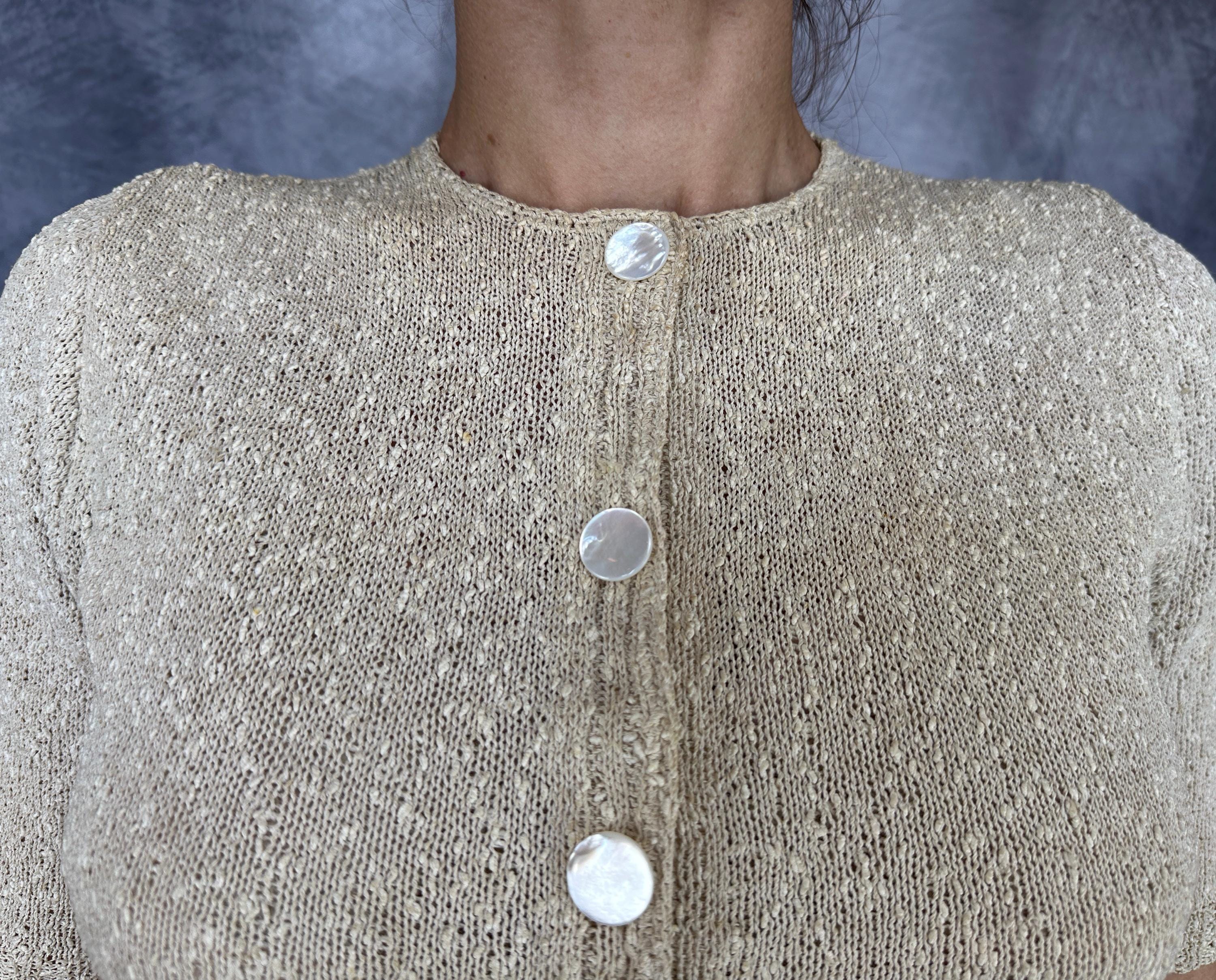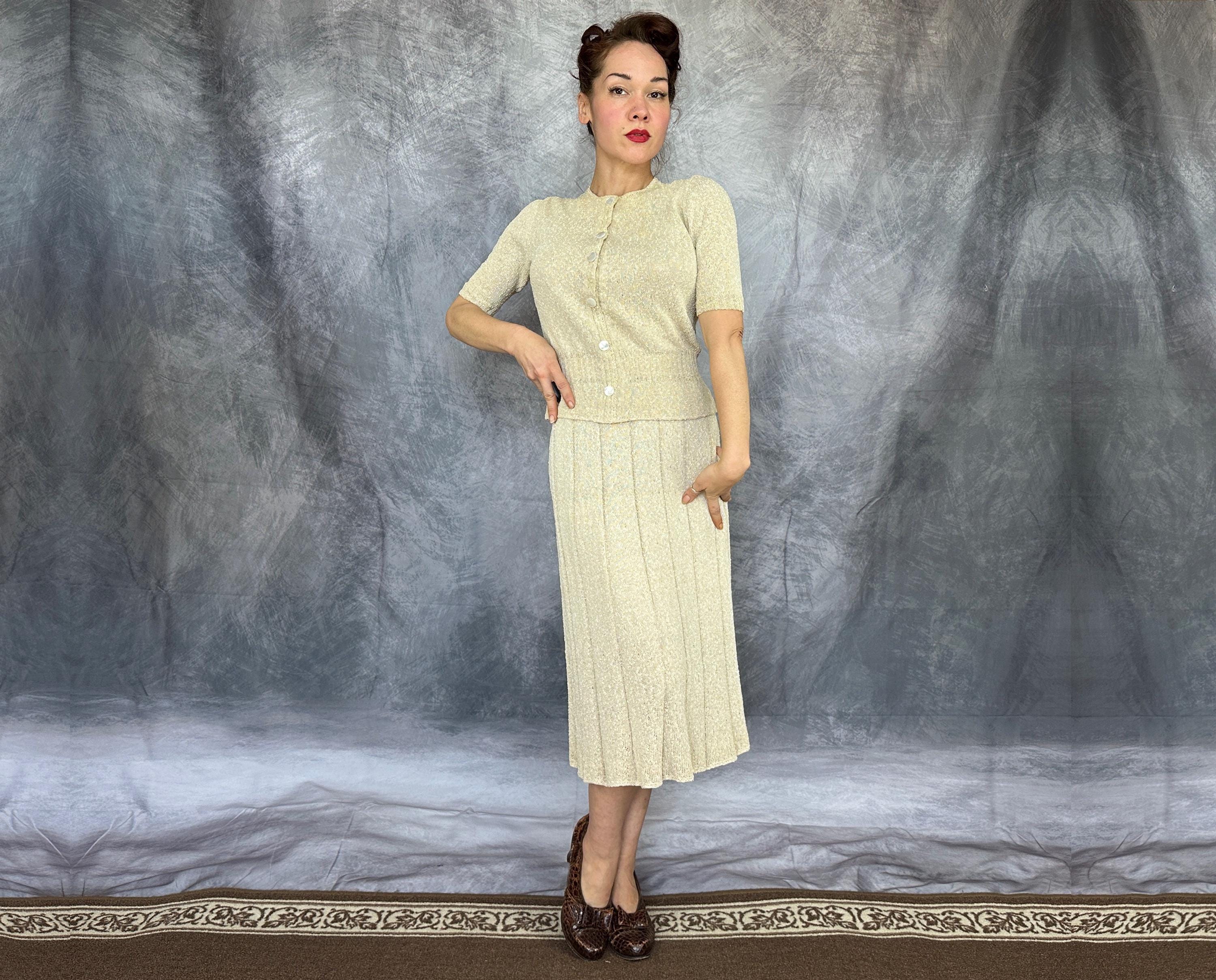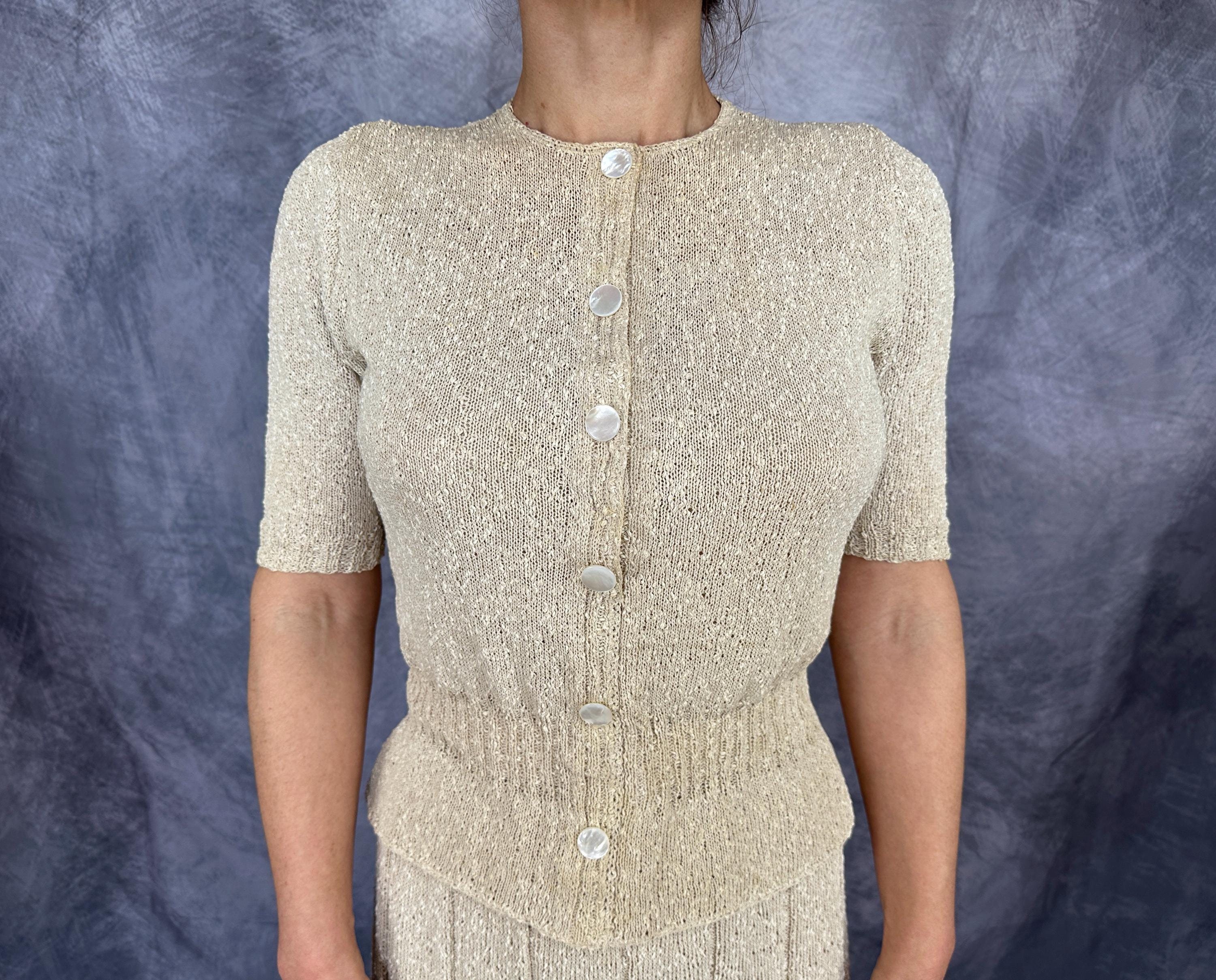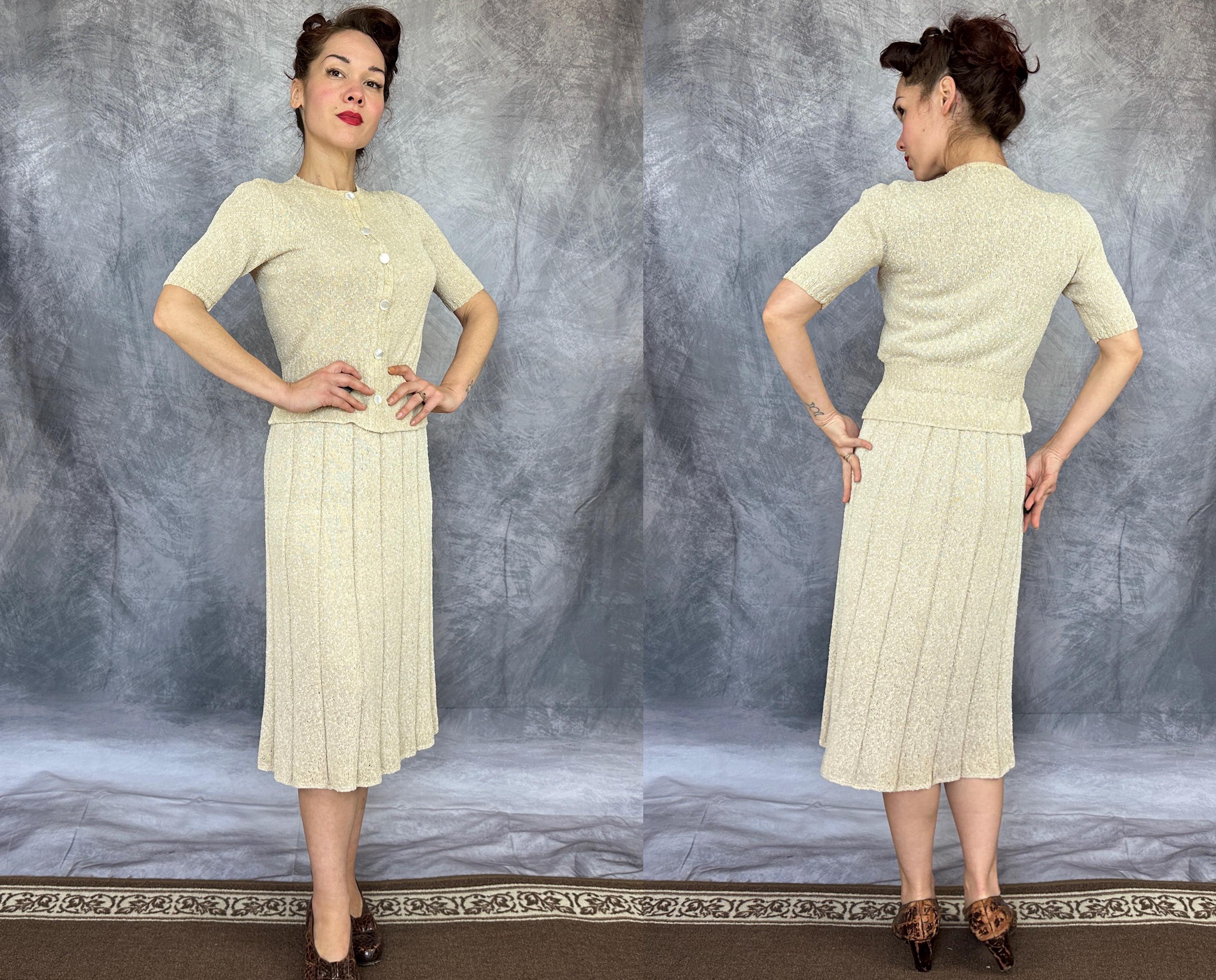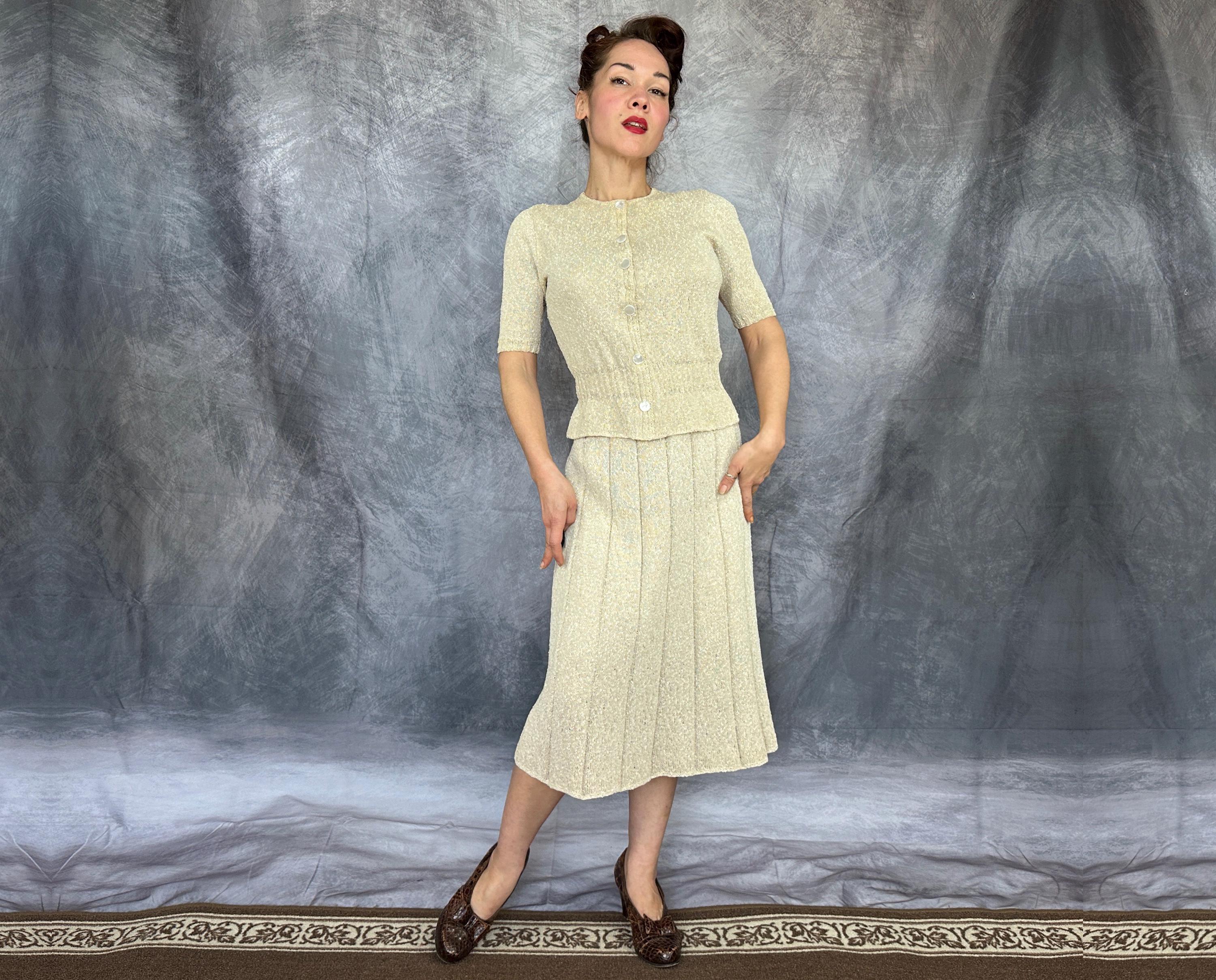 You'll be as alluring as a siren on a tropical beach in this 1940s knit set! The rayon boucle combines the silky drape of rayon with the curve loving stretch of knit for a match in paradise only further emphasized by it's colour reminiscent of white sandy beaches. The top features decorative shell buttons with snaps behind as the real closure and a wide ribbed waist with a small peplum and sleeves with lightly gathered shoulders and more petite ribbing. The skirt has a full elastic waist and is striped with narrow ribbing allowing wide bands of the main stitch. This set is in great vintage condition, with no holes, stains, or odors to note.