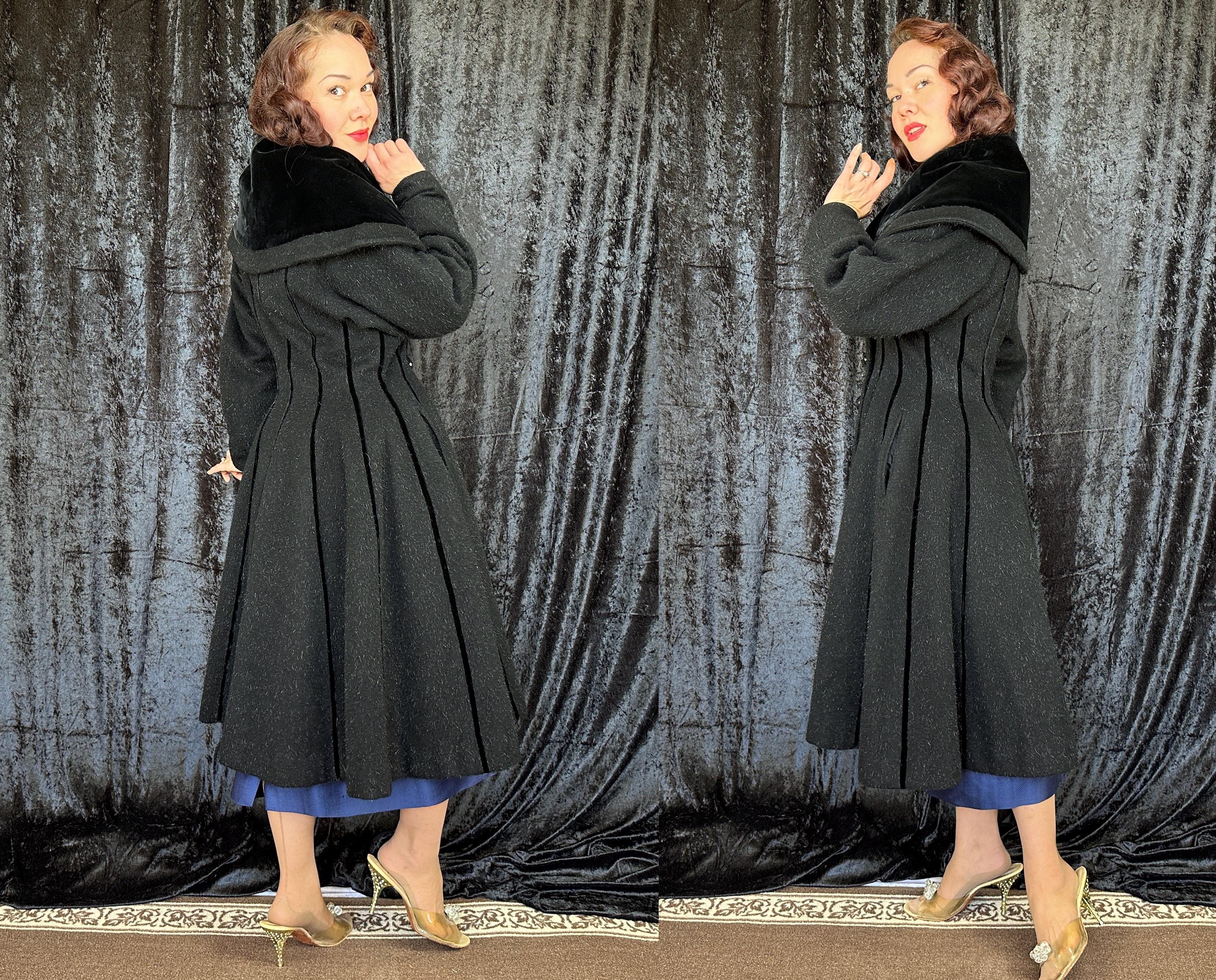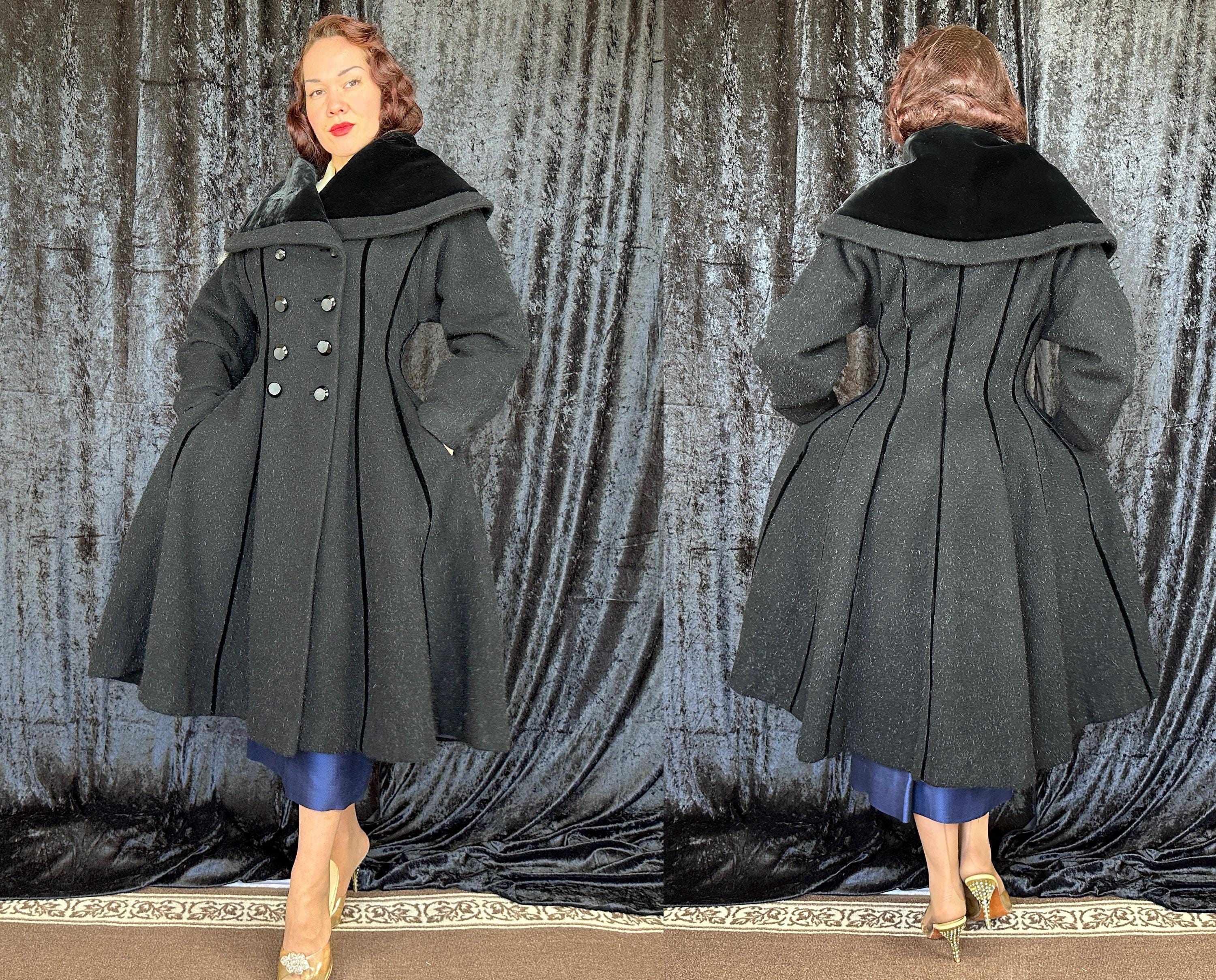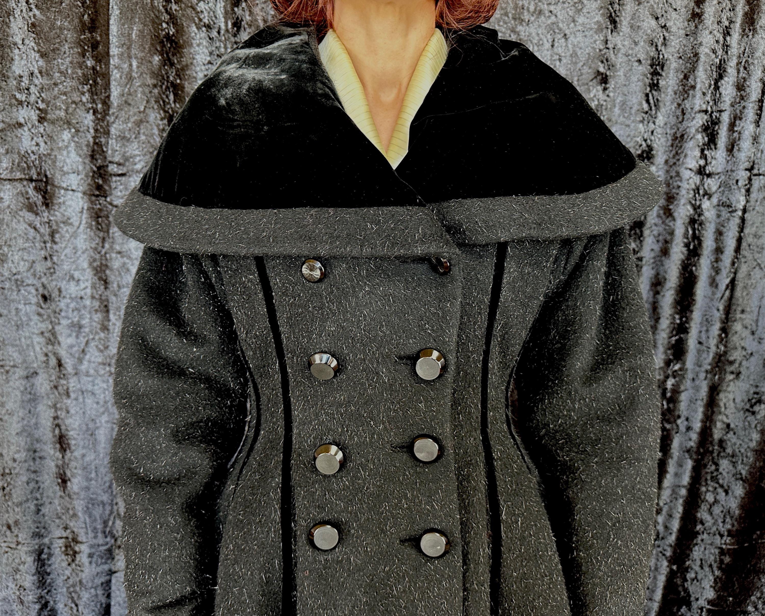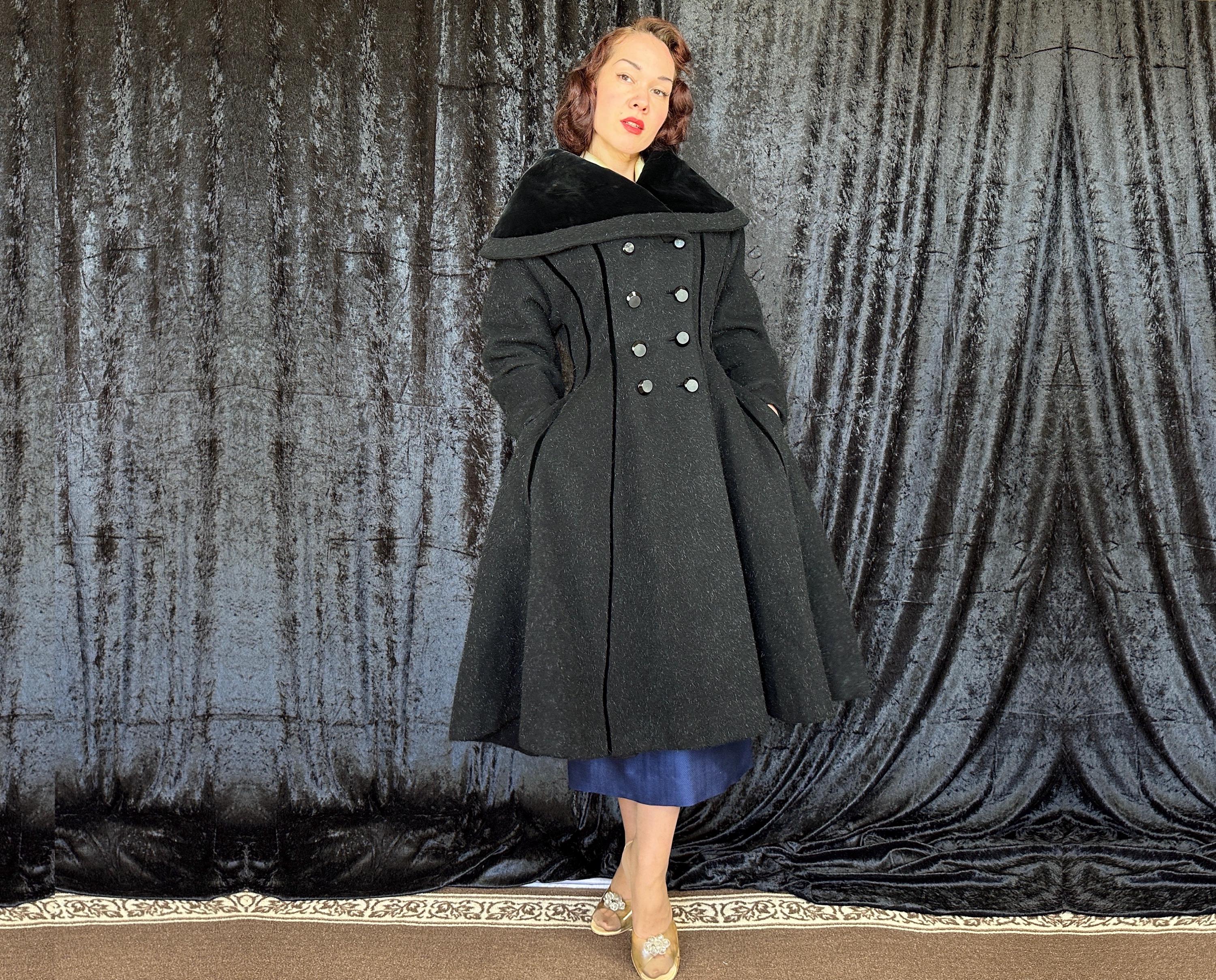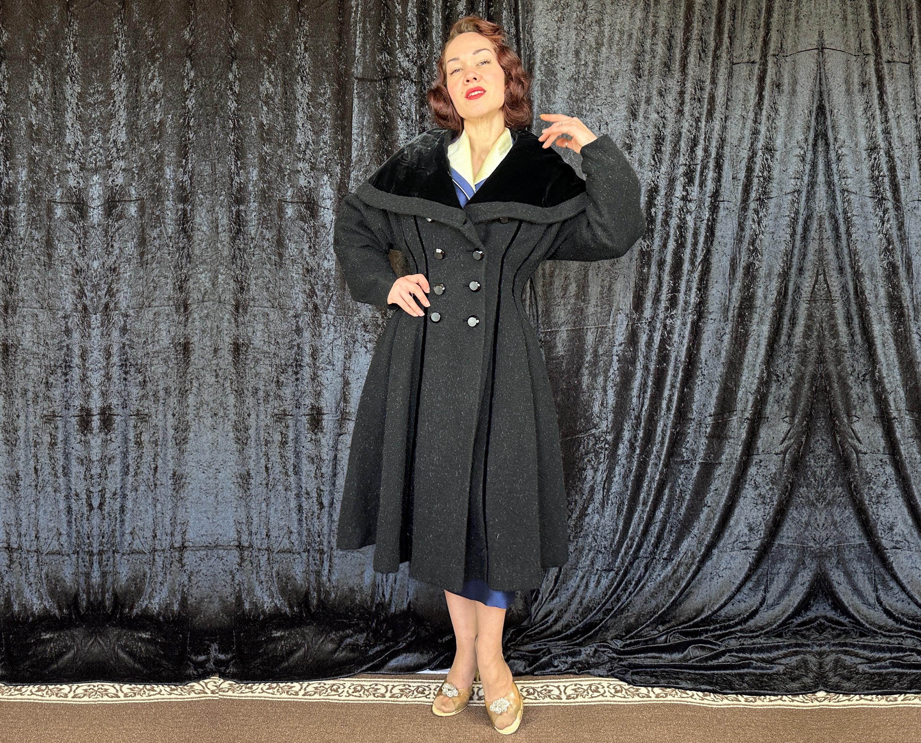 When you show up in this 1950s coat no one will question who the Grand Dame is! This iconic "Lilli Ann" princess coat brings the drama in many ways but the oversized shawl collar has got to be the favourite element with its ability to stand tall framing the face like a gothic halo. The "Fabric of France" cloth is a black wool and mohair blend Lilli Ann was known for with the mohair adding a furry nap that shows as silvery highlights and velvet is used as an accent with stripes running fully down the body and lining the collar. It has an eight button double breasted closure and welted pockets are hidden in the ultra full skirt. The skirt is so full in fact that it doesn't even need a crinoline but the addition of one would be delightfully over the top! Fully lined in rayon satin. This coat is in great vintage condition, with no holes, stains, odors to note.