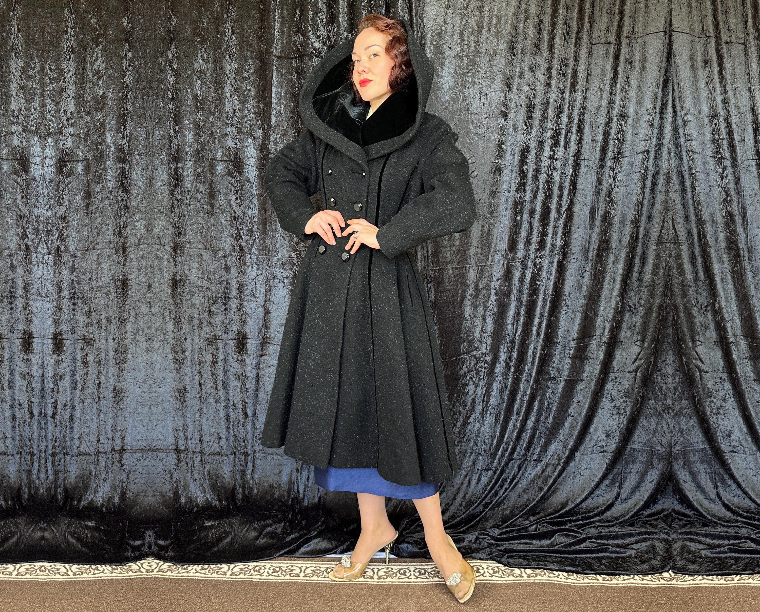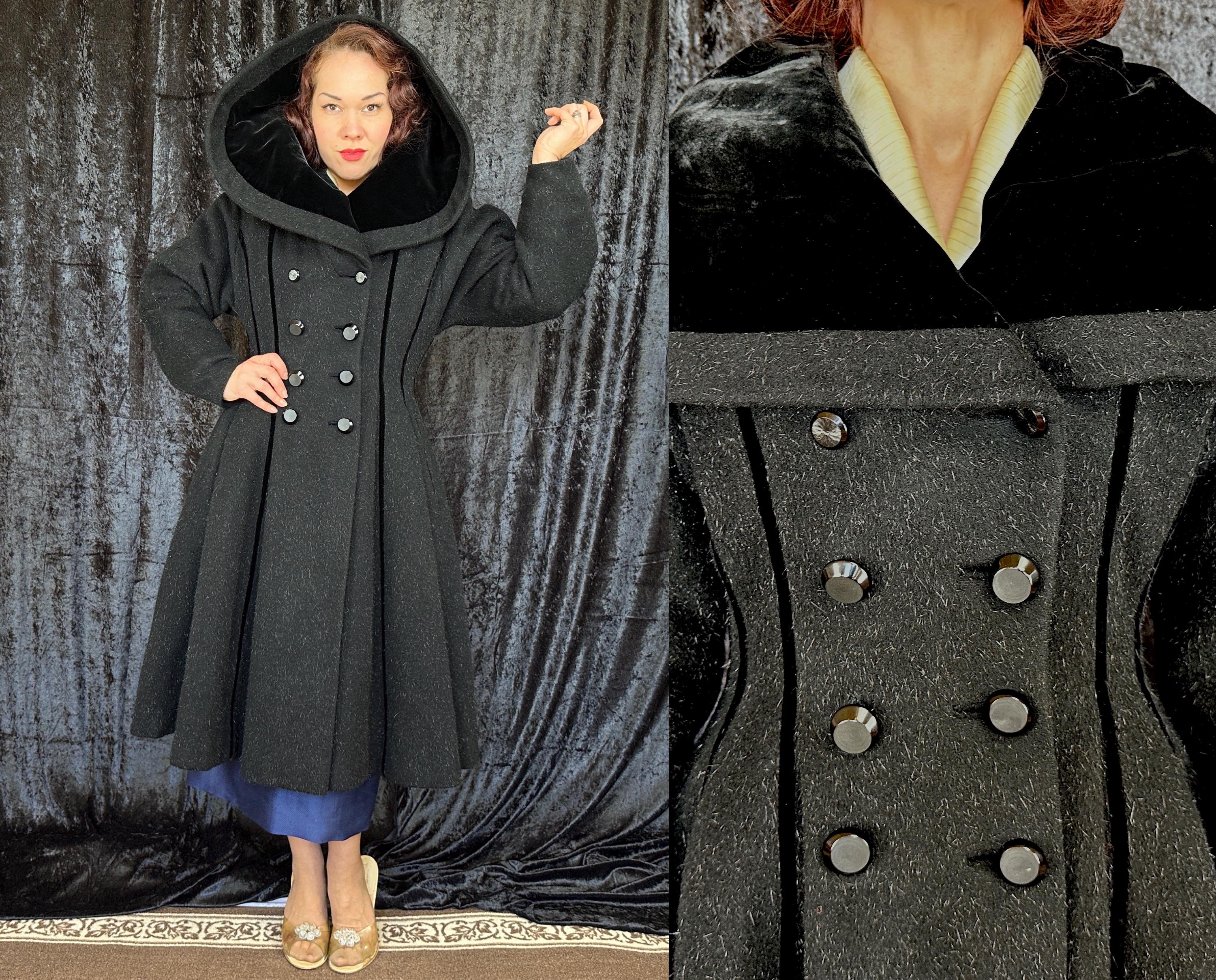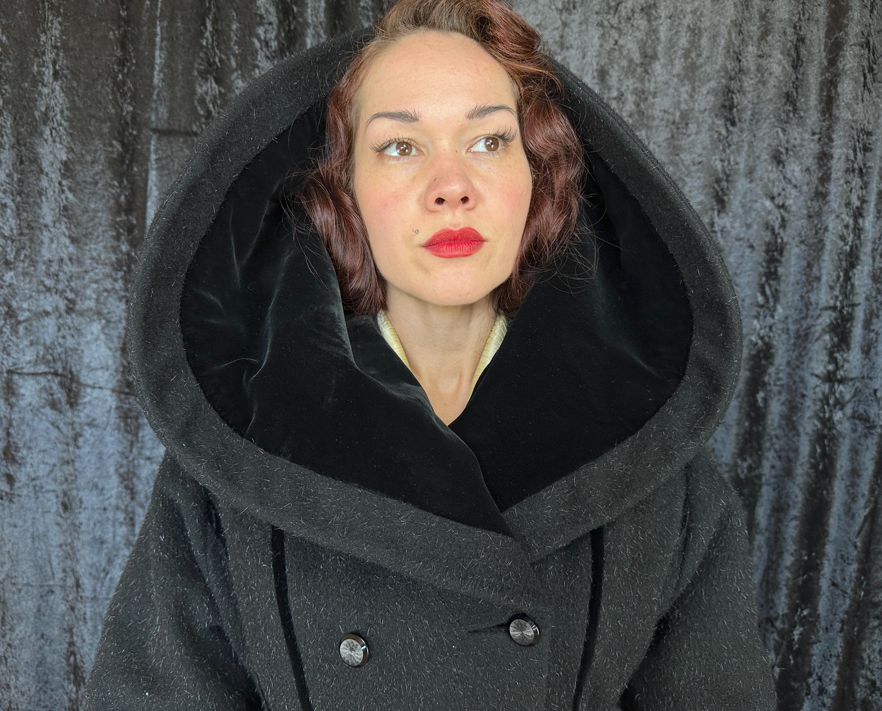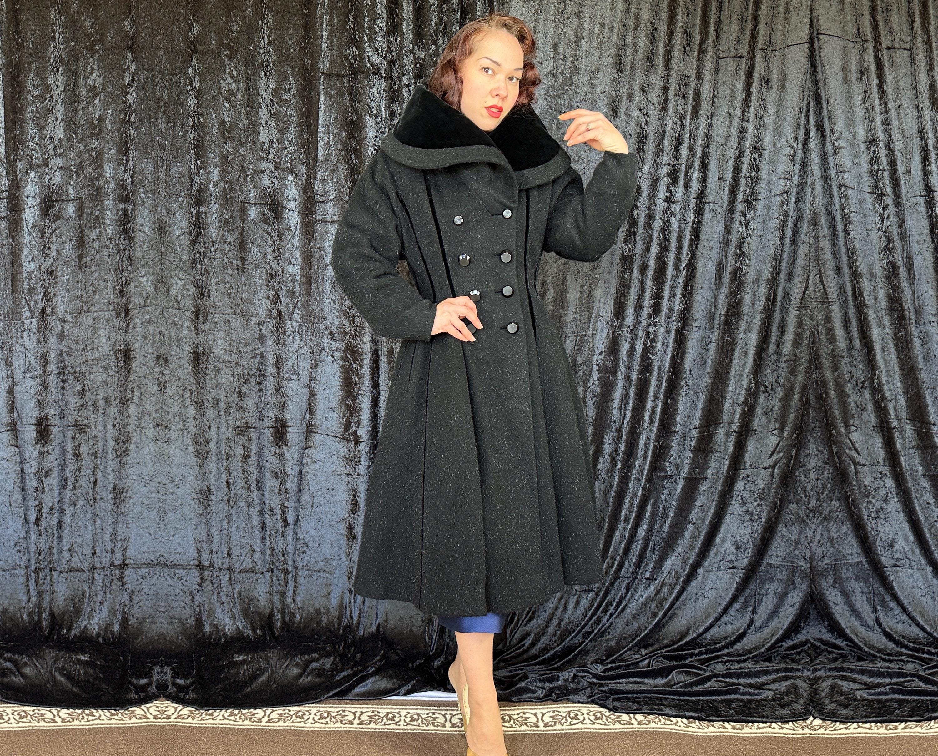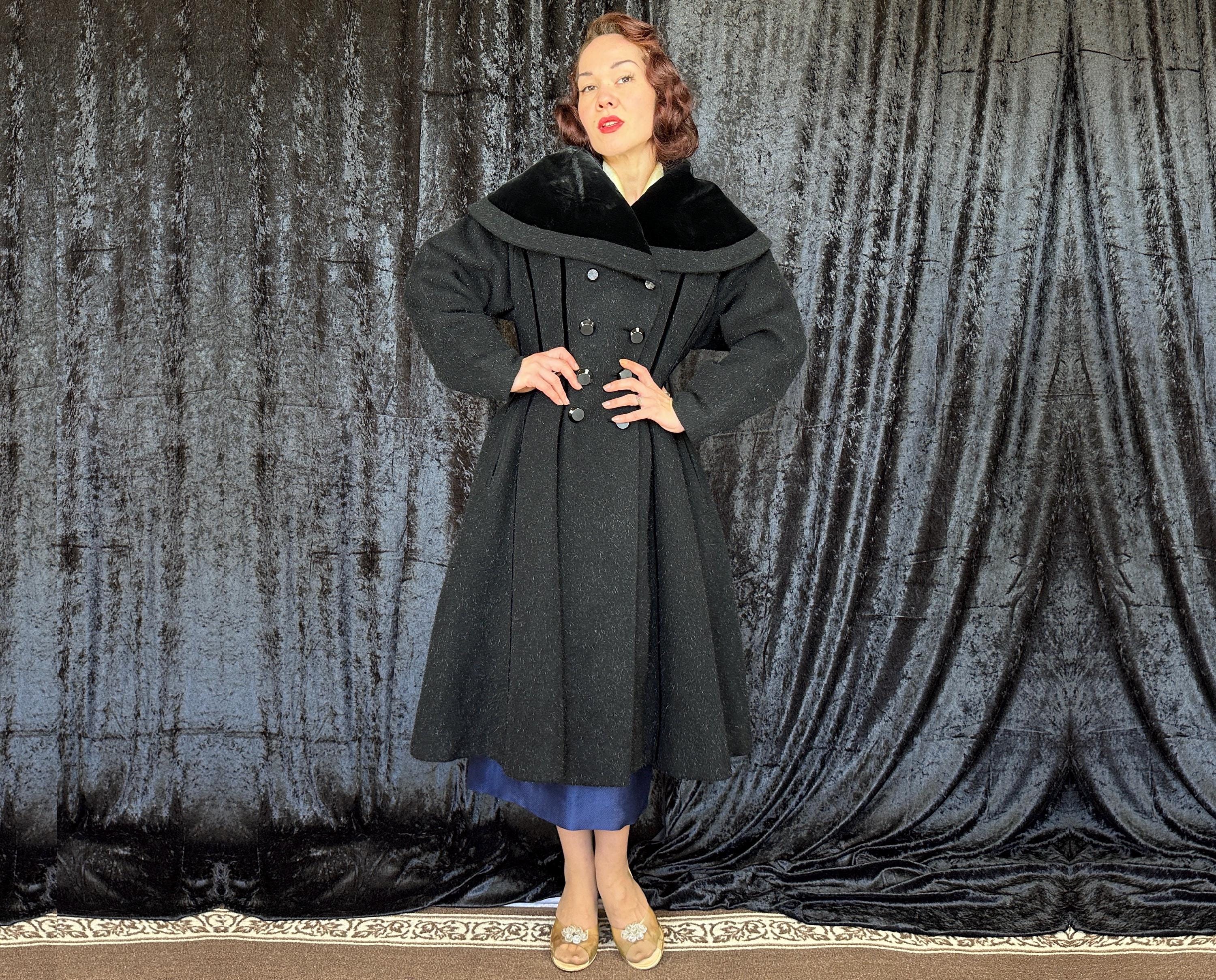 When you show up in this 1950s coat no one will question who the Grand Dame is! This iconic "Lilli Ann" princess coat brings the drama in many ways but the oversized shawl collar has got to be the favourite element with its ability to stand tall framing the face like a gothic halo. The "Fabric of France" cloth is a black wool and mohair blend Lilli Ann was known for with the mohair adding a furry nap that shows as silvery highlights and velvet is used as an accent with stripes running fully down the body and lining the collar. It has an eight button double breasted closure and welted pockets are hidden in the ultra full skirt. The skirt is so full in fact that it doesn't even need a crinoline but the addition of one would be delightfully over the top! Fully lined in rayon satin. This coat is in great vintage condition, with no holes, stains, odors to note.