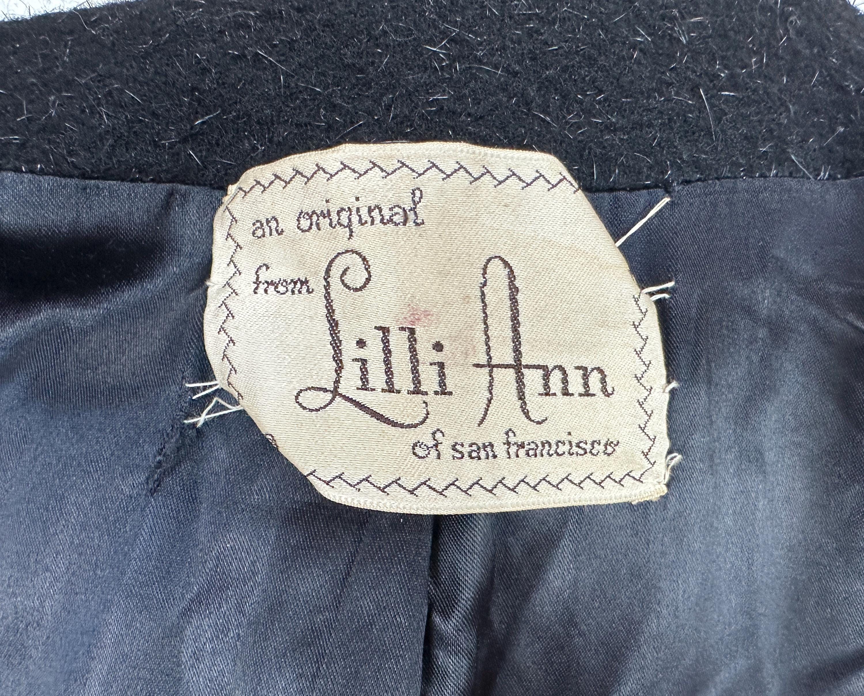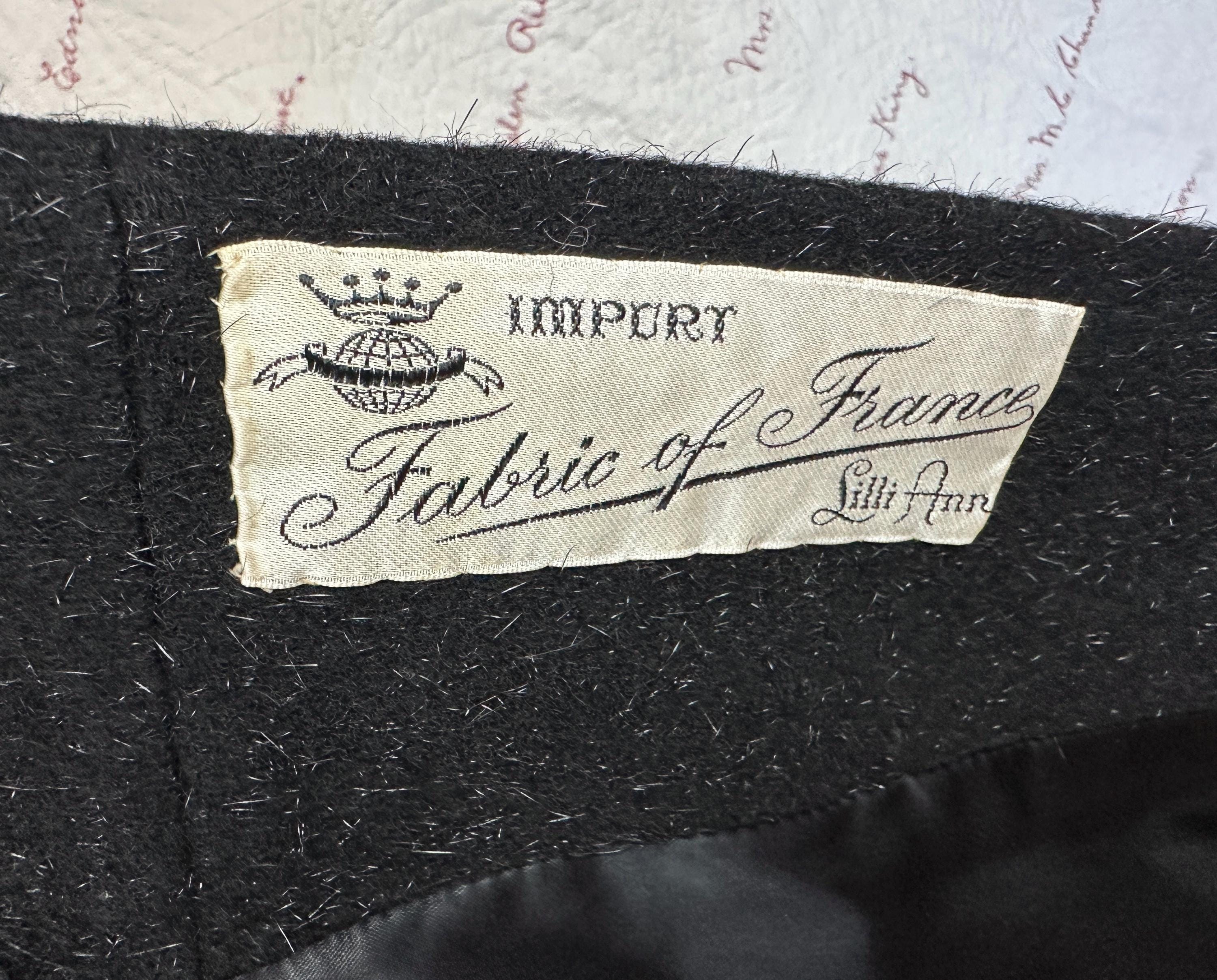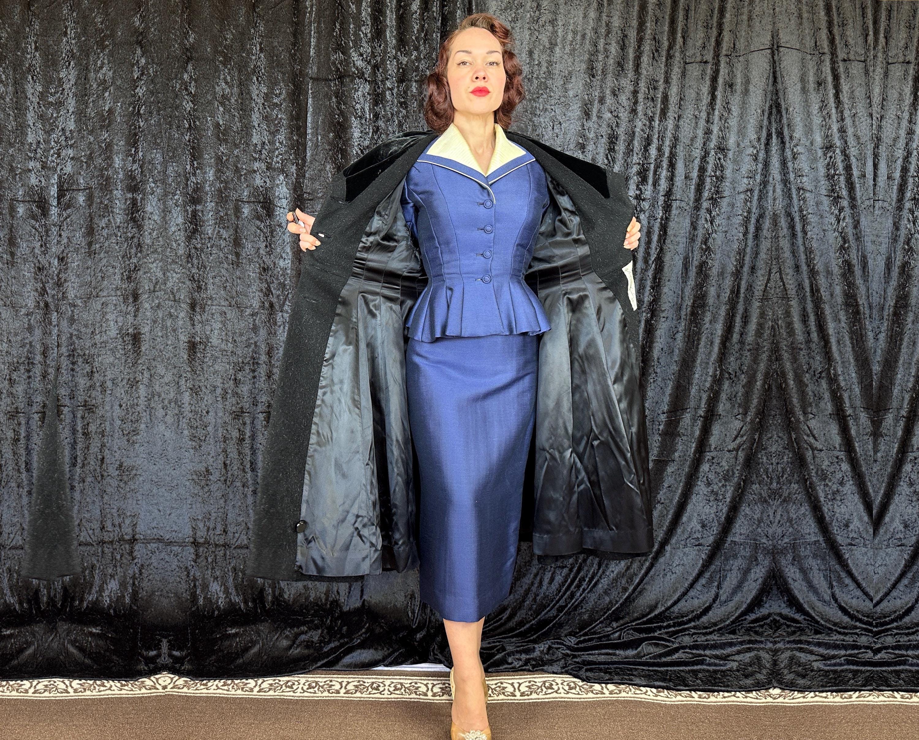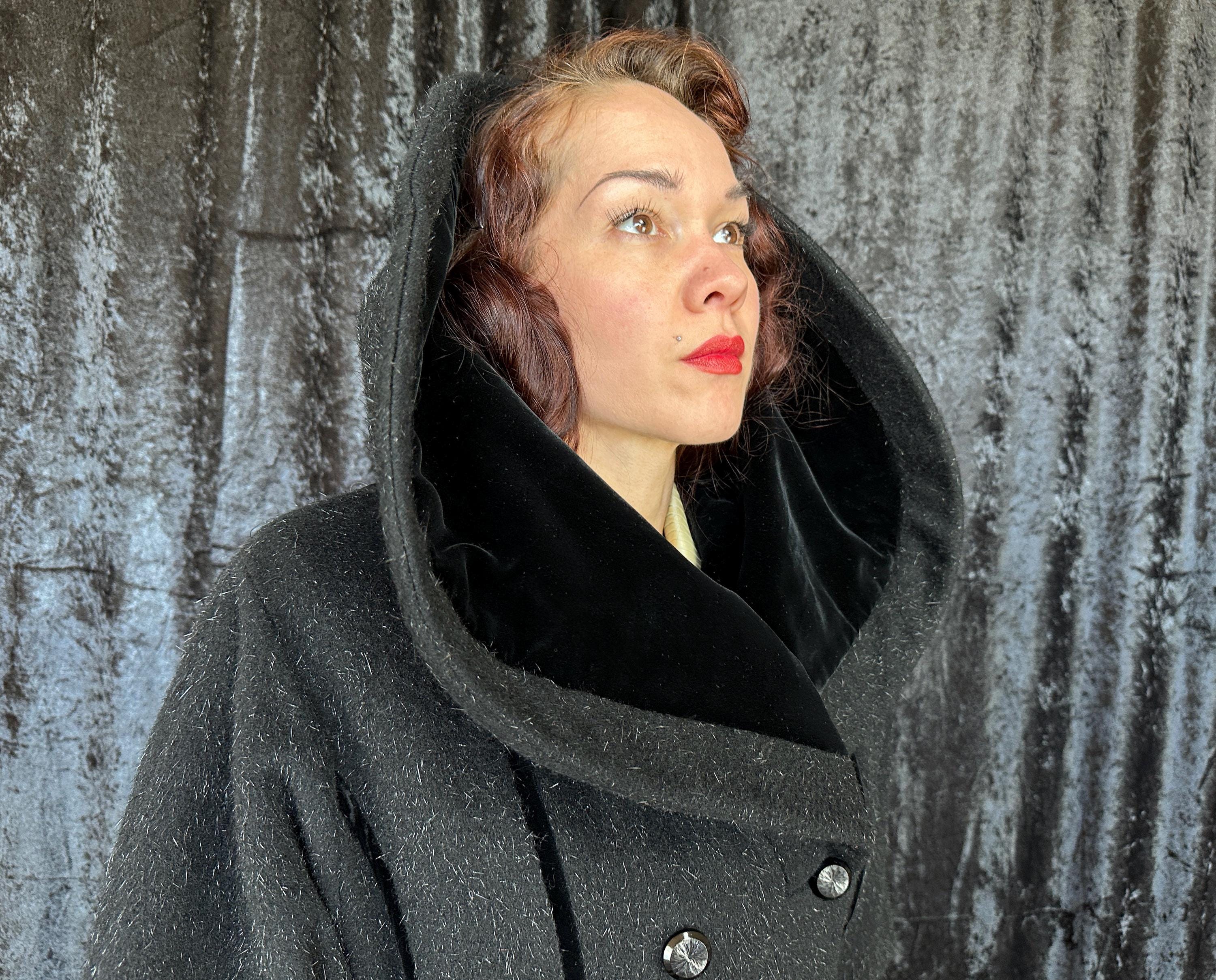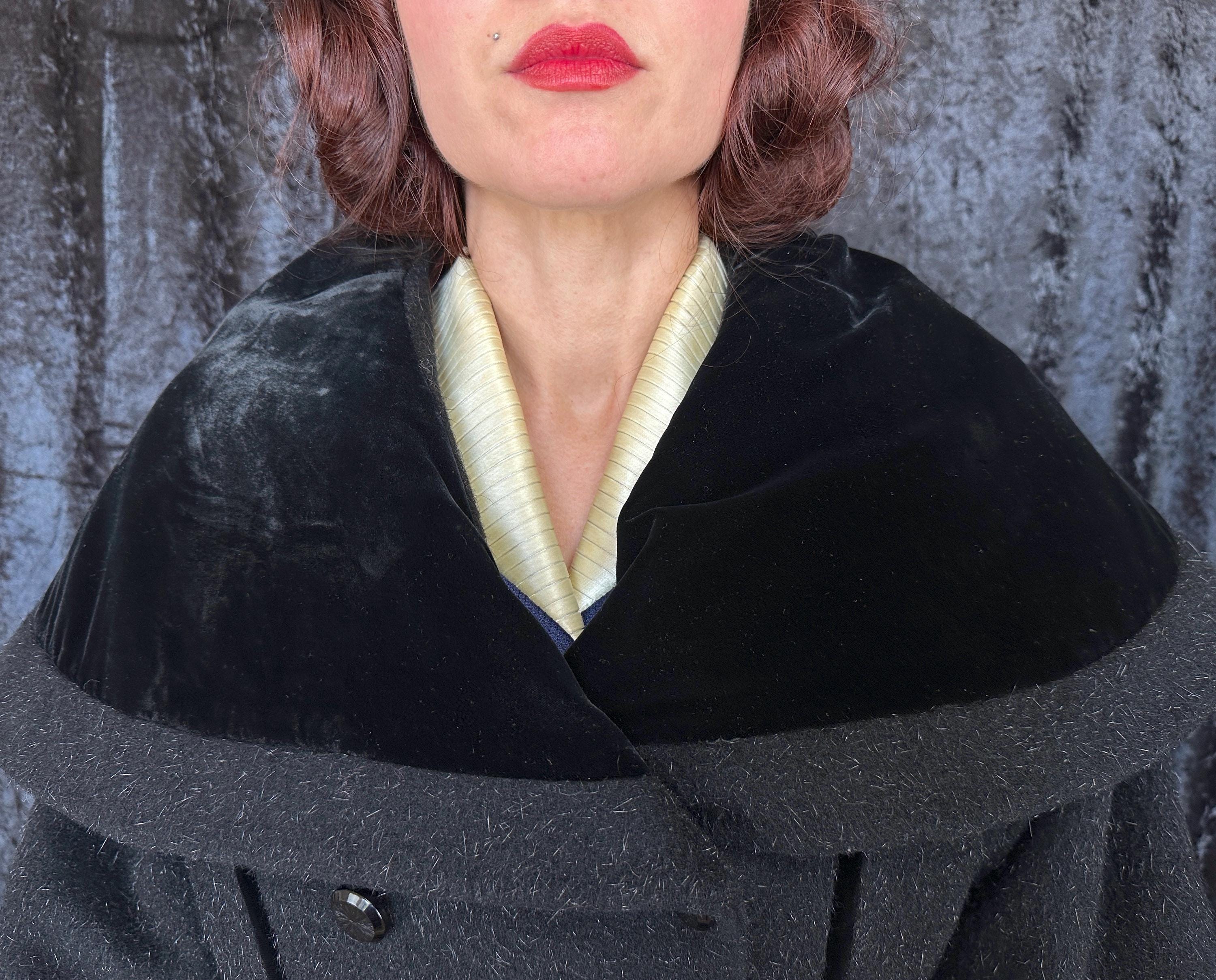 When you show up in this 1950s coat no one will question who the Grand Dame is! This iconic "Lilli Ann" princess coat brings the drama in many ways but the oversized shawl collar has got to be the favourite element with its ability to stand tall framing the face like a gothic halo. The "Fabric of France" cloth is a black wool and mohair blend Lilli Ann was known for with the mohair adding a furry nap that shows as silvery highlights and velvet is used as an accent with stripes running fully down the body and lining the collar. It has an eight button double breasted closure and welted pockets are hidden in the ultra full skirt. The skirt is so full in fact that it doesn't even need a crinoline but the addition of one would be delightfully over the top! Fully lined in rayon satin. This coat is in great vintage condition, with no holes, stains, odors to note.