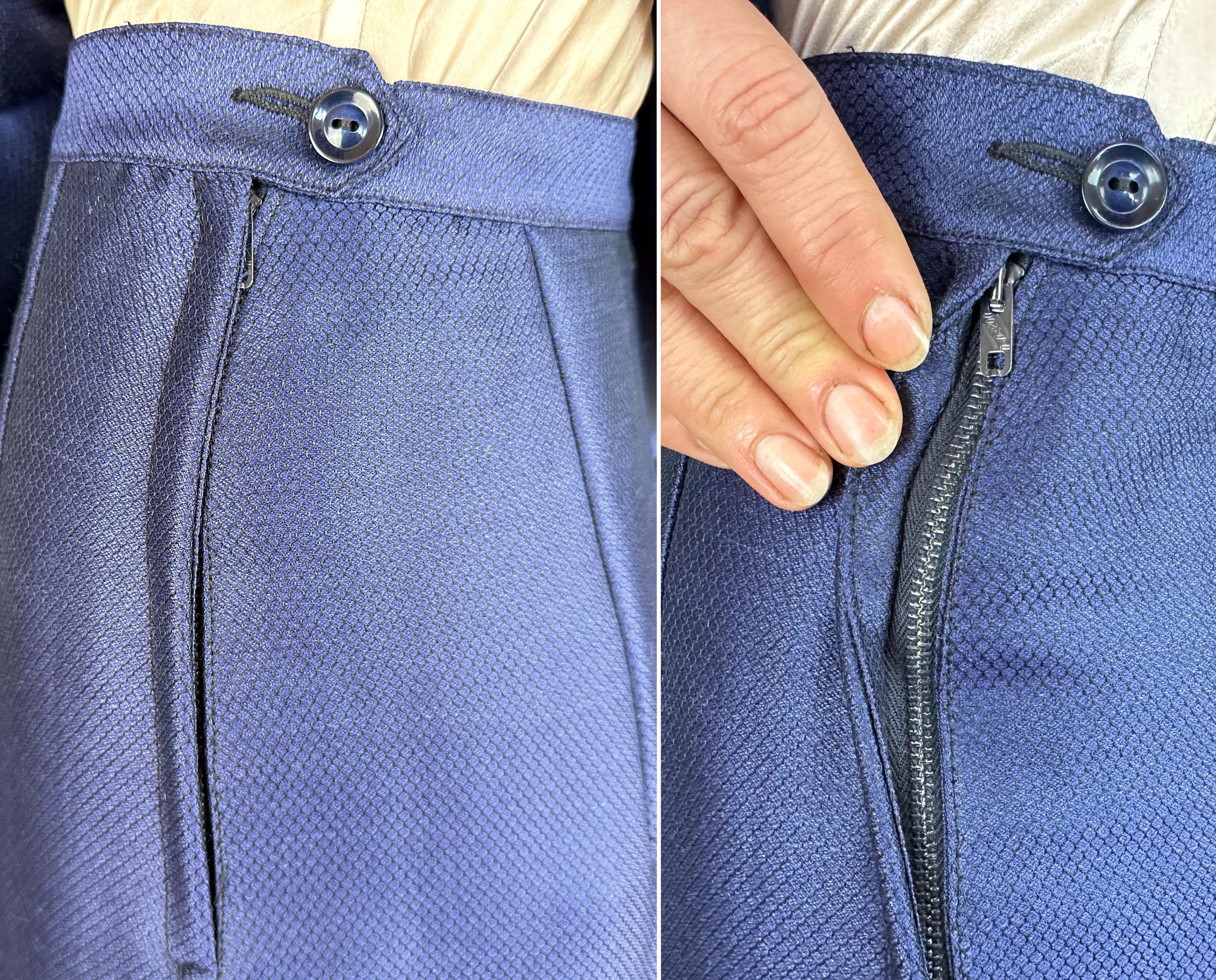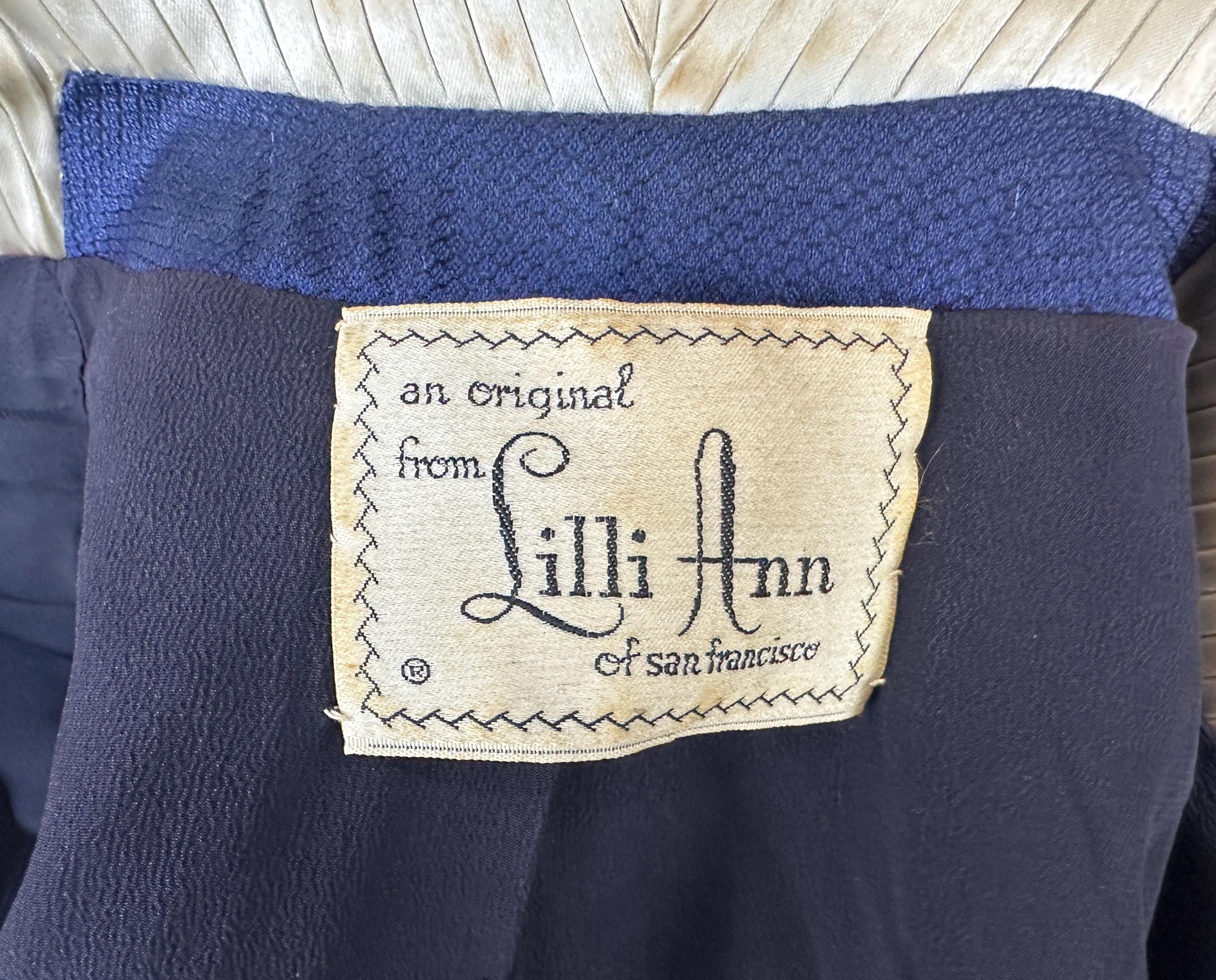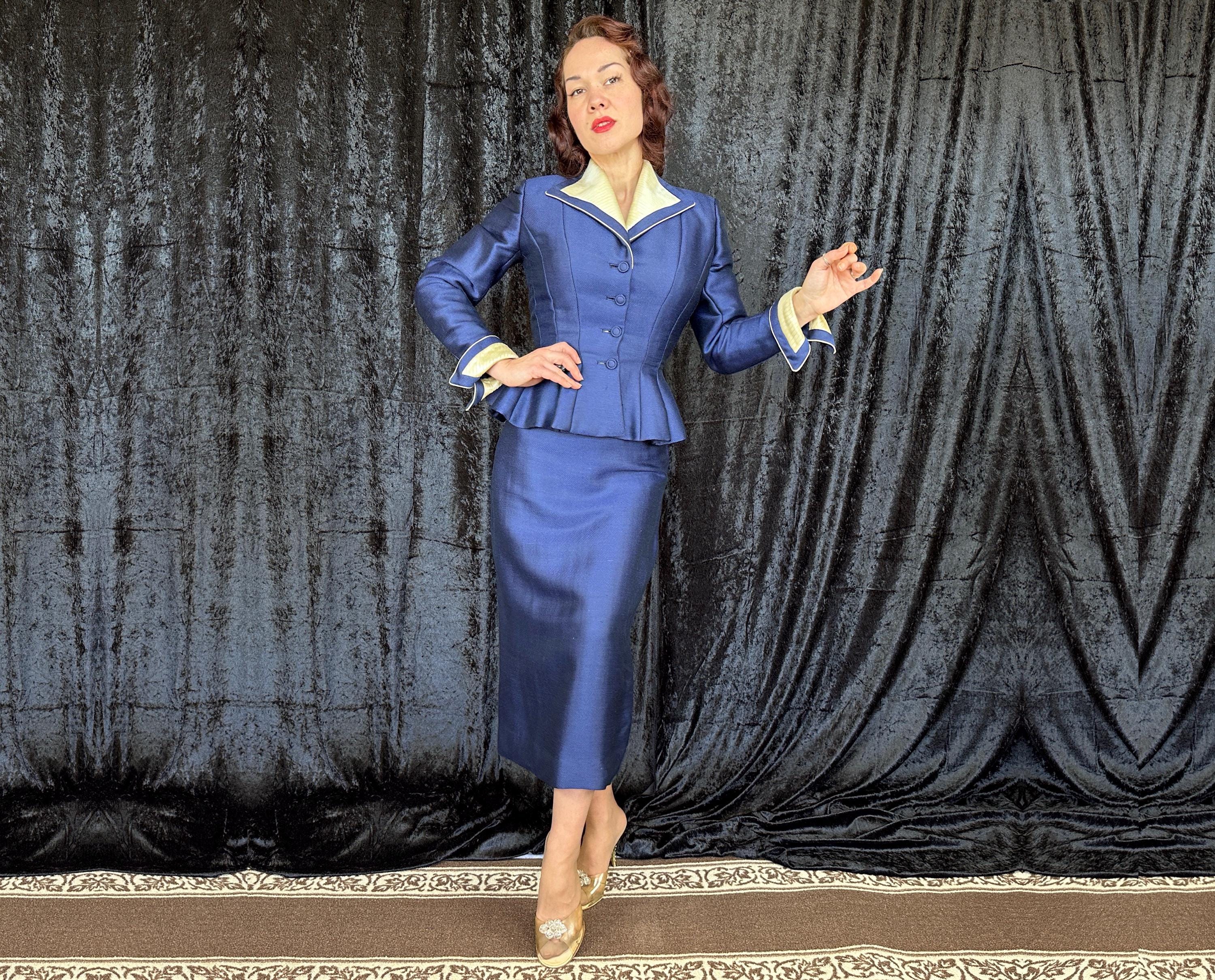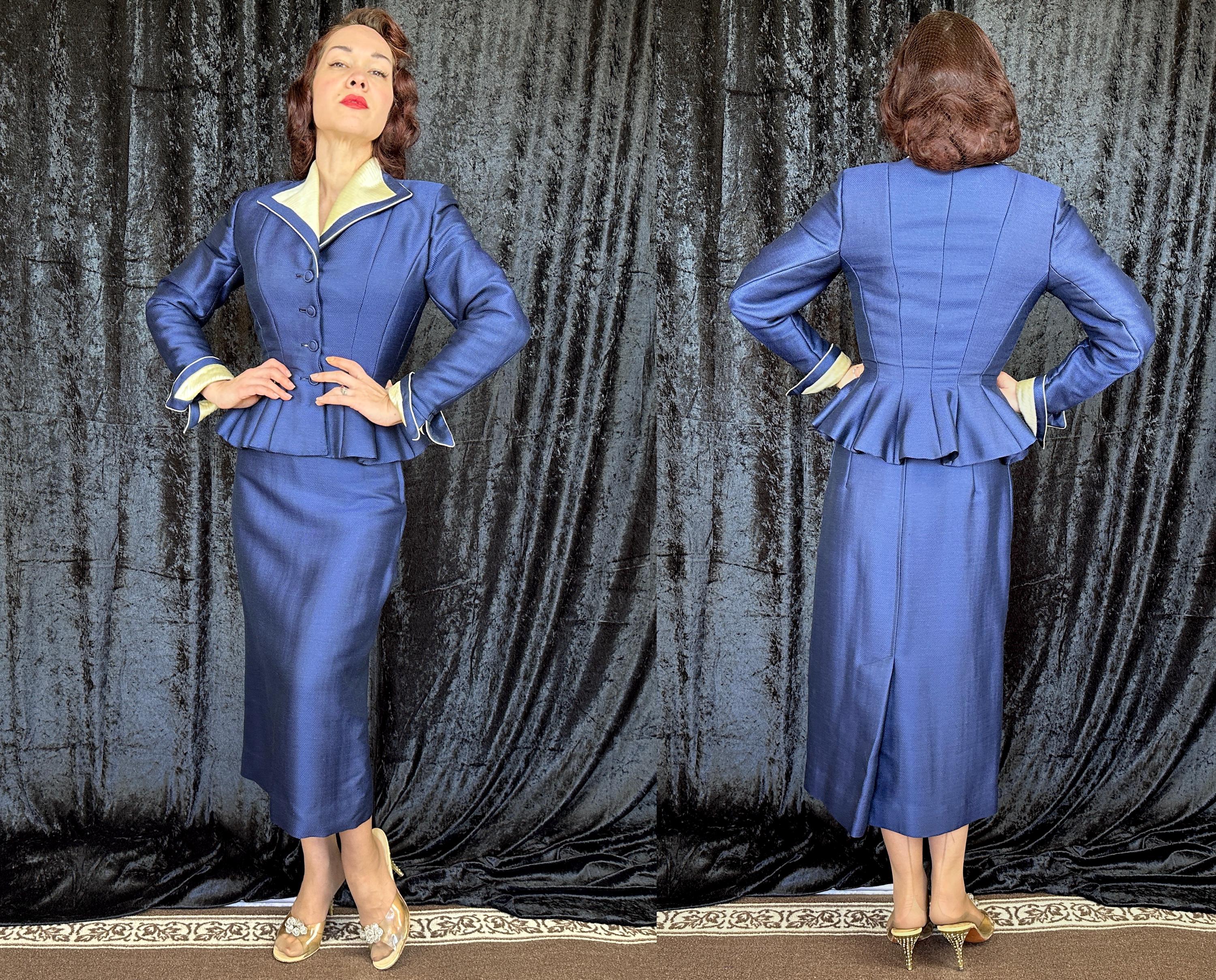 "Lilli Ann" is a precious gem of vintage designers so let yourself sparkle like a sapphire in this 1950s suit! The sapphire blue cloth of silk and wool has a micro fishscale pattern and with the lovely sheen it brings thoughts of a mermaids tail glistening in sunlit water. The jacket has the beautiful shaping that "Lilli Ann" is known for with hourglass seaming, flared peplum, and padded shoulders. Ivory silk lined up in slashed pleats lines the diamond lapel and turned up pointed notch cuffs along with ivory piping around the edges. The pencil skirt has a back kick pleat, and metal zipper with button on the side. Both pieces are fully lined with rayon crepe. This suit is in great vintage condition, a bit of very faint discolouration but no holes nor odors to note.