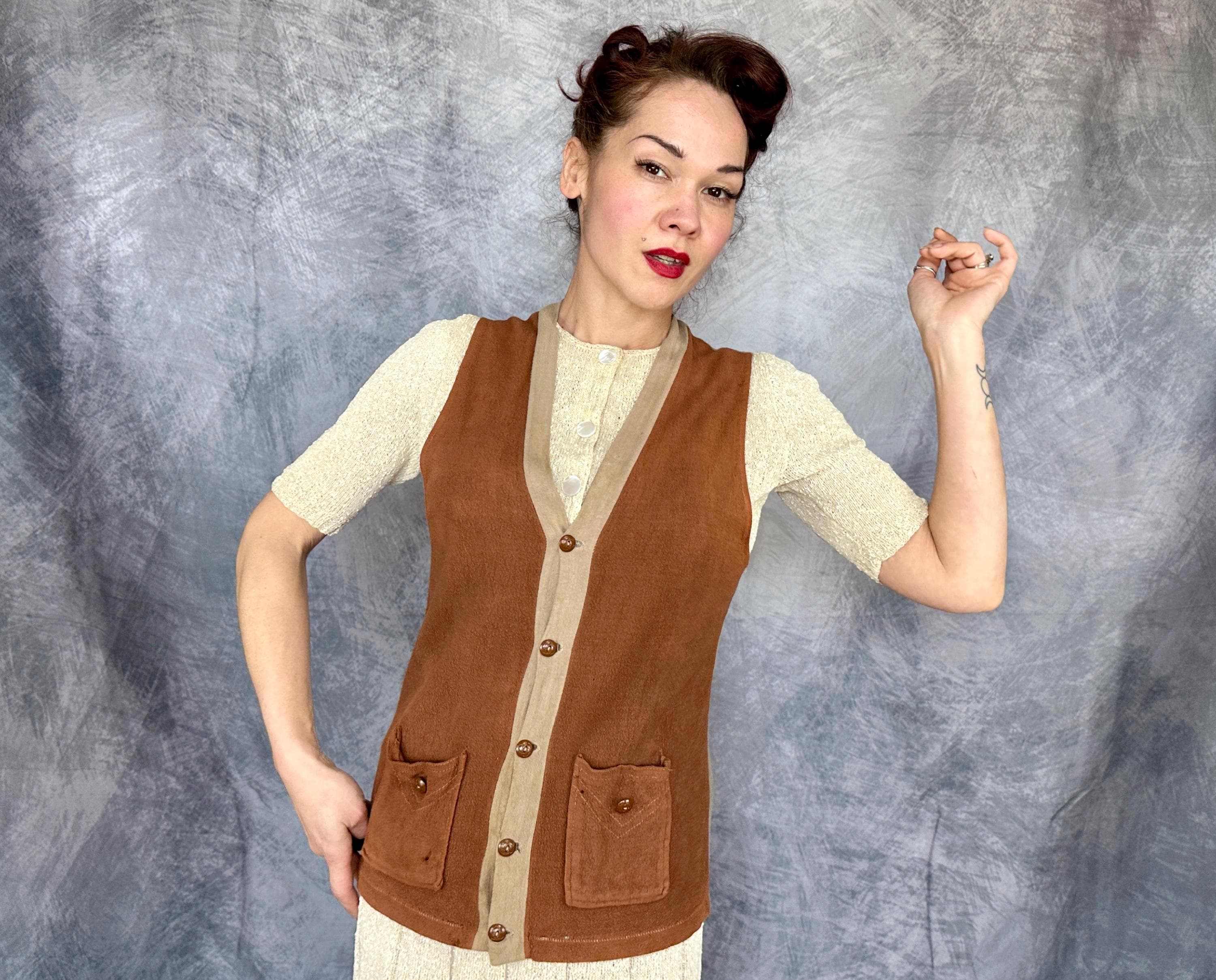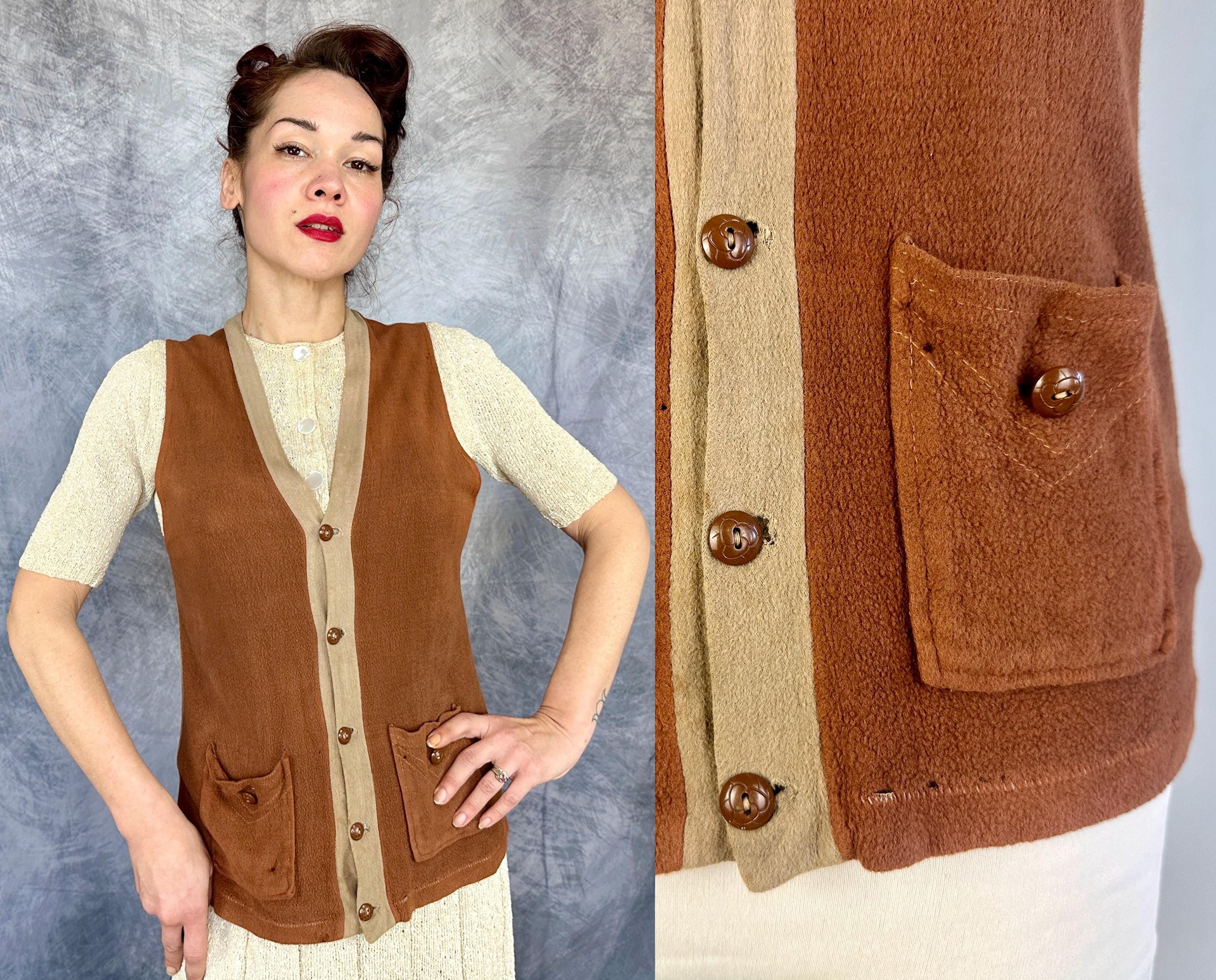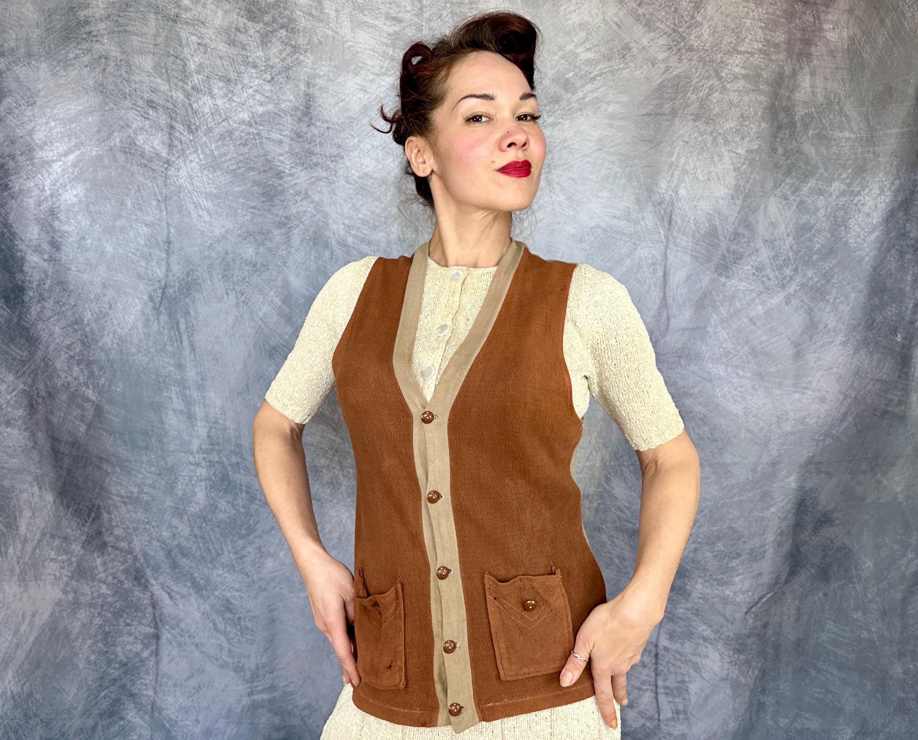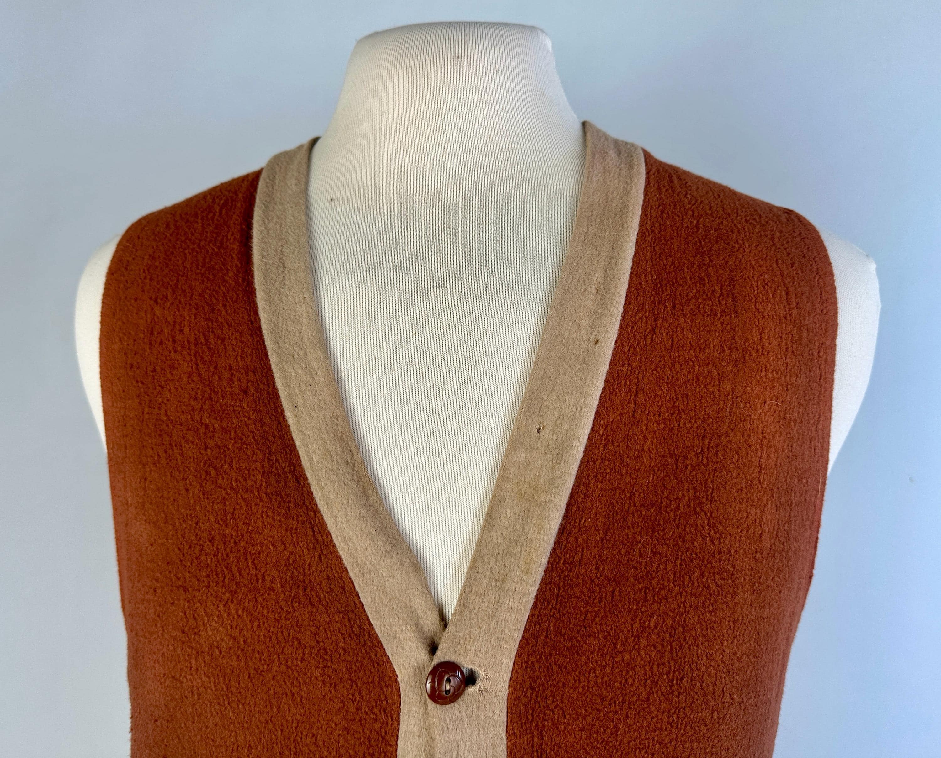 Laid back style is the name of the game with this 1930s vest! The wool jersey knit has a raised nap giving a flannel feel and the two tone combo of tawny brown and taupe will complete autumn outings perfectly. It has a five button front with a basketball vibe and two patch pockets are handy and include the same buttons as a decorative element. Labeled “JC Penney Co”. This early sportswear piece in good vintage condition, scattered pinholes and faint staining on the back and no odors to note.