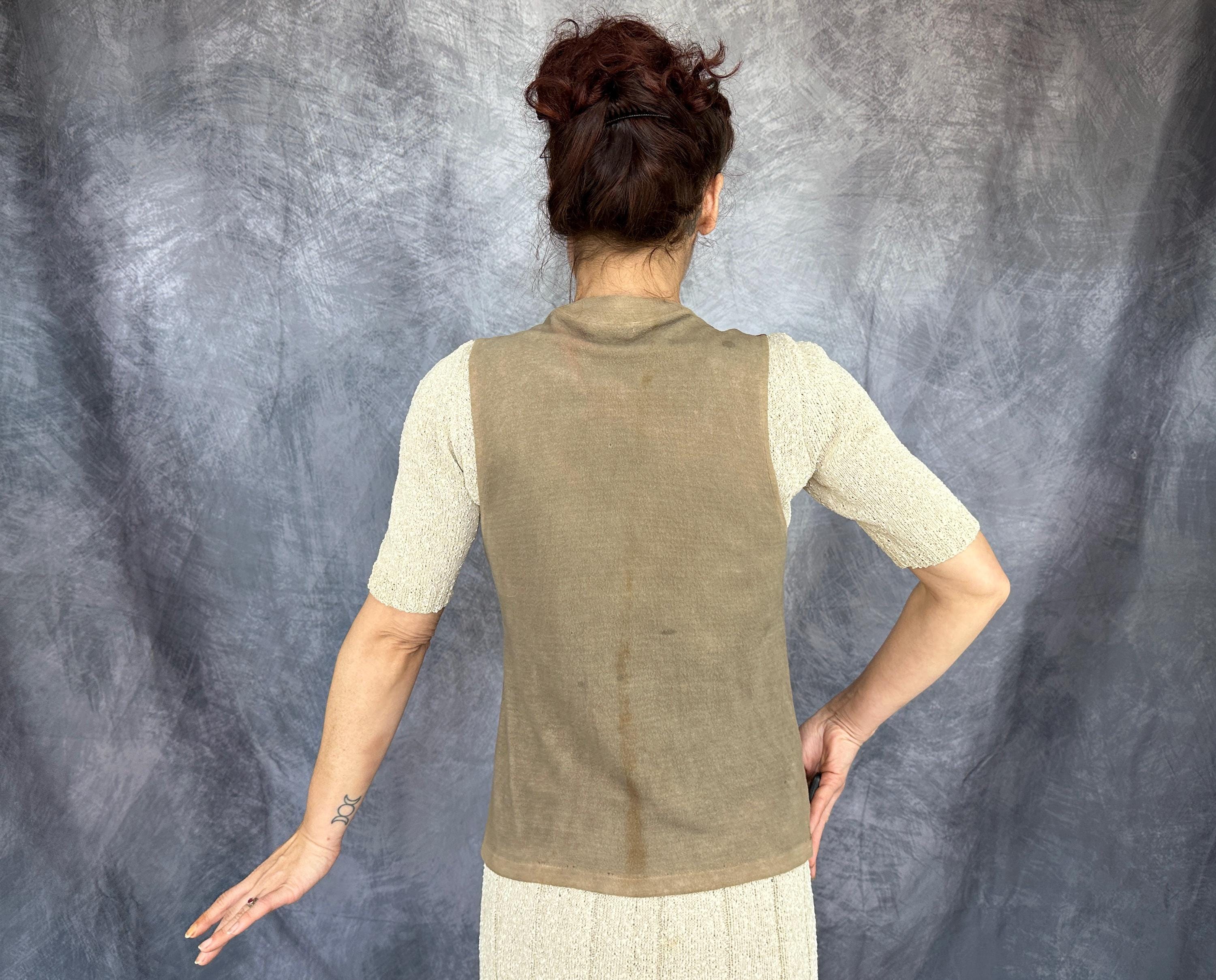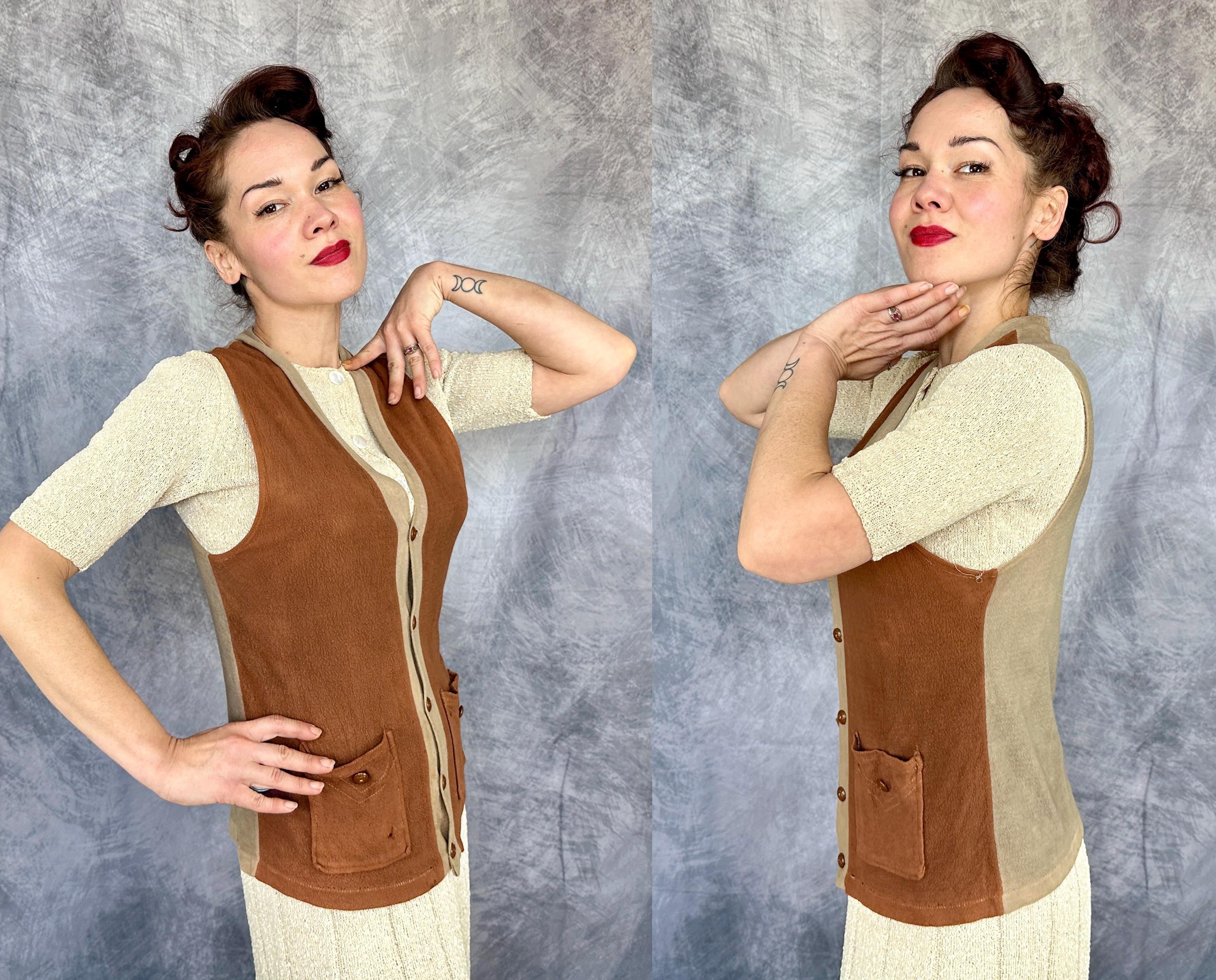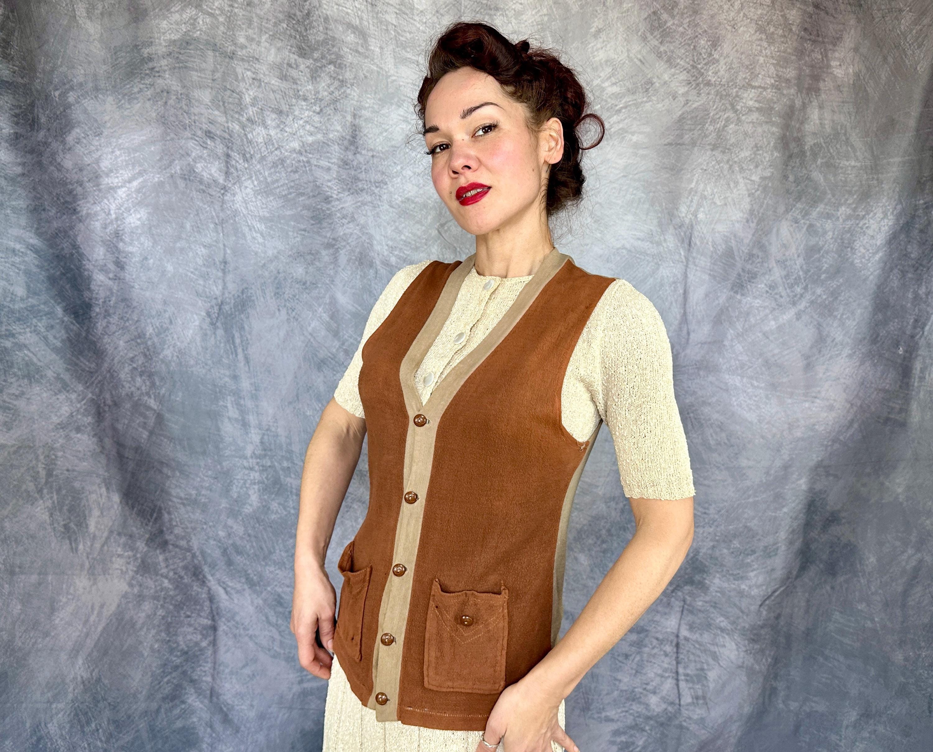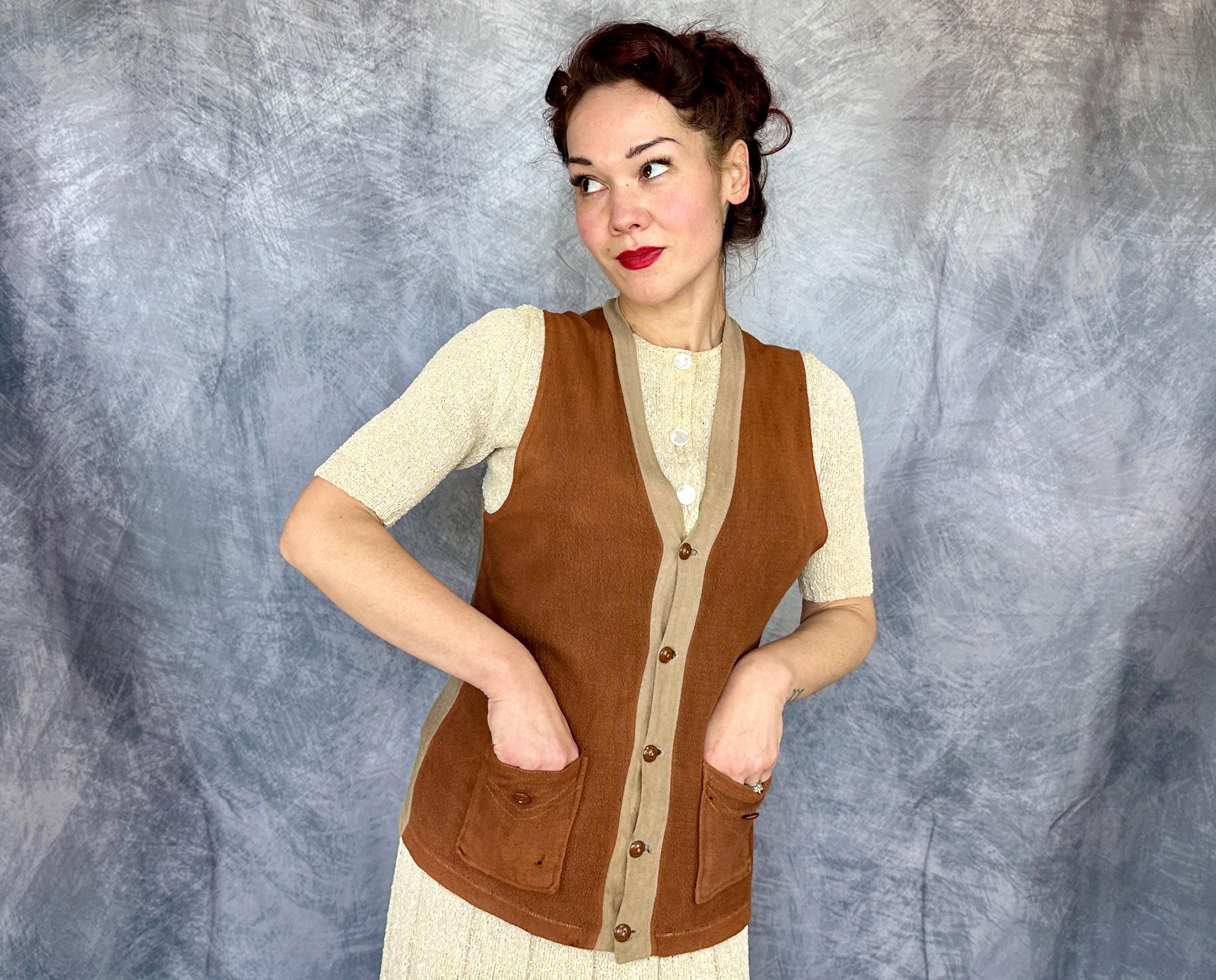 Laid back style is the name of the game with this 1930s vest! The wool jersey knit has a raised nap giving a flannel feel and the two tone combo of tawny brown and taupe will complete autumn outings perfectly. It has a five button front with a basketball vibe and two patch pockets are handy and include the same buttons as a decorative element. Labeled “JC Penney Co”. This early sportswear piece in good vintage condition, scattered pinholes and faint staining on the back and no odors to note.