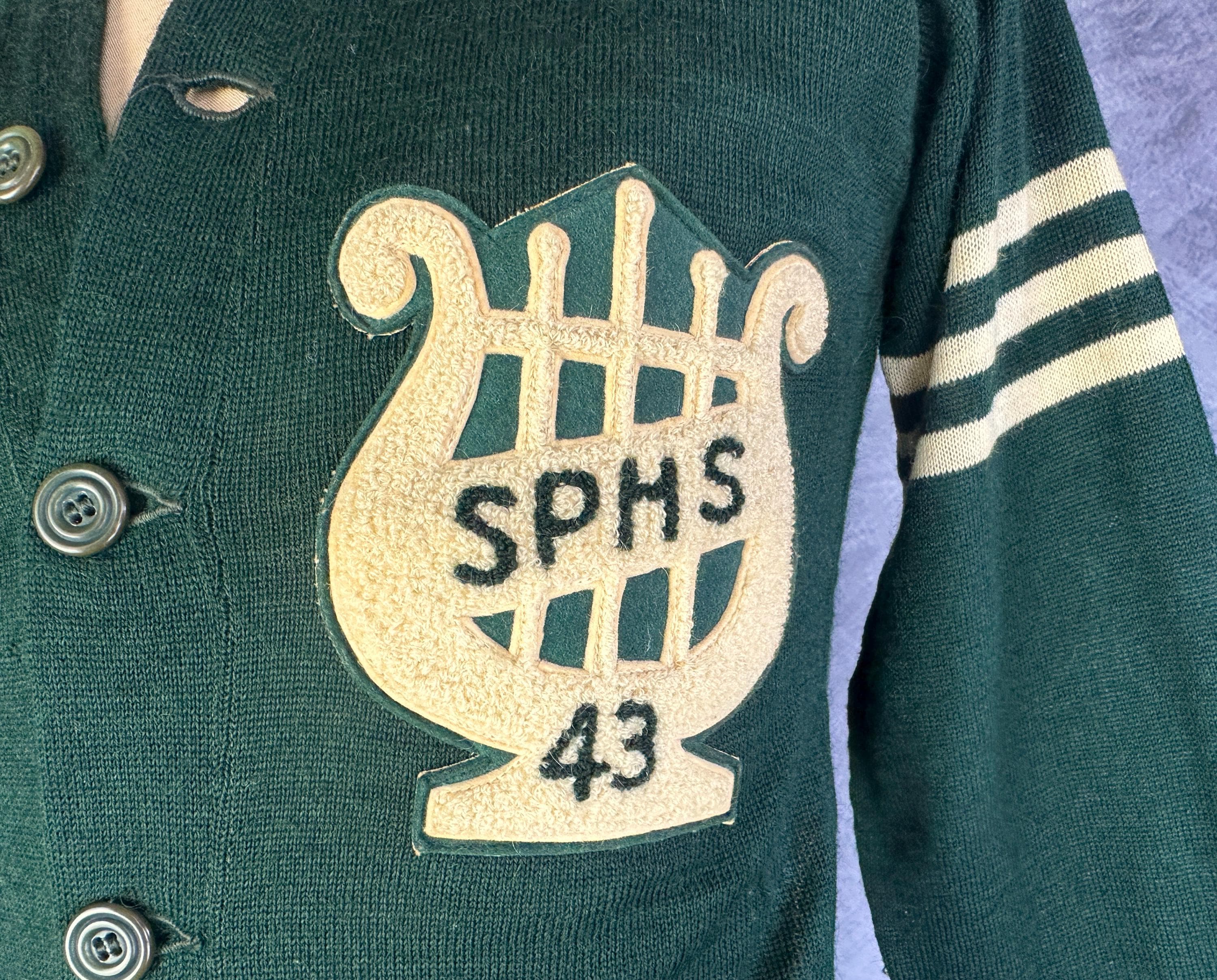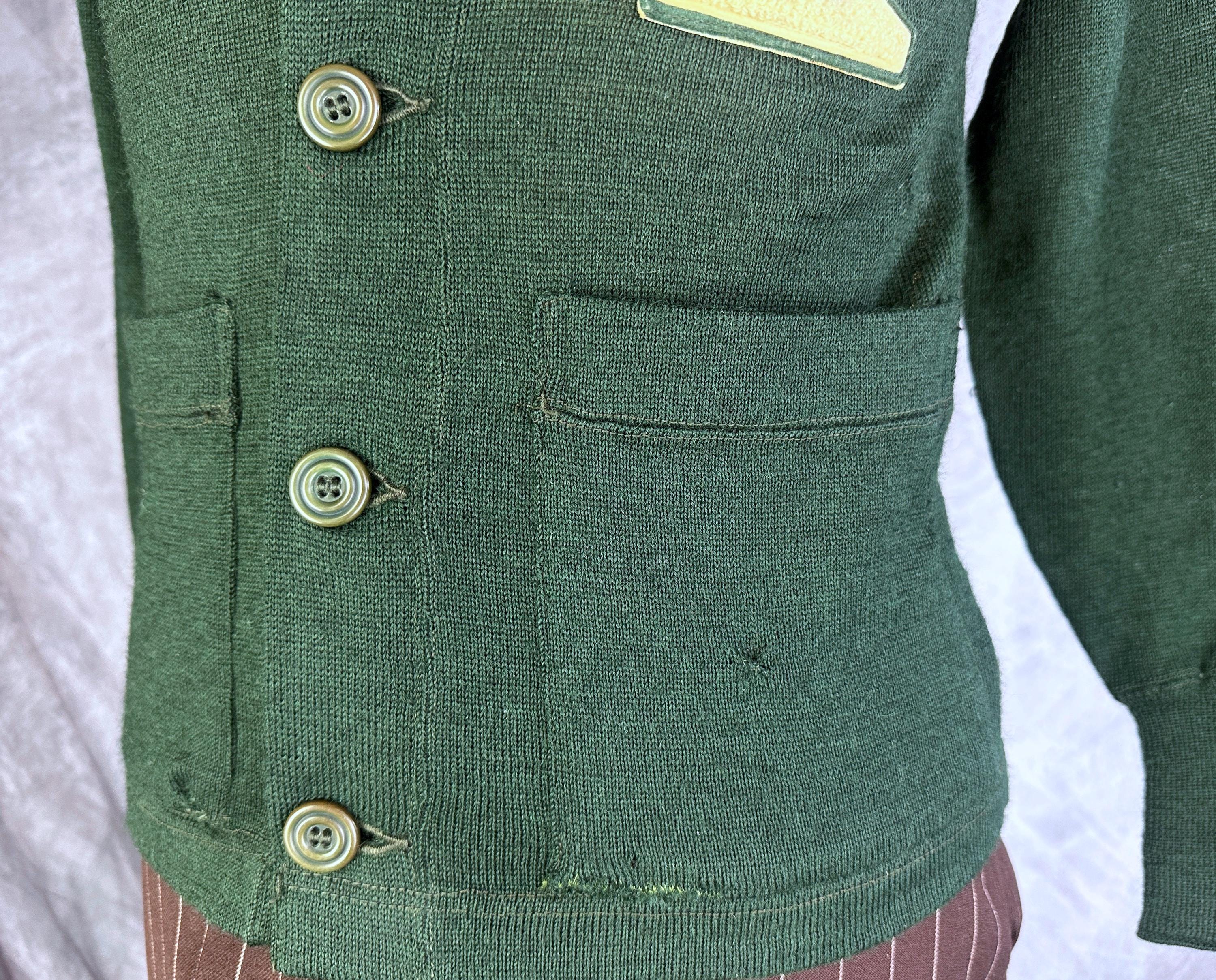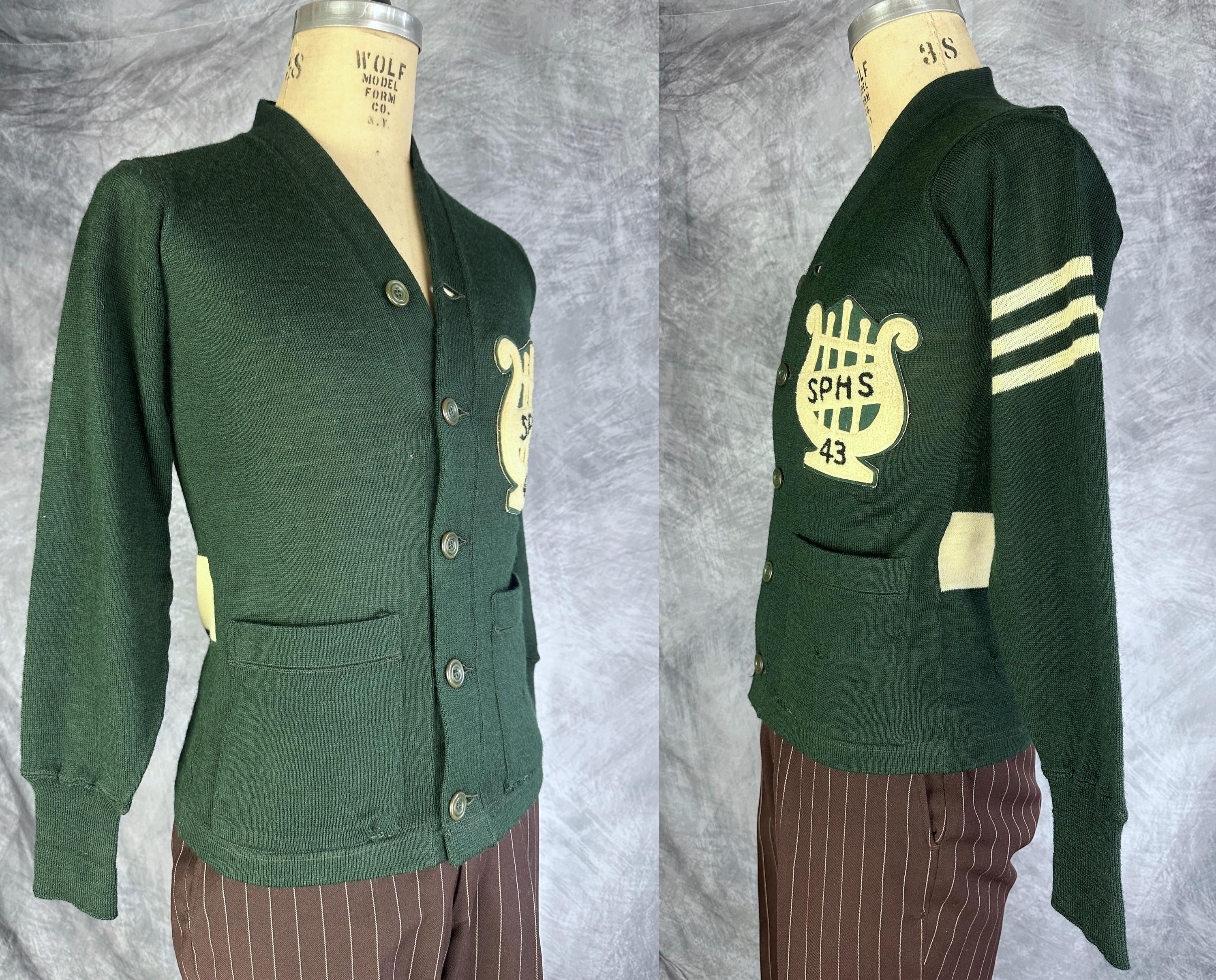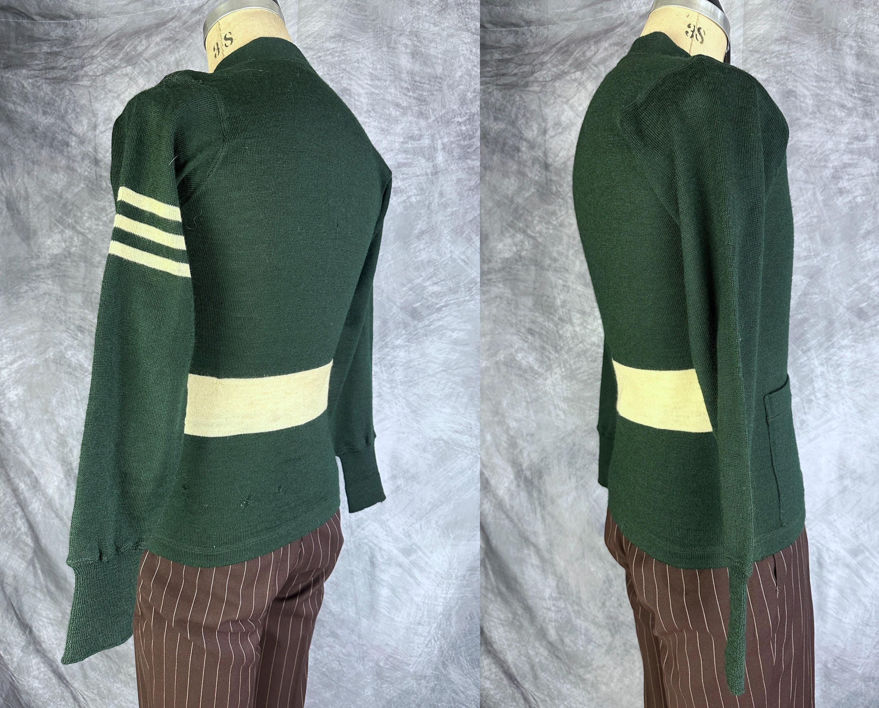 They'll be green with envy when you step out in this 1940s cardigan! This forest green worsted wool piece is accented with ivory white varsity stripes on the arm and a wide white stripe making a faux belted back. A large chenille patch shaped like a lyre graces the chest and denotes a 1943 date. It has two patch pockets and wide ribbed cuffs. Labeled "Sand Knit Athletic Wear". This sweater is in great vintage condition, with no holes, stains, odors to note.