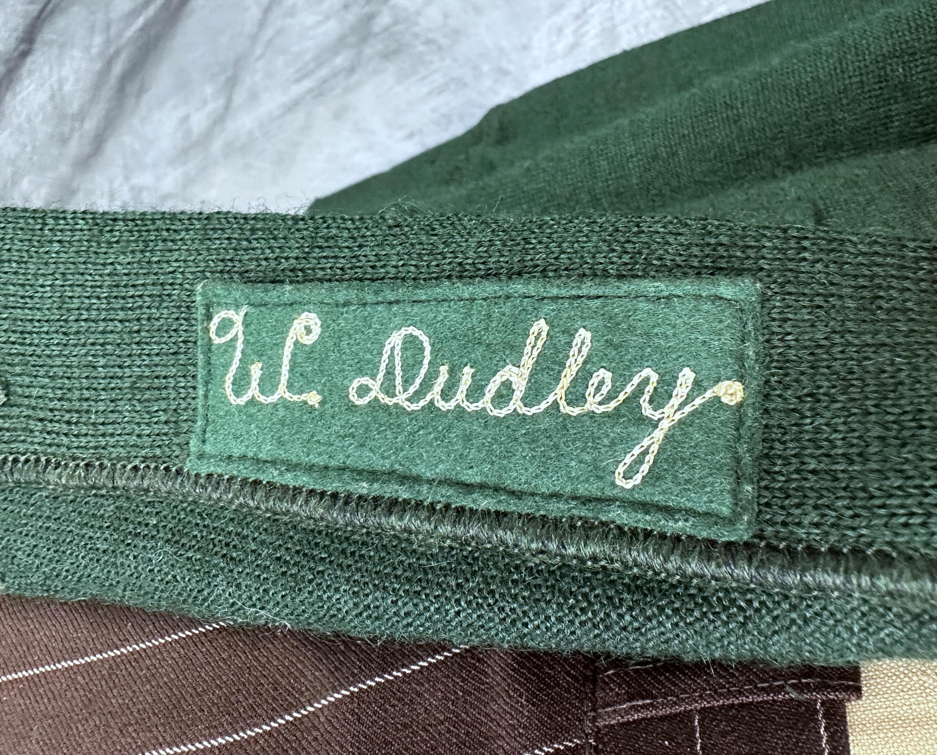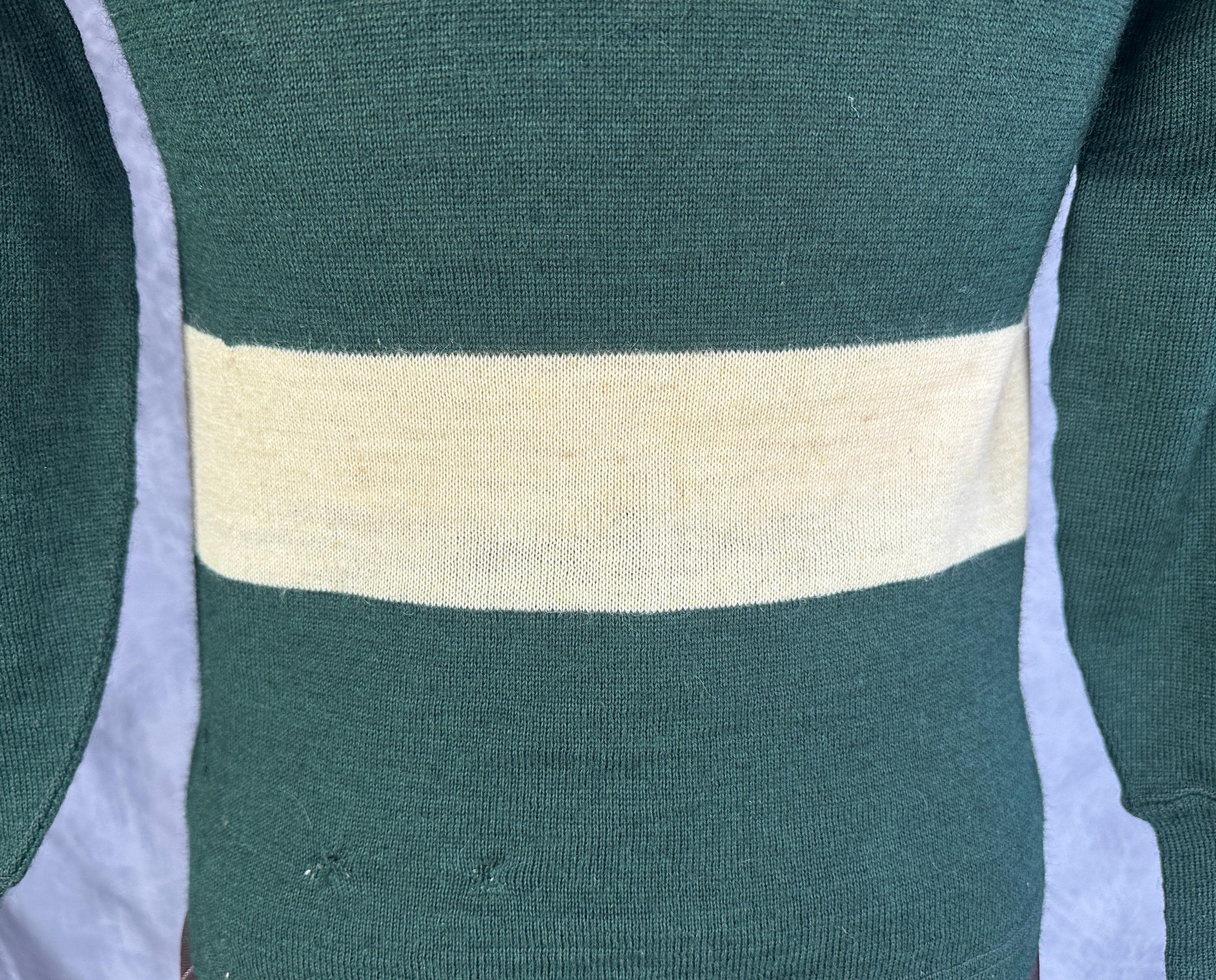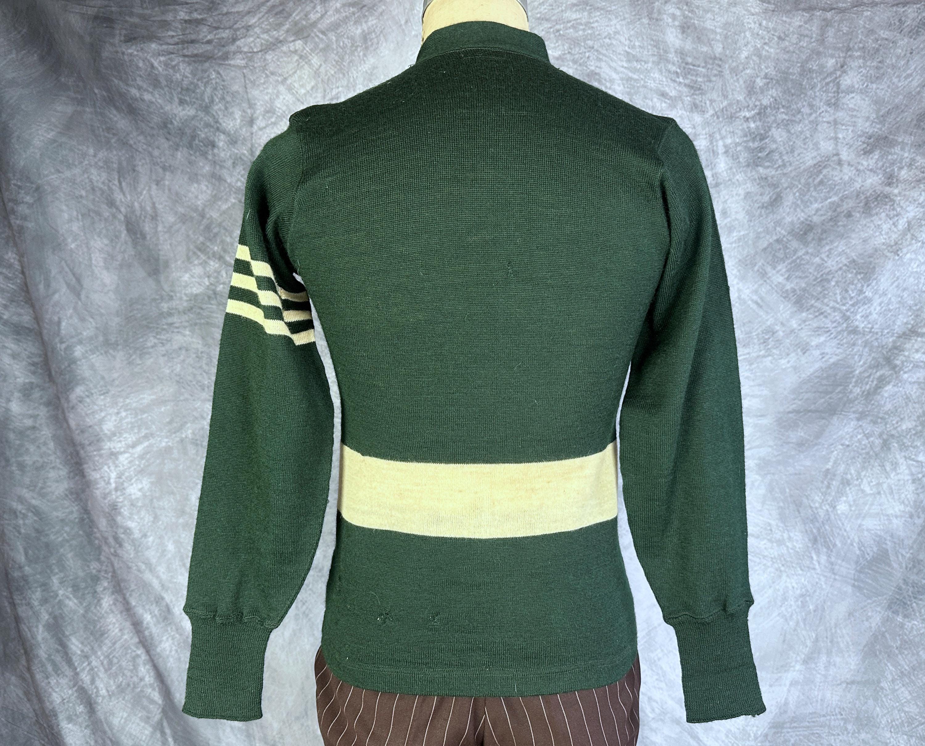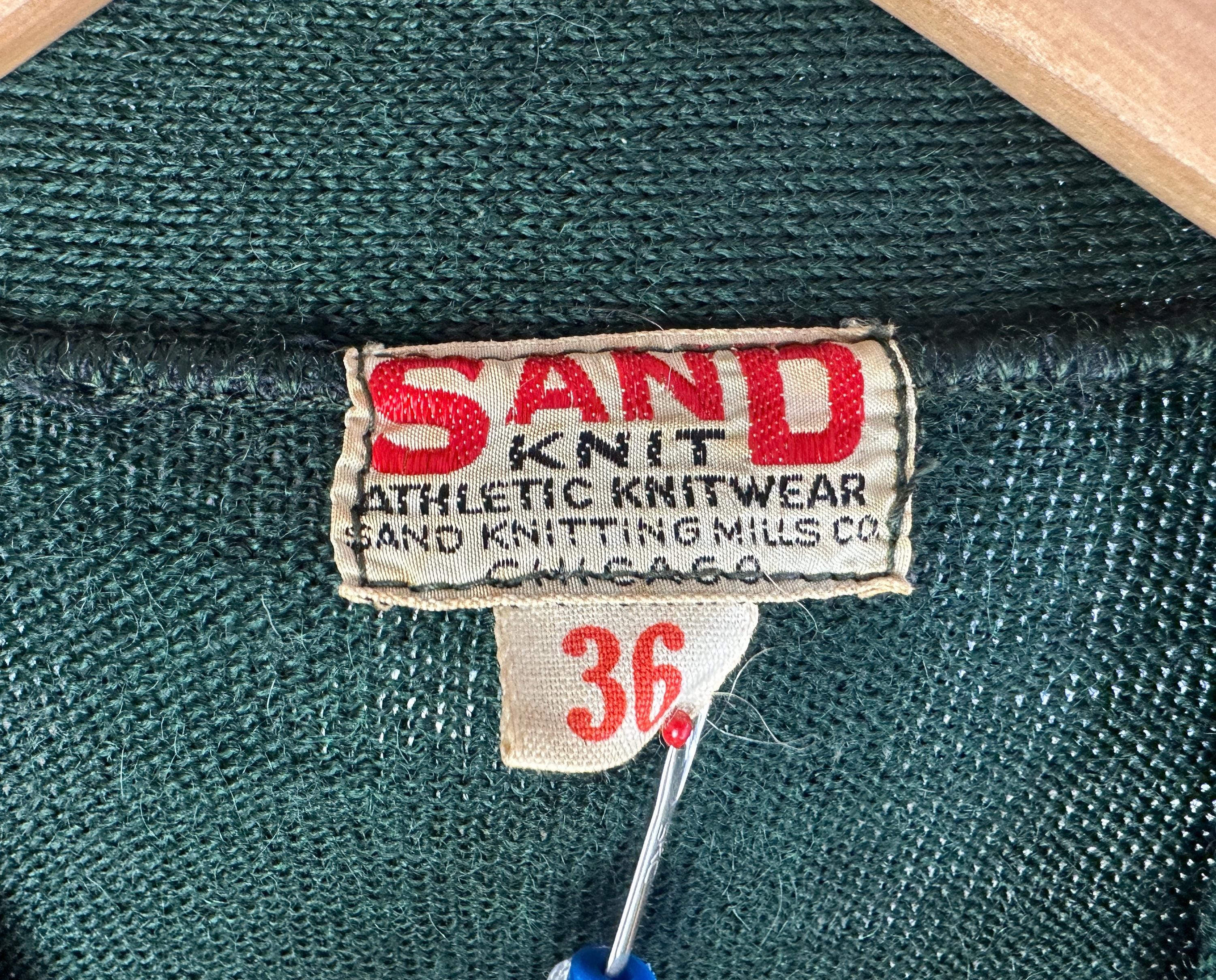 They'll be green with envy when you step out in this 1940s cardigan! This forest green worsted wool piece is accented with ivory white varsity stripes on the arm and a wide white stripe making a faux belted back. A large chenille patch shaped like a lyre graces the chest and denotes a 1943 date. It has two patch pockets and wide ribbed cuffs. Labeled "Sand Knit Athletic Wear". This sweater is in great vintage condition, with no holes, stains, odors to note.