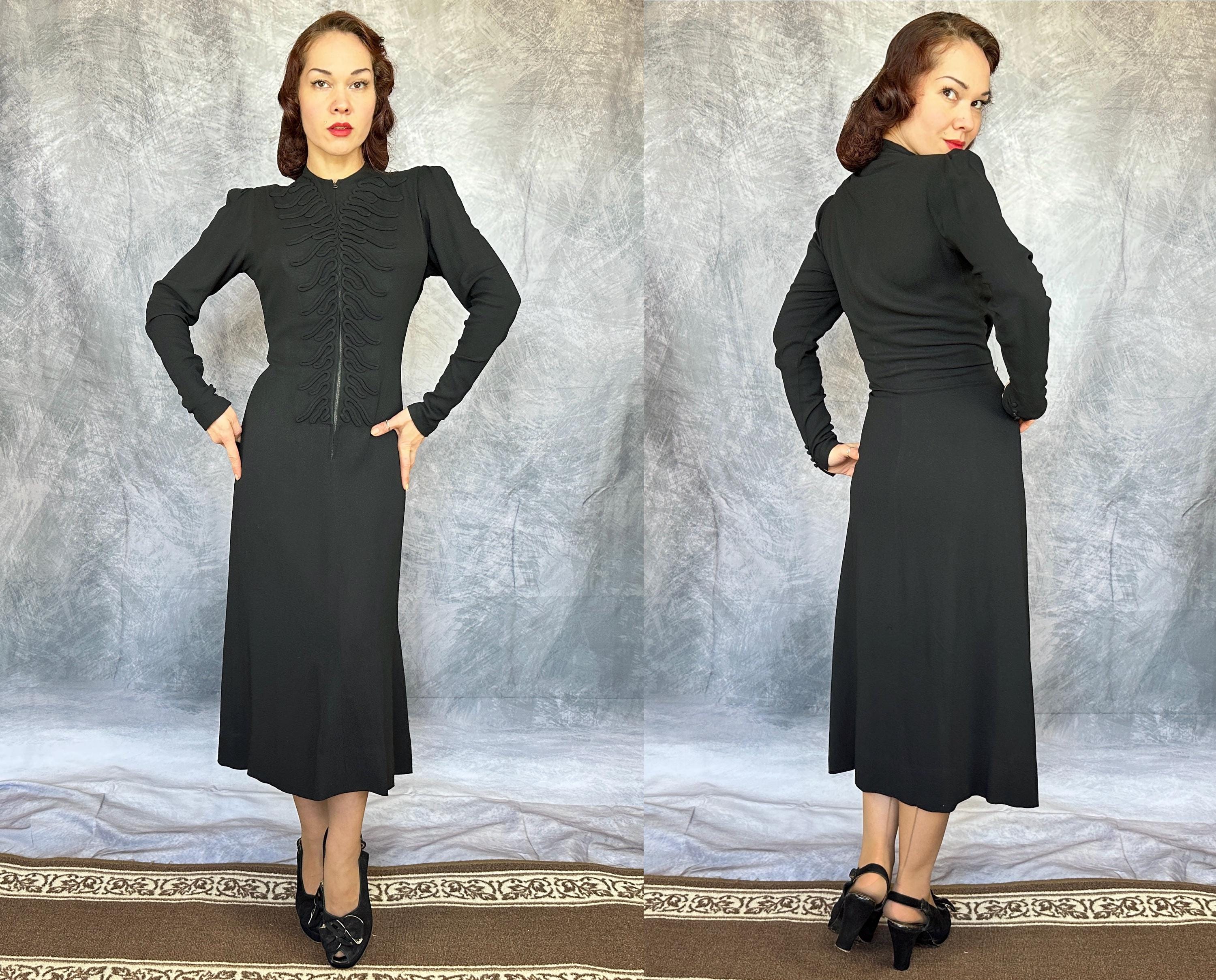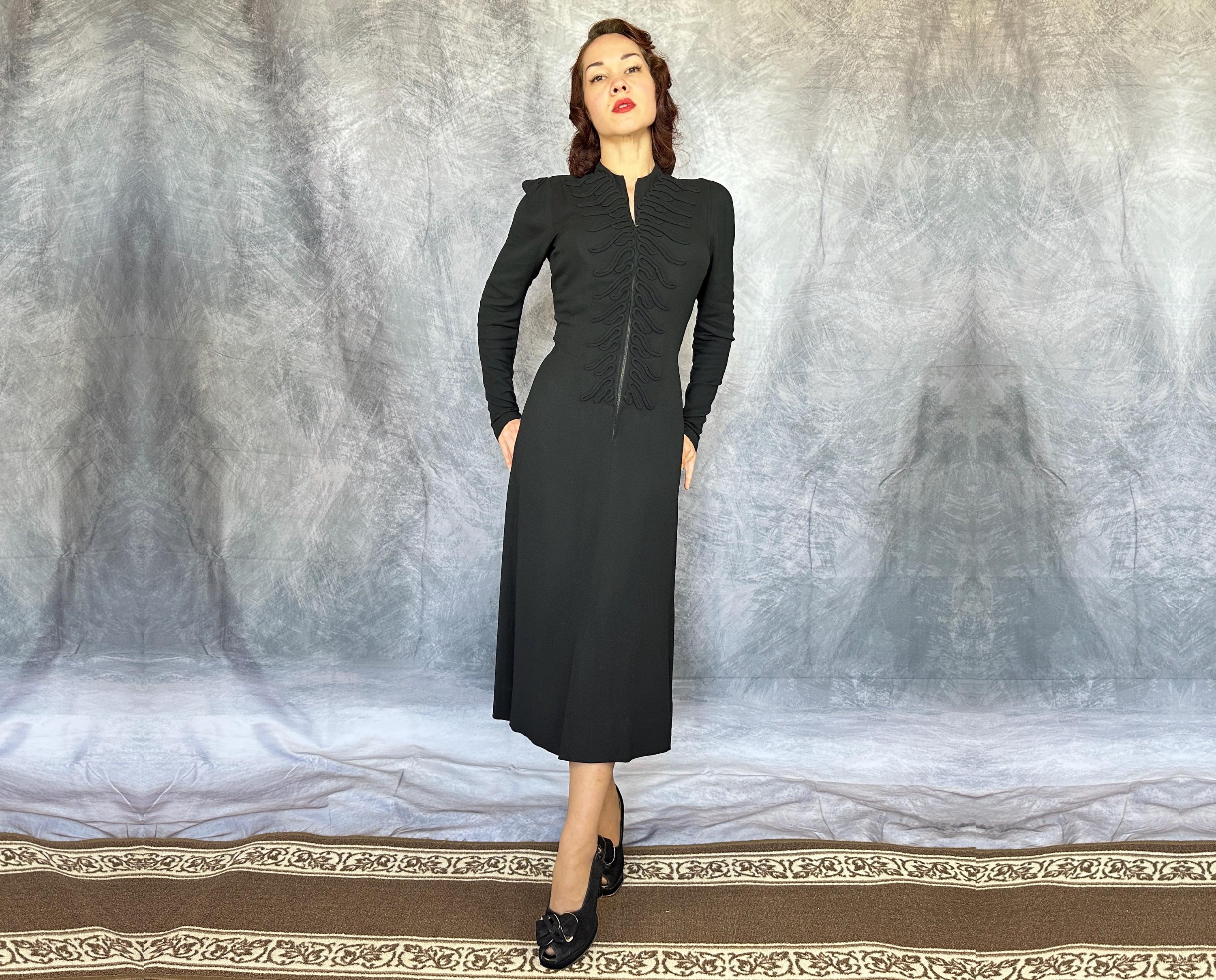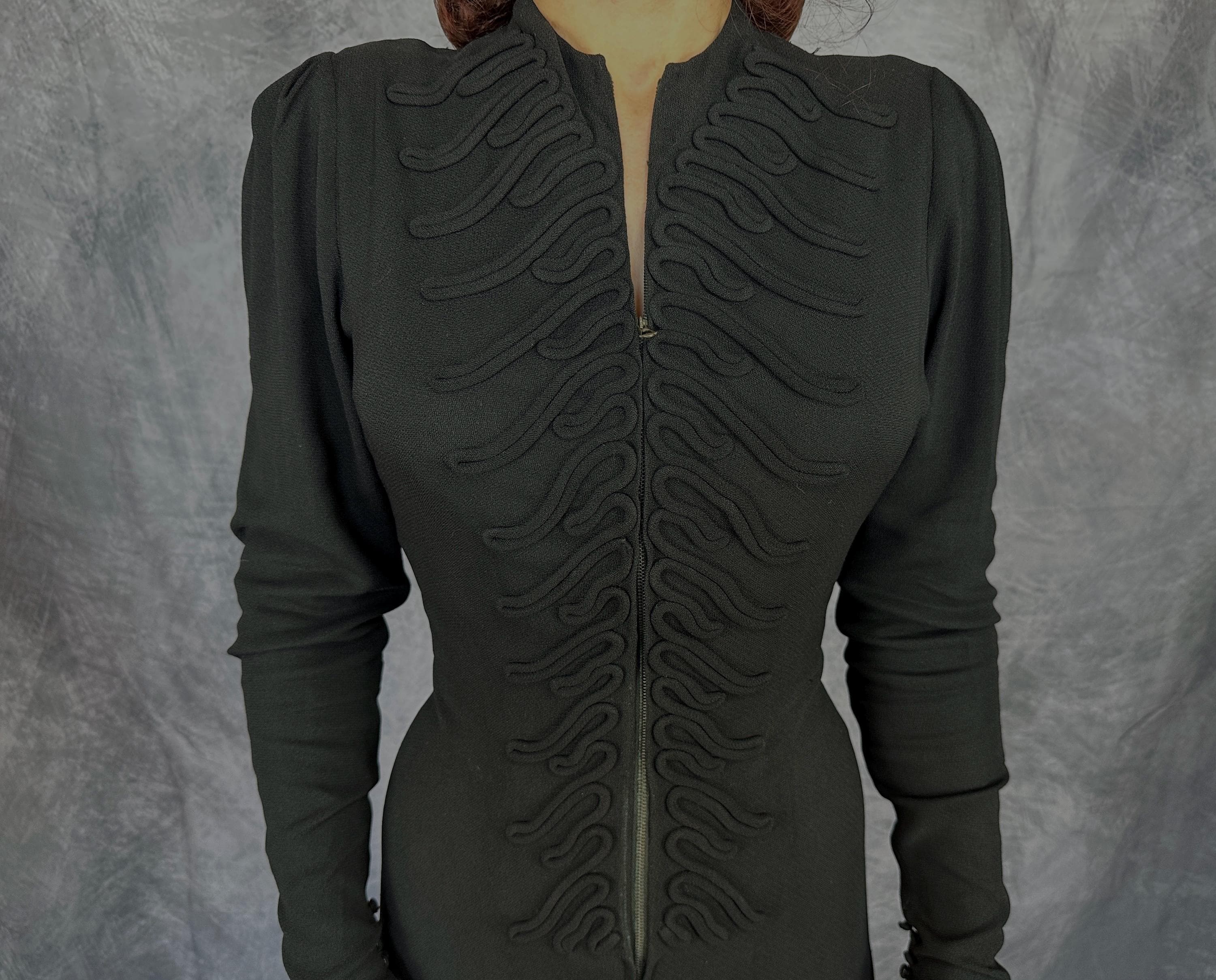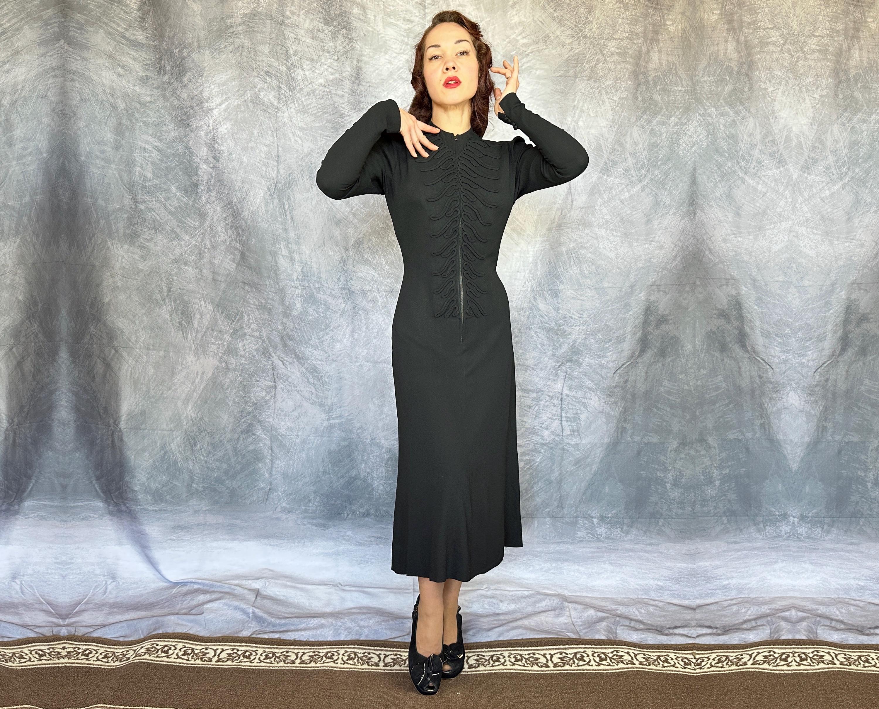 You can always look to "Fashion Originators Guild" for drama and this 1930s example delivers while keeping it simple! Made of black rayon crepe, it's all about the details with this one. The sleek body is adorned with trapunto quilting that look like rib bones that will make the gothic girlies swoon. The shoulders are lightly puffed with gathers and the cuffs taper and fasten with four loop buttons. You'll get this vampy look together in a jiffy with the metal "Talon" bell pull zipper that fastens from the high neck to high hip. This dress is in great vintage condition, with no holes, stains, or odors to note. dress has been pinned on model to show fit.