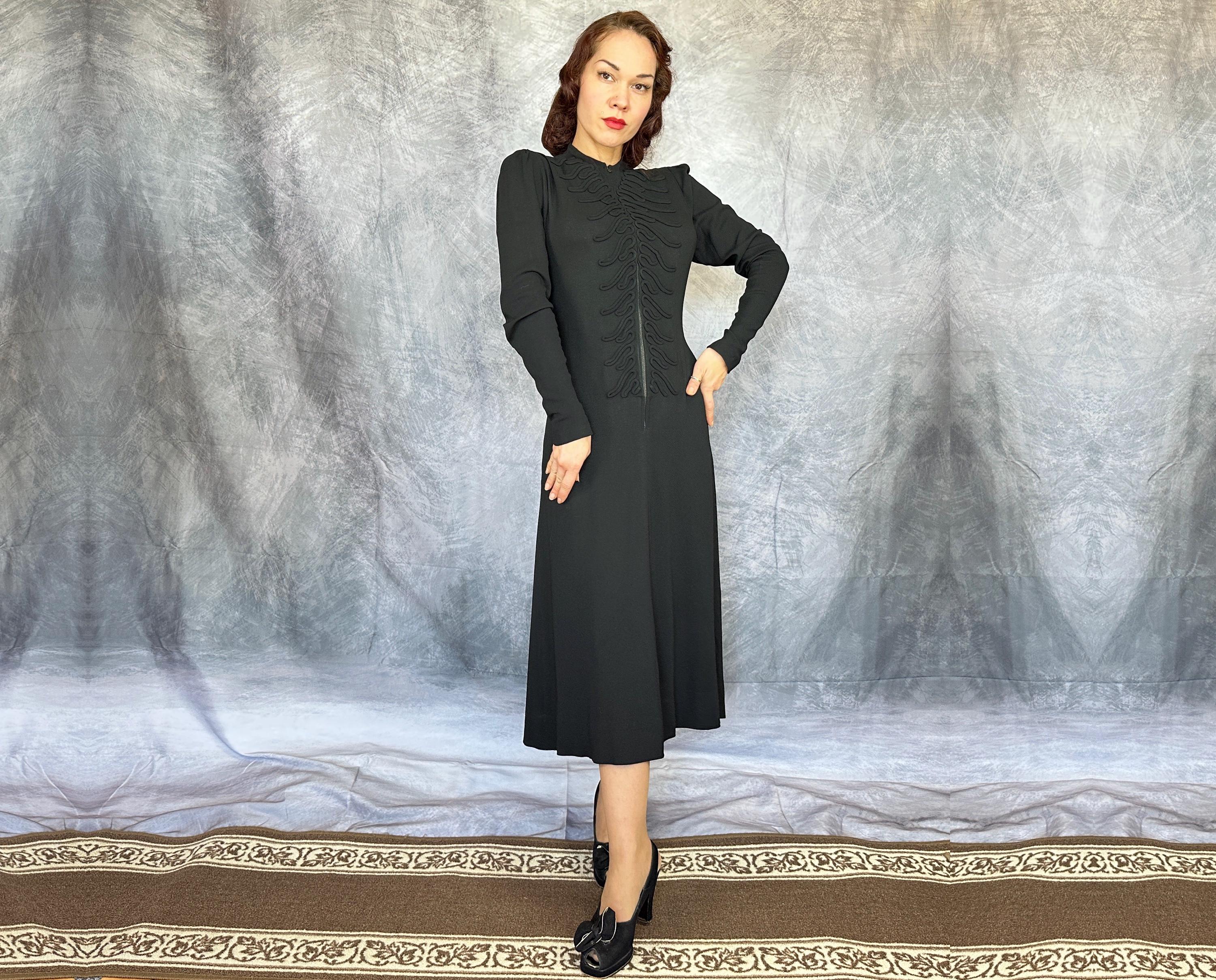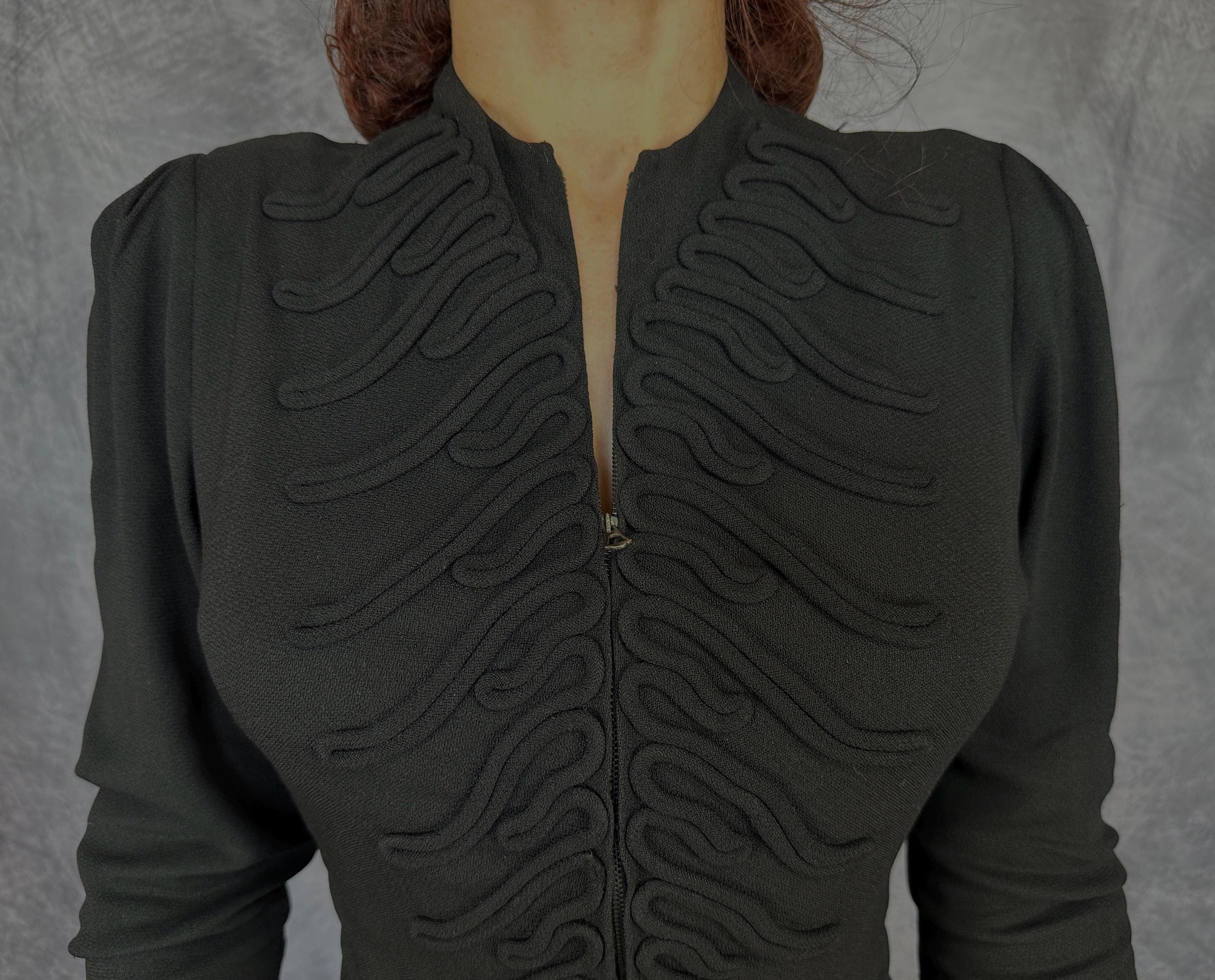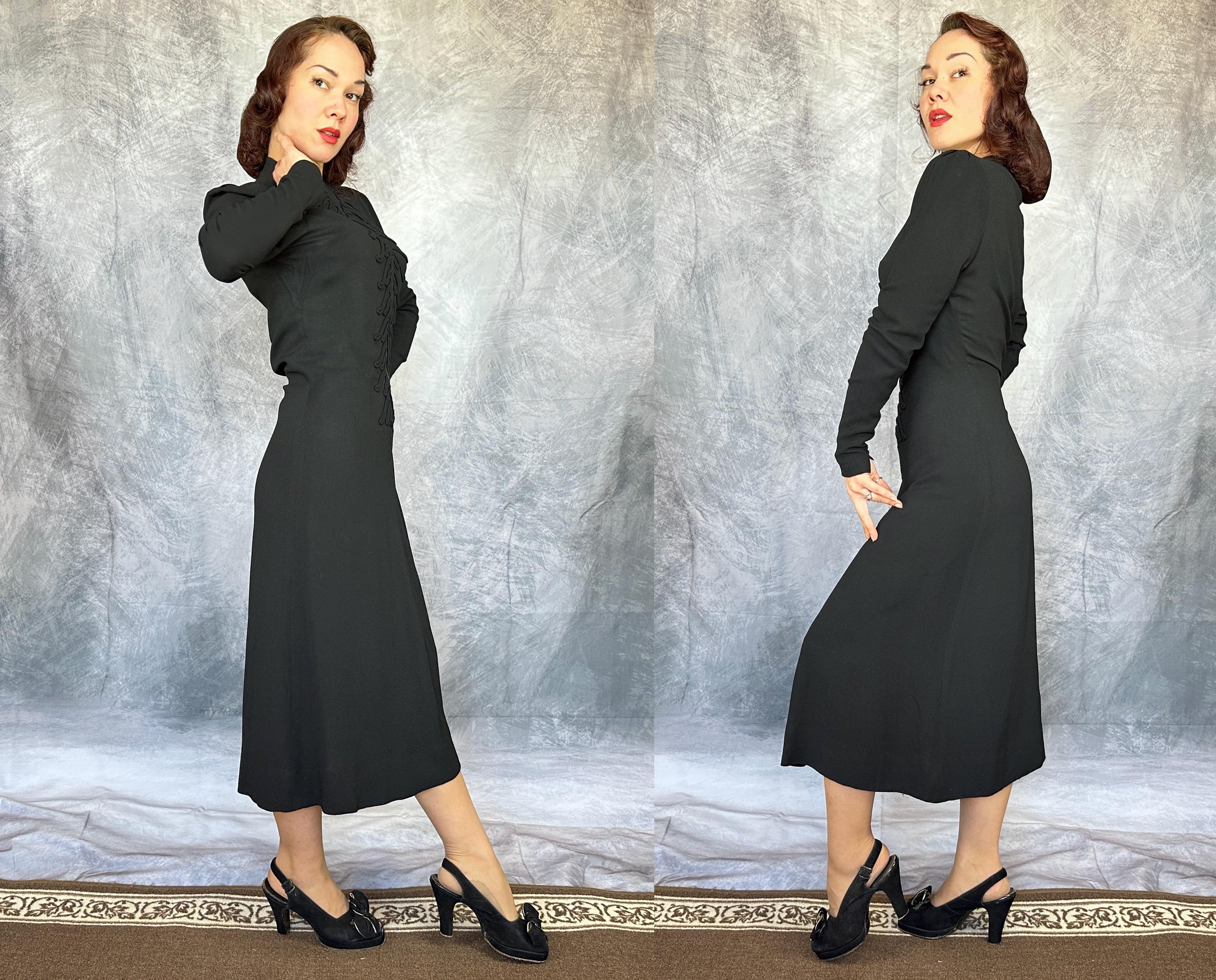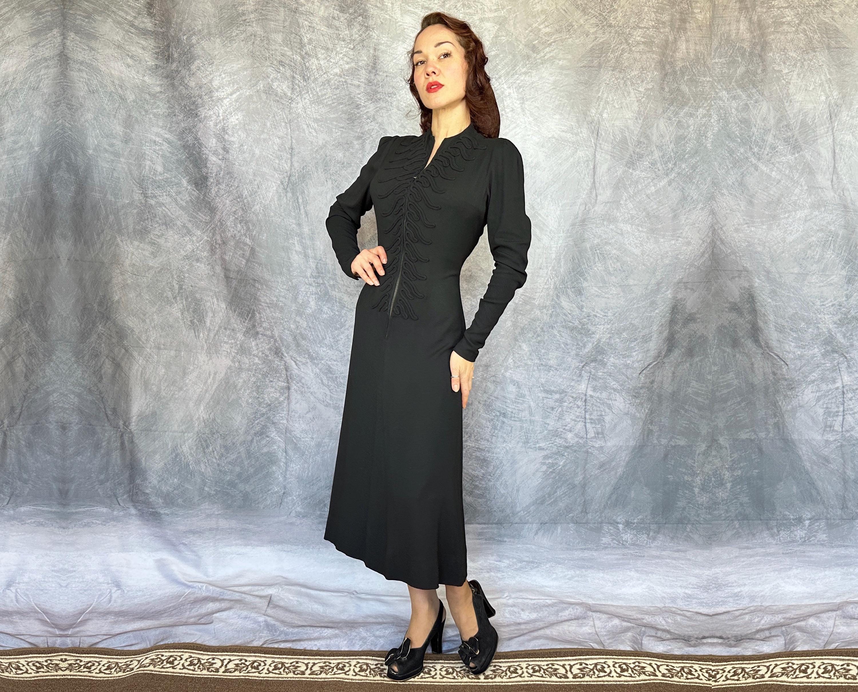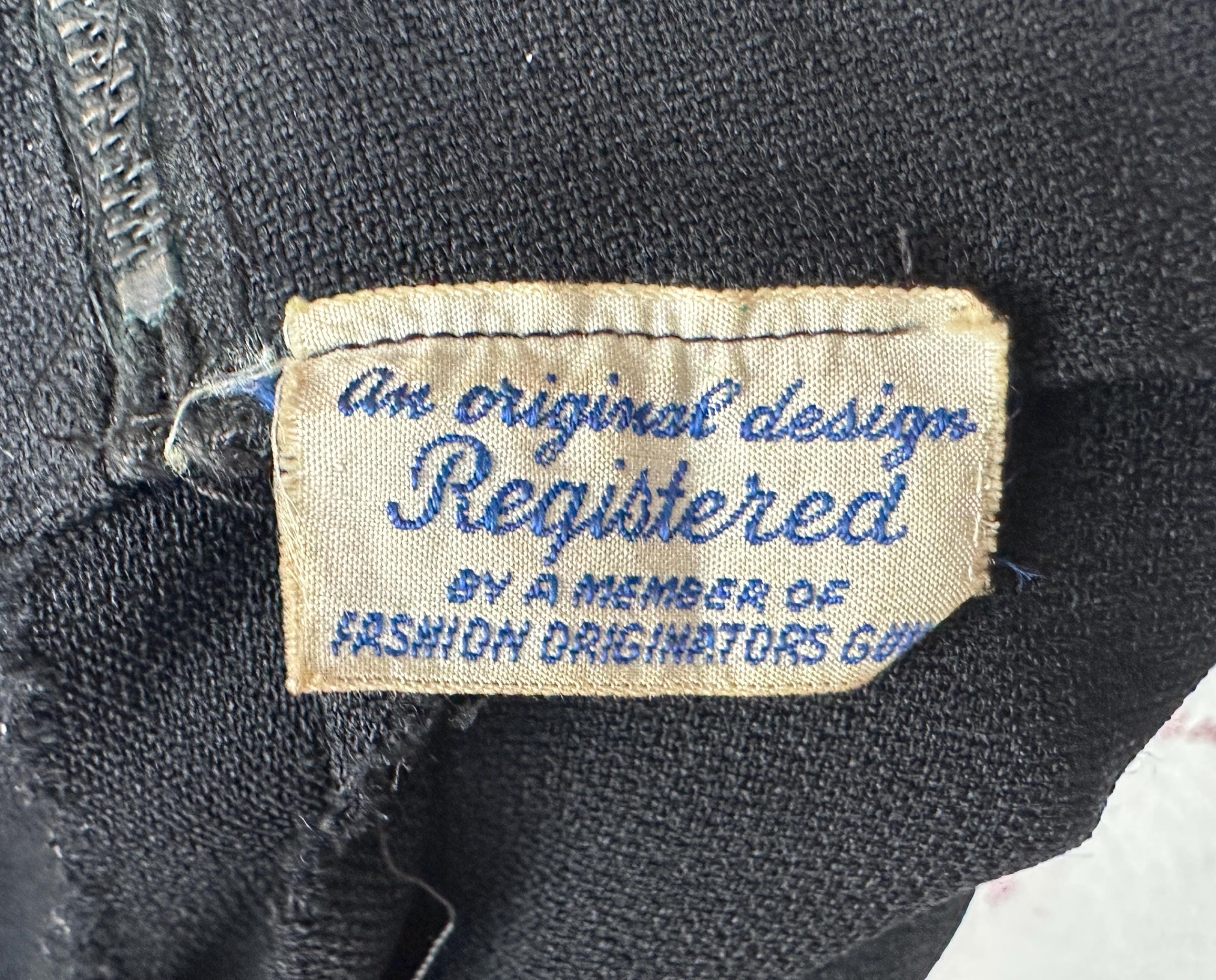 You can always look to "Fashion Originators Guild" for drama and this 1930s example delivers while keeping it simple! Made of black rayon crepe, it's all about the details with this one. The sleek body is adorned with trapunto quilting that look like rib bones that will make the gothic girlies swoon. The shoulders are lightly puffed with gathers and the cuffs taper and fasten with four loop buttons. You'll get this vampy look together in a jiffy with the metal "Talon" bell pull zipper that fastens from the high neck to high hip. This dress is in great vintage condition, with no holes, stains, or odors to note. dress has been pinned on model to show fit.