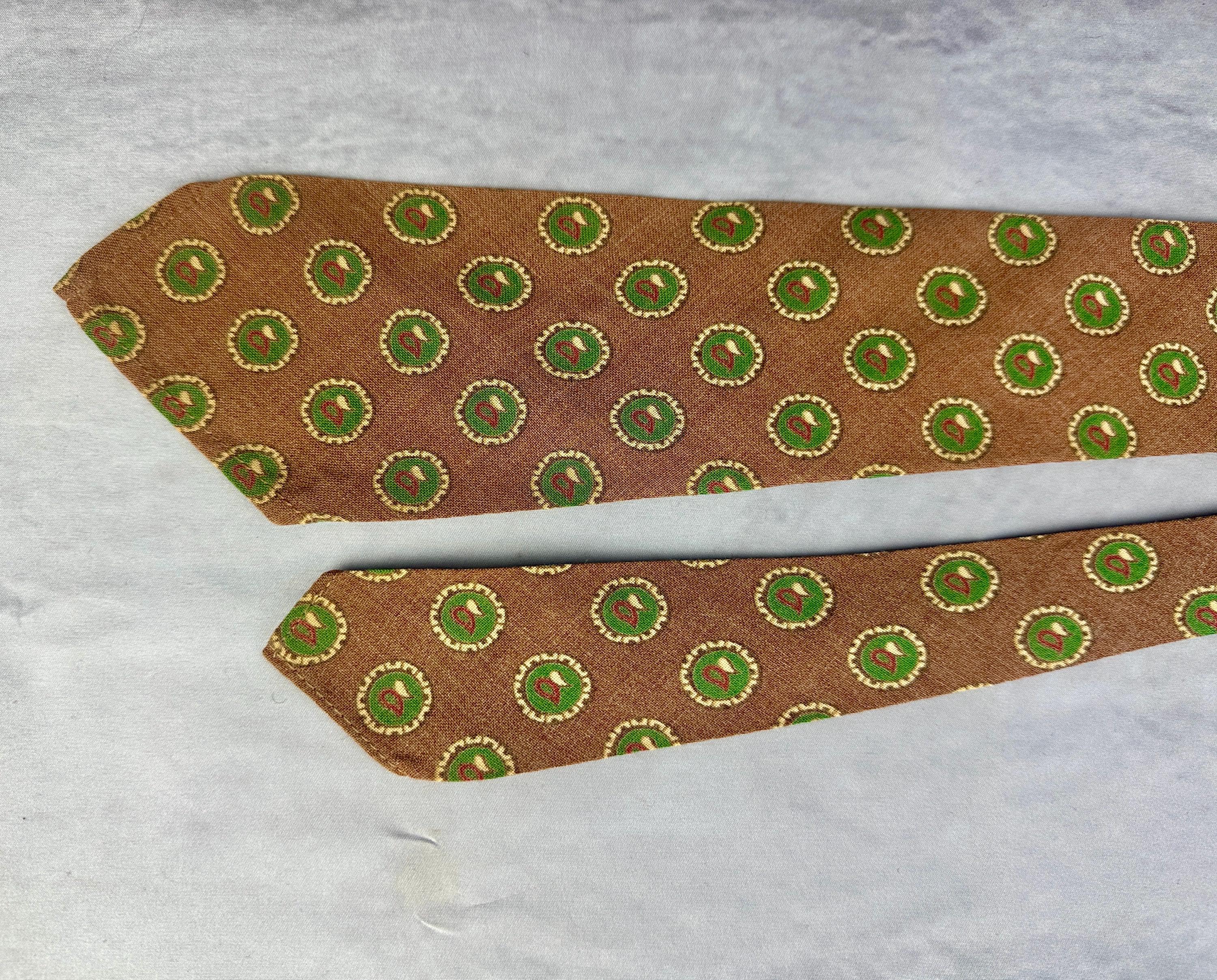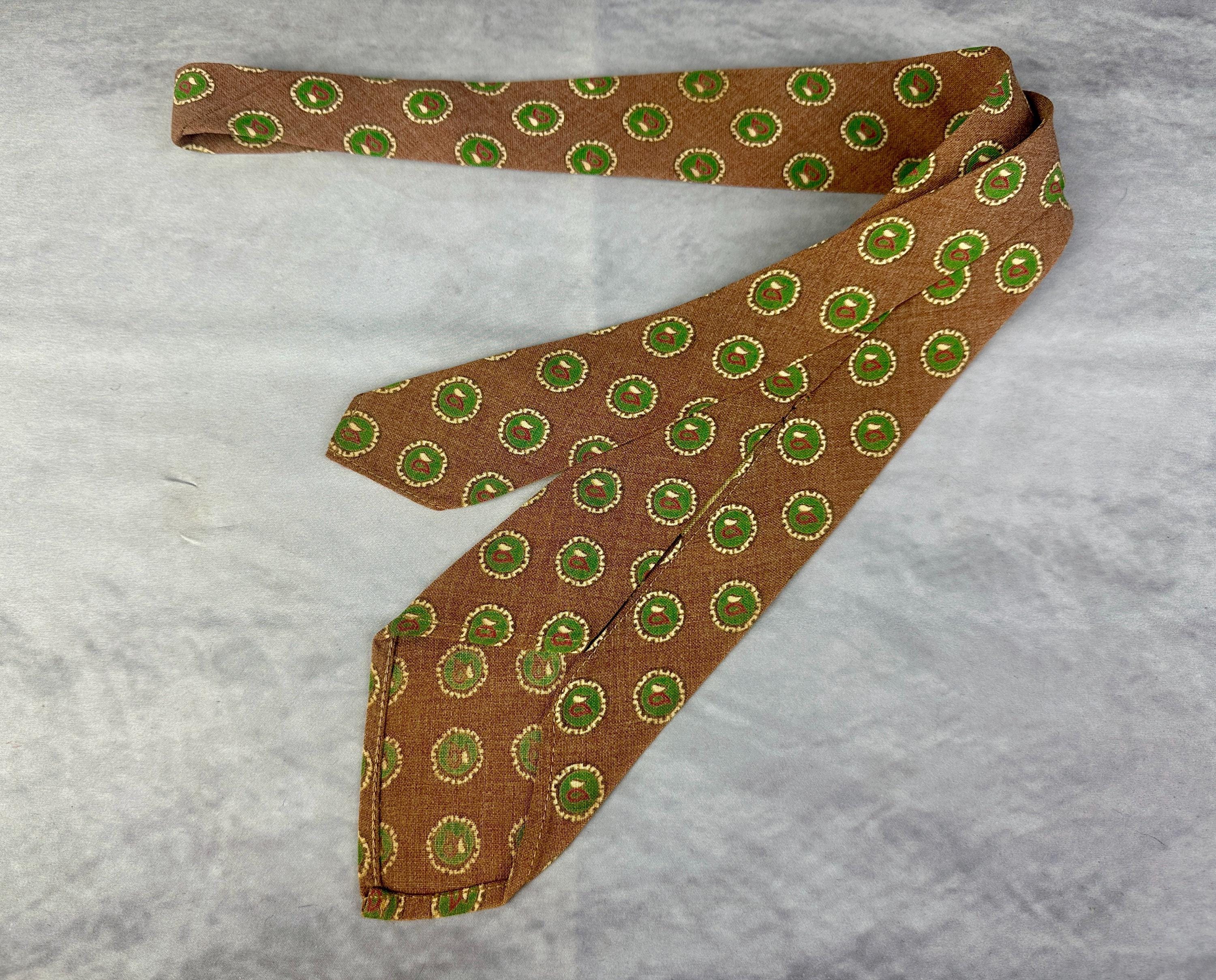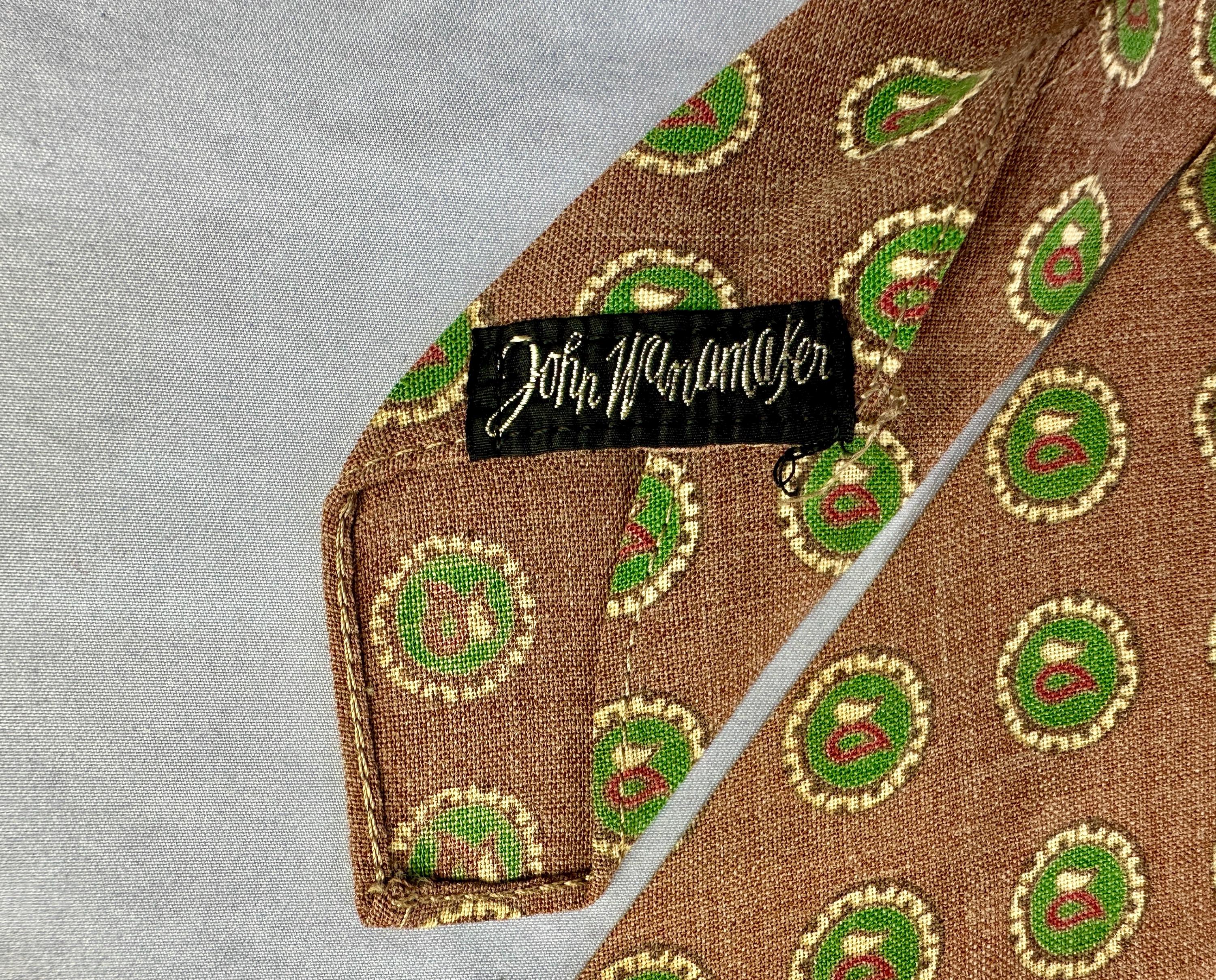 This 1930s necktie will transform any suit with amoeba like ability! Made of wool in muted cedar brown and printed with cell structures of cream and muted grass green holding teardrop shapes accented with brick red. Unlined and labeled "John Wanamaker". Pairs well with a wide variety of Art Deco and Mid-Century suit colors and fabric types. This tie is in great vintage condition with no flaws found.