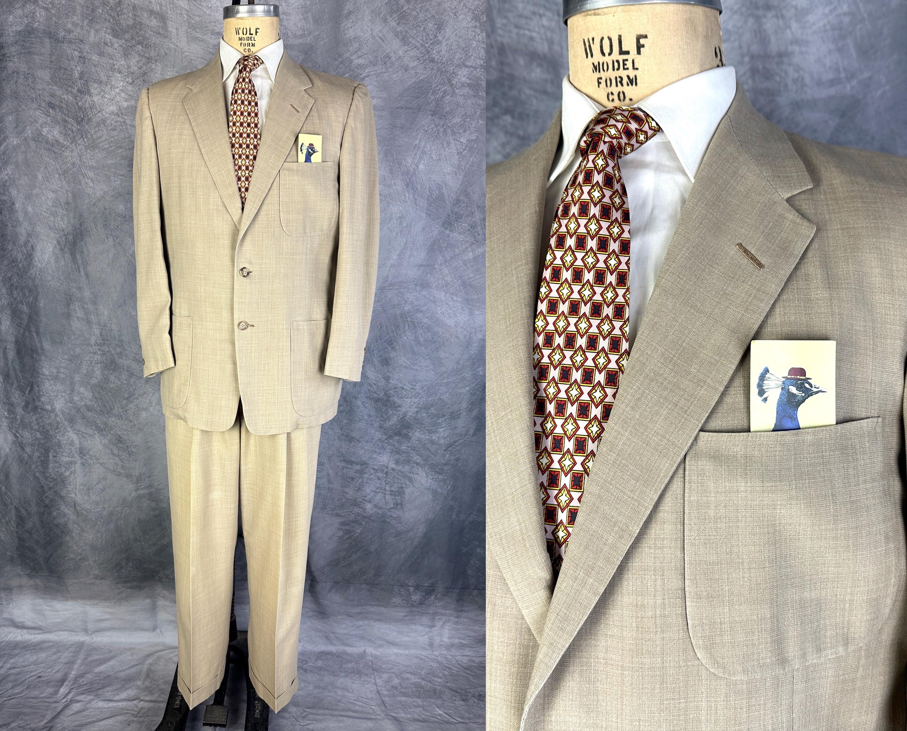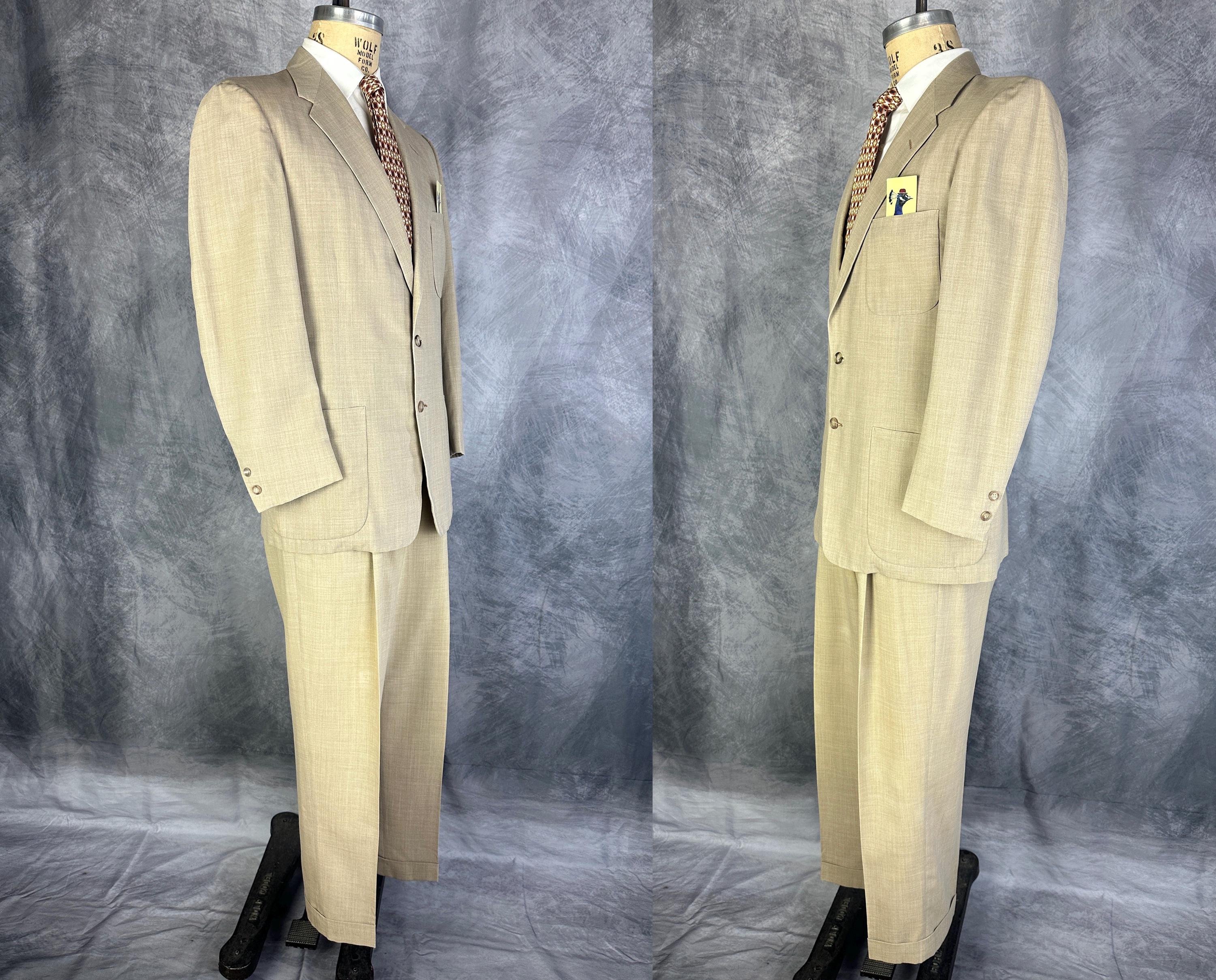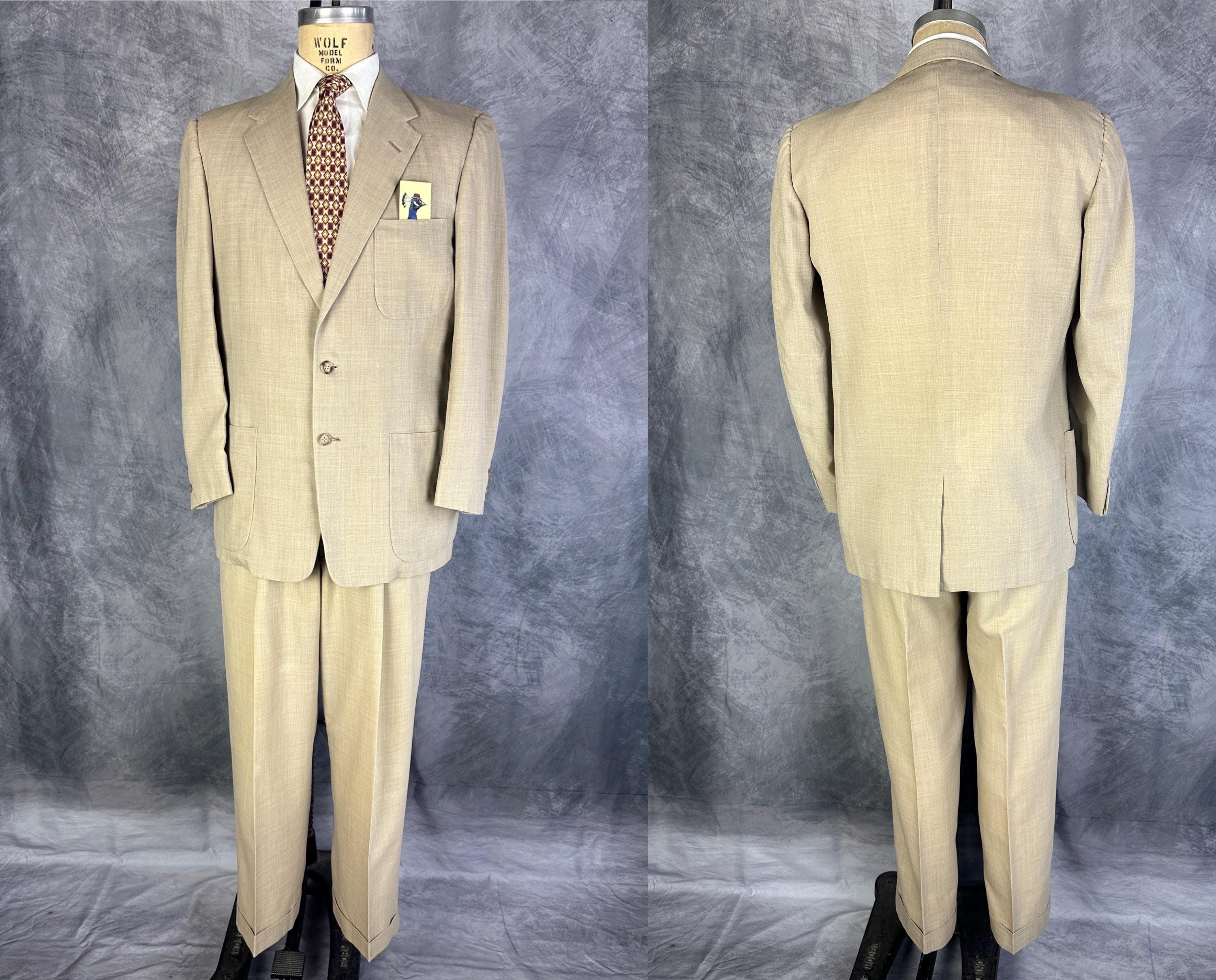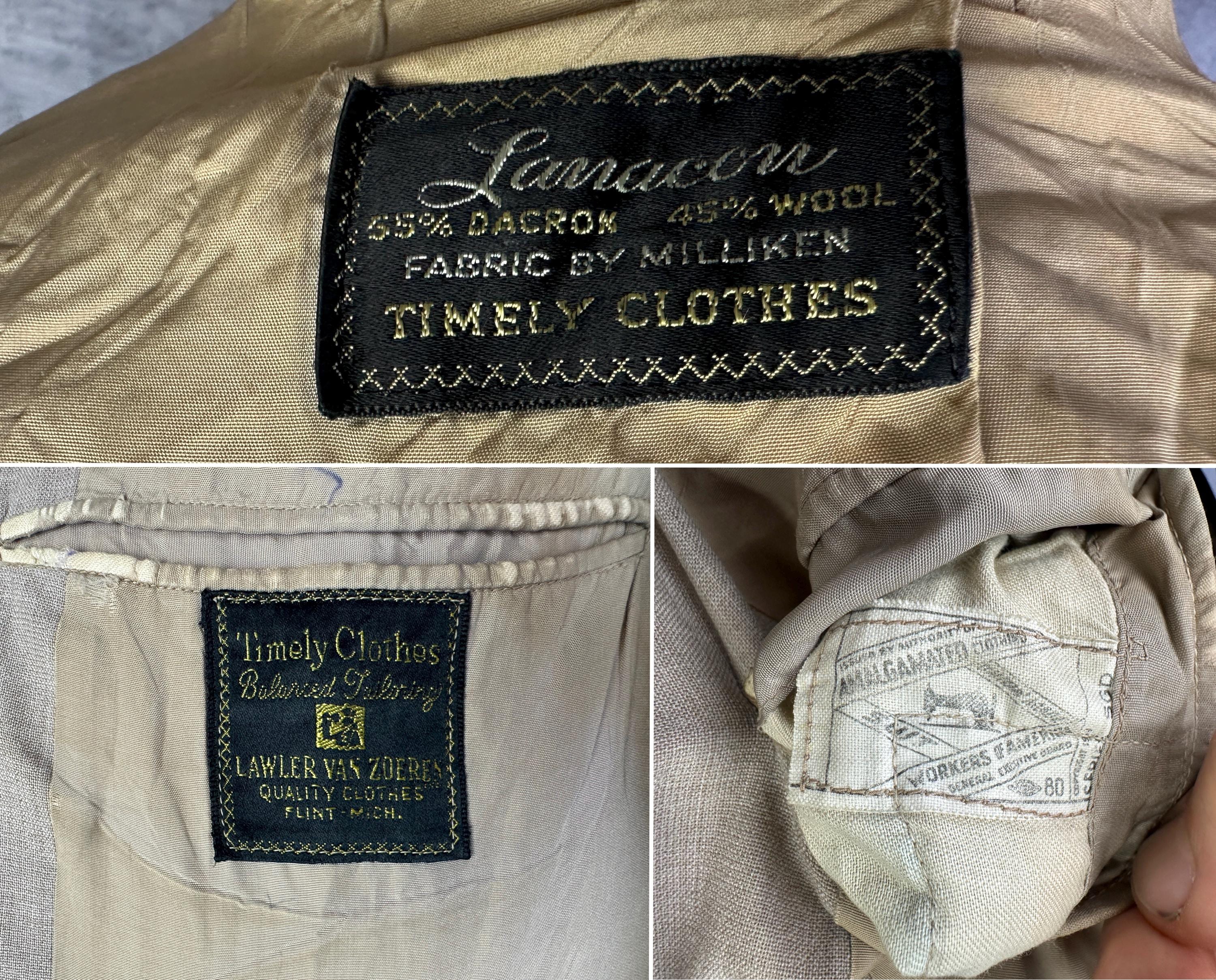 Just in time for a summer getaway, this 1950s "Timely Clothes" suit will help you look your best! The sandy beige cloth is a wool and Dacron blend in a summer weight and only lightly lined. The single breasted jacket has a two button closure, notched lapel, three patch pockets, single vent, two inner pockets, and padded shoulders. The trousers have a pleated front, metal "Talon" zip fly, side seam pockets and change pocket, two back pockets (one with button closure), dropped belt loops, and cuffs. Also labeled "Lawler Van Zoeren", with a 1949-62 Union Label dating this suit to the 1950s. This suit is in great vintage condition with no holes, stains, or odors to note.
