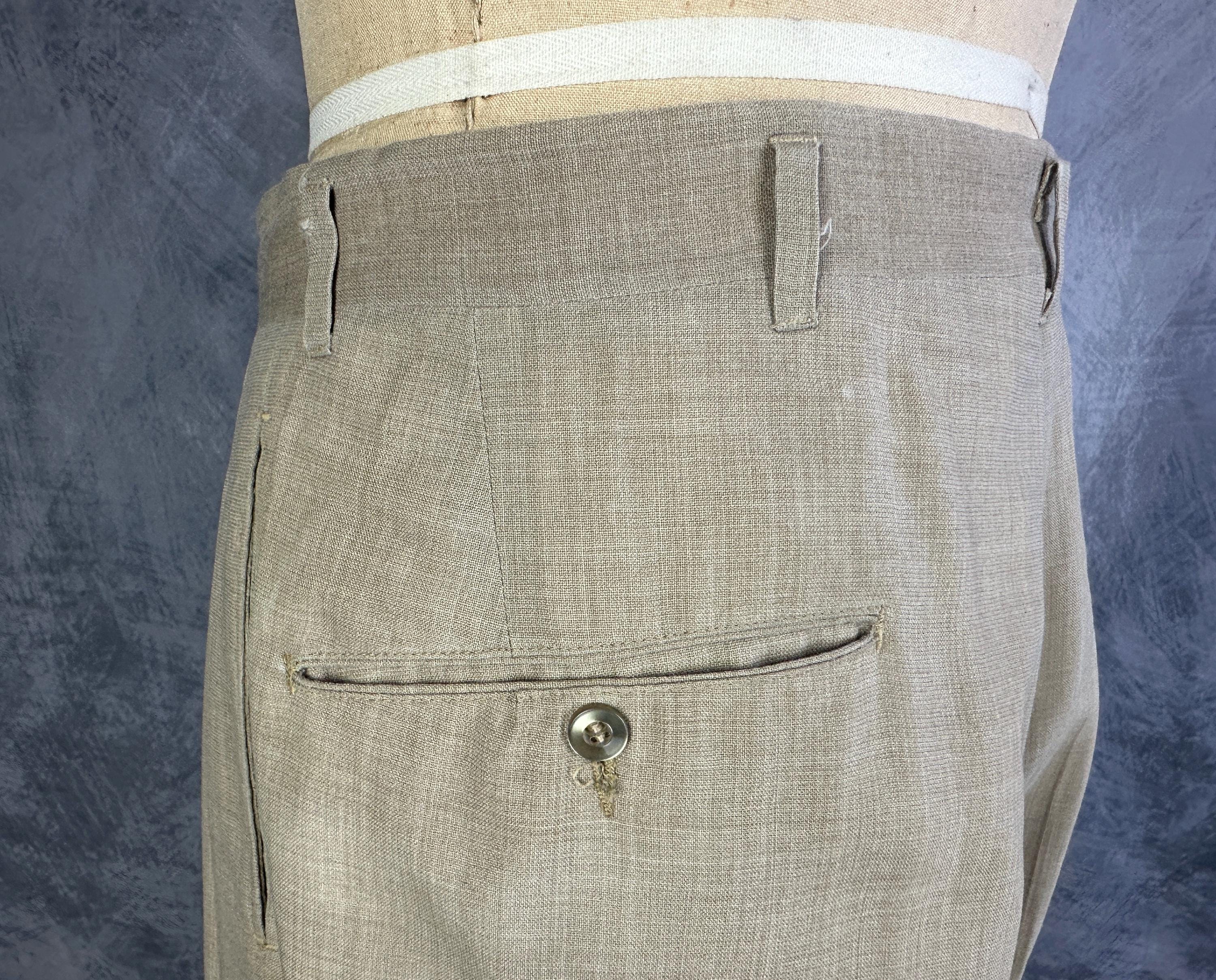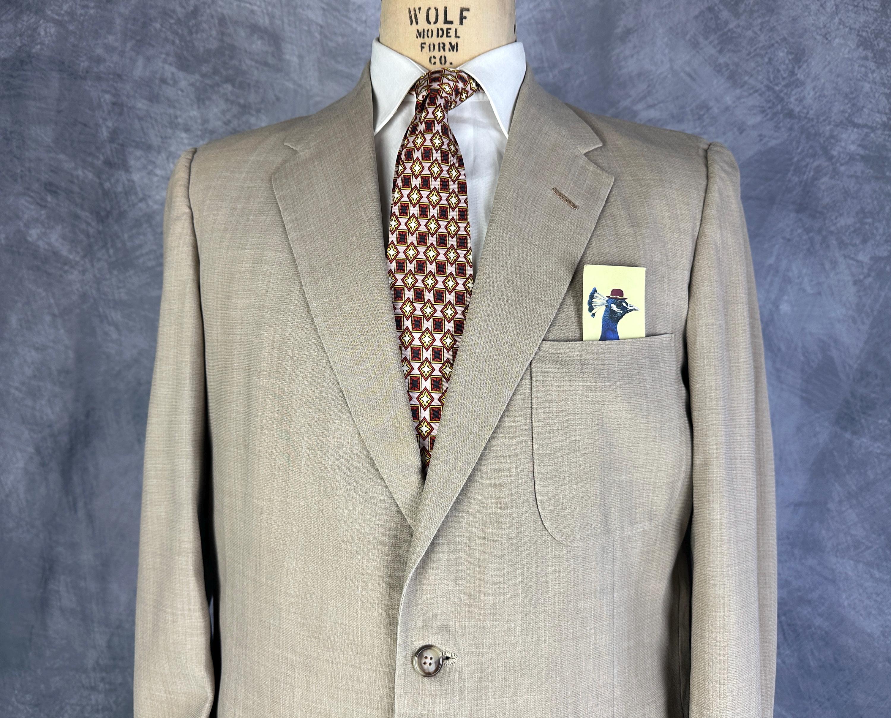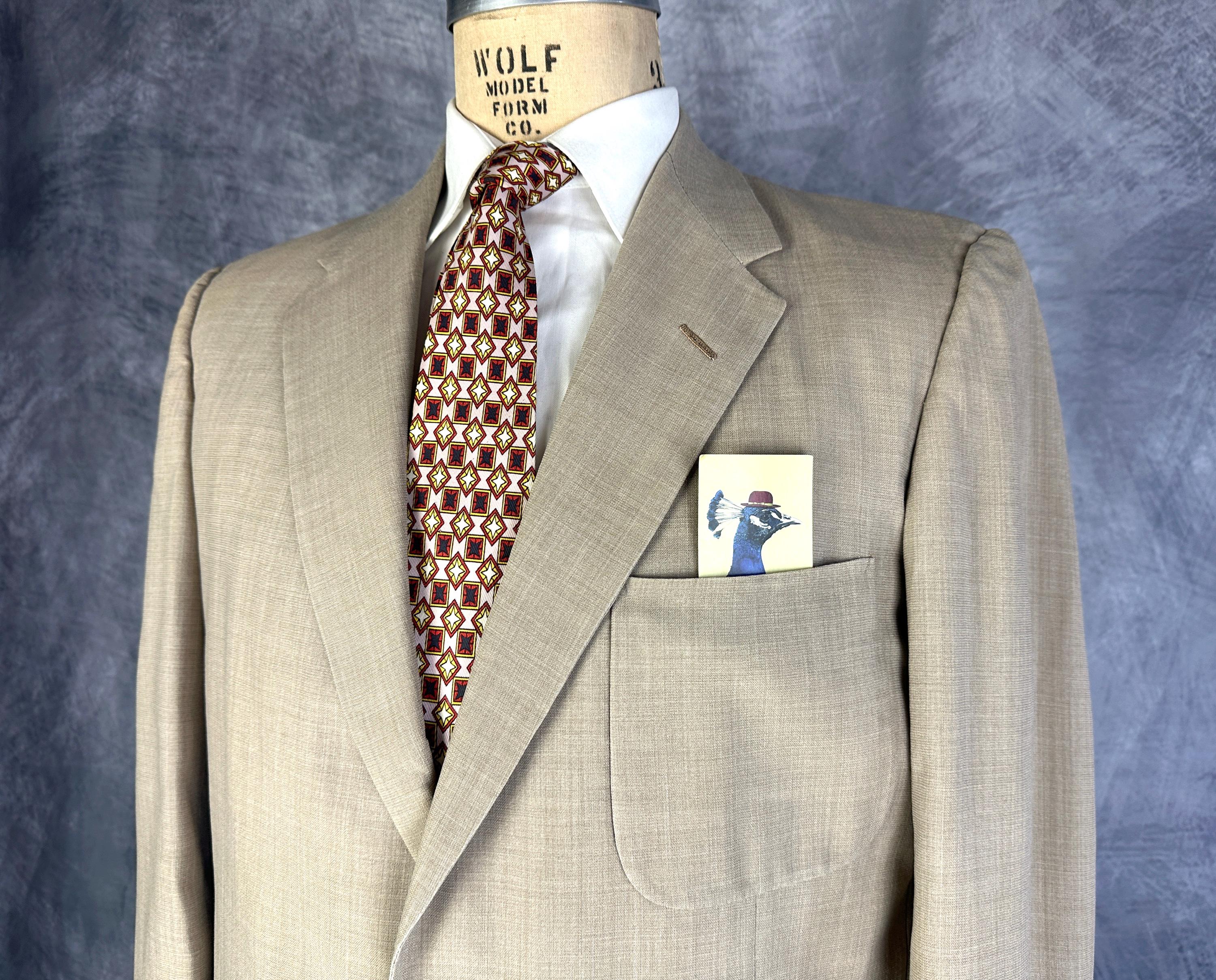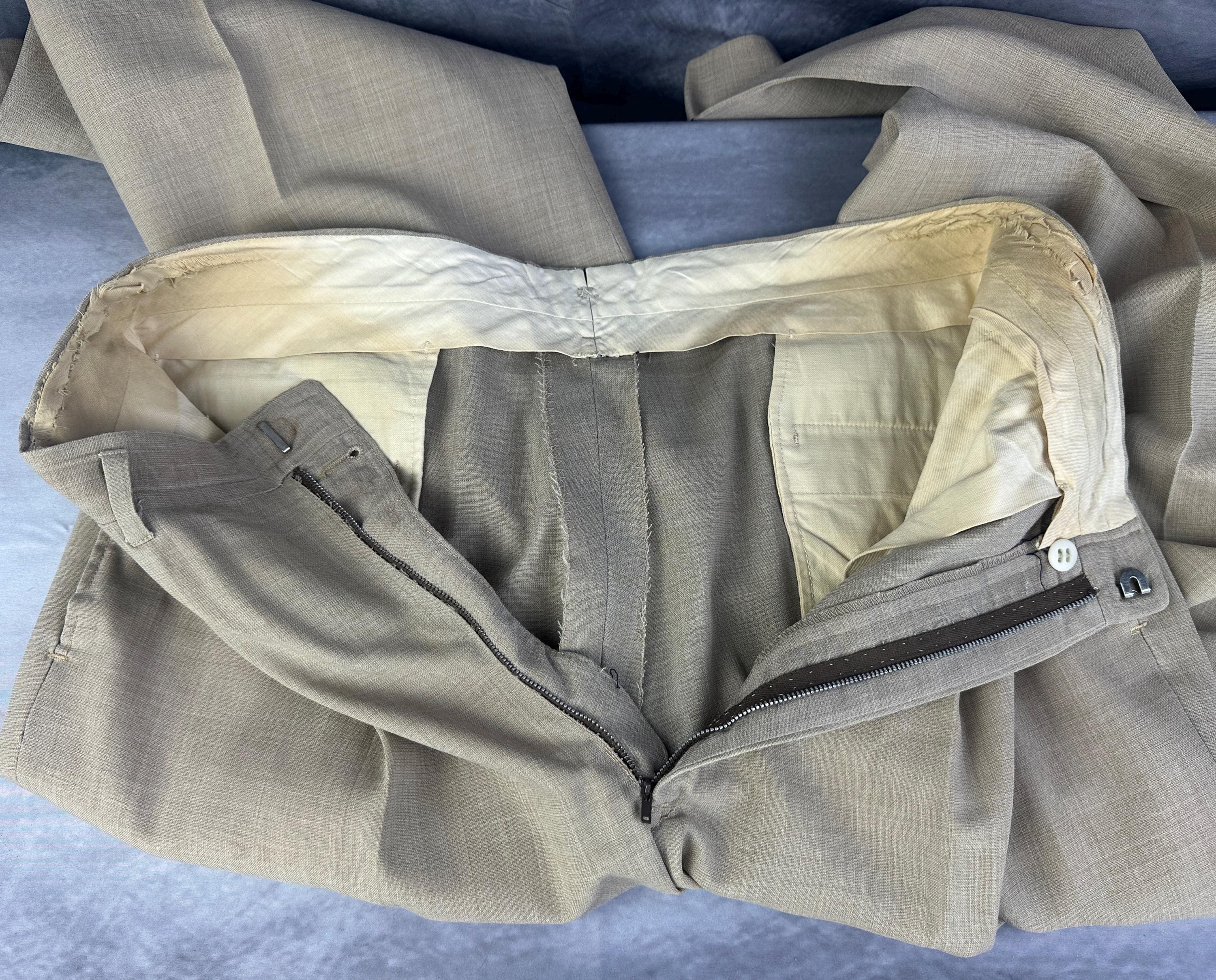 Just in time for a summer getaway, this 1950s "Timely Clothes" suit will help you look your best! The sandy beige cloth is a wool and Dacron blend in a summer weight and only lightly lined. The single breasted jacket has a two button closure, notched lapel, three patch pockets, single vent, two inner pockets, and padded shoulders. The trousers have a pleated front, metal "Talon" zip fly, side seam pockets and change pocket, two back pockets (one with button closure), dropped belt loops, and cuffs. Also labeled "Lawler Van Zoeren", with a 1949-62 Union Label dating this suit to the 1950s. This suit is in great vintage condition with no holes, stains, or odors to note.
