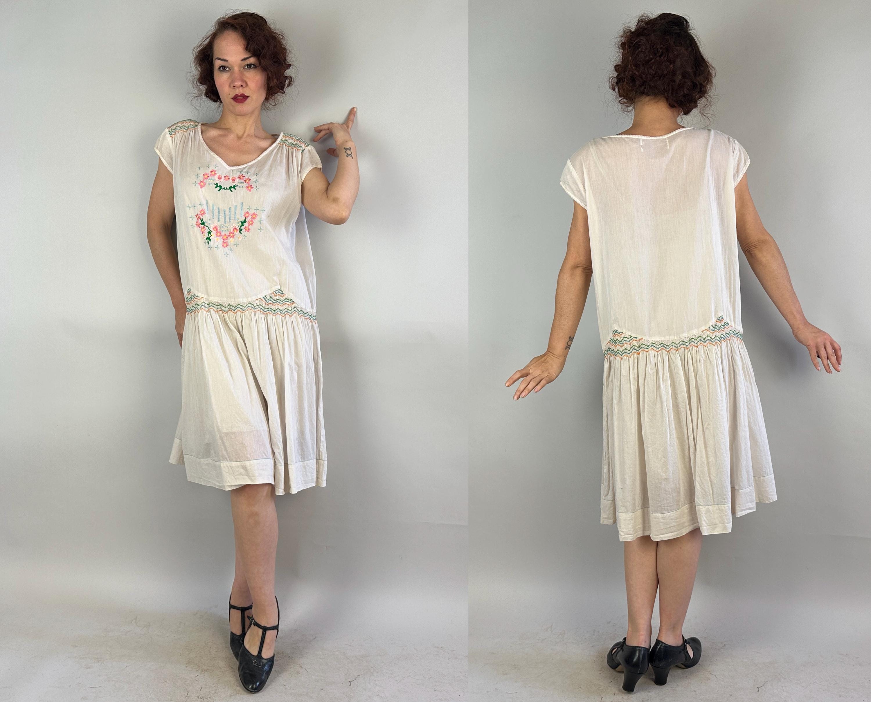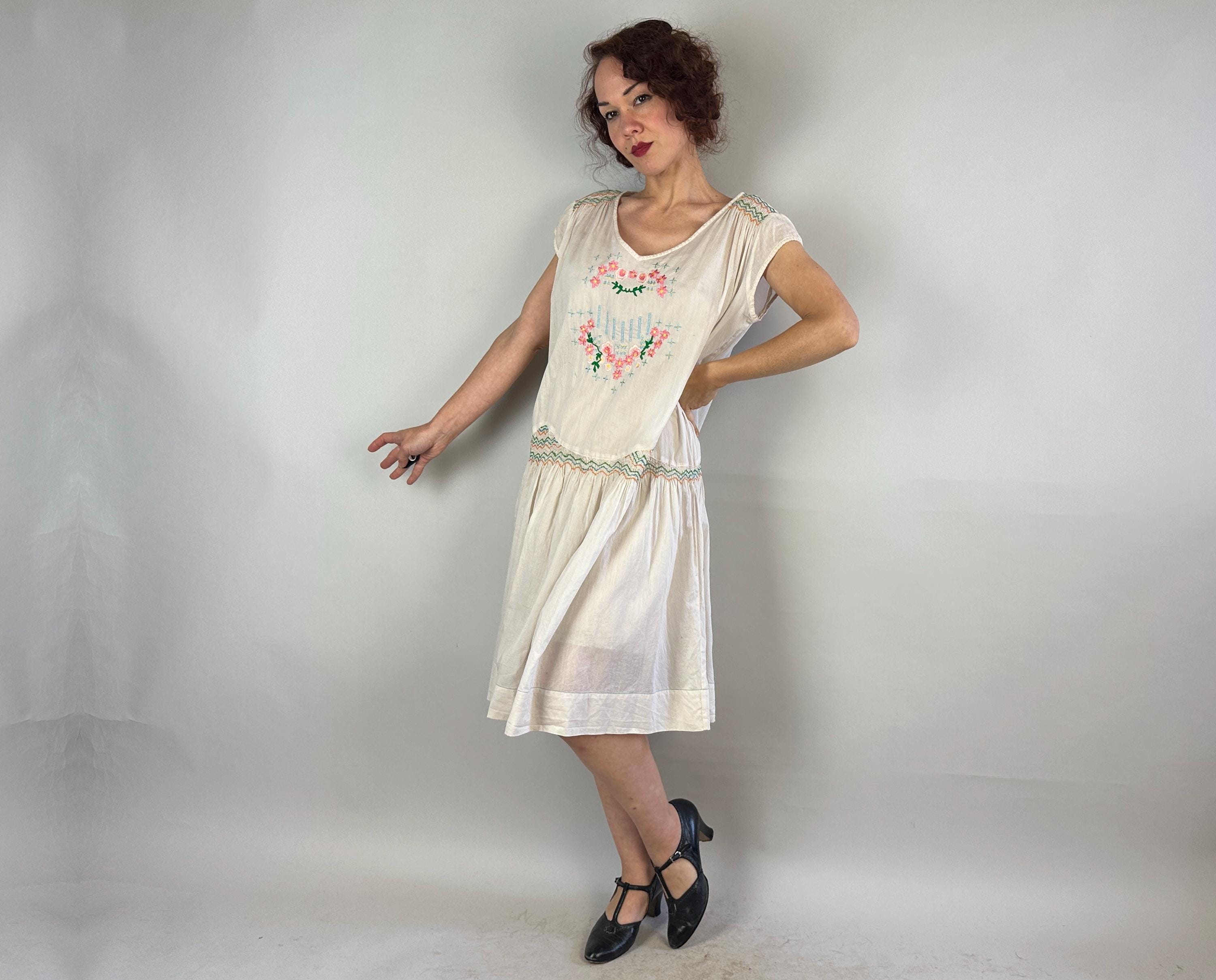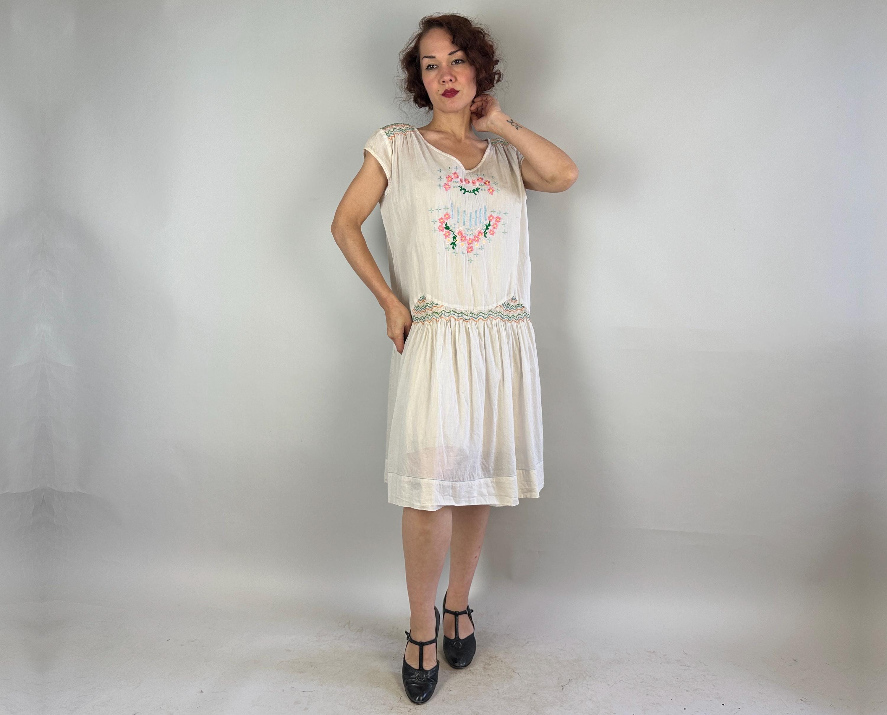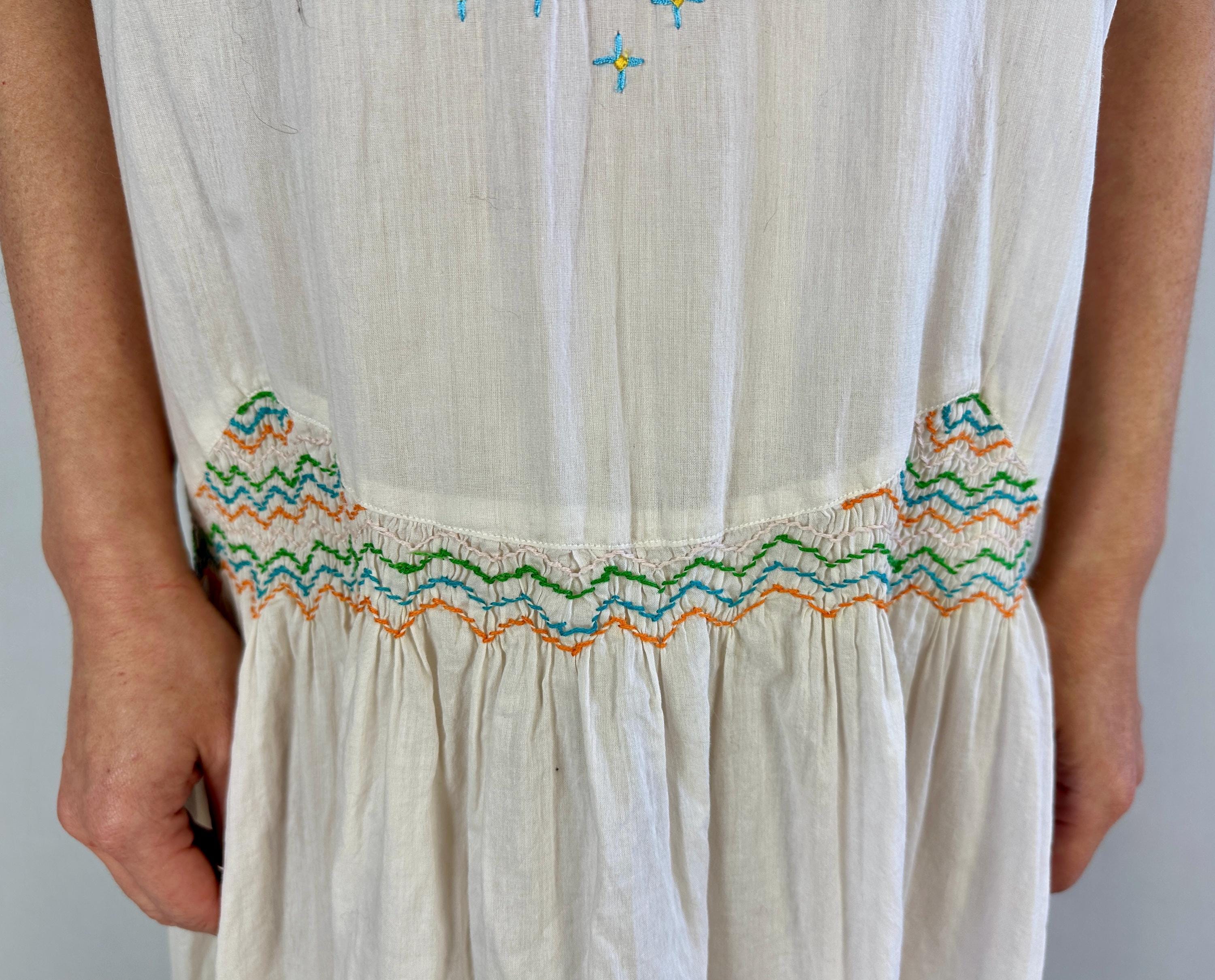 Whether field or avenue, you'll be frolicing with pastoral pleasantness in this 1920s peasant frock! The simple cut of this white cotton voile dress is the perfect backdrop to the beautiful floral embroidery and smocking in grass and kelly greens, baby and bubblegum pinks, sky blue, sunny yellow, and tangerine. It's a sleeveless style with a V-neck and dropped waist which is peaked and the smocking adds a little stretch and fullness to the skirt. This dress is in great vintage condition, with no holes, stains, or odors to note.
