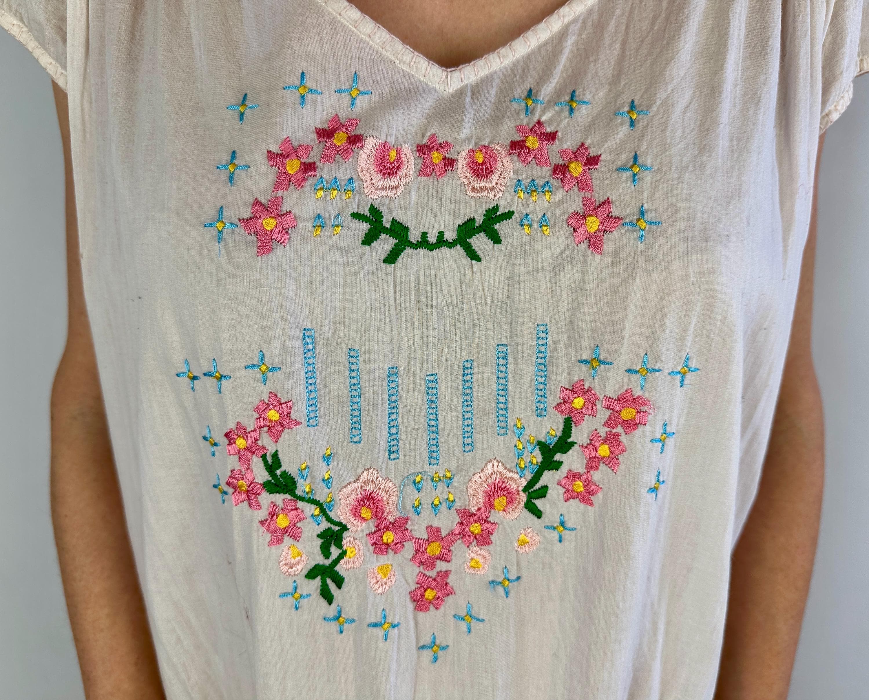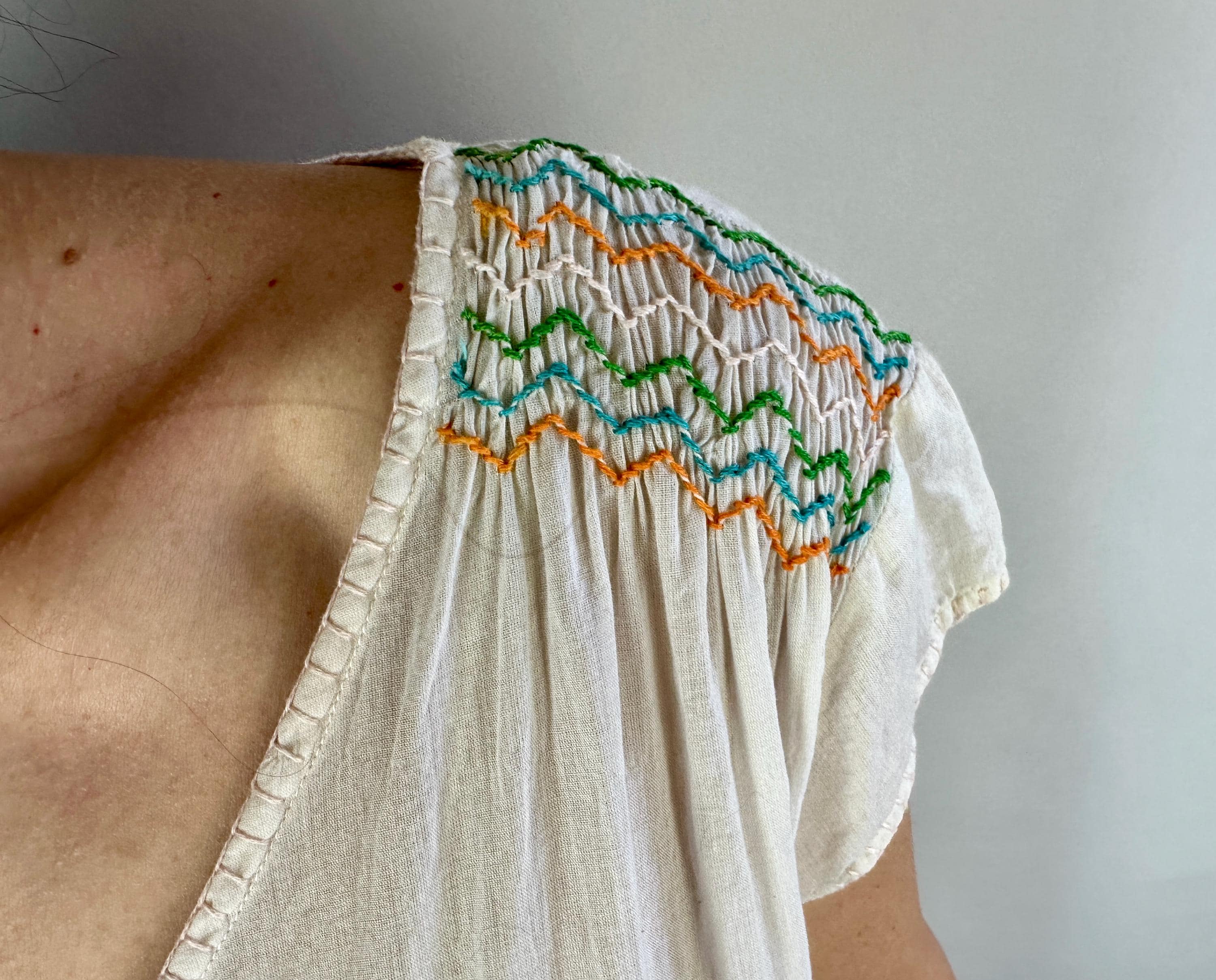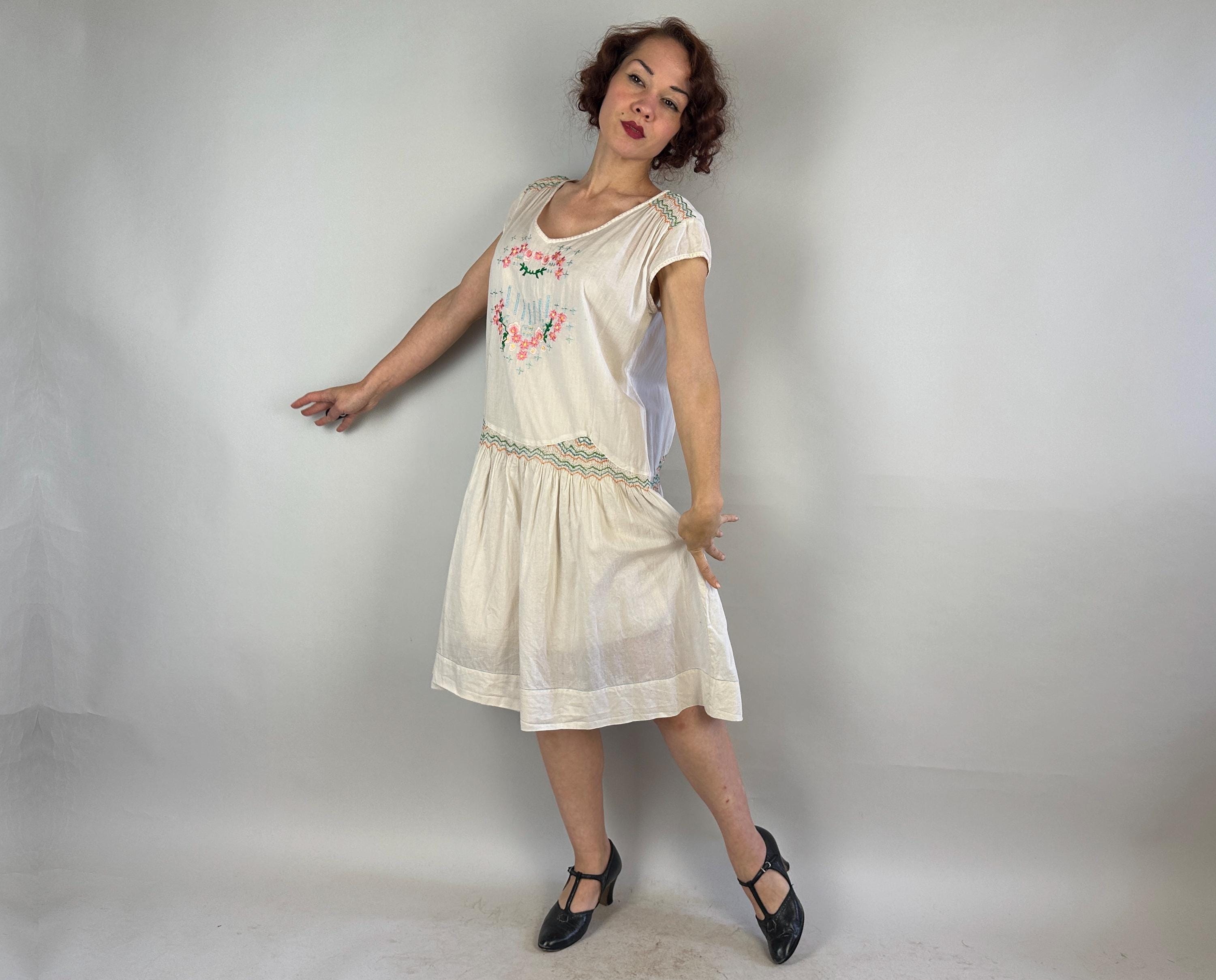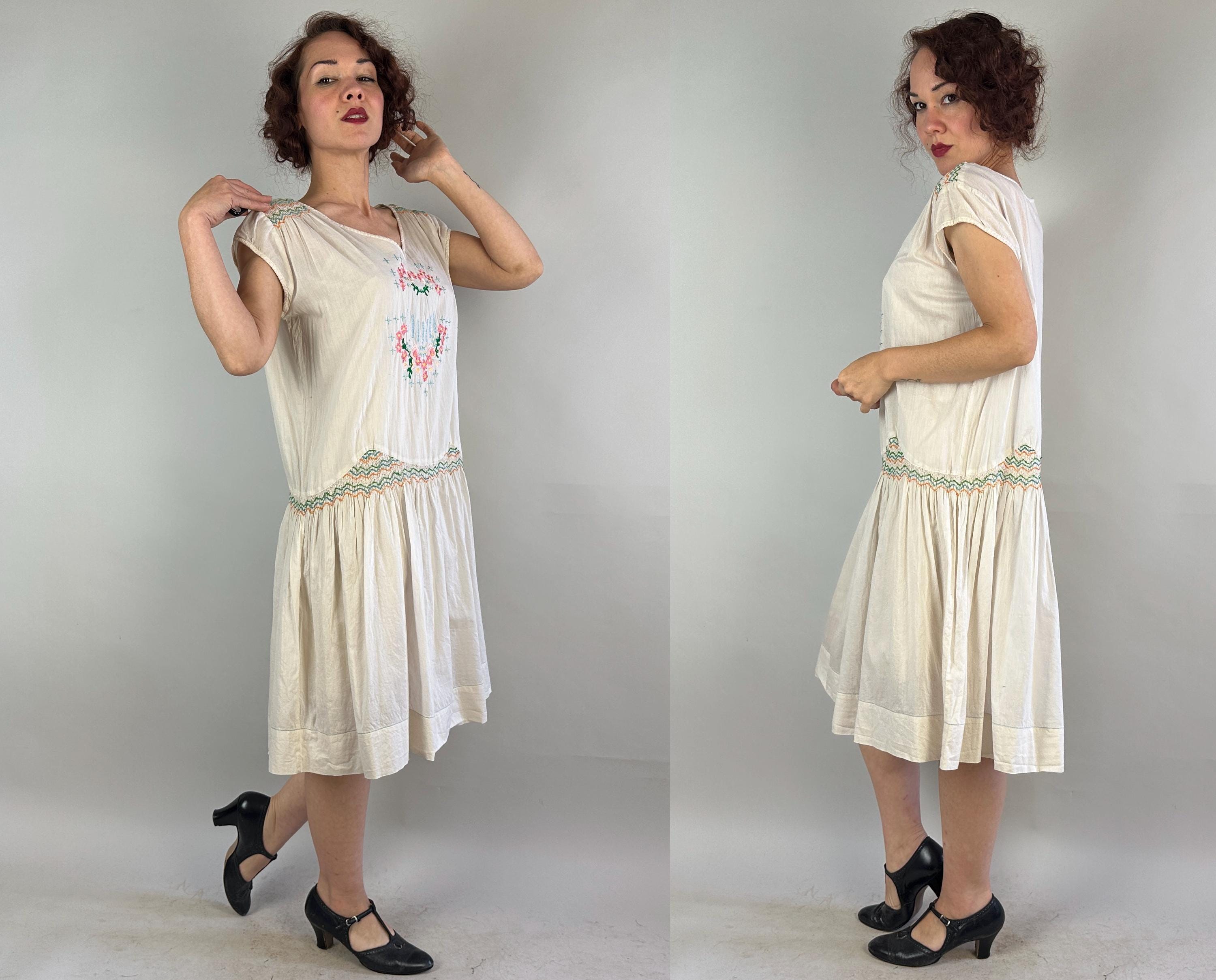 Whether field or avenue, you'll be frolicing with pastoral pleasantness in this 1920s peasant frock! The simple cut of this white cotton voile dress is the perfect backdrop to the beautiful floral embroidery and smocking in grass and kelly greens, baby and bubblegum pinks, sky blue, sunny yellow, and tangerine. It's a sleeveless style with a V-neck and dropped waist which is peaked and the smocking adds a little stretch and fullness to the skirt. This dress is in great vintage condition, with no holes, stains, or odors to note.