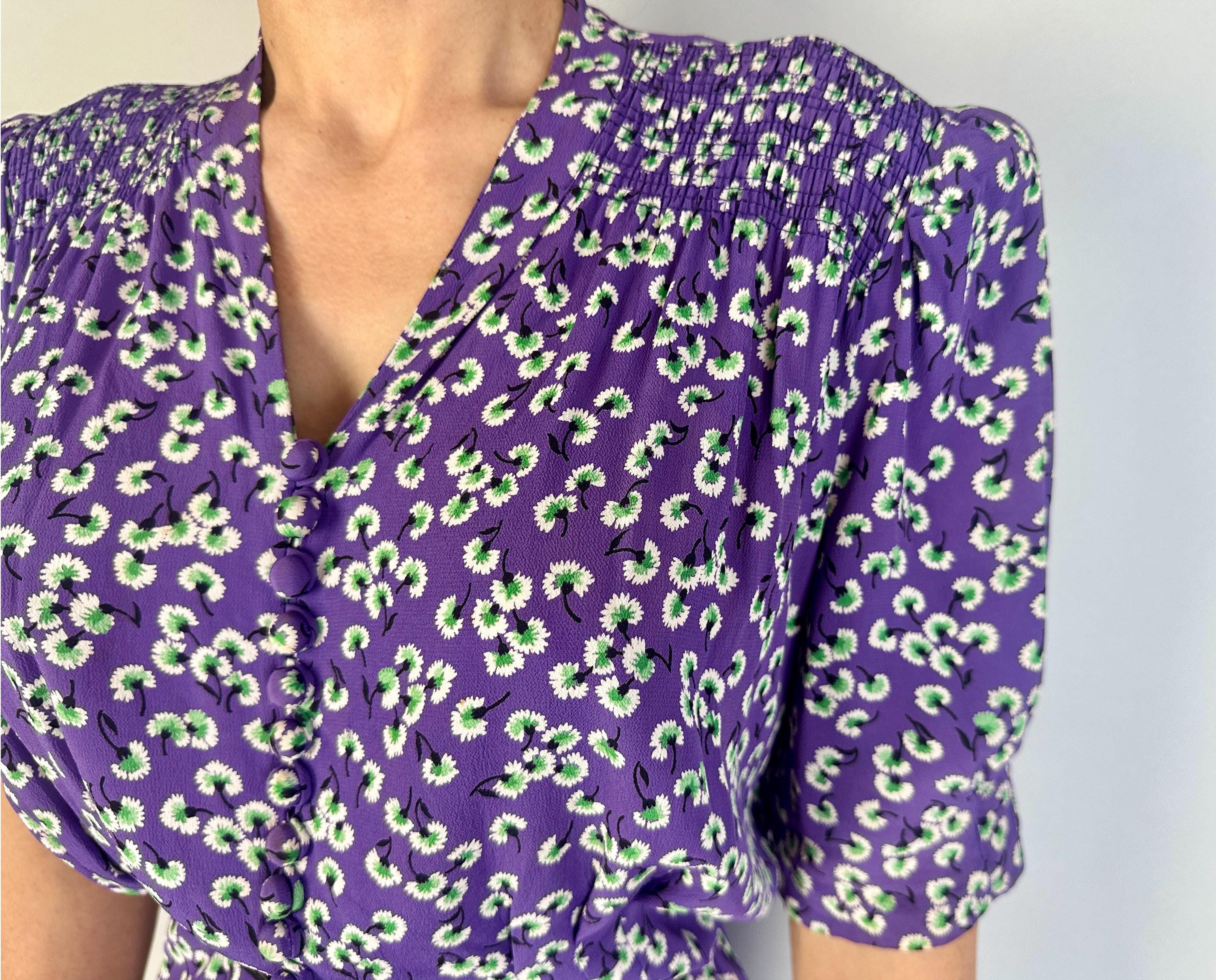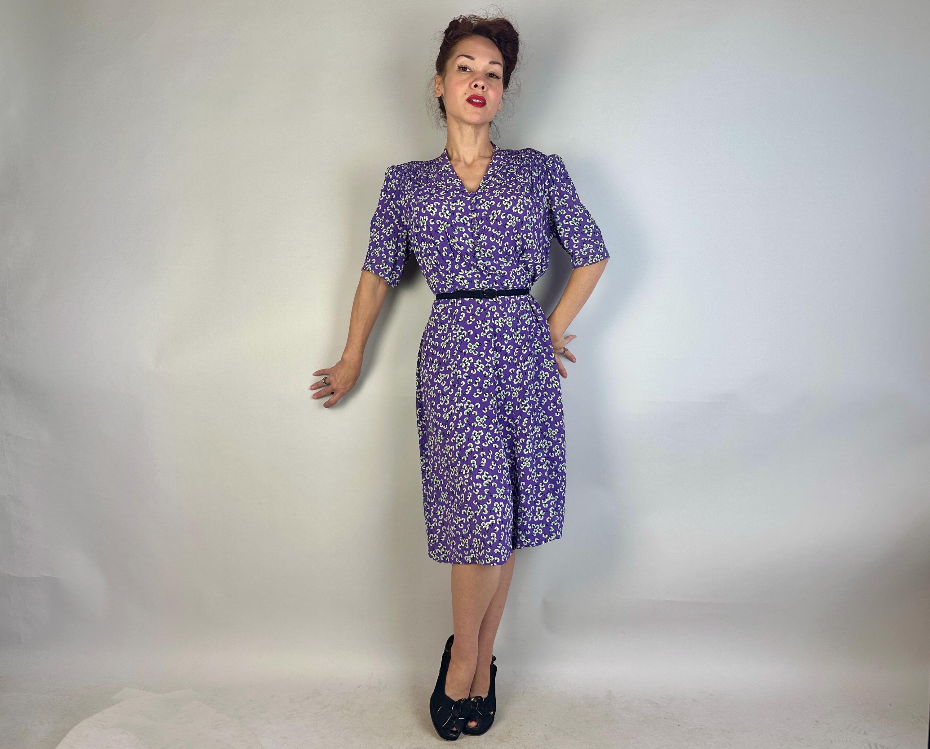 Carnations are blooming so heed that call in this 1930s dress! Violet purple rayon crepe is printed with cascading carnations of white, black, and green and the styling of the dress is just ideal with padded puff sleeves narrowed at the cuff with pintuck pleats, shoulder smocking, and a swingy gored skirt. The bodice is made blousey with darted pleats above the waistline and thirteen self fabric loop buttons fasten it up. This dress is in good vintage condition, the back of the neck shows wear and there is a subtle mark in the skirting. No other holes, stains, or odors to note. Please note, belt is model's own.