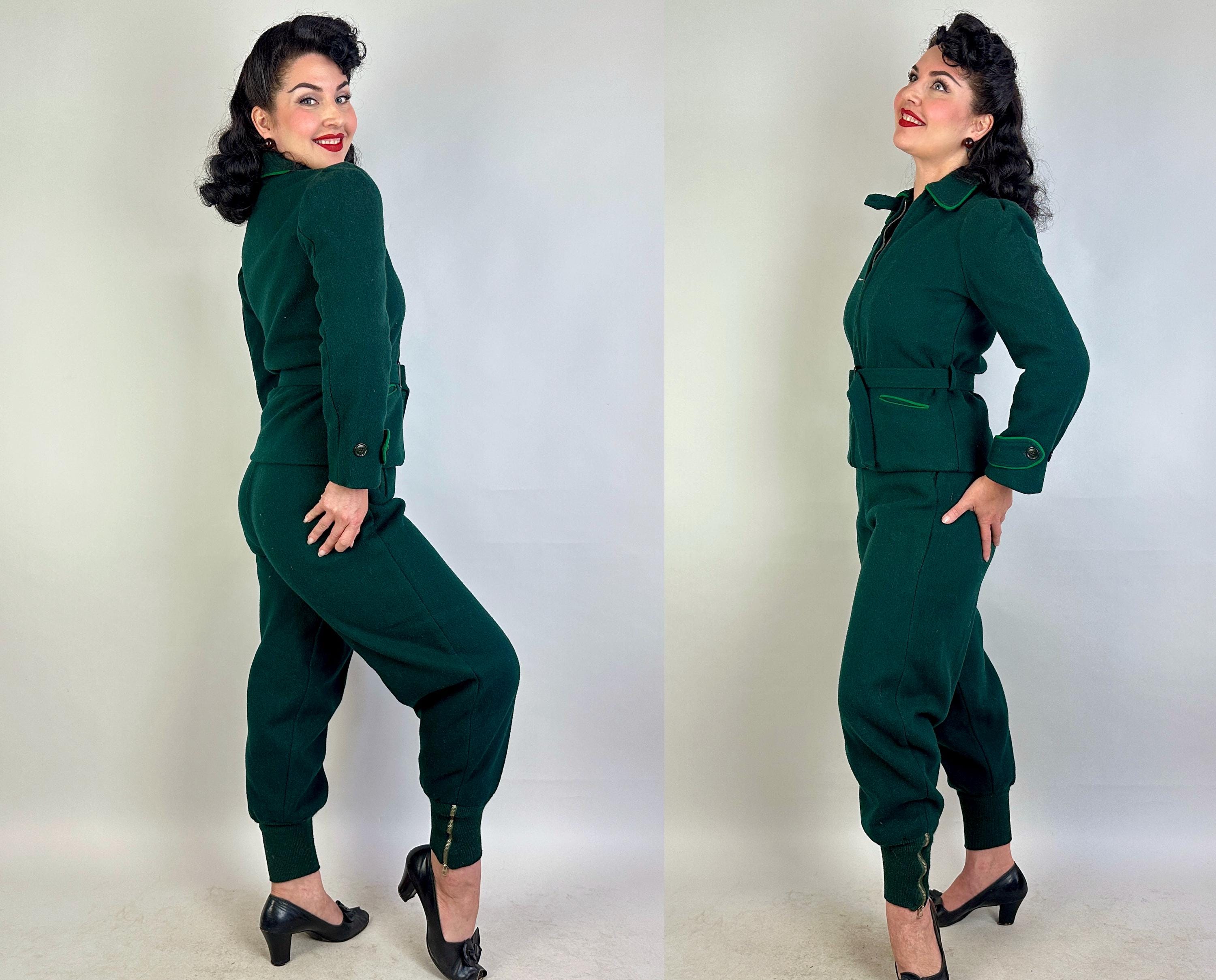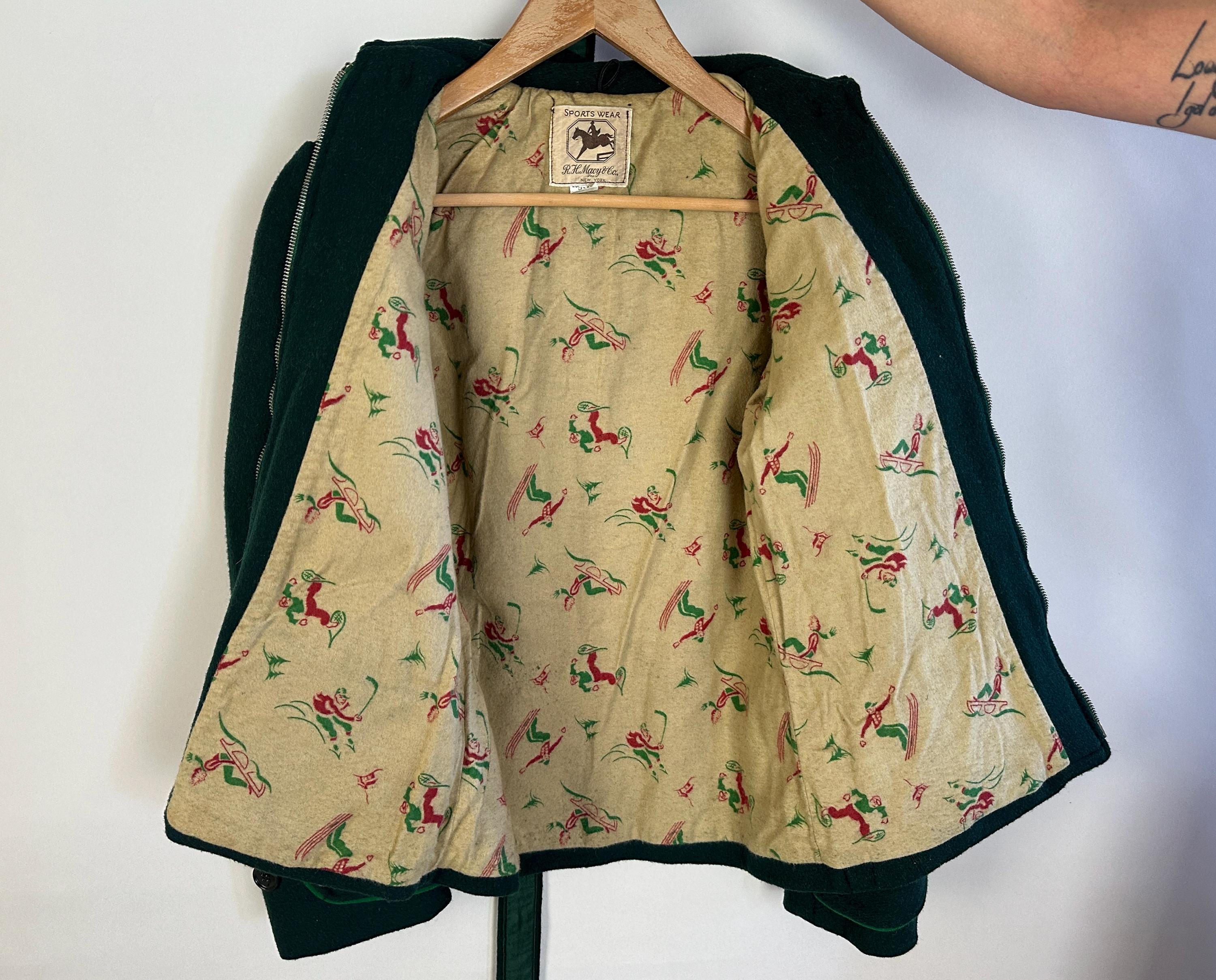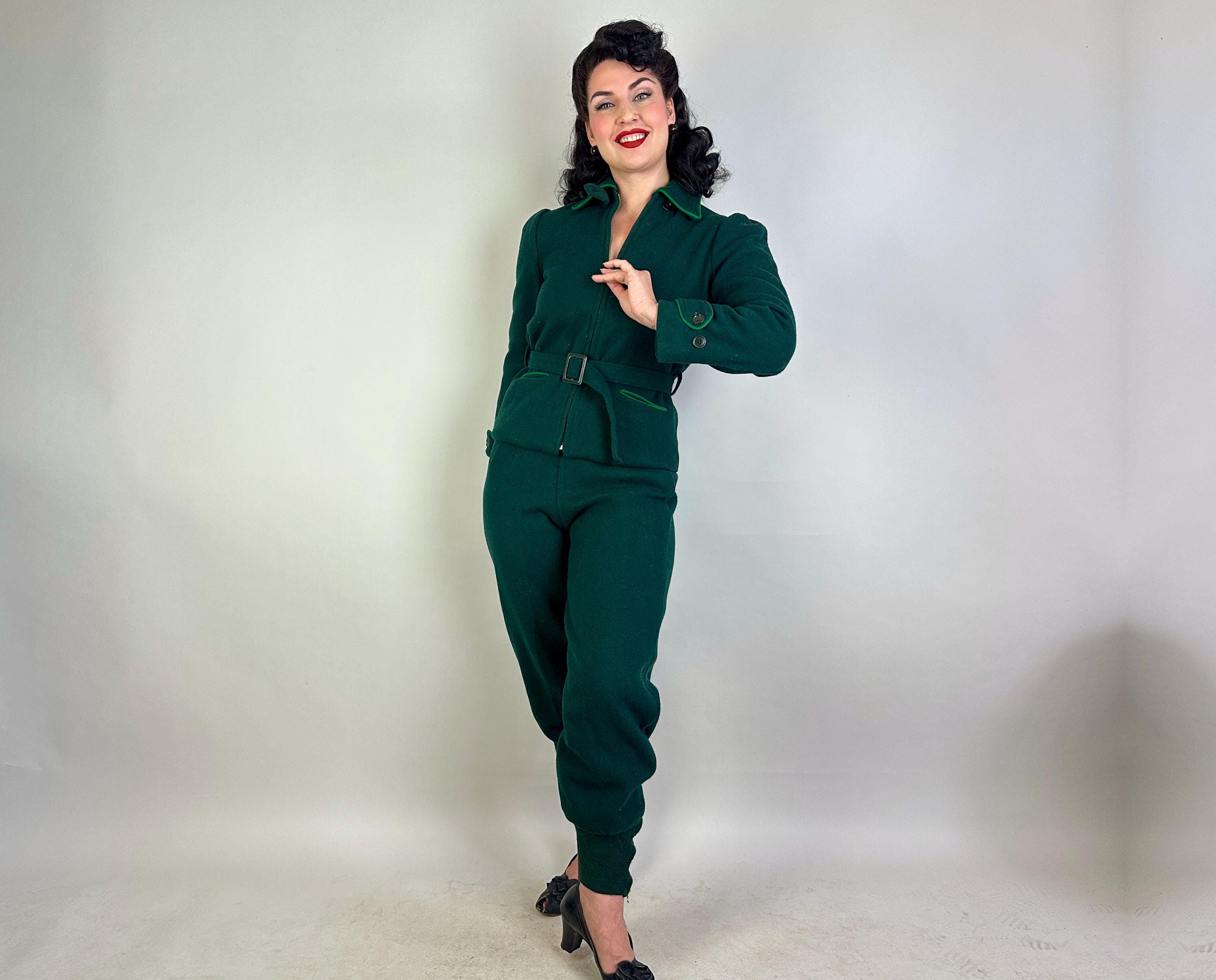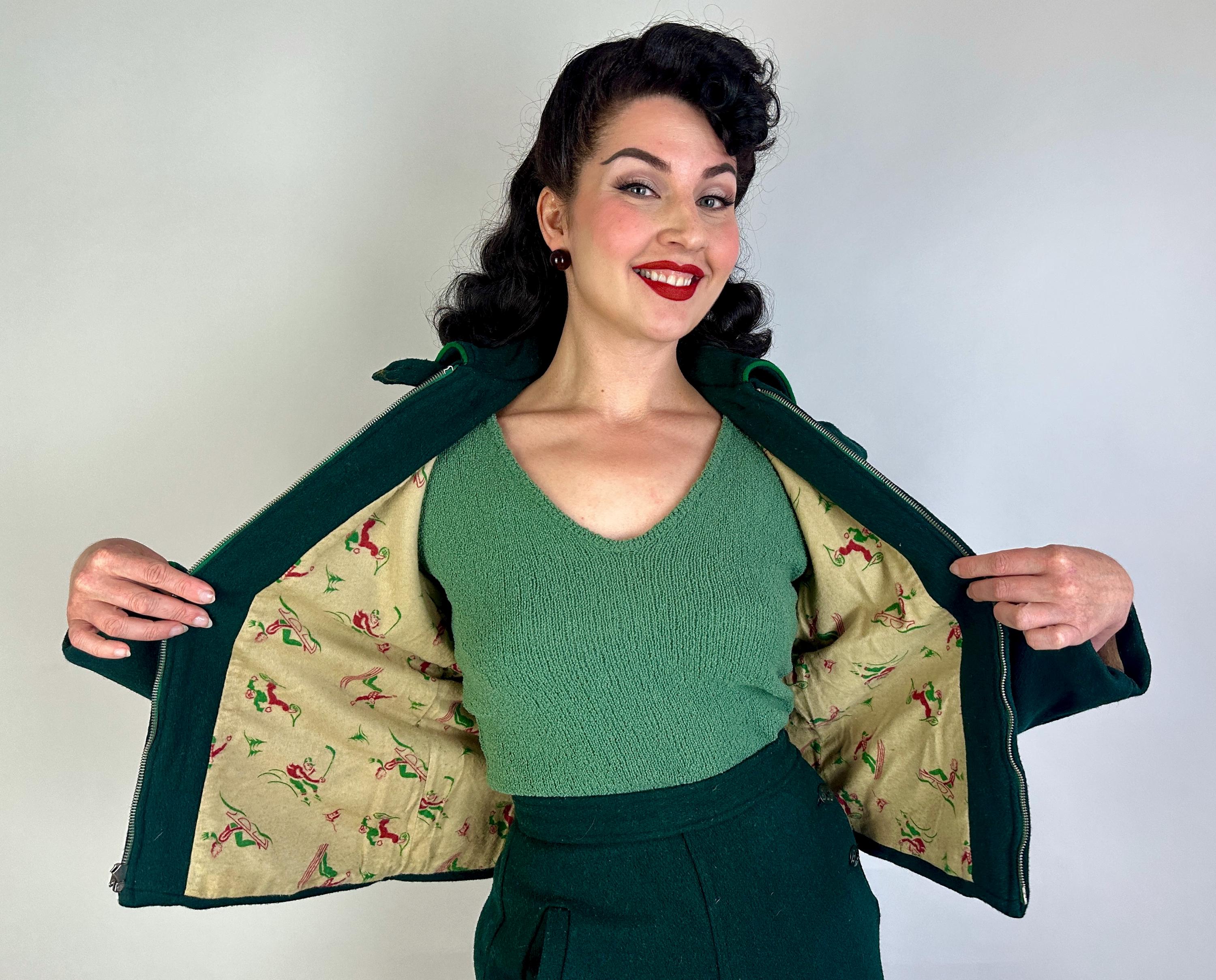 Zoom over the snow covered piney slopes with the utmost style in this 1930s ski set! This set is made of the warmest wool in pine green and well lined with cotton flannel. The jacket receives a pop of grass green piping along the collar, welted hand pockets, and cuff straps that button the wrists. The shoulders are lightly puffed with gathers, a matching belt cinches the waist, and the lining is printed with cartoons of winter activities for secret delight. Metal zipper bundles you up. The high waisted trousers have deco buttons fastening on the left hip while a welted hand pocket occupies the right and knitted wide cuffs taper the roomy legs while bell pull metal "Talon" zipper add both a decorative and functional element. Labeled " R.H. Macy & Co.". This set is in great vintage condition, with no holes, stains, or odors to note.
