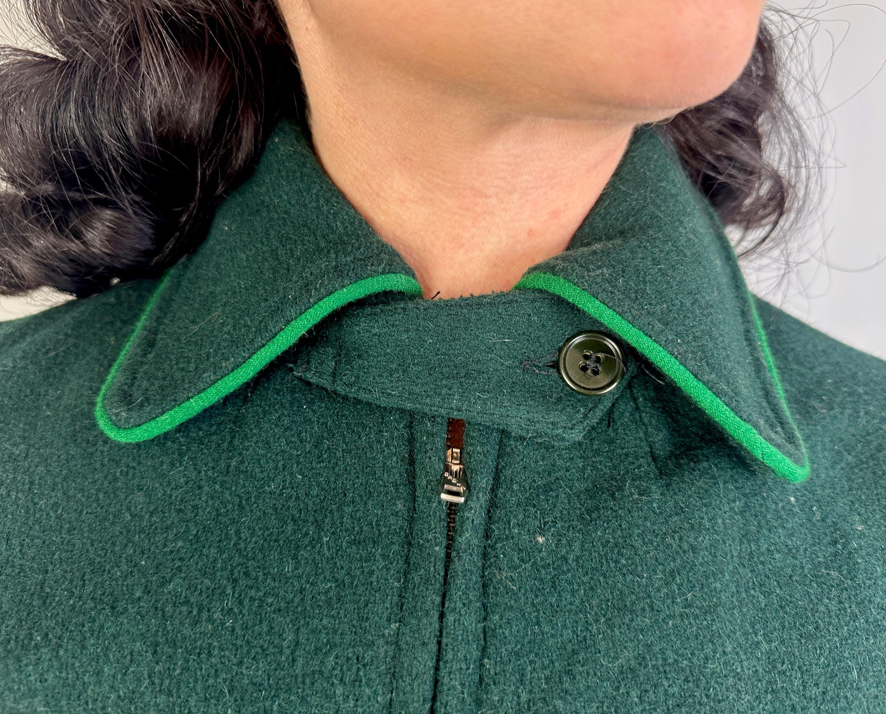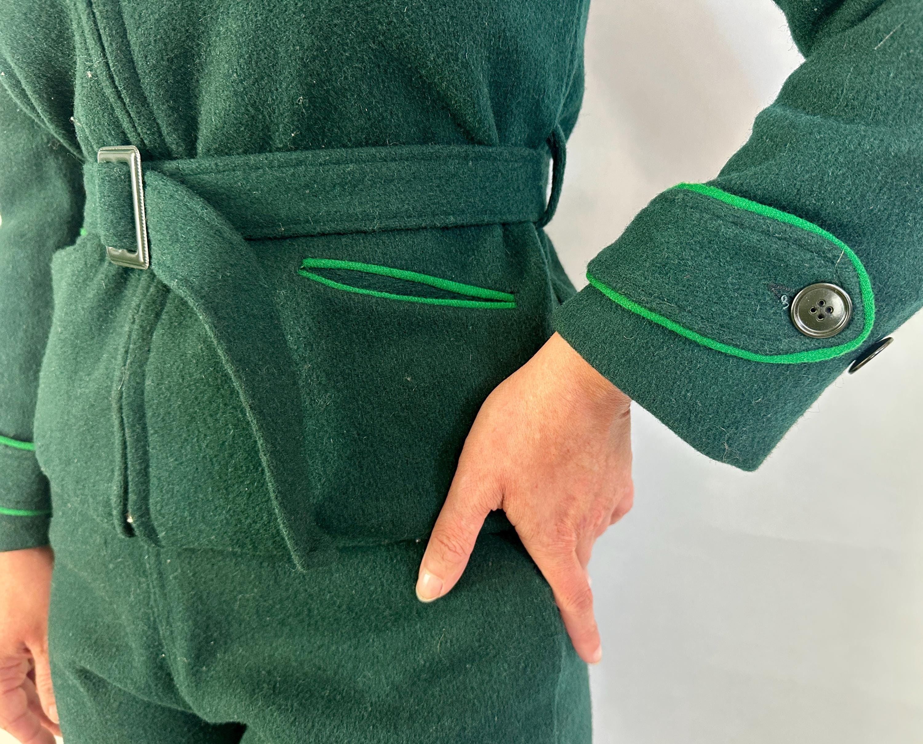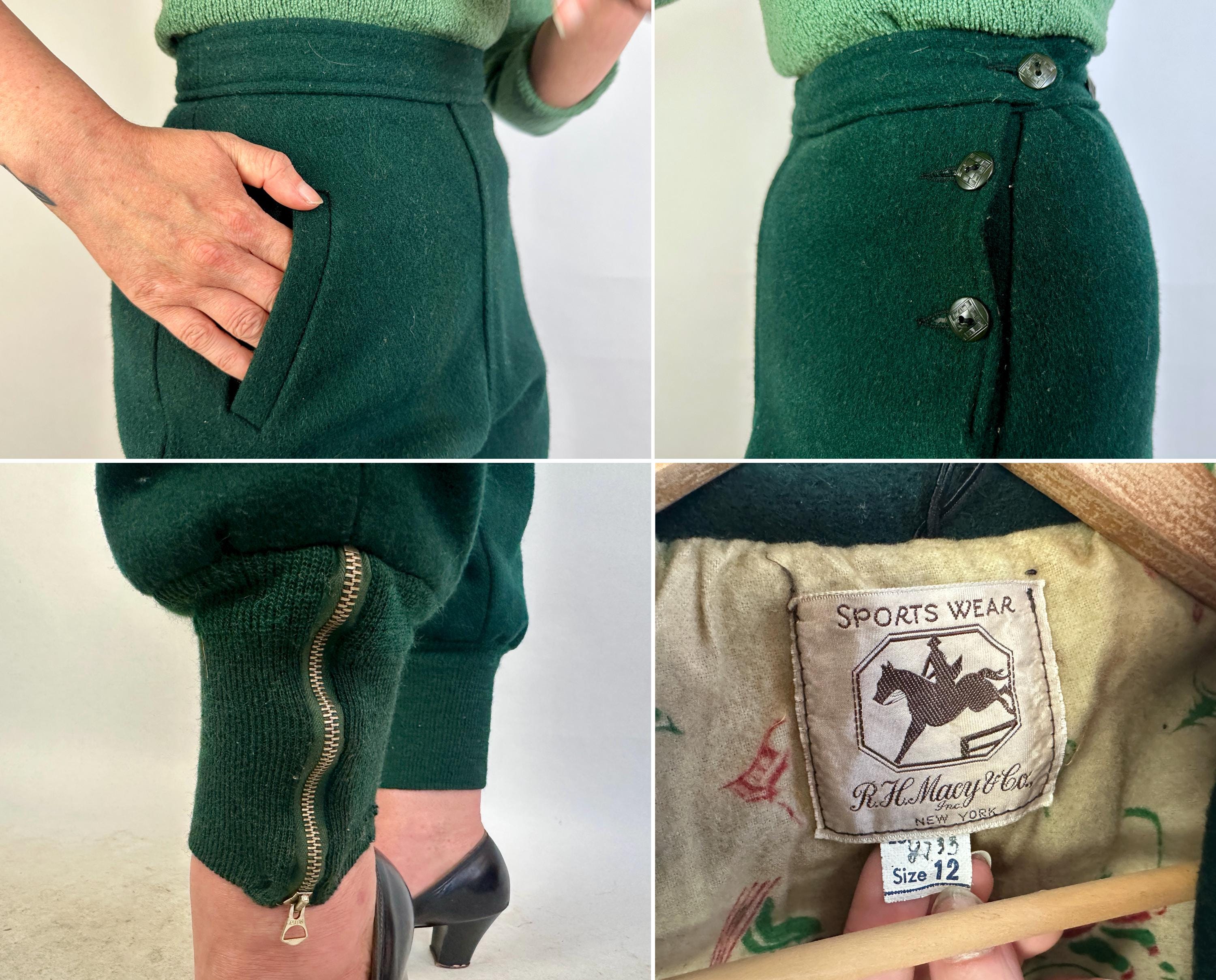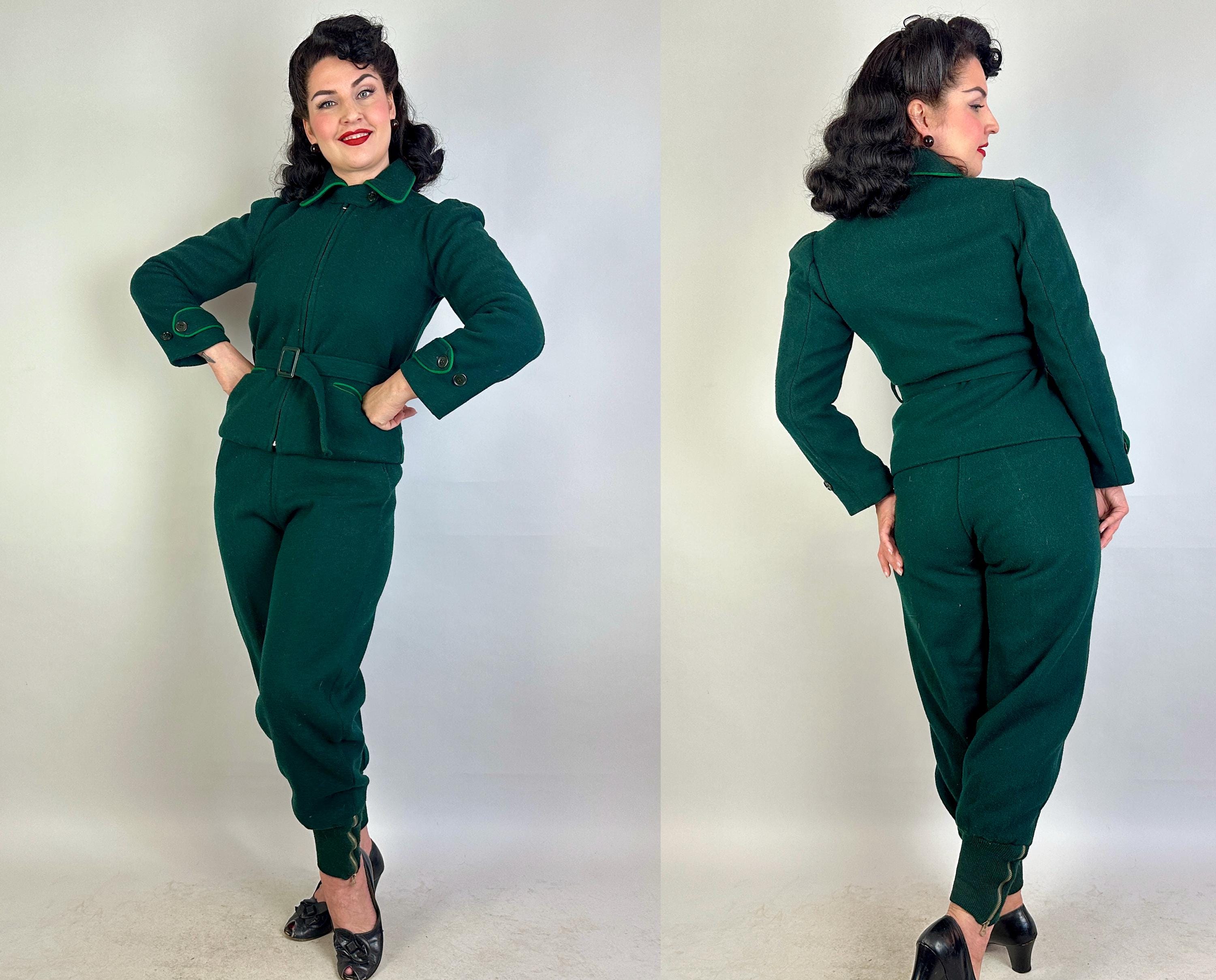 Zoom over the snow covered piney slopes with the utmost style in this 1930s ski set! This set is made of the warmest wool in pine green and well lined with cotton flannel. The jacket receives a pop of grass green piping along the collar, welted hand pockets, and cuff straps that button the wrists. The shoulders are lightly puffed with gathers, a matching belt cinches the waist, and the lining is printed with cartoons of winter activities for secret delight. Metal zipper bundles you up. The high waisted trousers have deco buttons fastening on the left hip while a welted hand pocket occupies the right and knitted wide cuffs taper the roomy legs while bell pull metal "Talon" zipper add both a decorative and functional element. Labeled " R.H. Macy & Co.". This set is in great vintage condition, with no holes, stains, or odors to note.