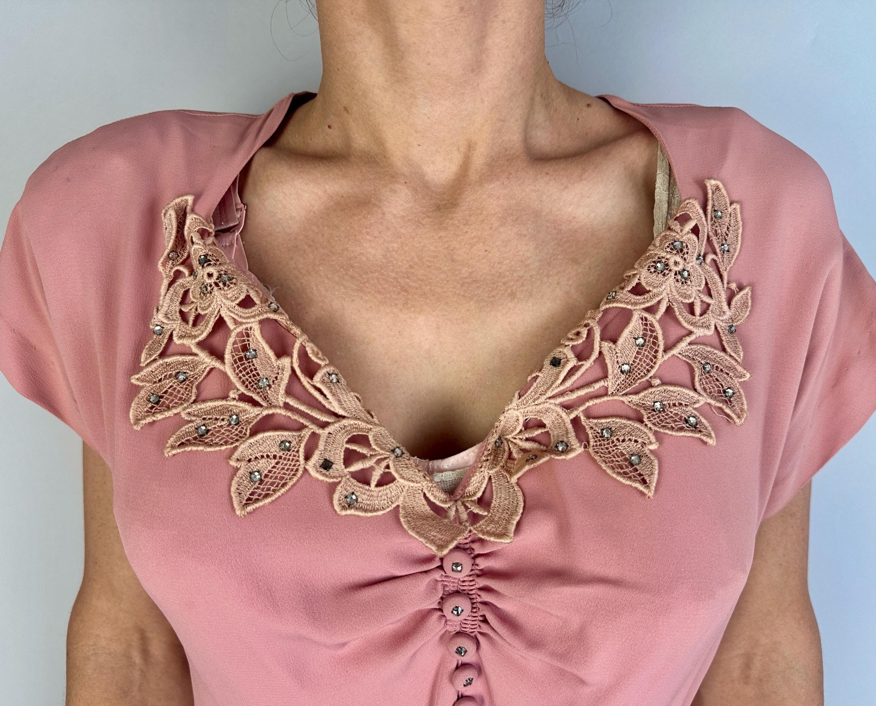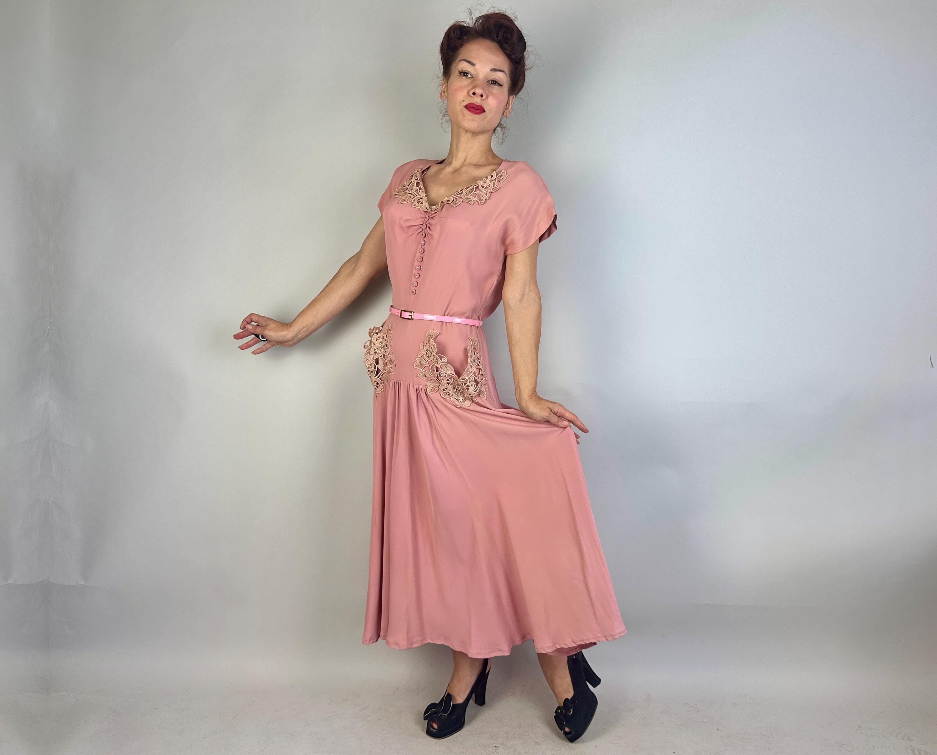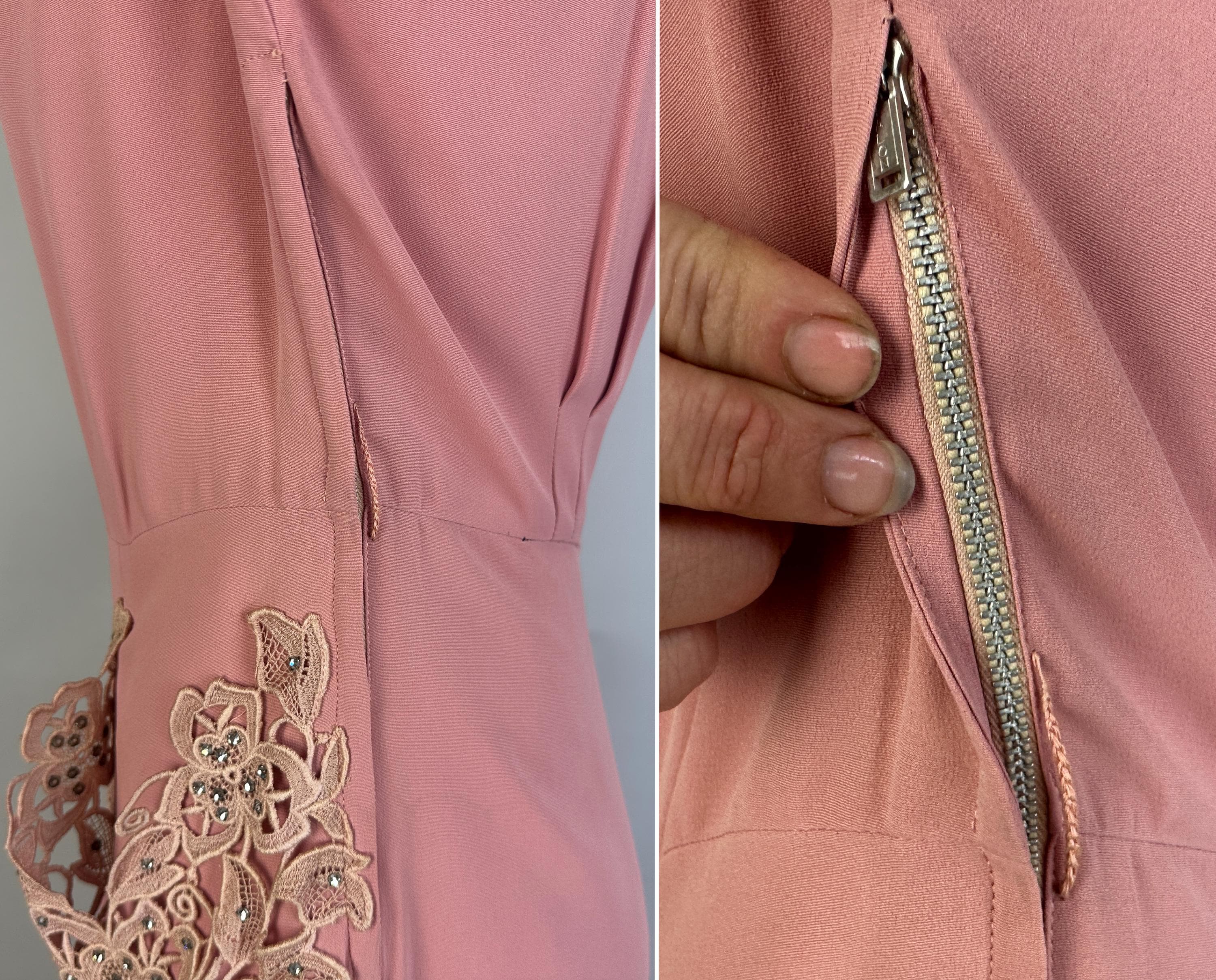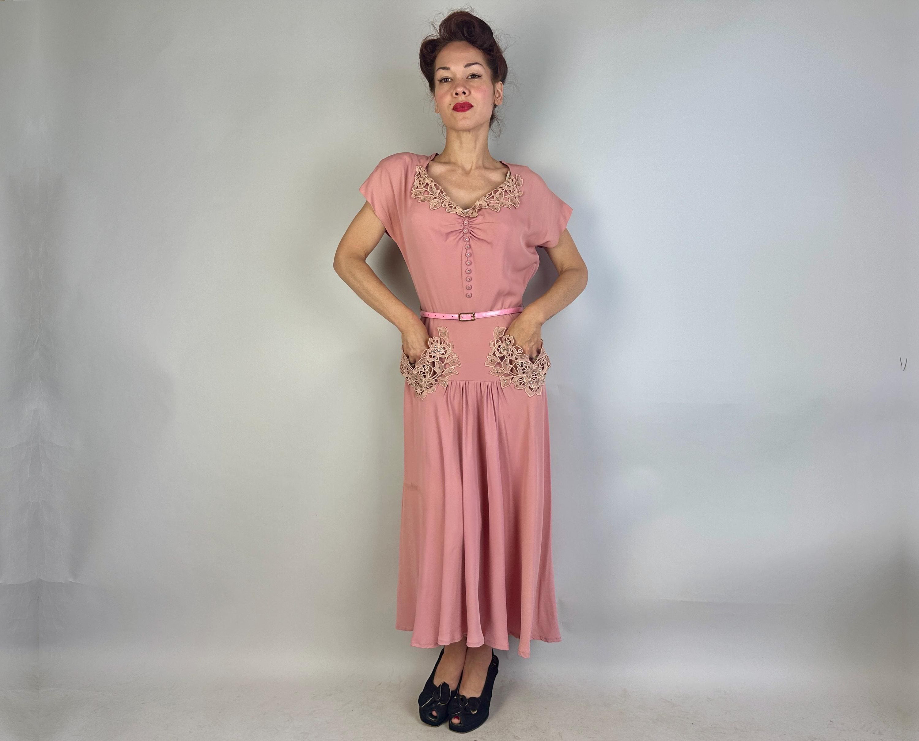 What will be in apple blossom time? Why it's you looking absolutely beguiling in this 1940s dress! Stunningly sweet spring blossom pink rayon crepe features accents of dusty rose floral lace that is studded with rhinestones creating V-shaped pockets on the front hips and as lapels on the sweetheart neckline. The bust is shaped with ruching and topped with decorative rhinestone buttons continuing down the bodice while padded shoulders and cap sleeves make a lovely shape along with a waist fitted with pleated darts on the back and a panel of gathering connecting the lace pockets. The skirt is wonderfully full and a metal "Talon" zipper fastens on the side. This dress is in great vintage condition, with no holes, stains, or odors to note. Please note, belt is model's own.