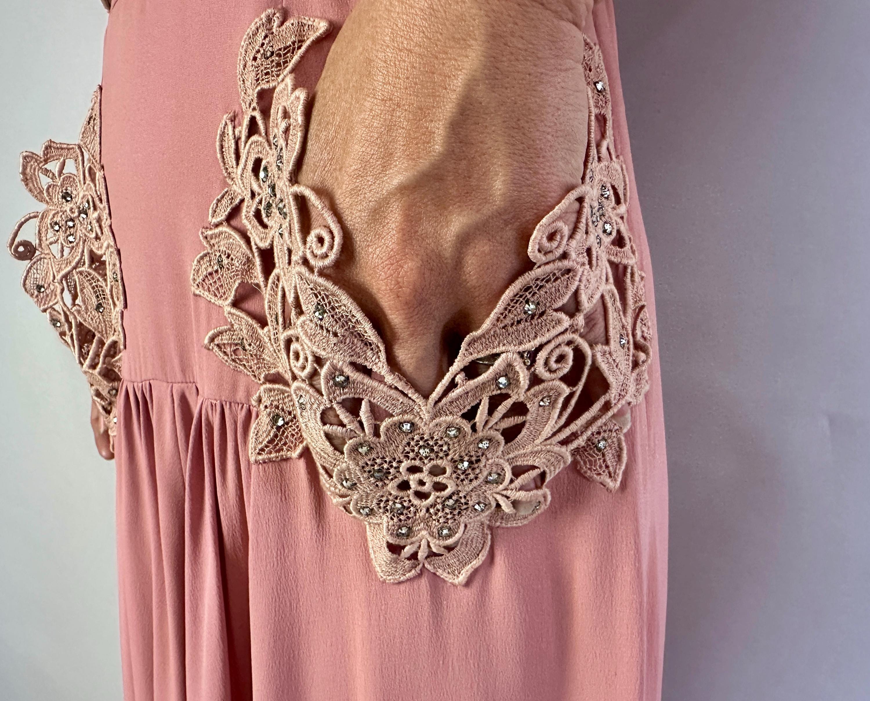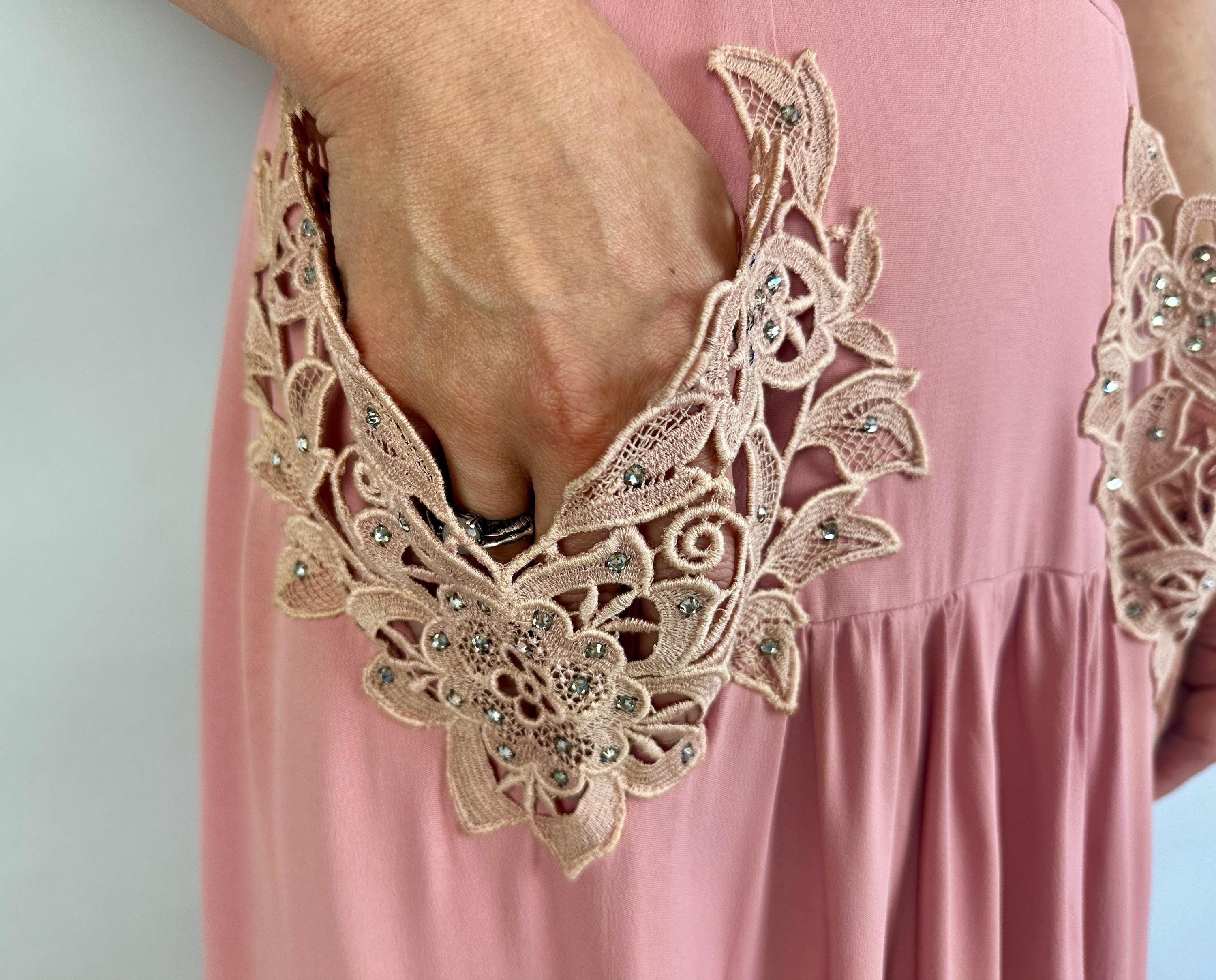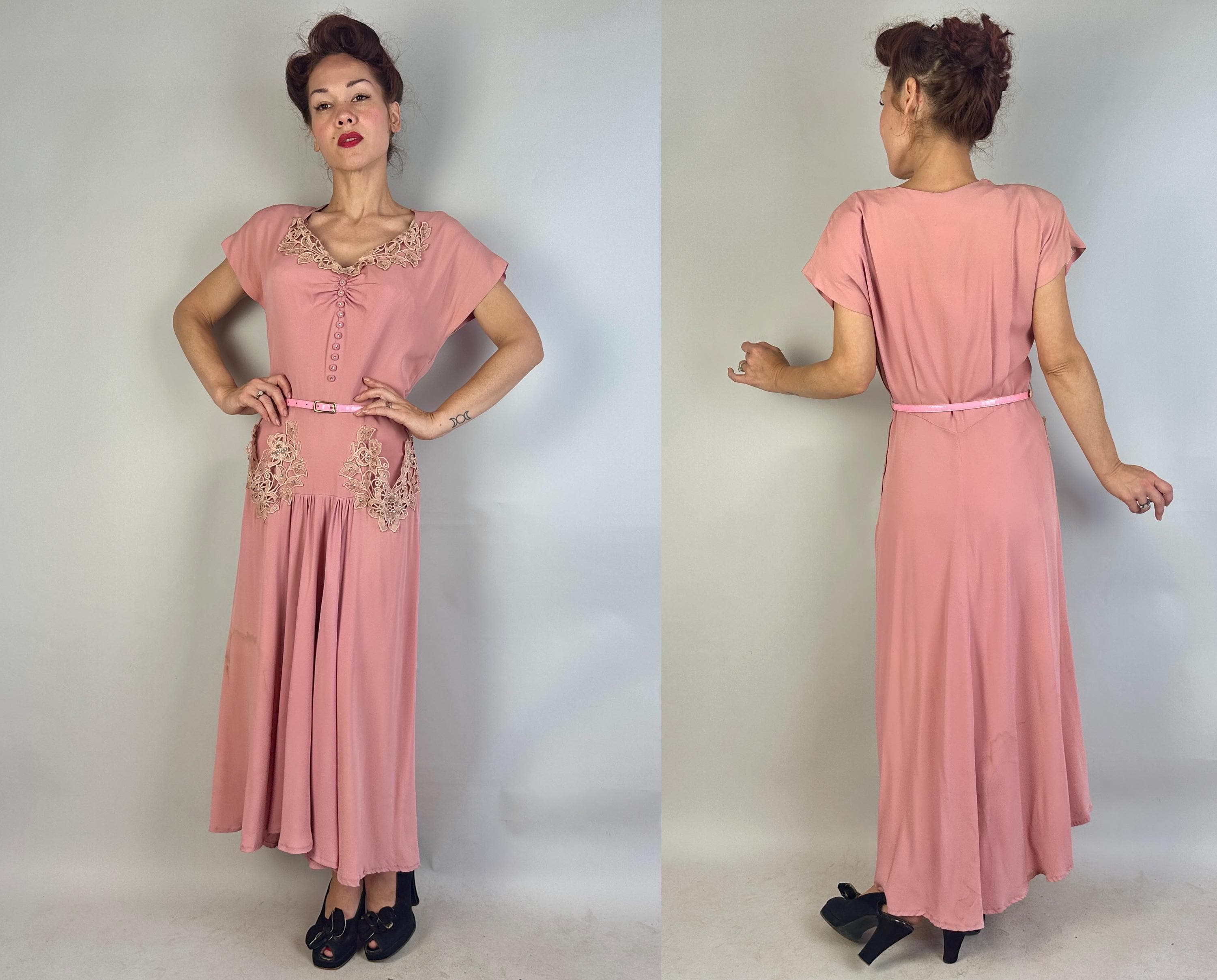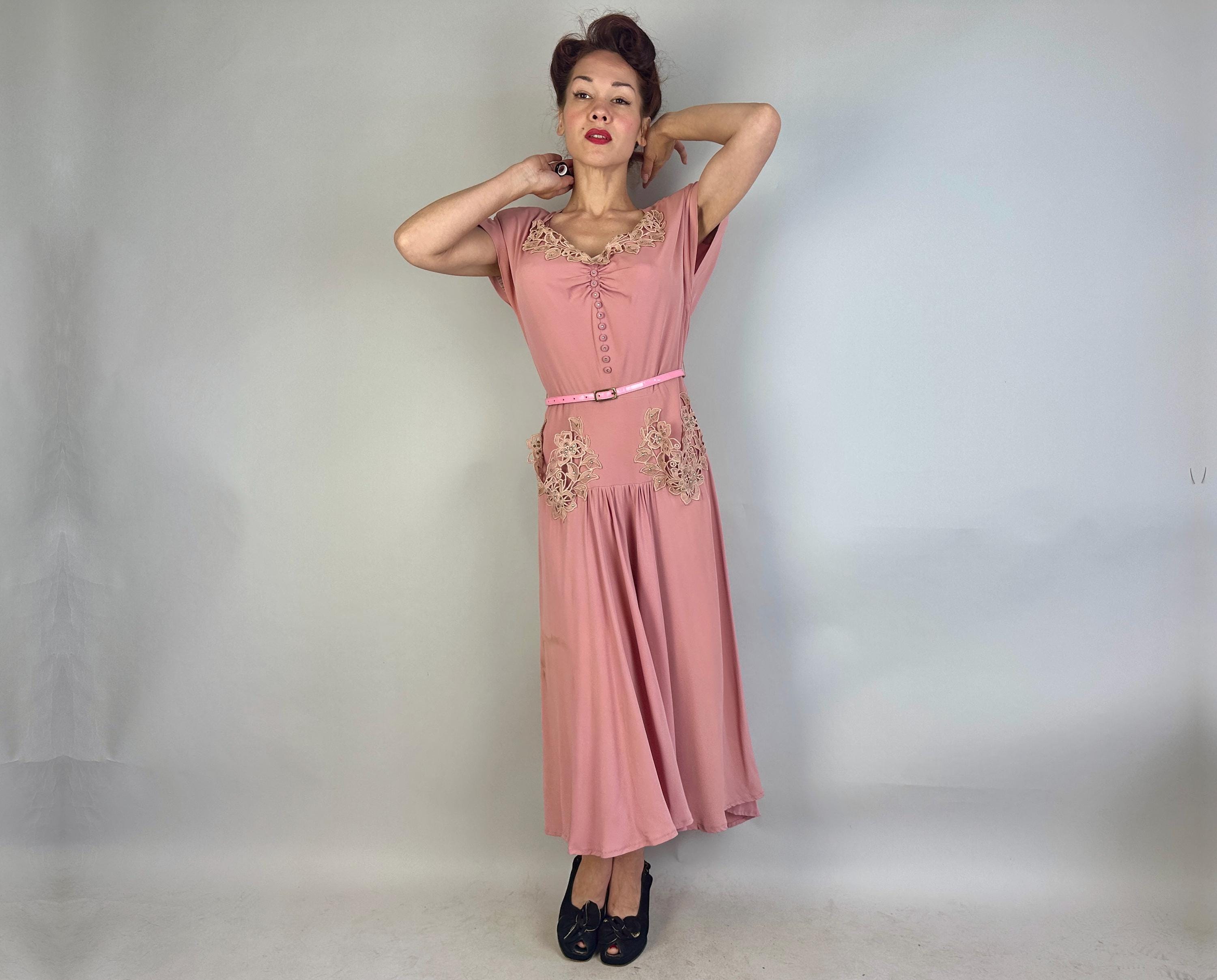 What will be in apple blossom time? Why it's you looking absolutely beguiling in this 1940s dress! Stunningly sweet spring blossom pink rayon crepe features accents of dusty rose floral lace that is studded with rhinestones creating V-shaped pockets on the front hips and as lapels on the sweetheart neckline. The bust is shaped with ruching and topped with decorative rhinestone buttons continuing down the bodice while padded shoulders and cap sleeves make a lovely shape along with a waist fitted with pleated darts on the back and a panel of gathering connecting the lace pockets. The skirt is wonderfully full and a metal "Talon" zipper fastens on the side. This dress is in great vintage condition, with no holes, stains, or odors to note. Please note, belt is model's own.