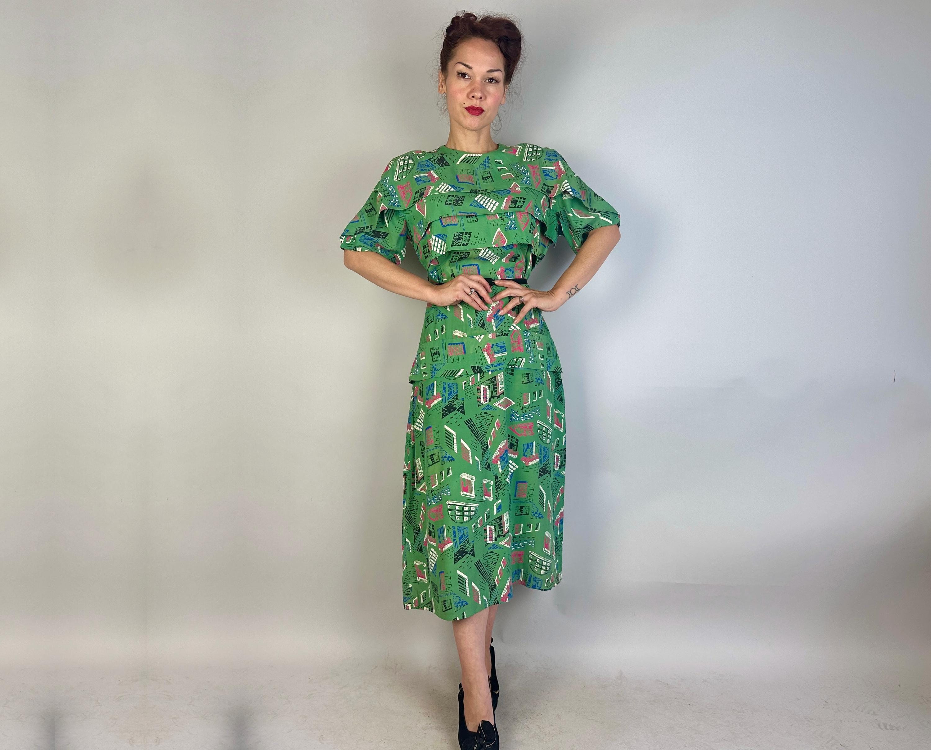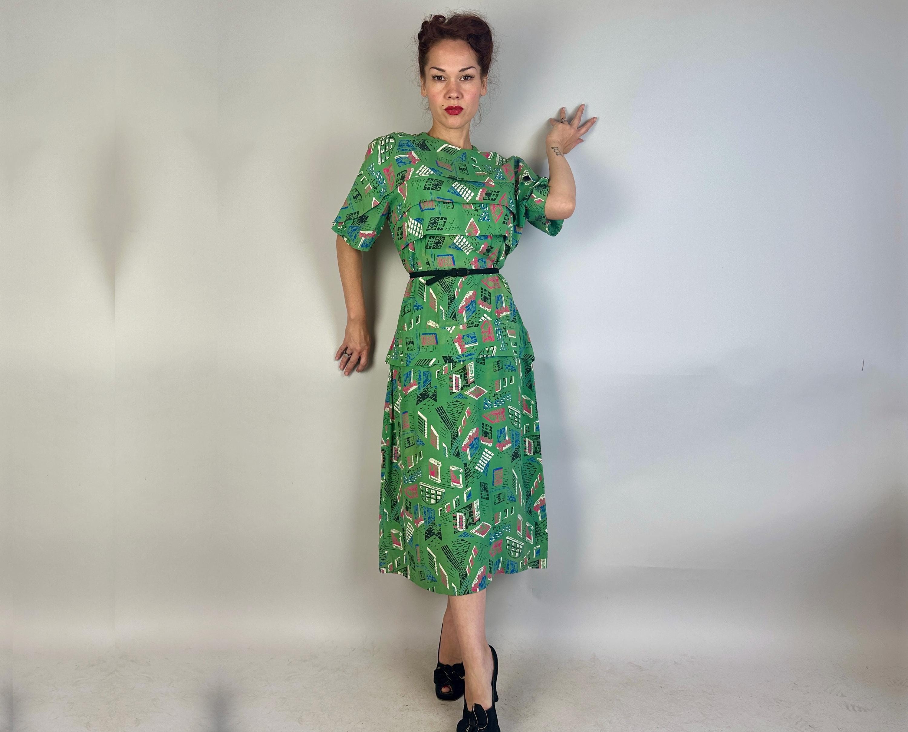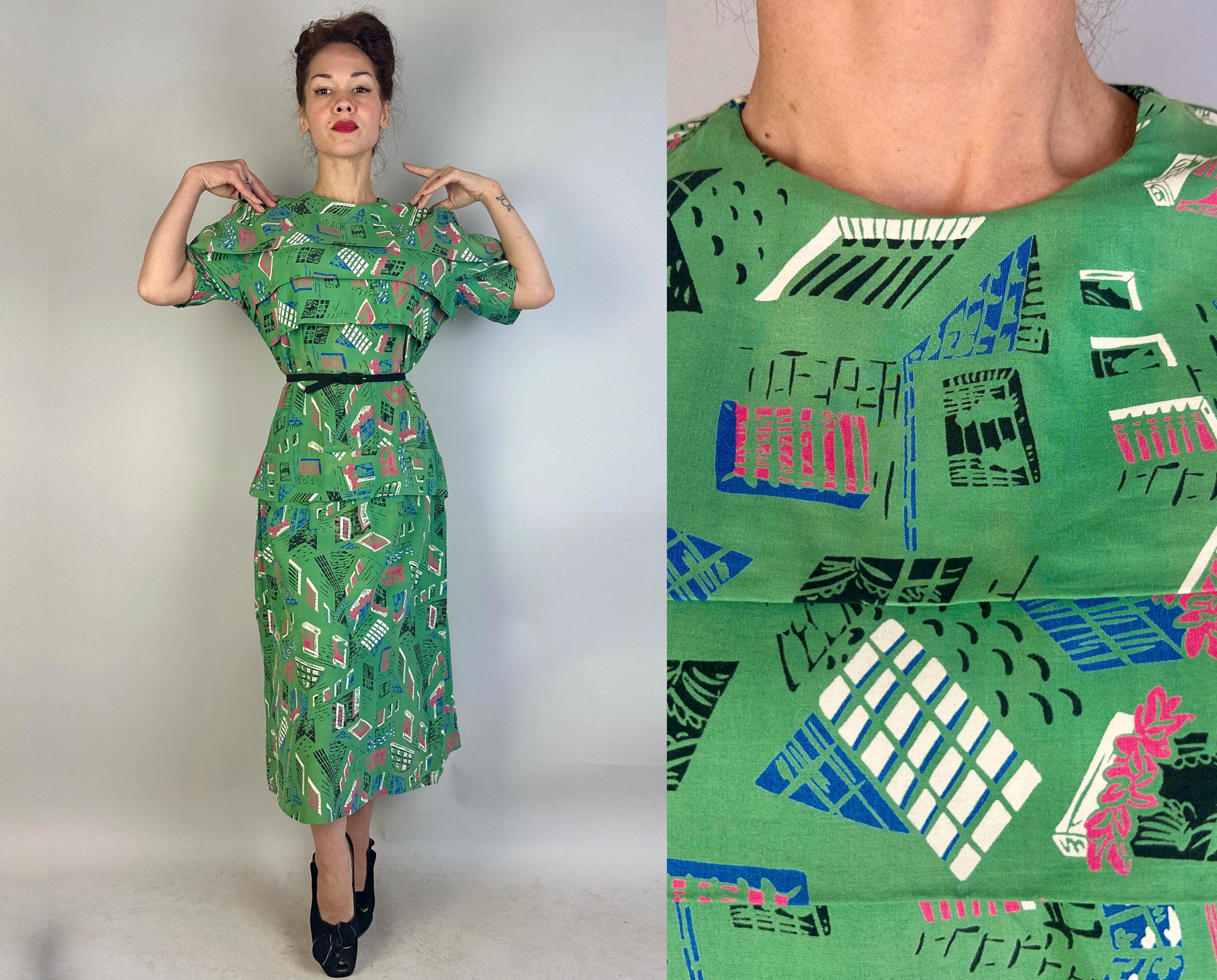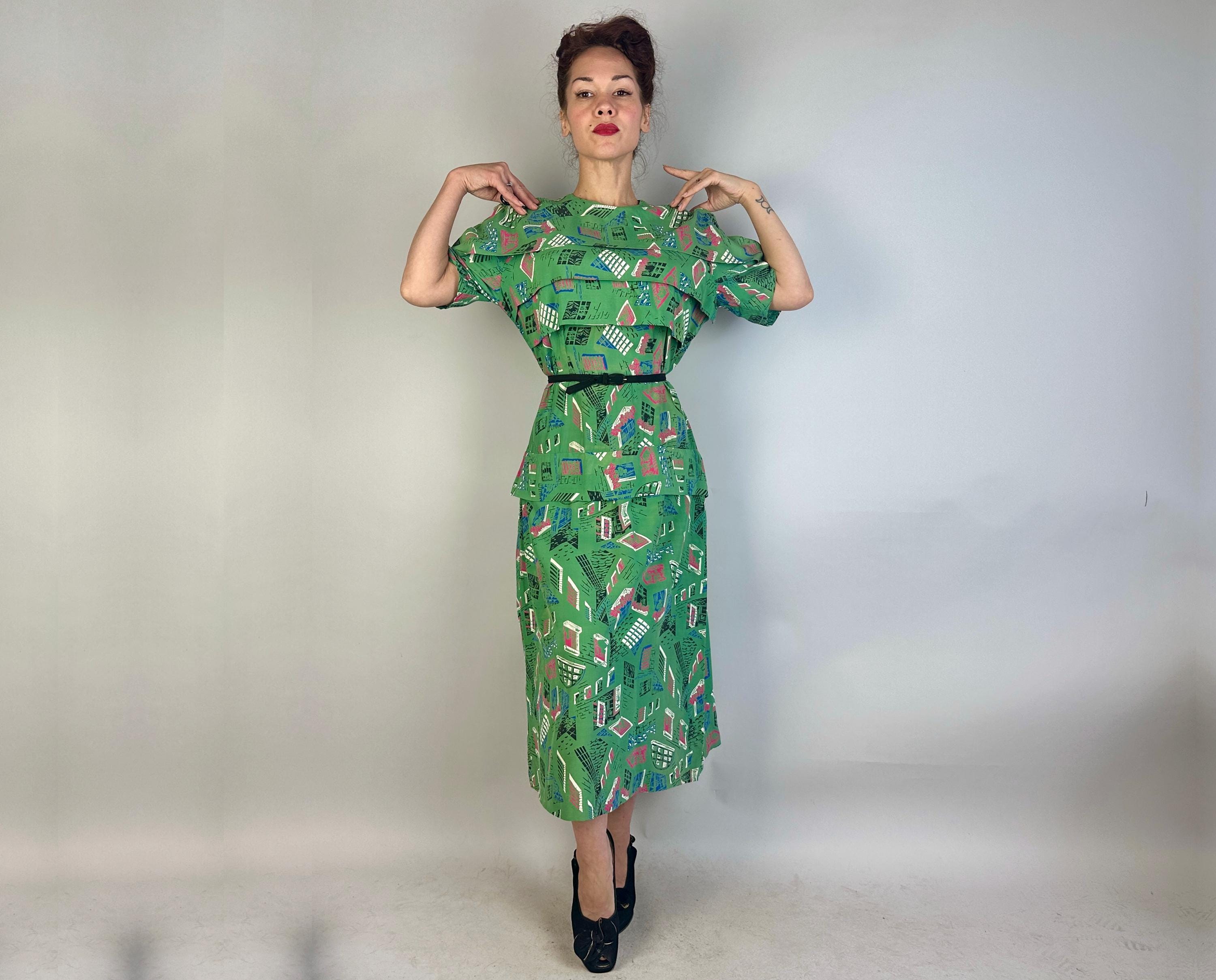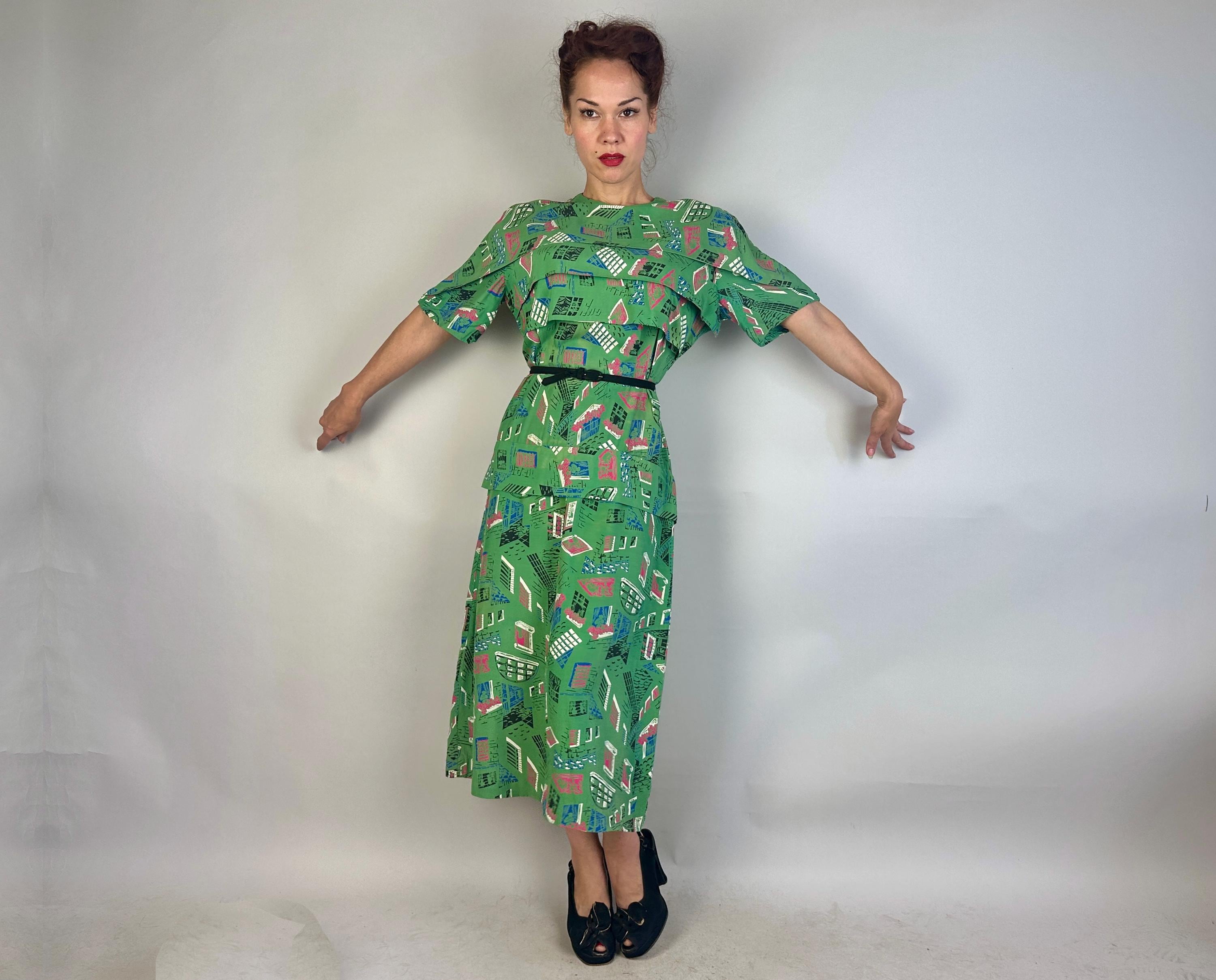 Stop the nosey Nellie's from wondering and give them a full view in this 1940s window novelty print dress! Made of a rayon cotton in a slubbed yet very fine weave, the foreground of turtle green is topped with a print of varying window views in hot pink, admiral blue, white, and black. The styling of the dress lives up to it's interesting print with a unique use of wide horizontal pleats crossing the bust and hips along with a capelet like yoke adding to the tiered look. The hip pleat makes a flattering notched V on the back and pleated darts around the waist make a lovely fit. Metal zipper up the back. This dress is in great vintage condition, with a bit of very minor fade but no holes, stains, or odors to note. Please note, belt is model's own.