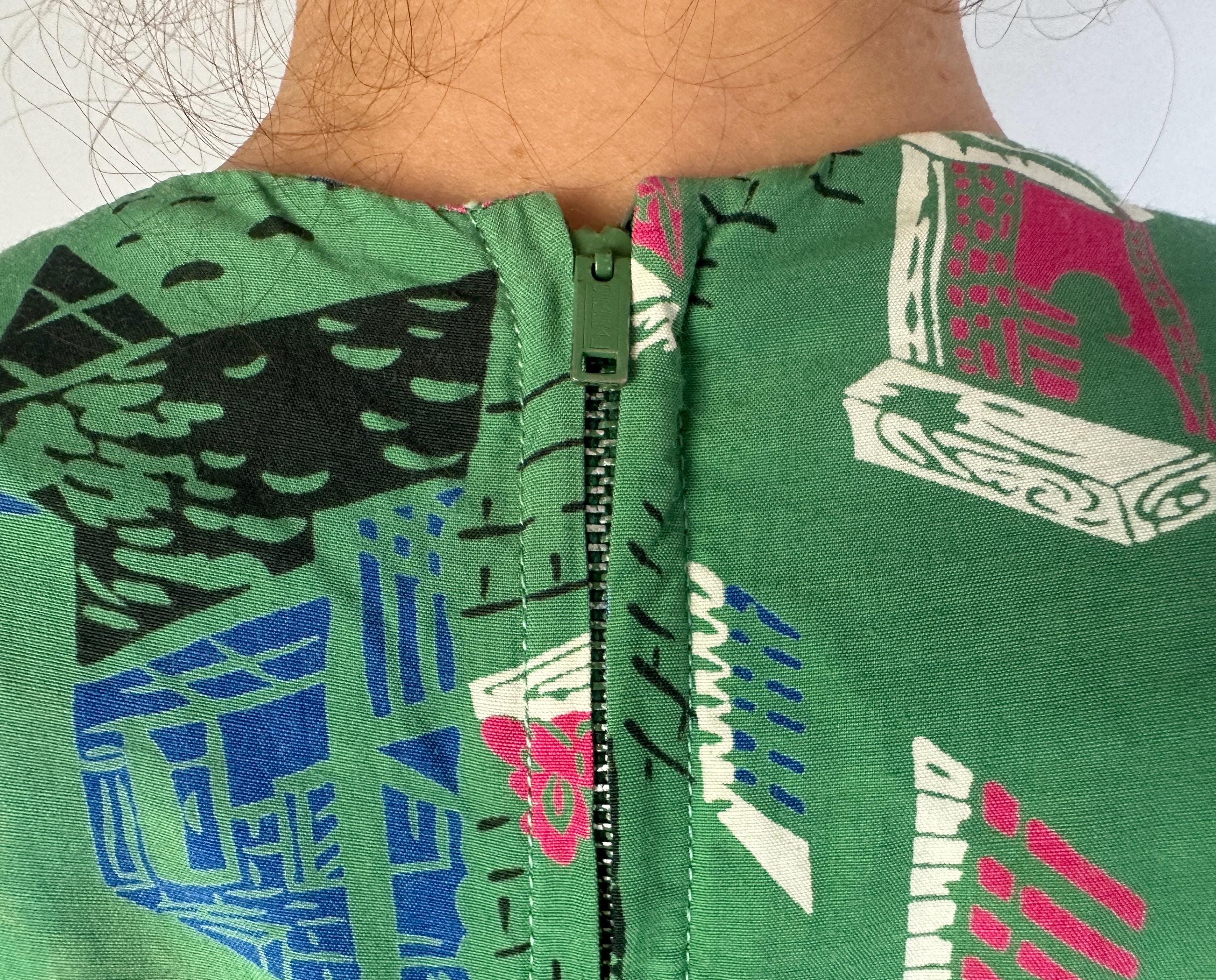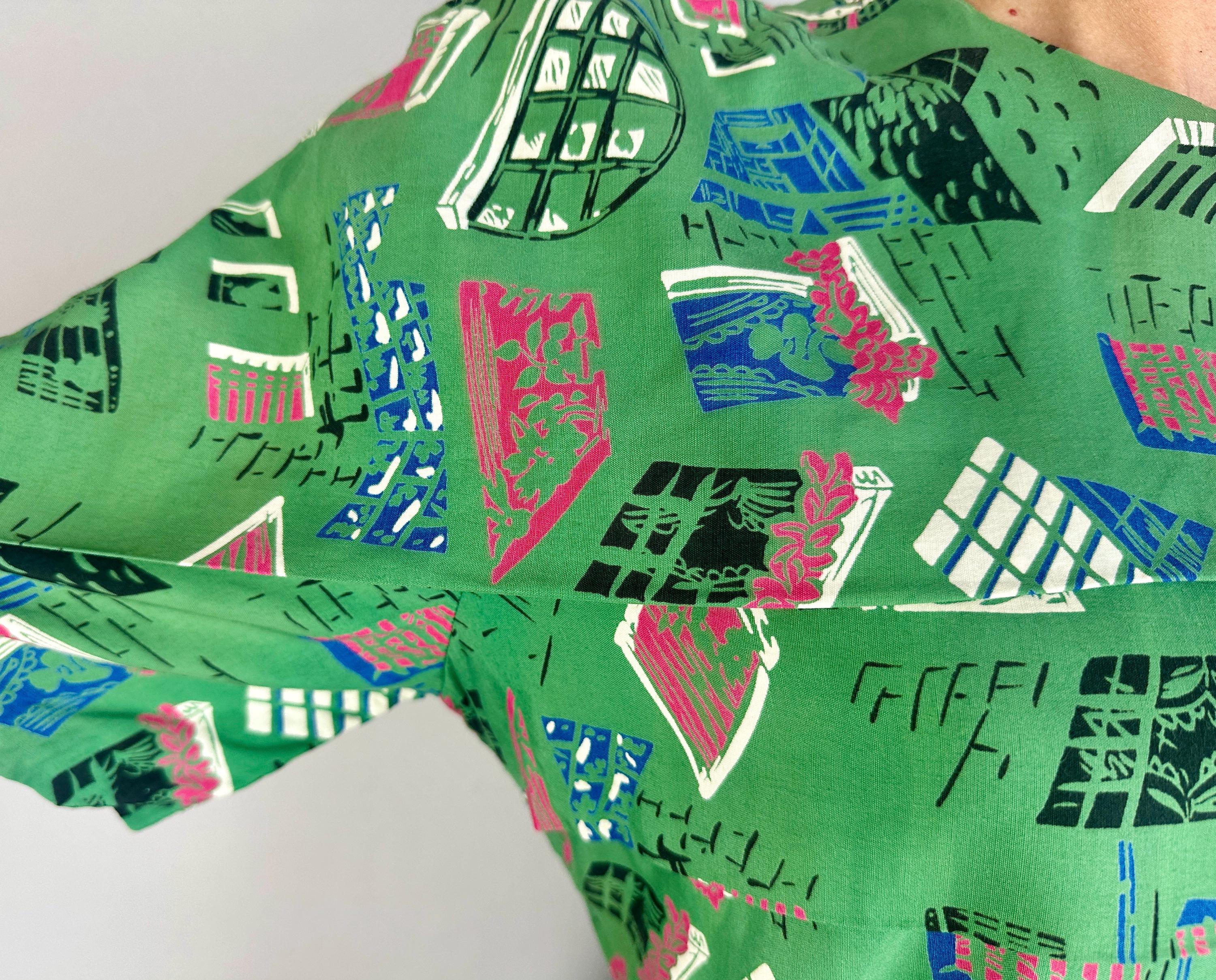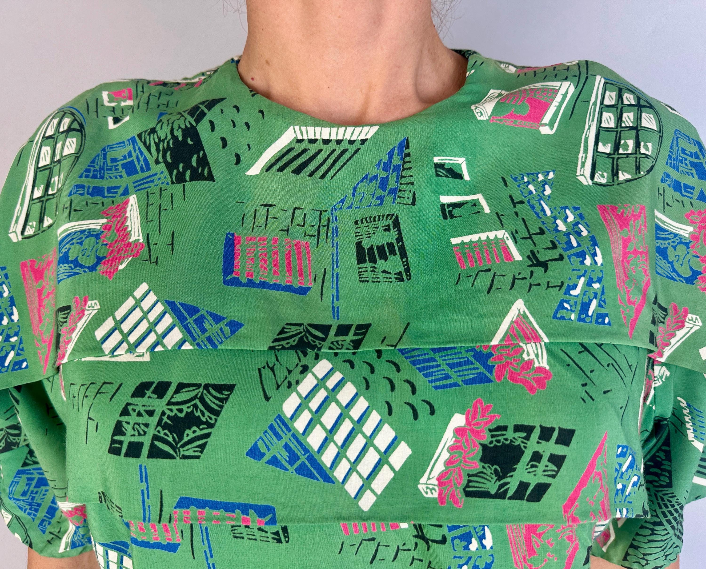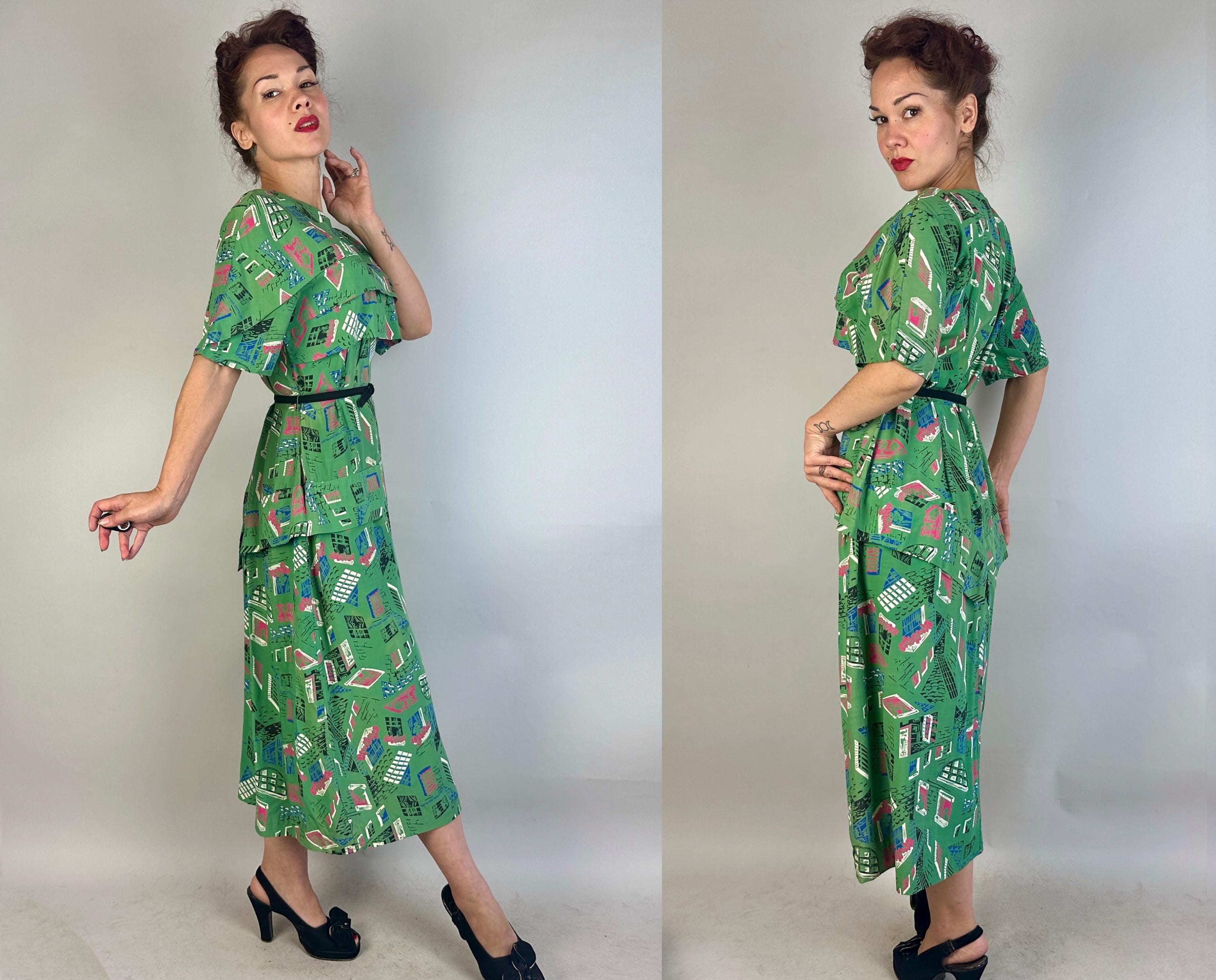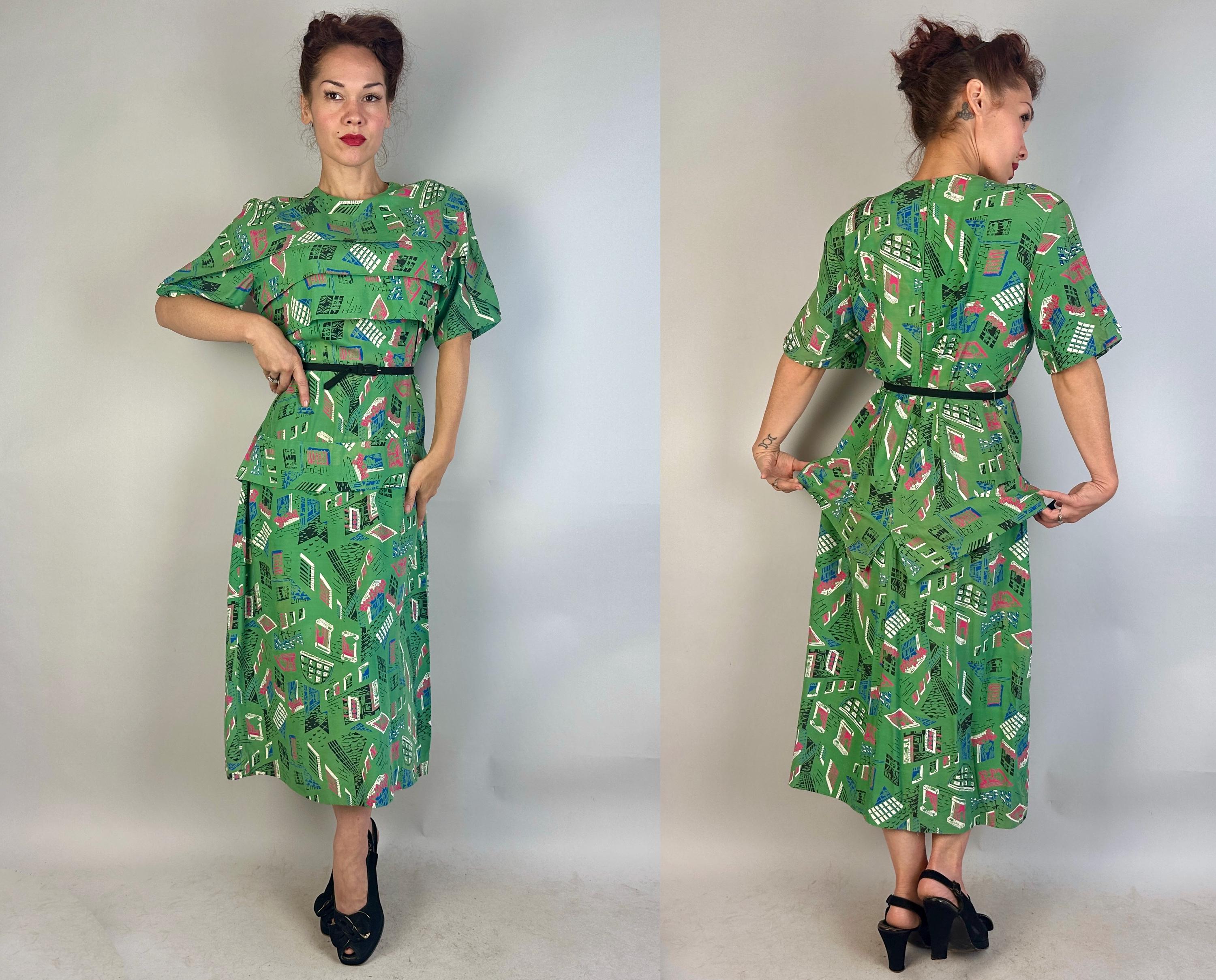 Stop the nosey Nellie's from wondering and give them a full view in this 1940s window novelty print dress! Made of a rayon cotton in a slubbed yet very fine weave, the foreground of turtle green is topped with a print of varying window views in hot pink, admiral blue, white, and black. The styling of the dress lives up to it's interesting print with a unique use of wide horizontal pleats crossing the bust and hips along with a capelet like yoke adding to the tiered look. The hip pleat makes a flattering notched V on the back and pleated darts around the waist make a lovely fit. Metal zipper up the back. This dress is in great vintage condition, with a bit of very minor fade but no holes, stains, or odors to note. Please note, belt is model's own.
