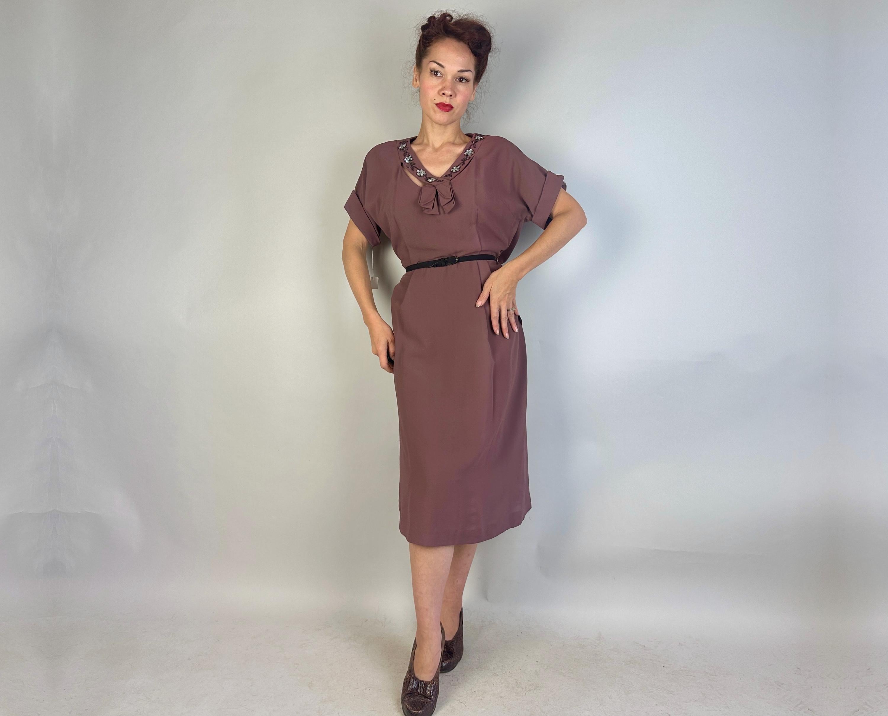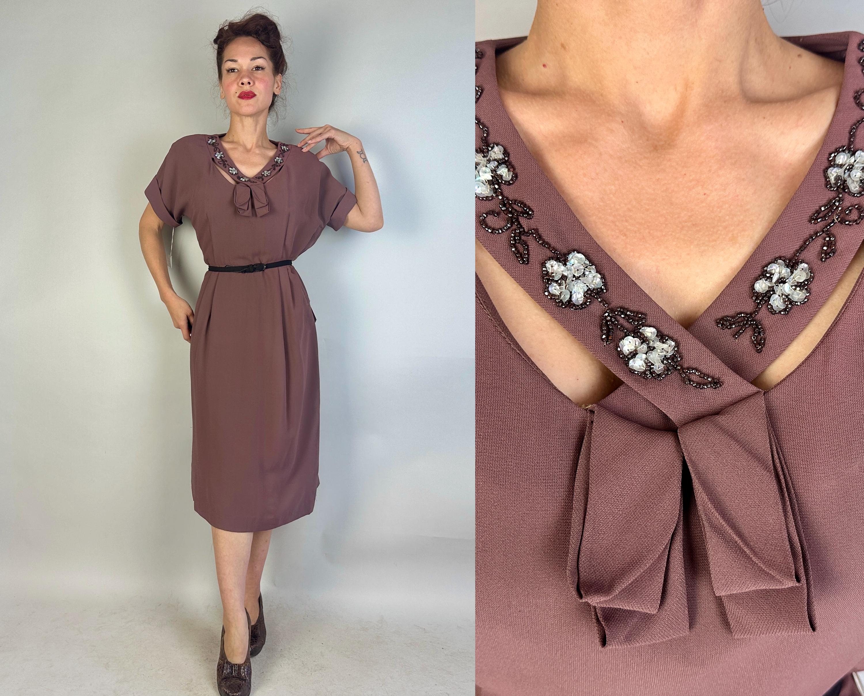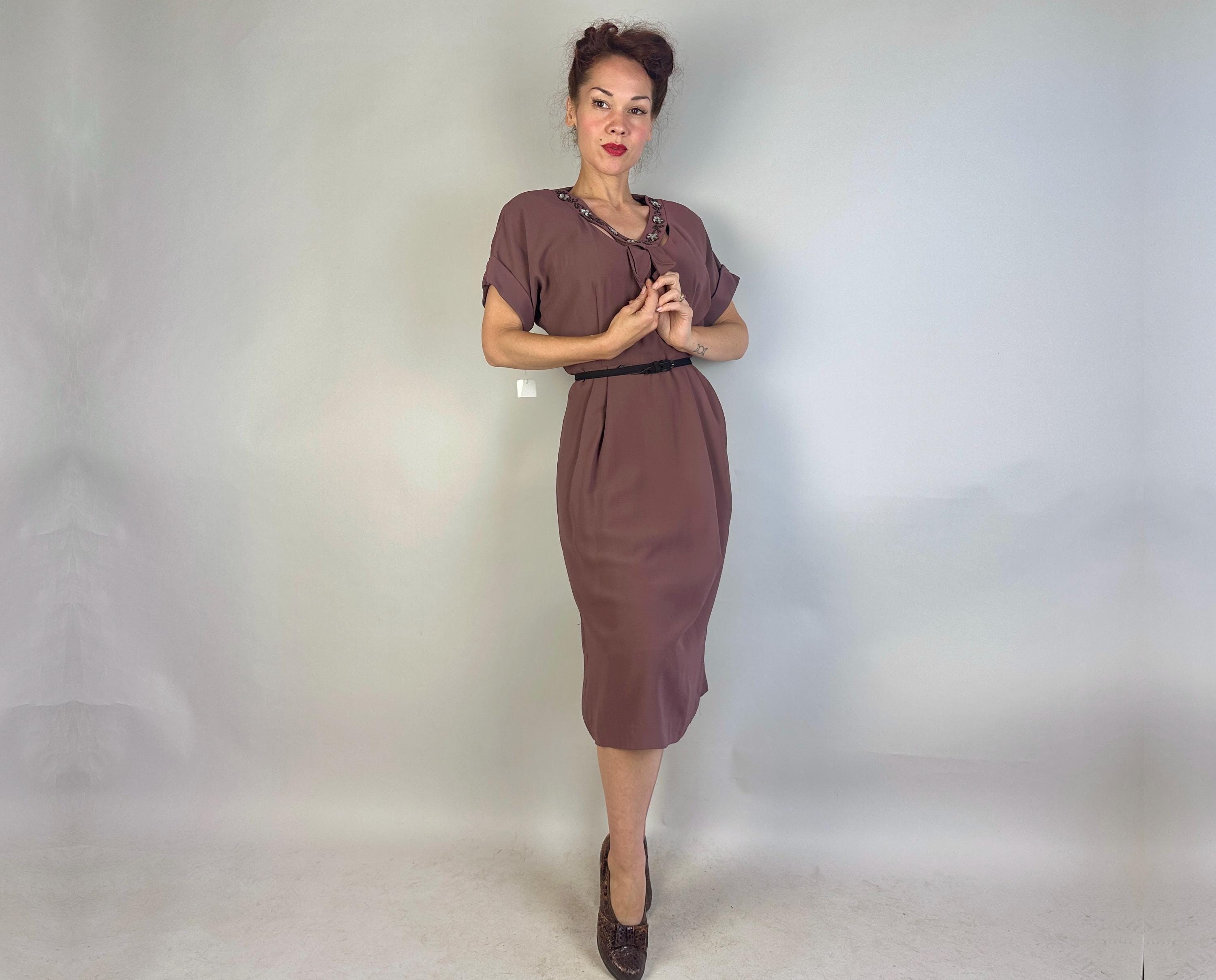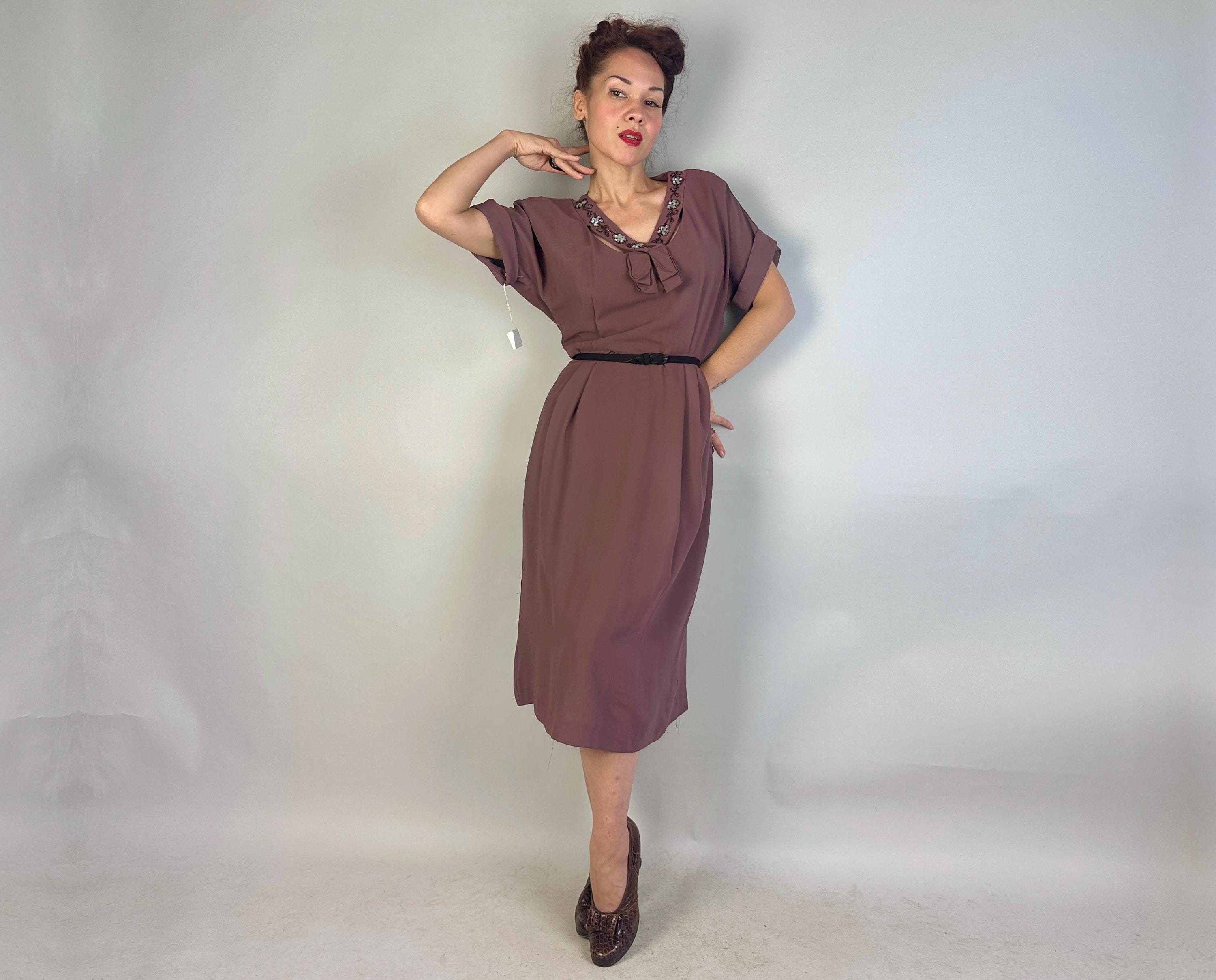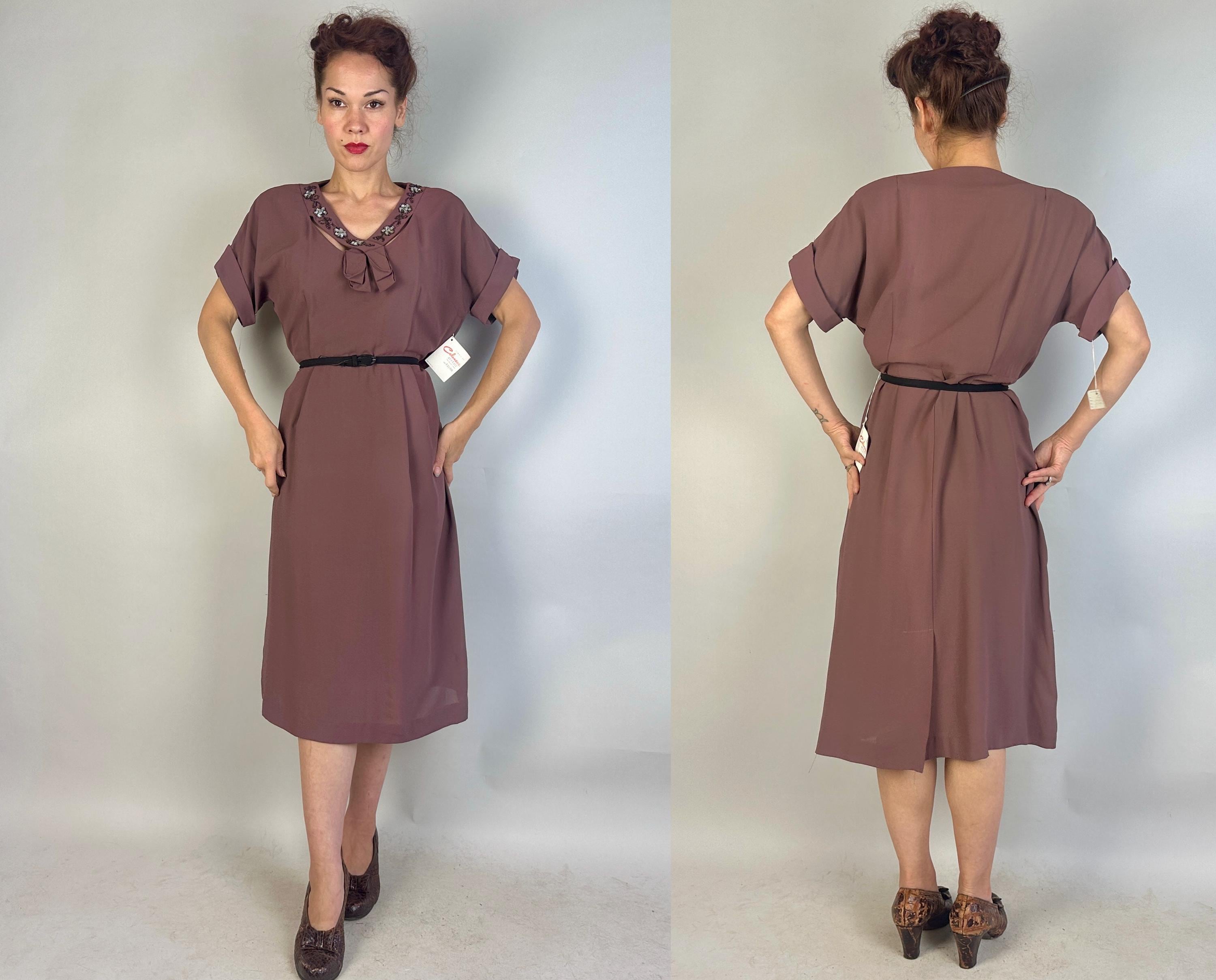 A classic lady like you was meant for this 1940s deadstock dress from "Classic Lady by Constantine"! With original tags attached, you can get extra enjoyment from the dark mauve Celanese and rayon fabric and read all about this "Beauty Fiber". The dress features a lovely neckline with a floral design of garnet seed beads and icy blue sequins and pee-a-boo cutouts from straps making a faux kerchief. Fashioned with padded shoulders, cuffed short dolman sleeves, and pleated bust and hip shaping. Metal zipper on the side. This dress is in great vintage condition, with no holes, stains, or odors to note.