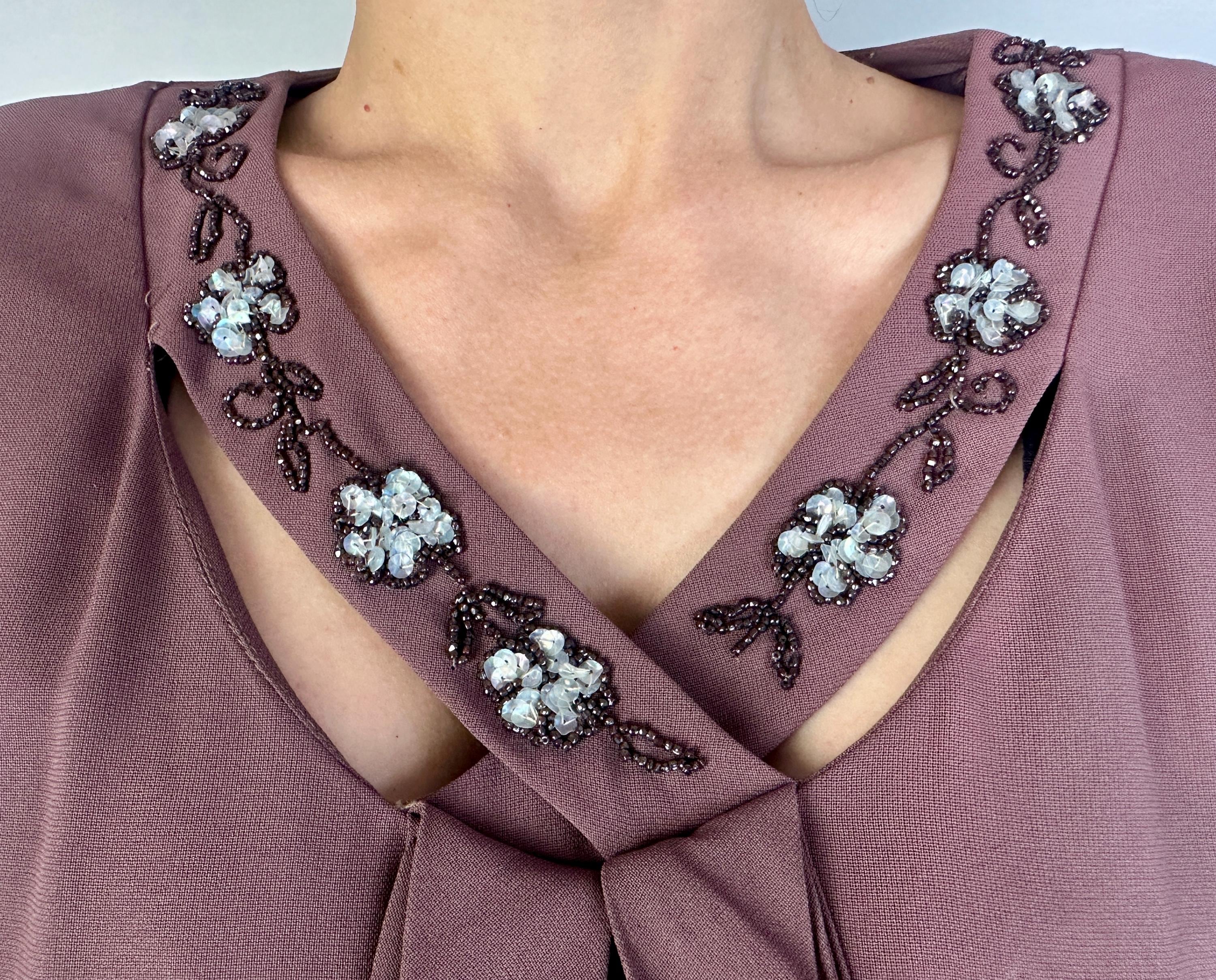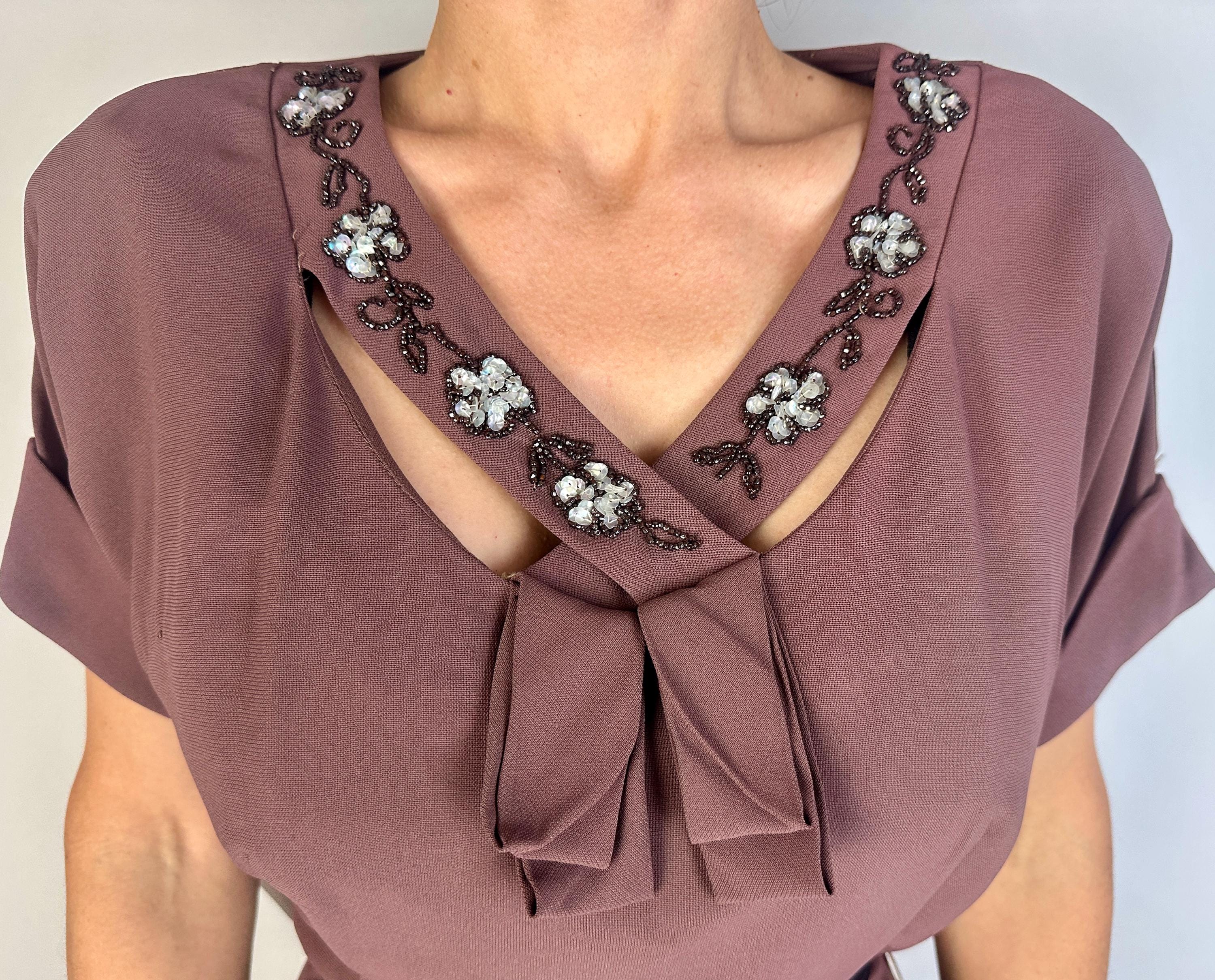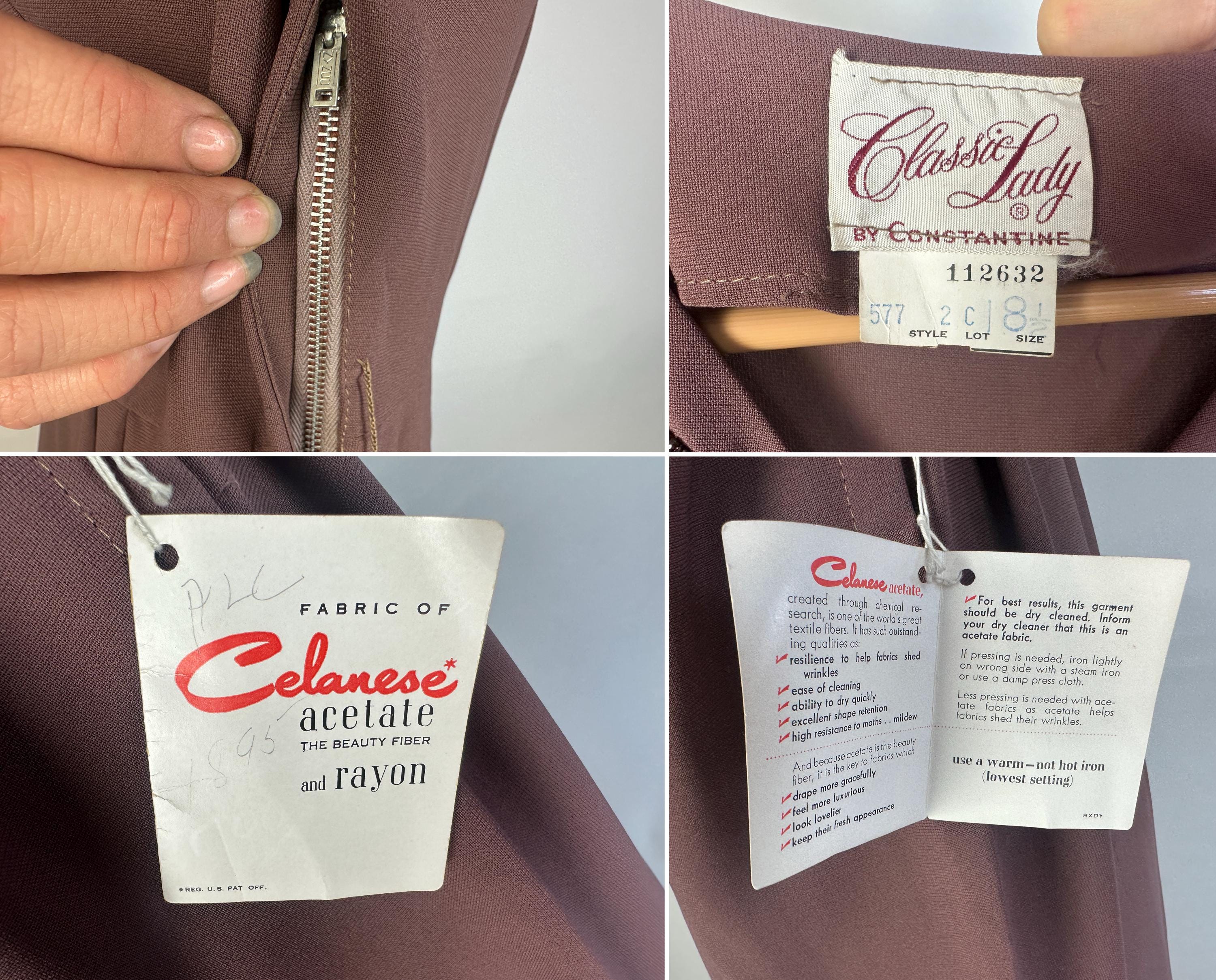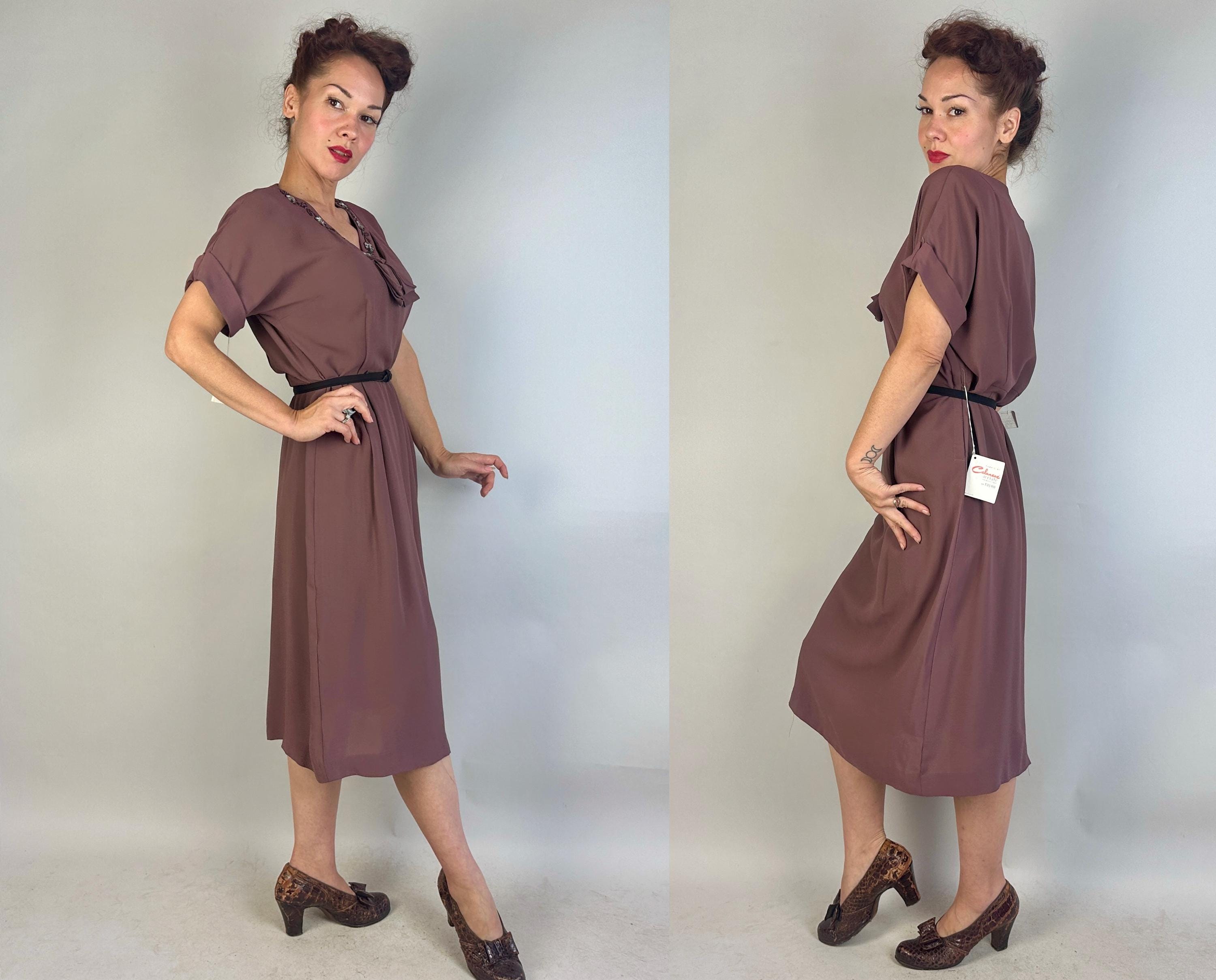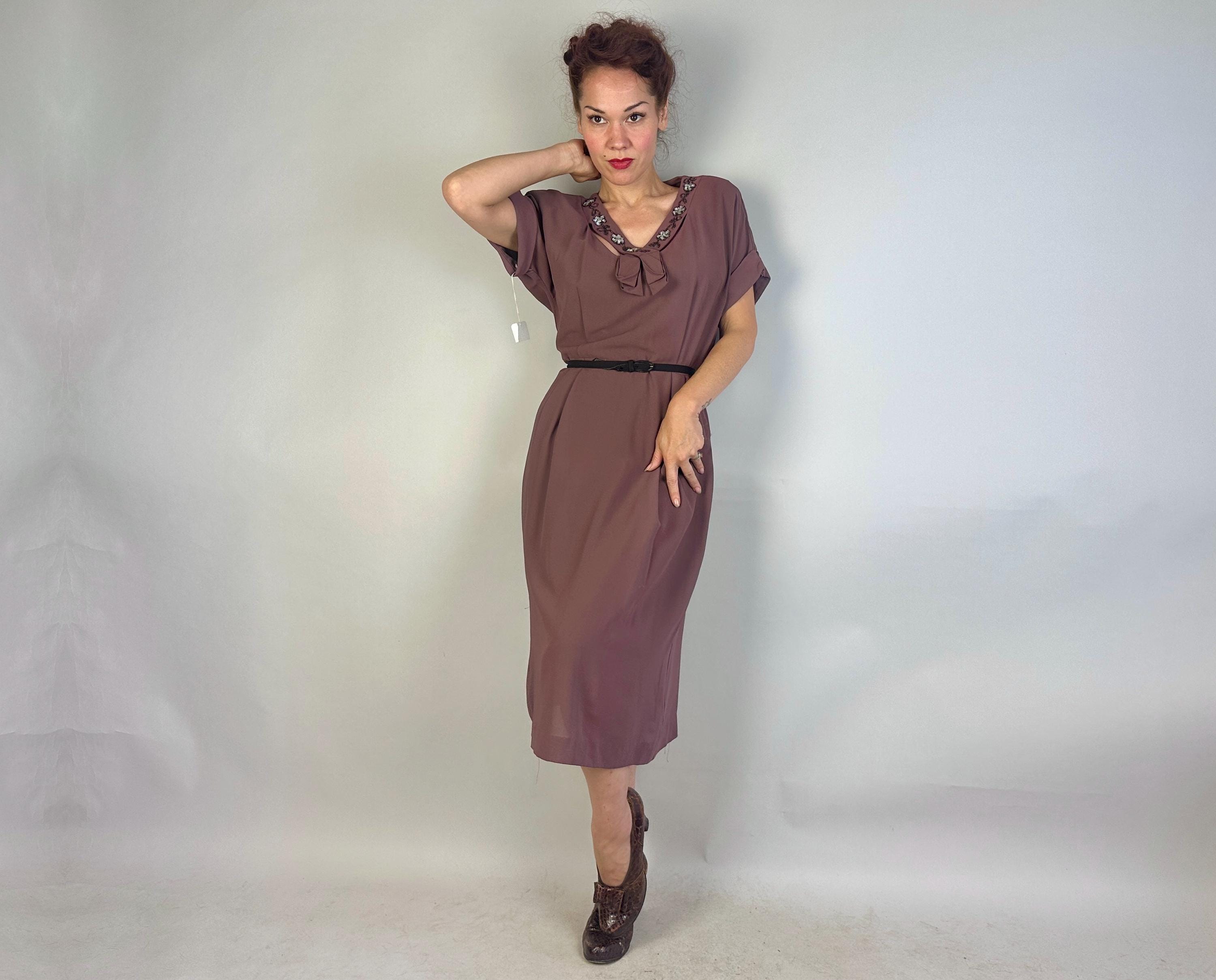 A classic lady like you was meant for this 1940s deadstock dress from "Classic Lady by Constantine"! With original tags attached, you can get extra enjoyment from the dark mauve Celanese and rayon fabric and read all about this "Beauty Fiber". The dress features a lovely neckline with a floral design of garnet seed beads and icy blue sequins and pee-a-boo cutouts from straps making a faux kerchief. Fashioned with padded shoulders, cuffed short dolman sleeves, and pleated bust and hip shaping. Metal zipper on the side. This dress is in great vintage condition, with no holes, stains, or odors to note.