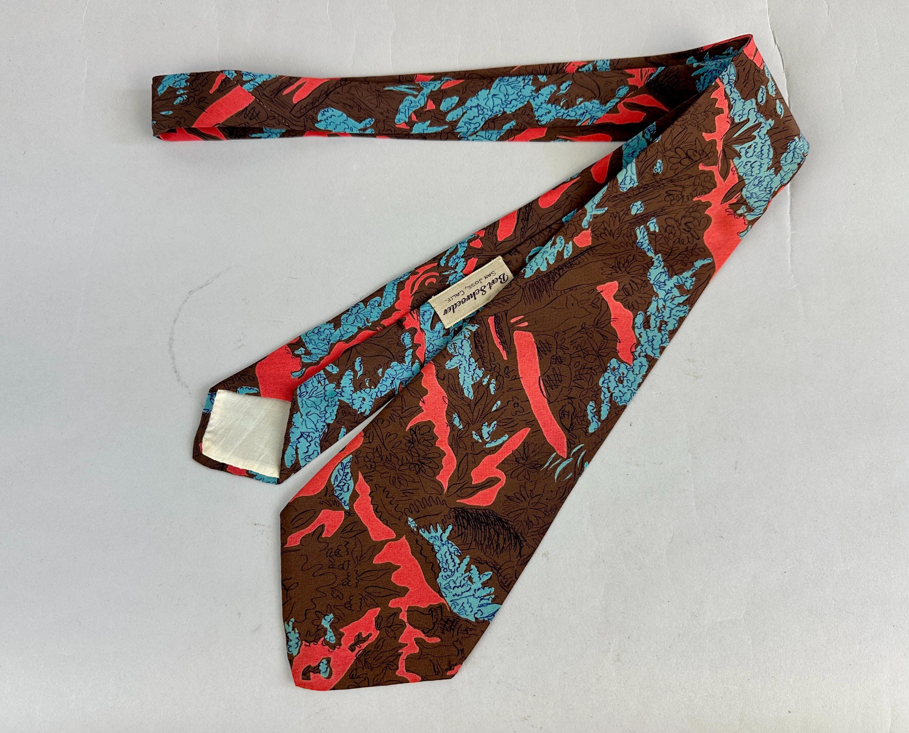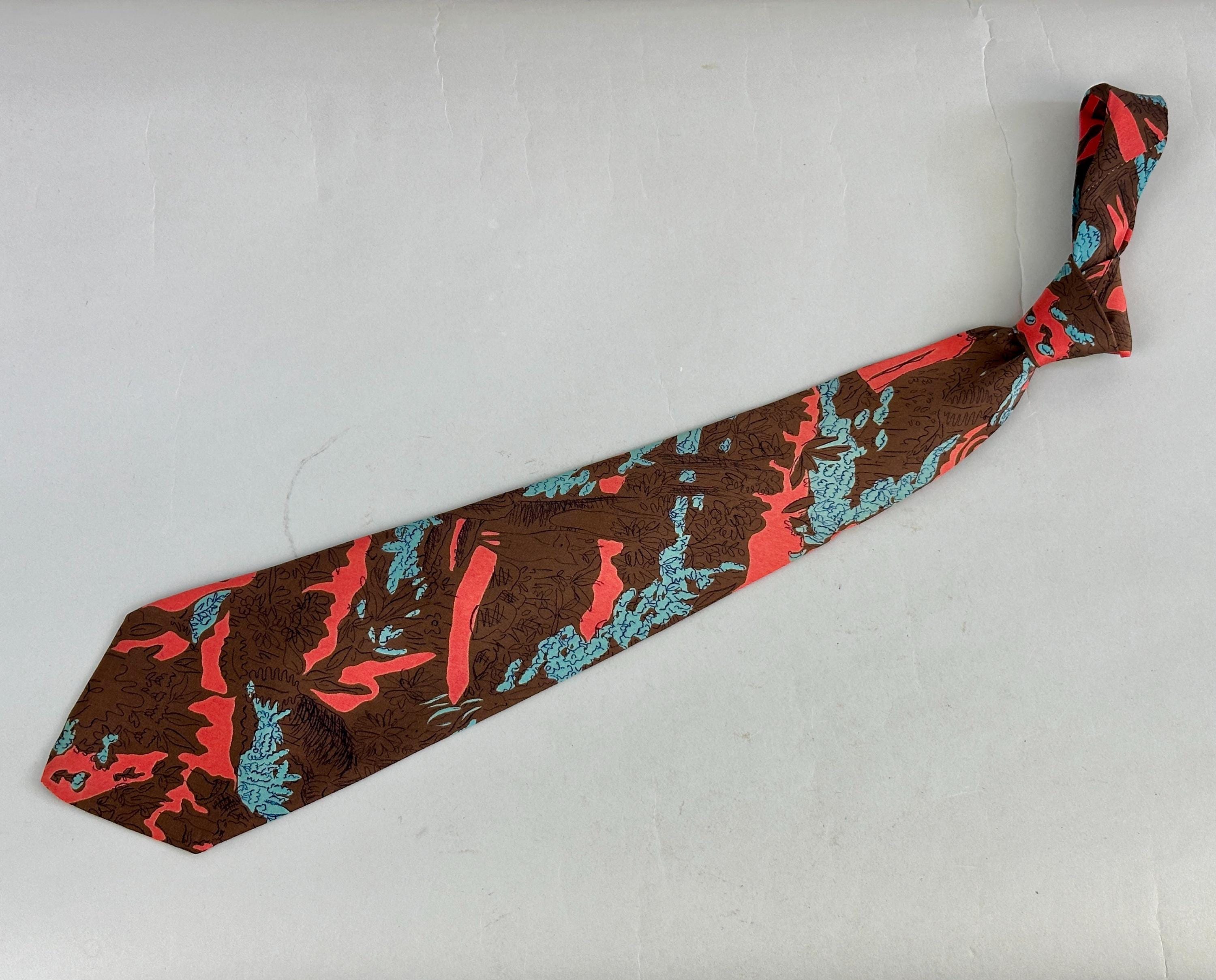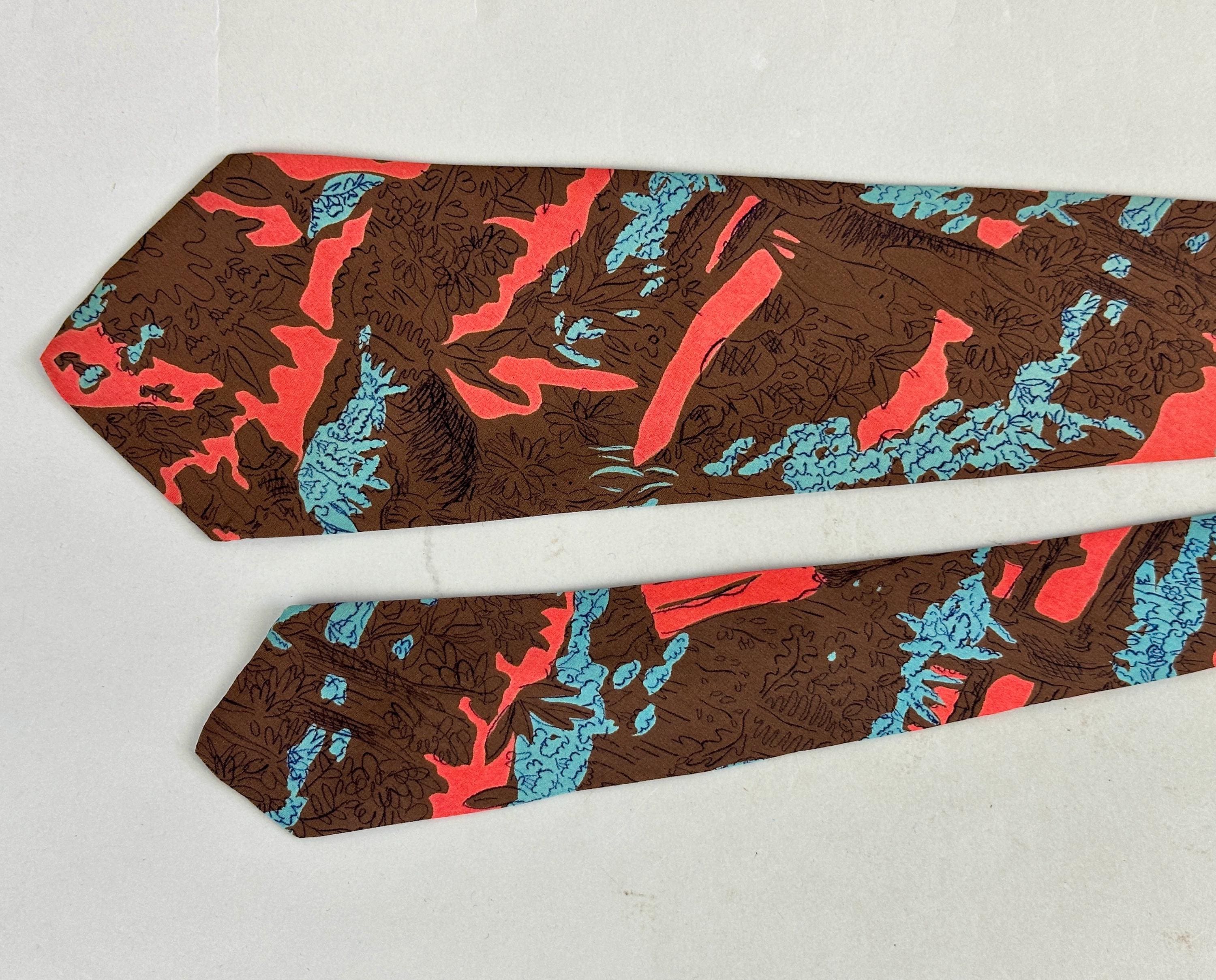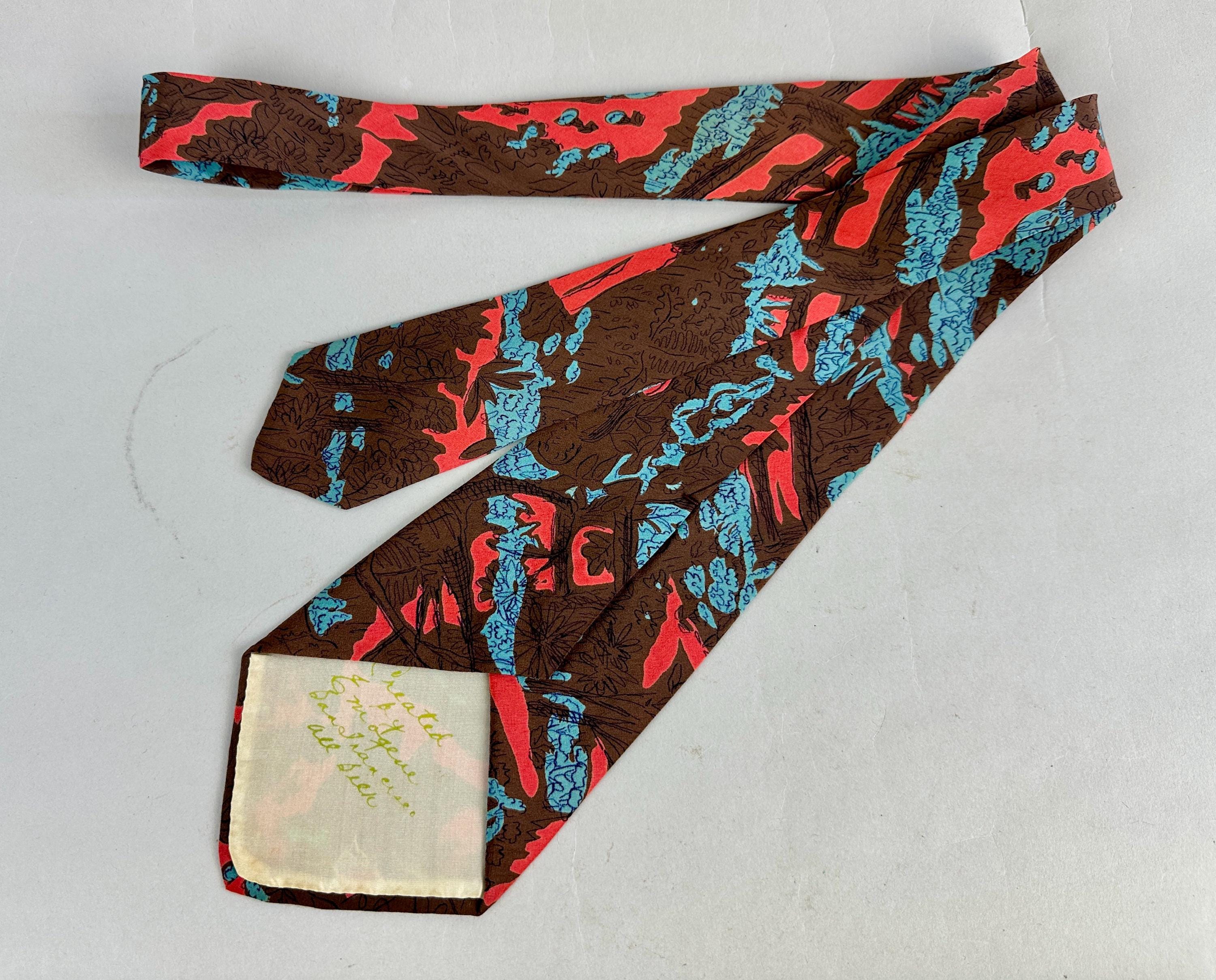 Go on a cruelty free fox hunt with this 1940s "Emogene San Francisco" necktie! The lovely silk tie is covered in a forested scene in chocolate brown, coral red, and sky blue with black line drawings of flora hiding a sly fox. Fully lined. Pairs well with a wide variety of Art Deco and Mid-Century suit colors and fabric types. Sold at "Bert Schroeder". This tie is in great vintage condition with no flaws found!