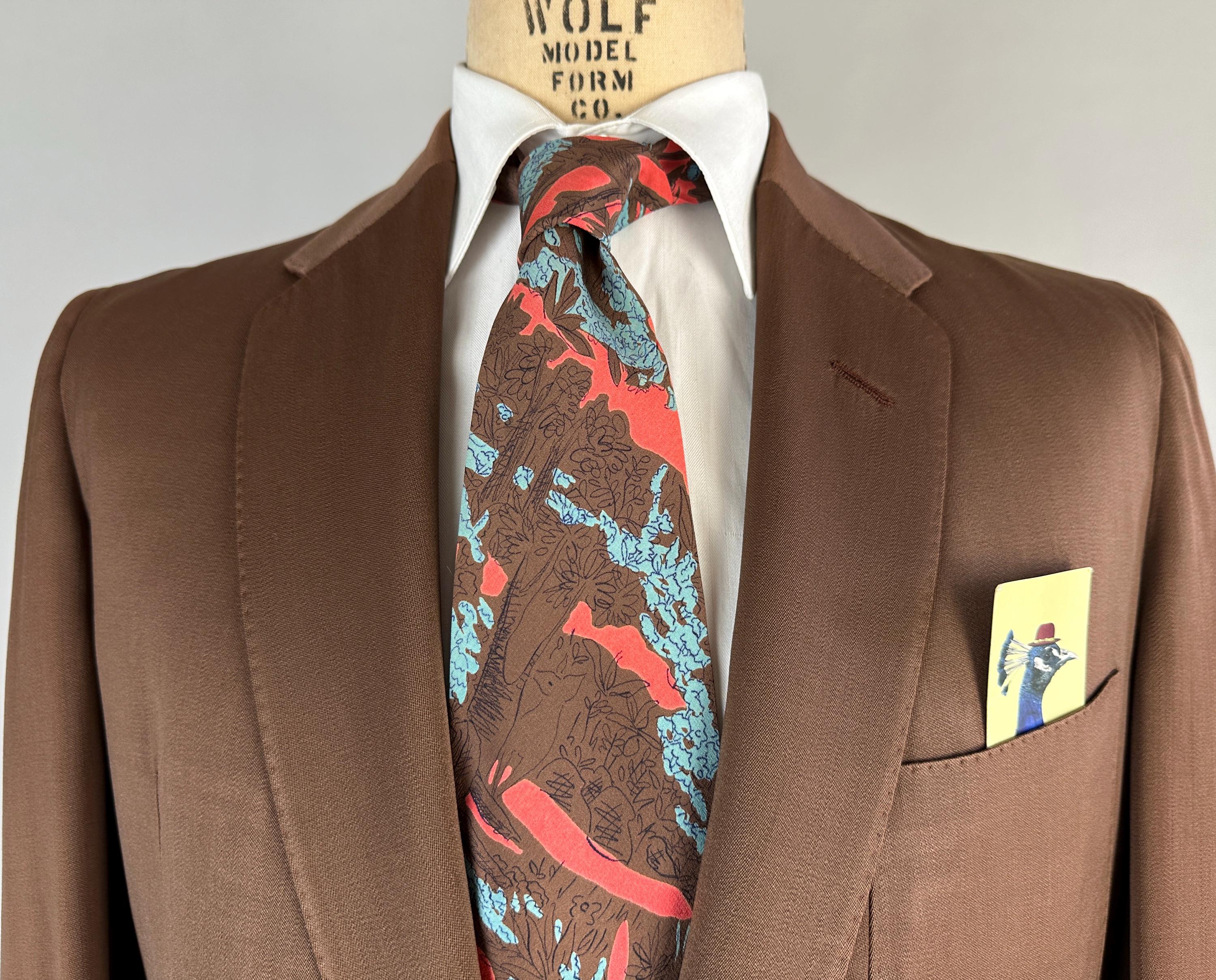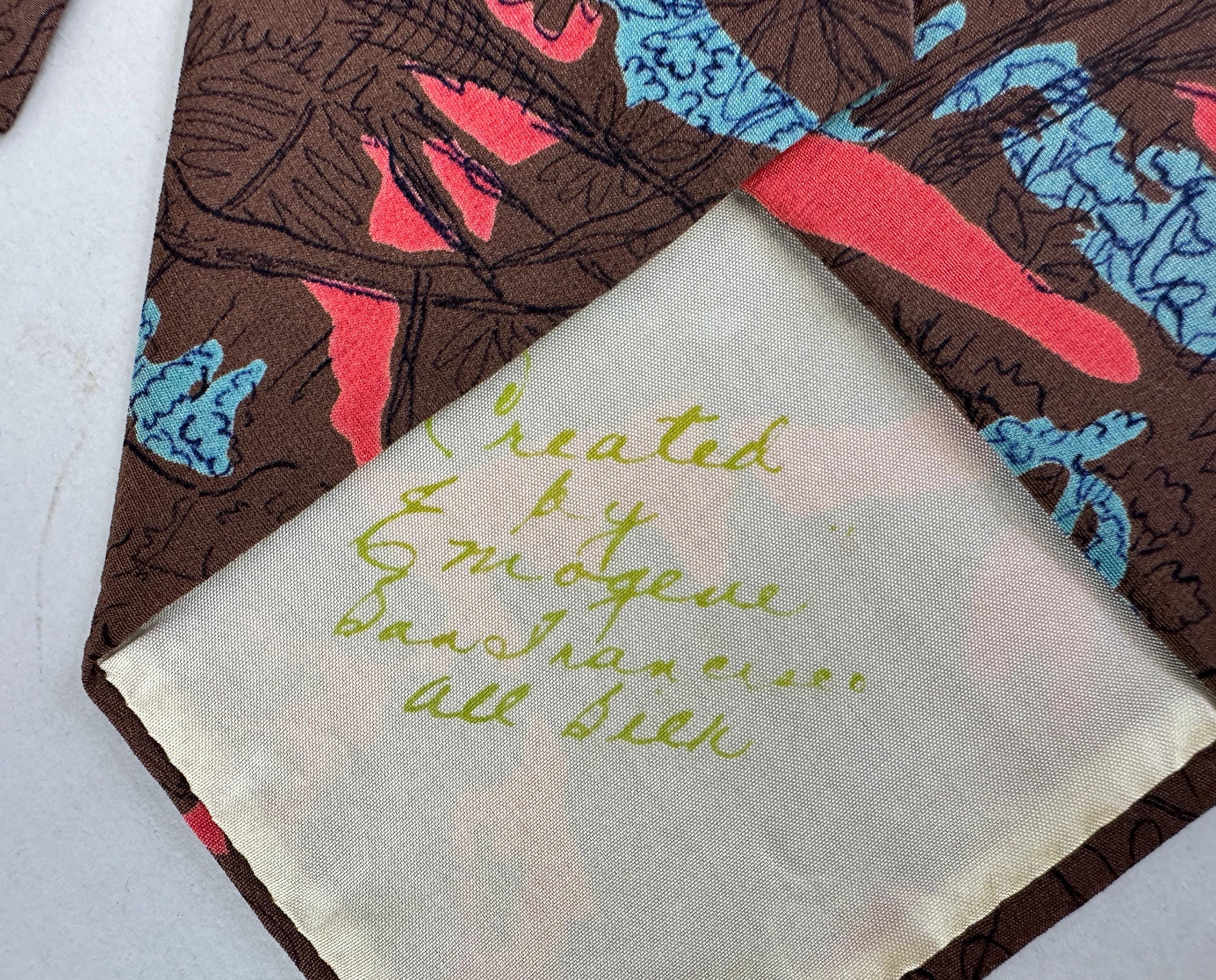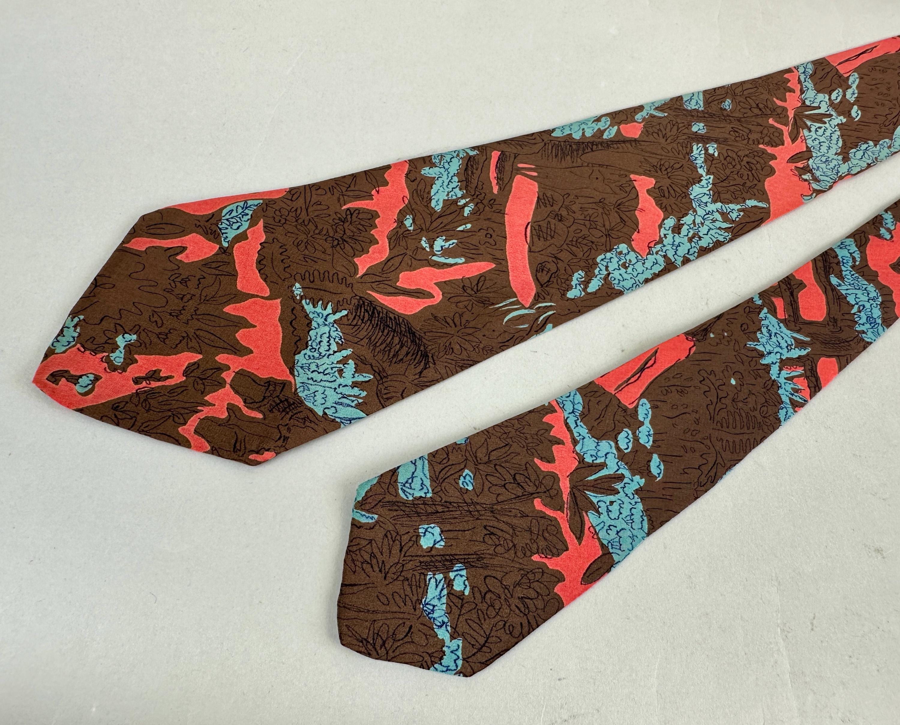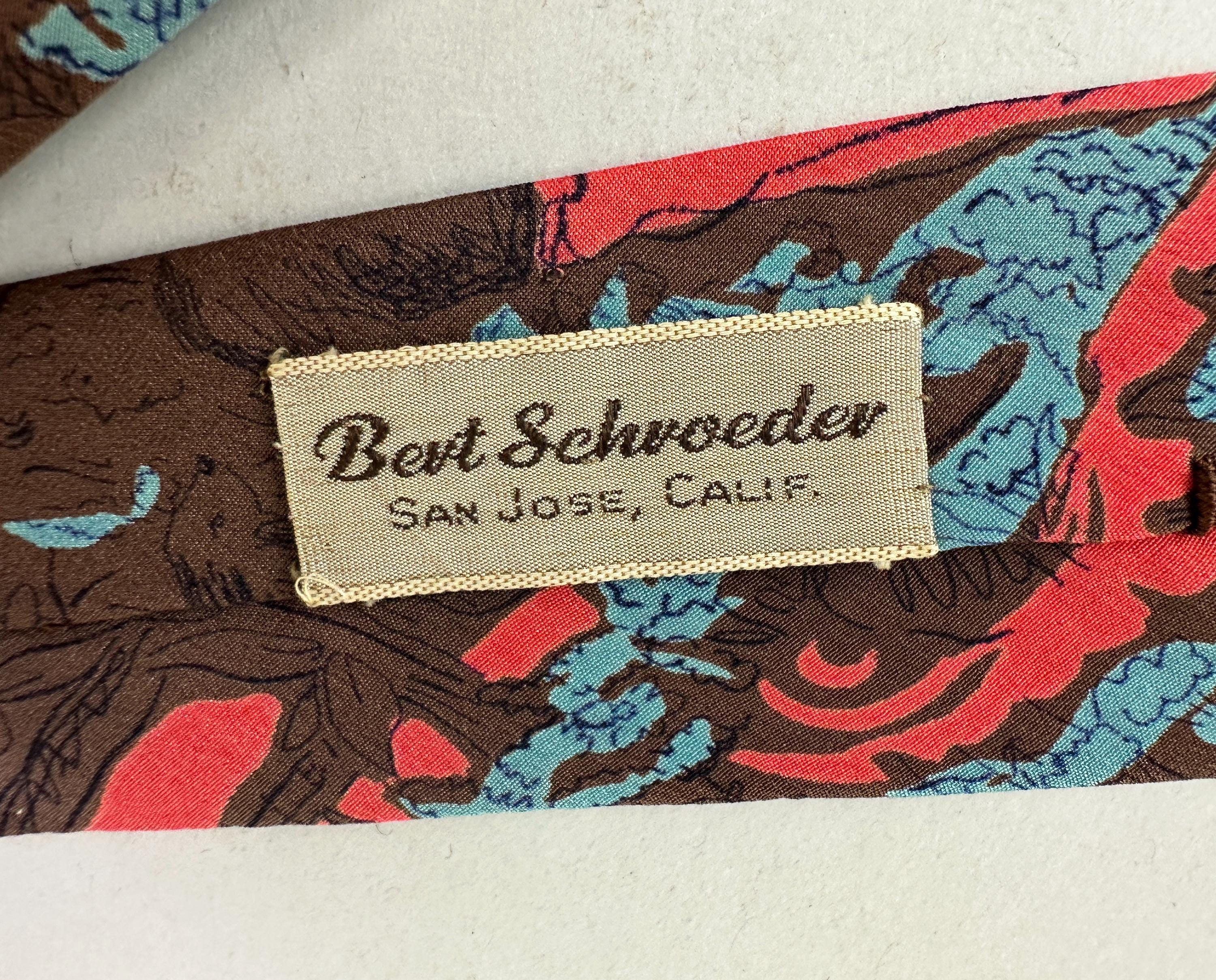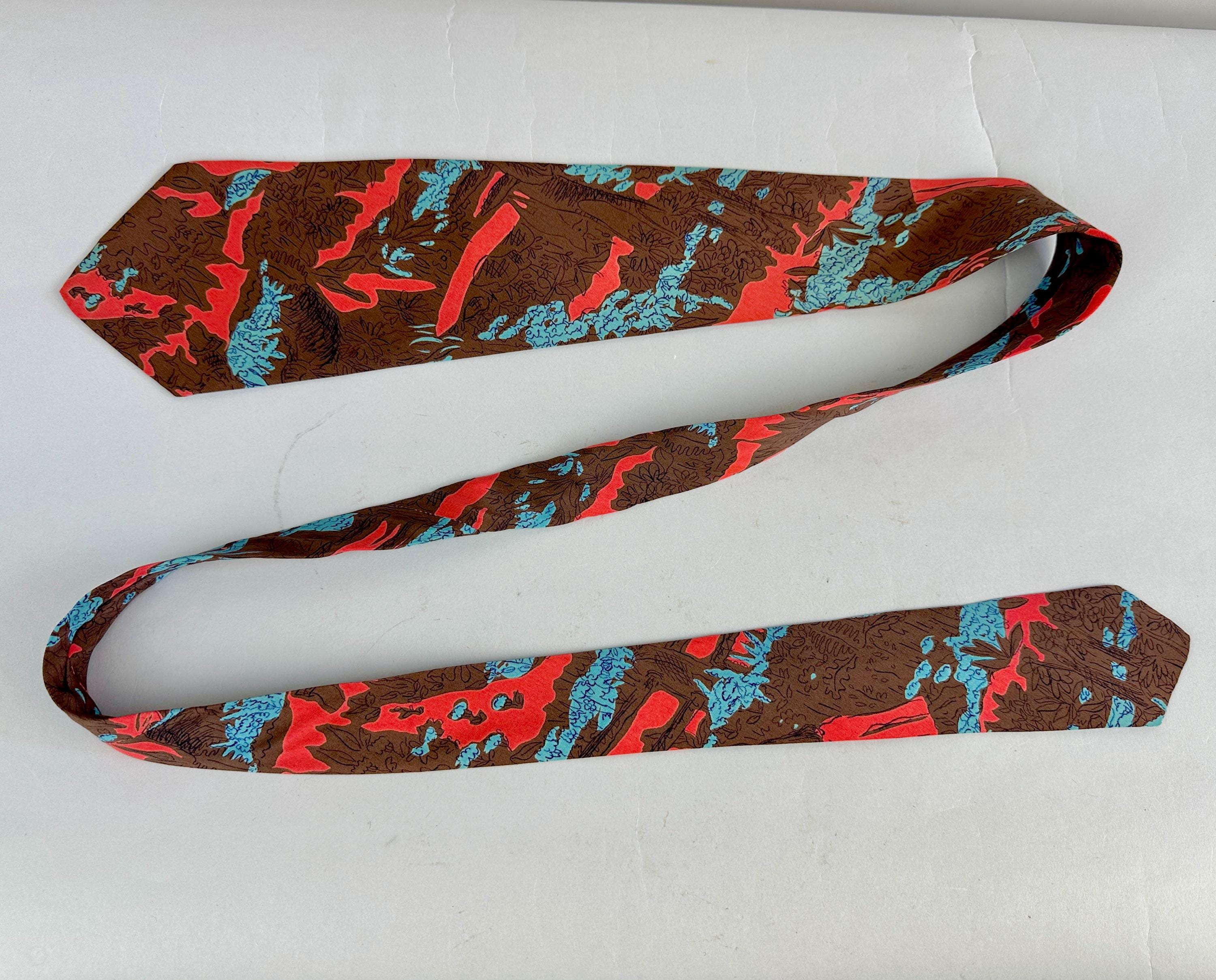 Go on a cruelty free fox hunt with this 1940s "Emogene San Francisco" necktie! The lovely silk tie is covered in a forested scene in chocolate brown, coral red, and sky blue with black line drawings of flora hiding a sly fox. Fully lined. Pairs well with a wide variety of Art Deco and Mid-Century suit colors and fabric types. Sold at "Bert Schroeder". This tie is in great vintage condition with no flaws found!