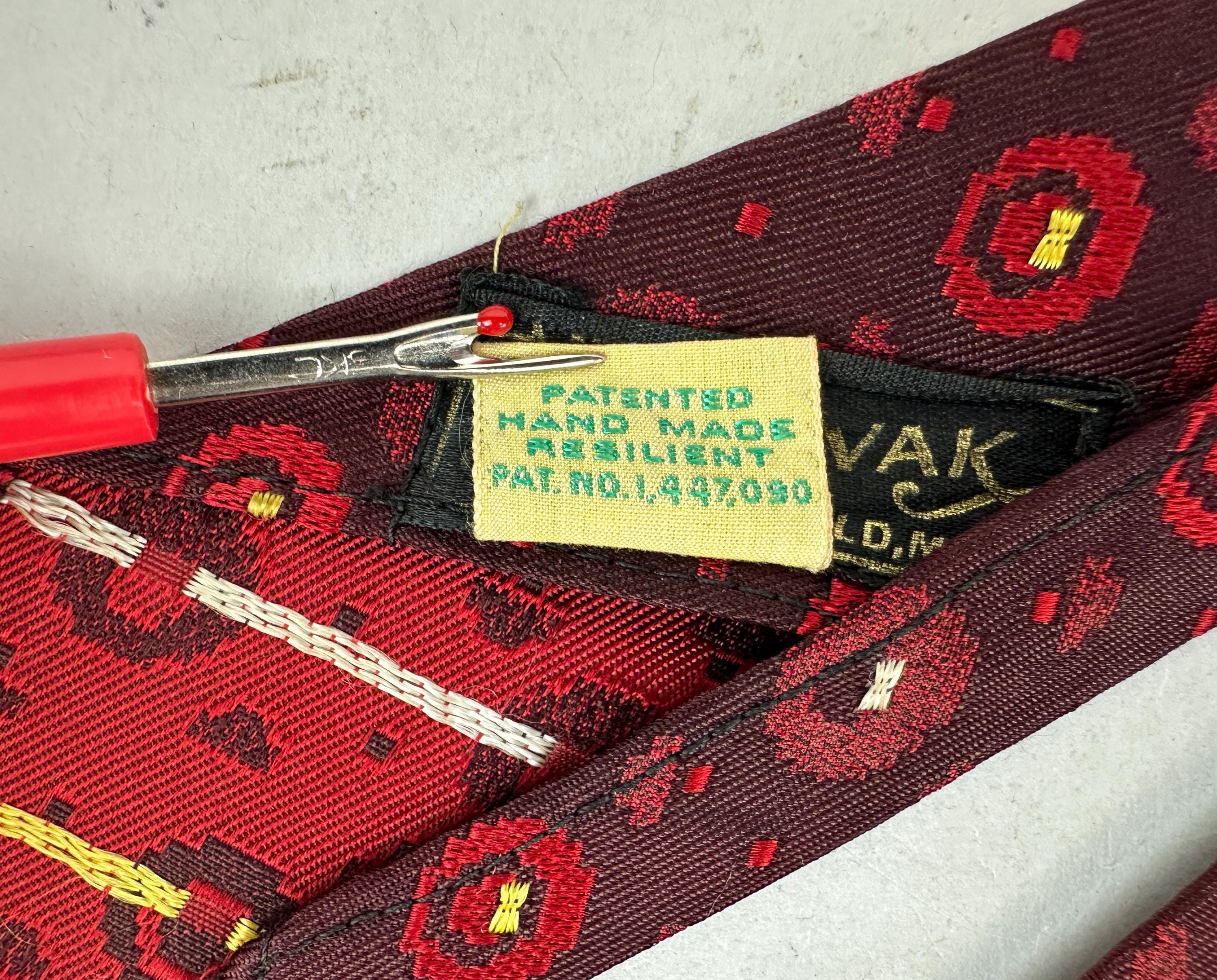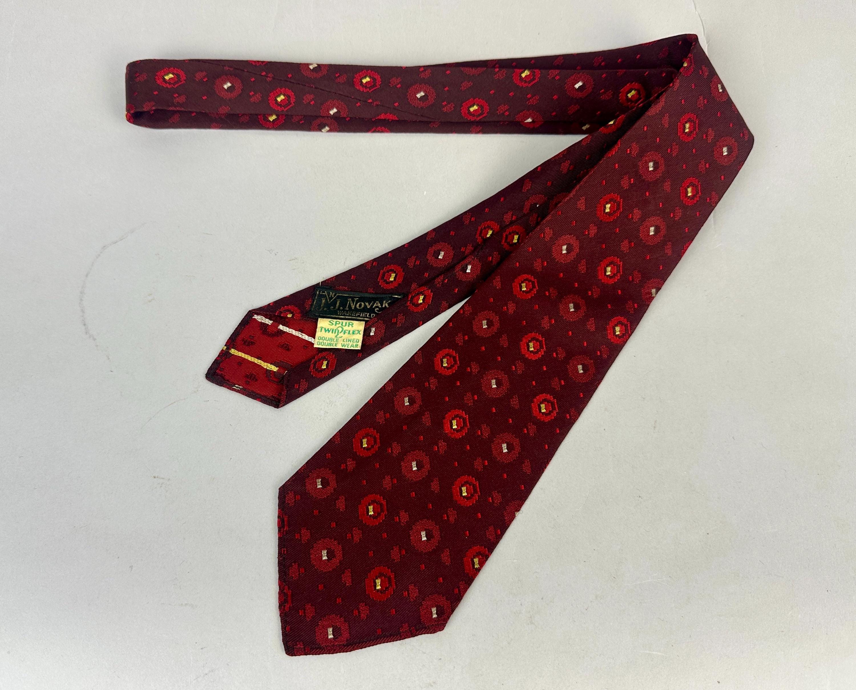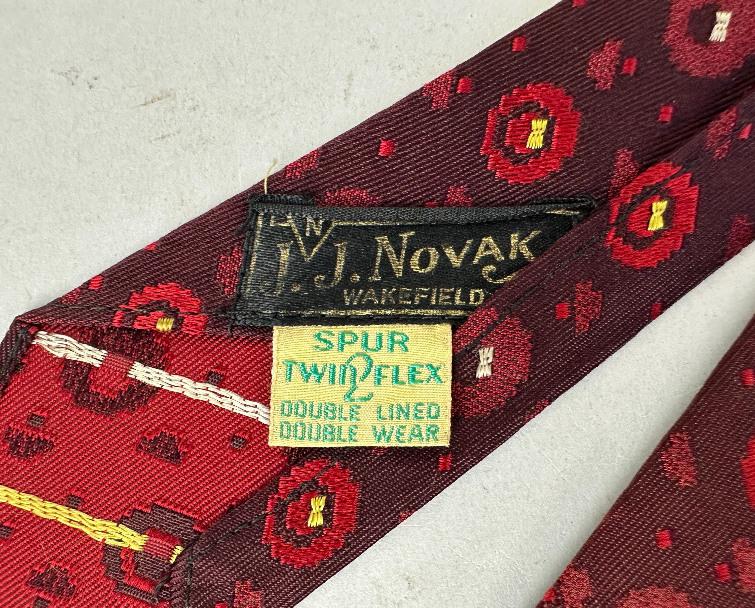 Is fashion an inheritable trait? This 1920s necktie suggests its in the blood! This silk tie infuses red hues from deep blood to alizarin crimson to scarlet. The brocade weave has varying pixelated spots with the larger ones getting just a touch of silver and canary yellow. Unlined though label reads "Double Lined Double Wear" and also labeled "J.J. Novak Spur 2 Flex". Patent Dated to 1922! Pairs well with a wide variety of Art Deco and Mid-Century suit colors and fabric types. This tie is in great vintage condition with no flaws found!
