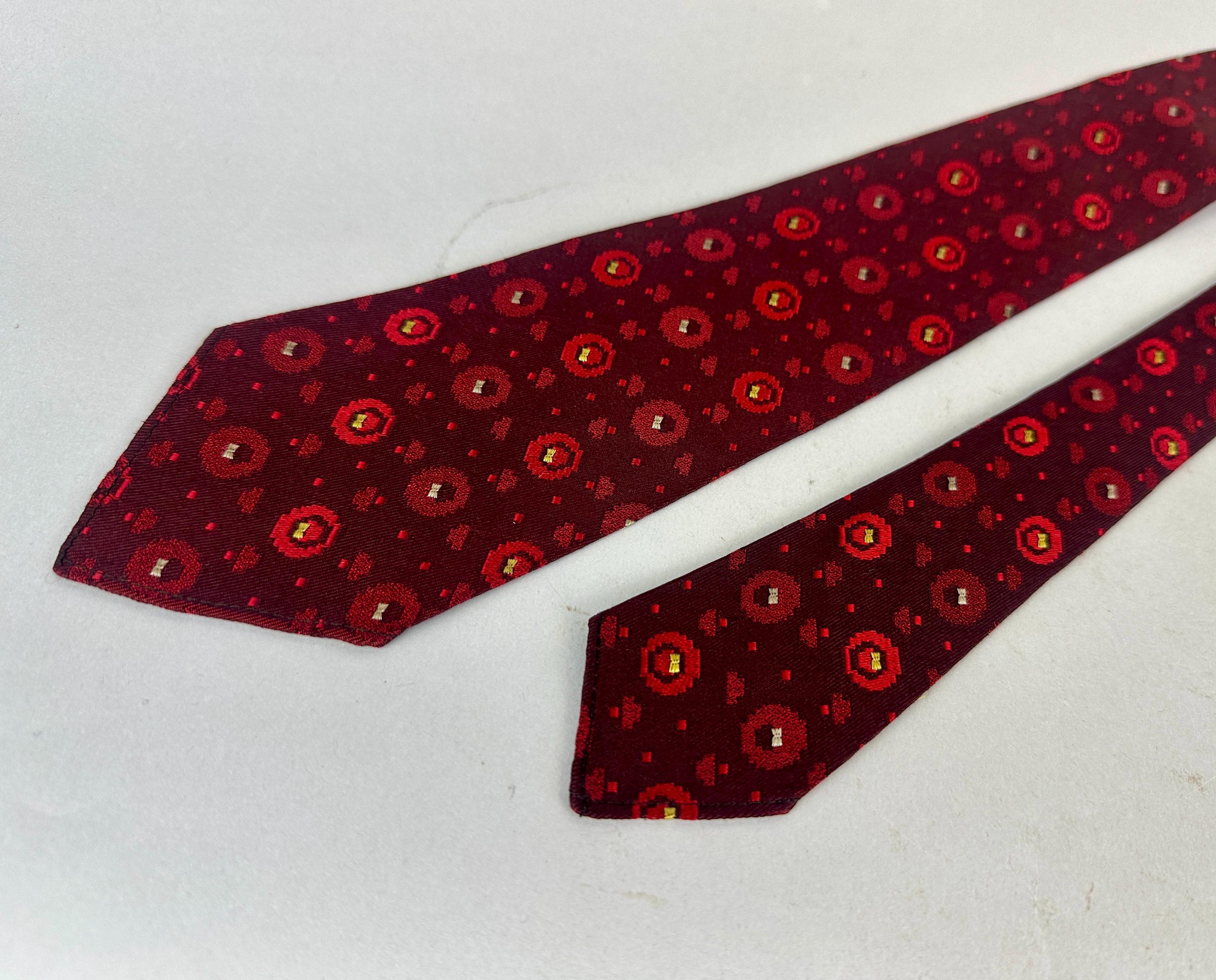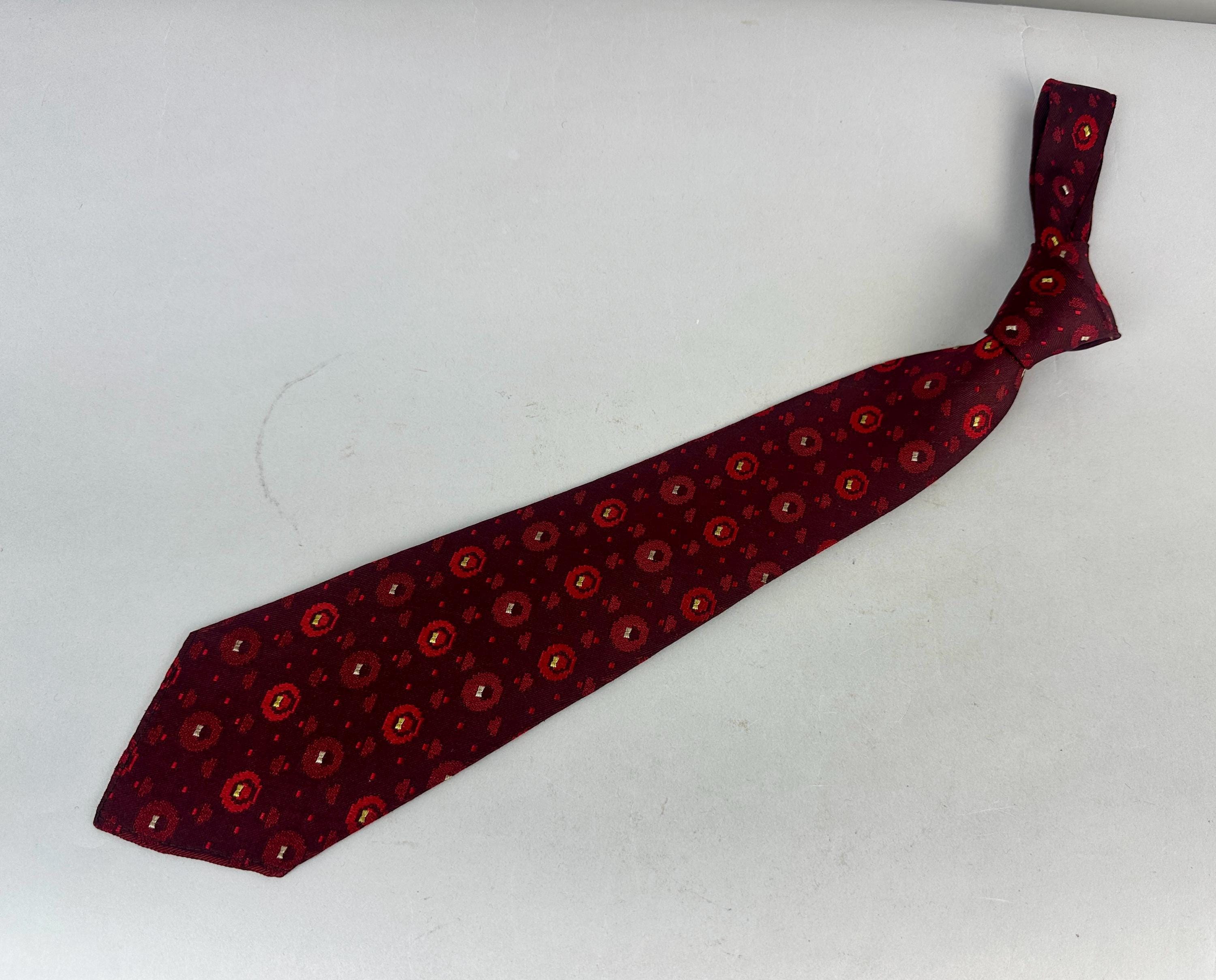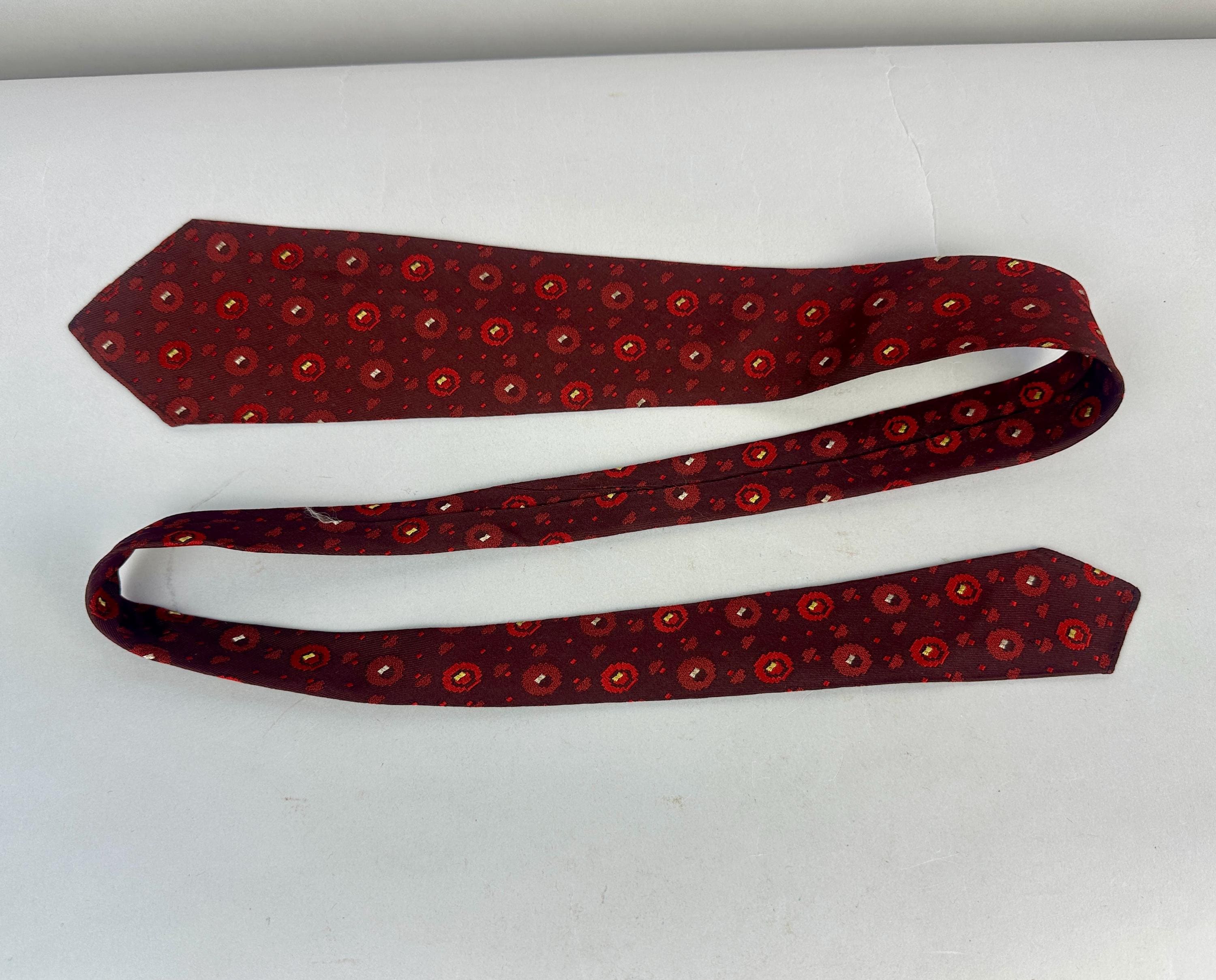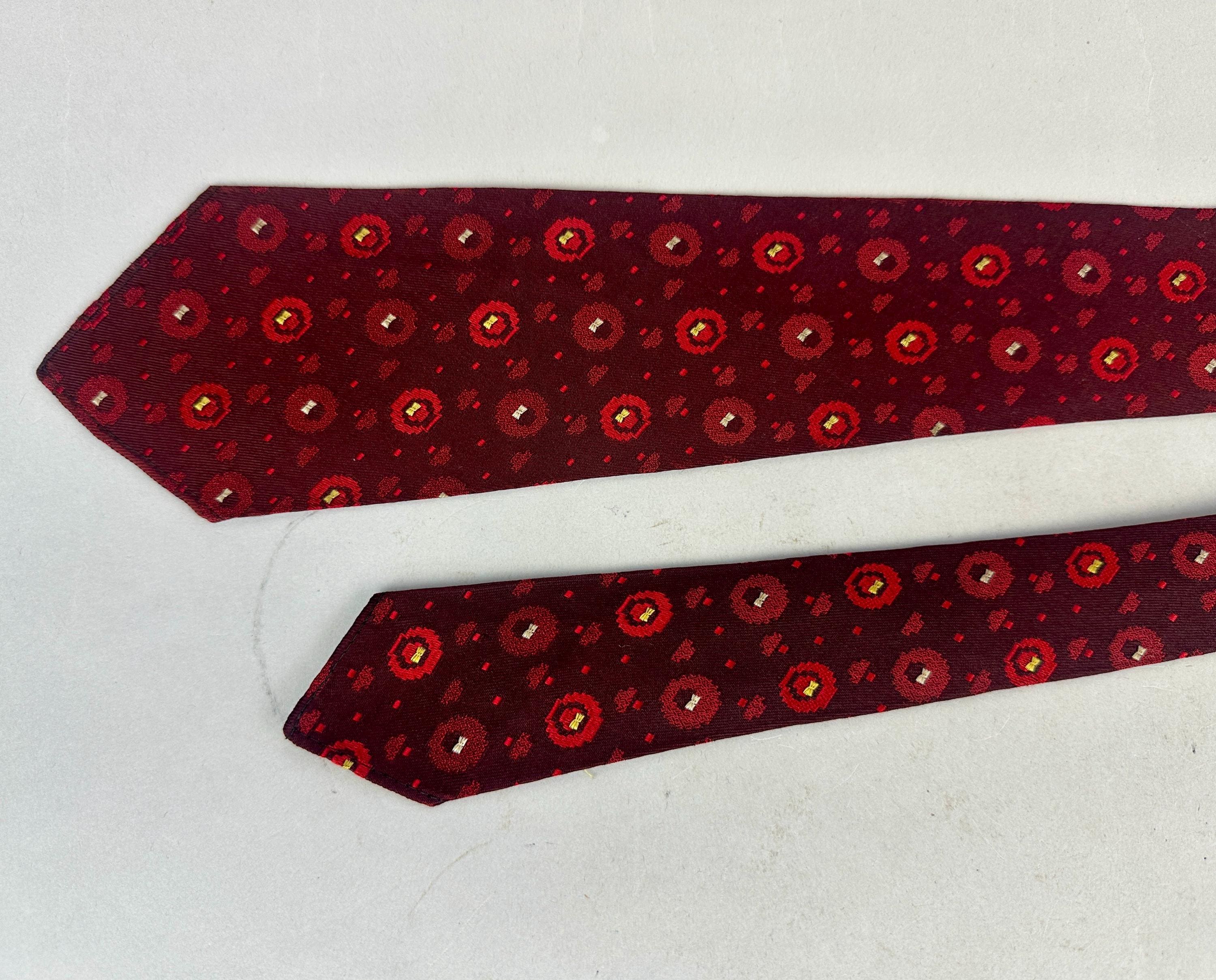 Is fashion an inheritable trait? This 1920s necktie suggests its in the blood! This silk tie infuses red hues from deep blood to alizarin crimson to scarlet. The brocade weave has varying pixelated spots with the larger ones getting just a touch of silver and canary yellow. Unlined though label reads "Double Lined Double Wear" and also labeled "J.J. Novak Spur 2 Flex". Patent Dated to 1922! Pairs well with a wide variety of Art Deco and Mid-Century suit colors and fabric types. This tie is in great vintage condition with no flaws found!