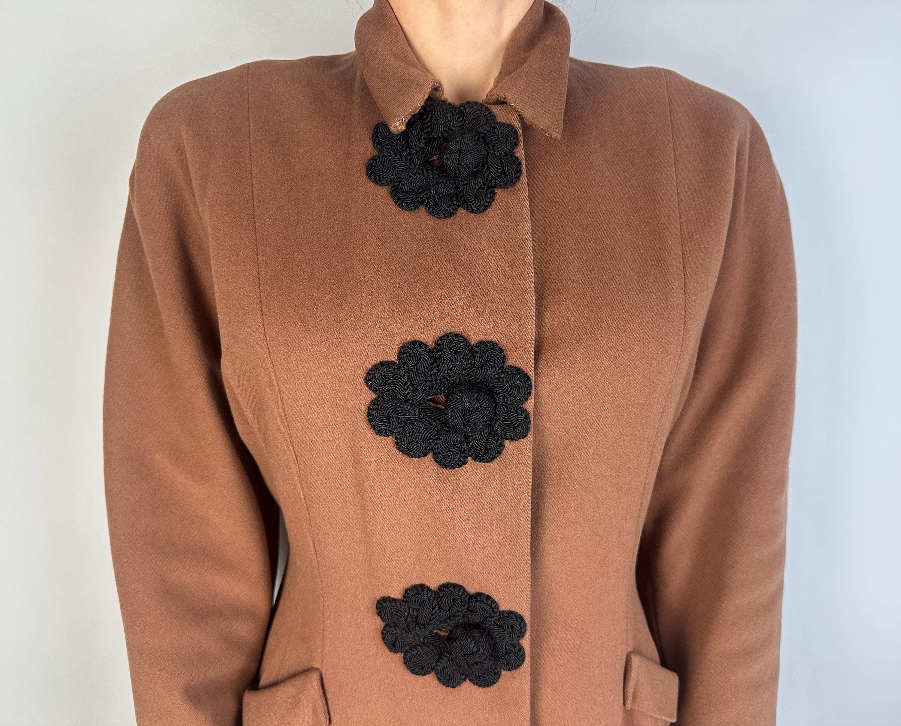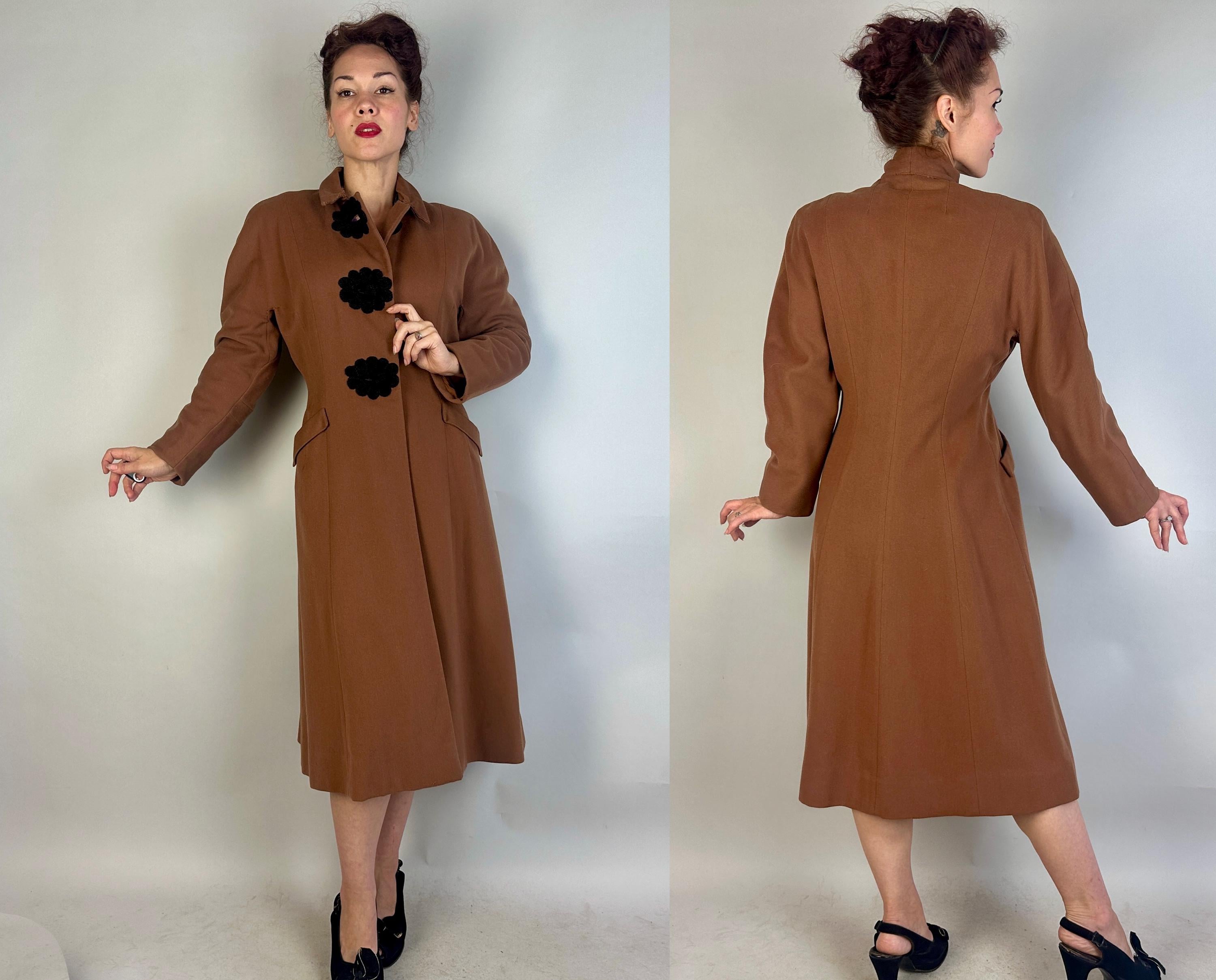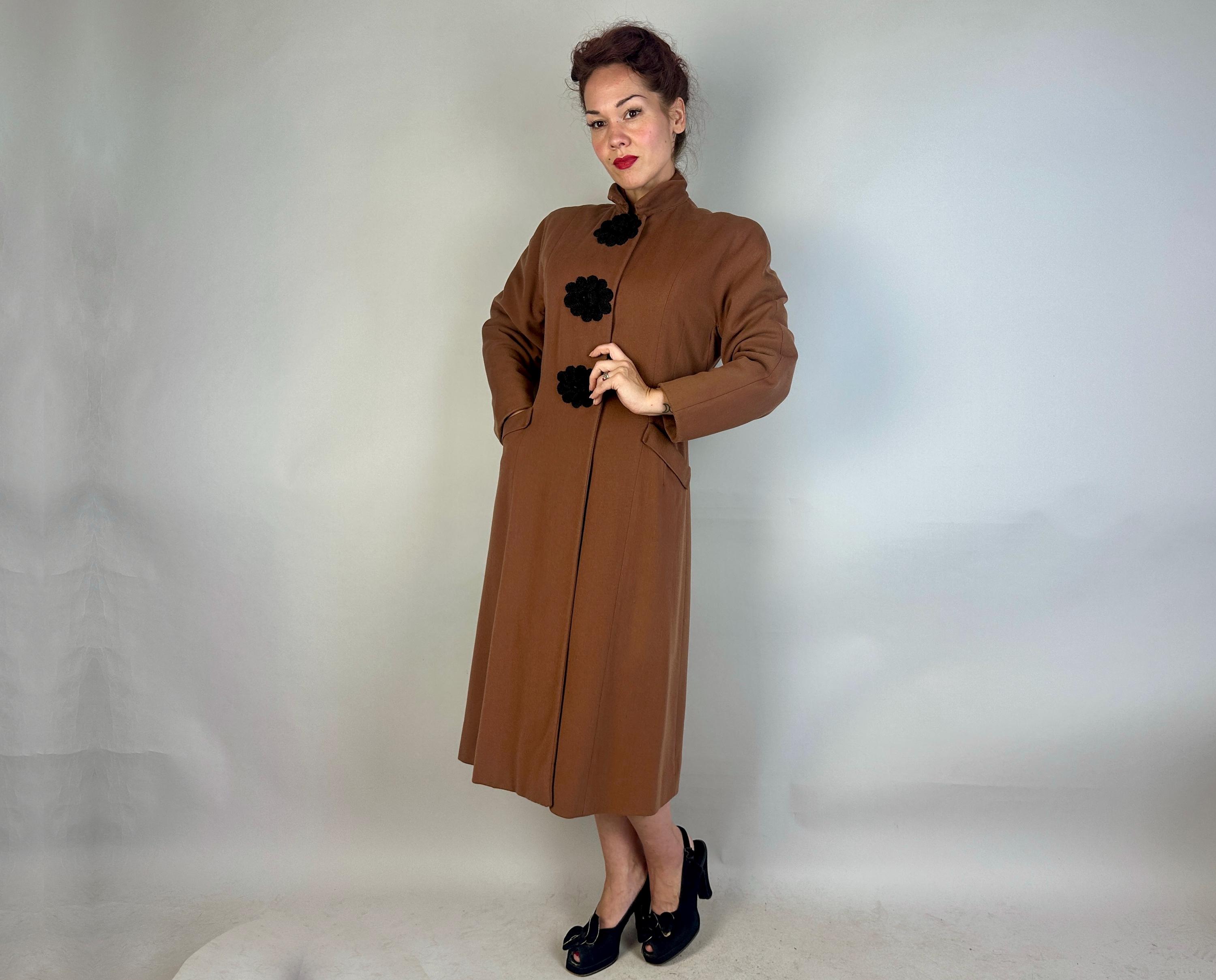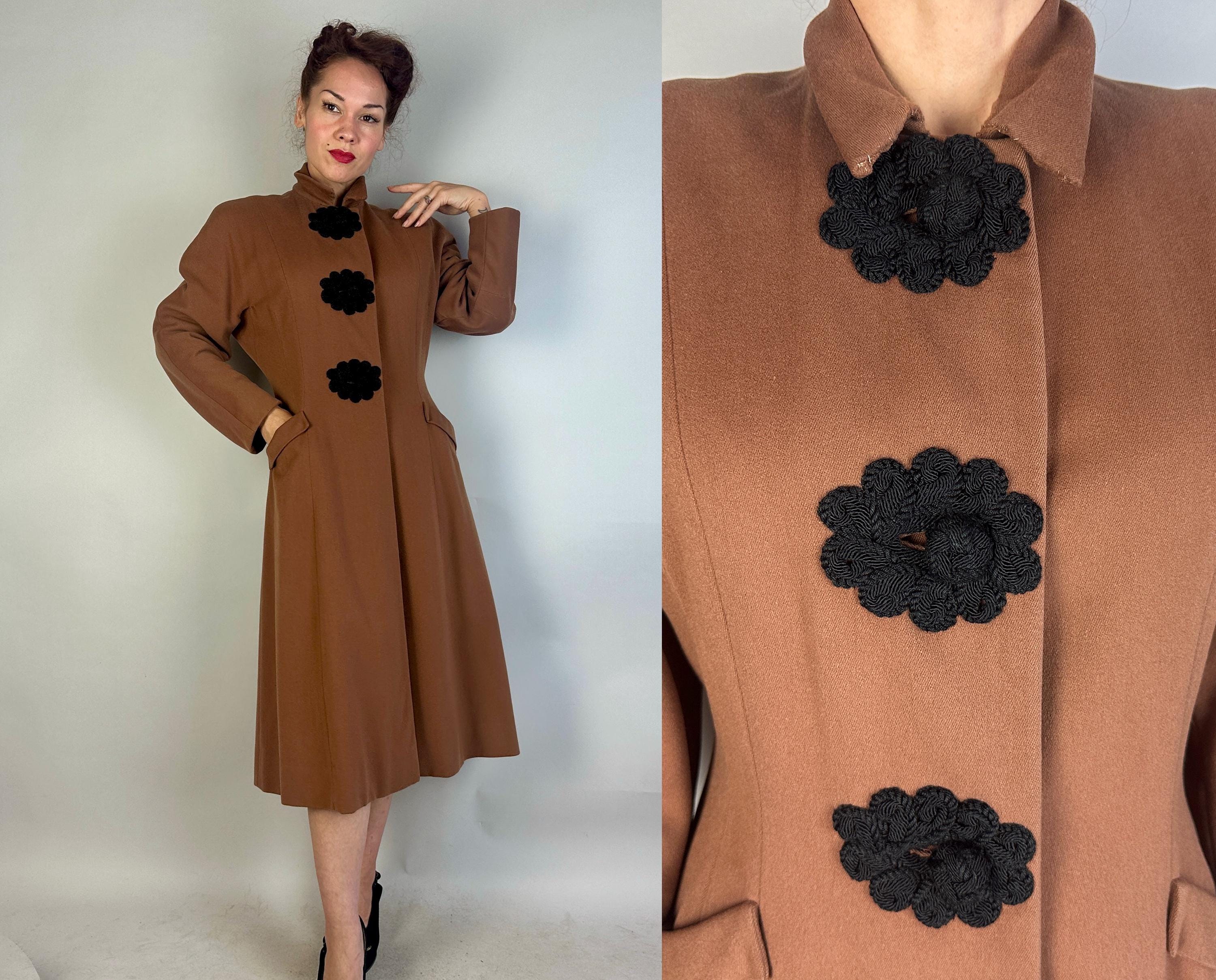 When winter comes you're sure to want to cuddle up in this darling 1930s coat! This wool coat is teddy bear brown with sleek seamwork making a sophisticated silhouette. The shoulders are very lightly padded but have a sloped cut while the sleeve is a narrow dolman. Slanted hip pockets are accented with a turned down cuff and the three button closure makes a standout decoration of black braided cord tightly swirled and curled around the button holes and making up the button themselves. Fully lined with rayon crepe. This coat is in great vintage condition, with no holes, stains, or odors to note.