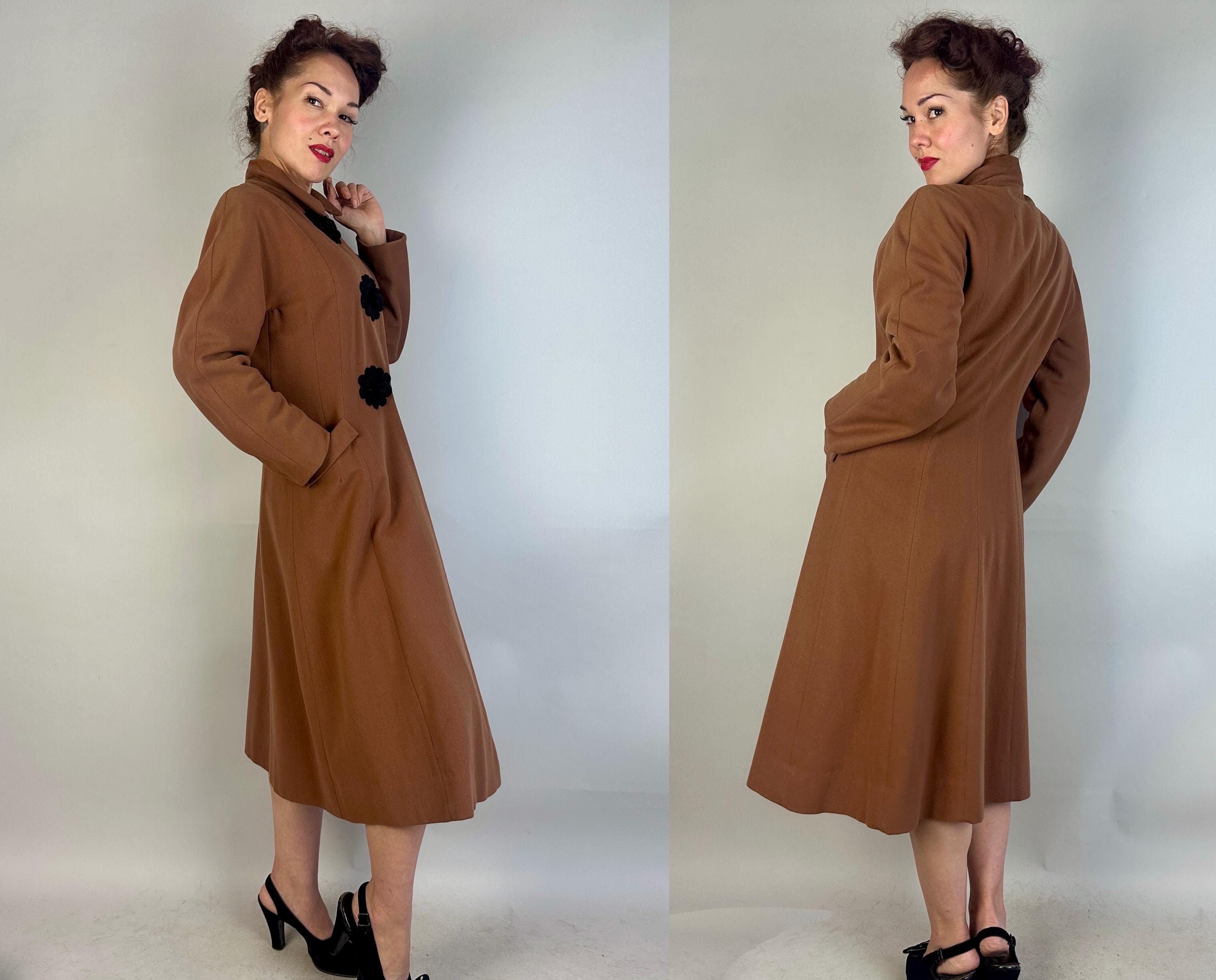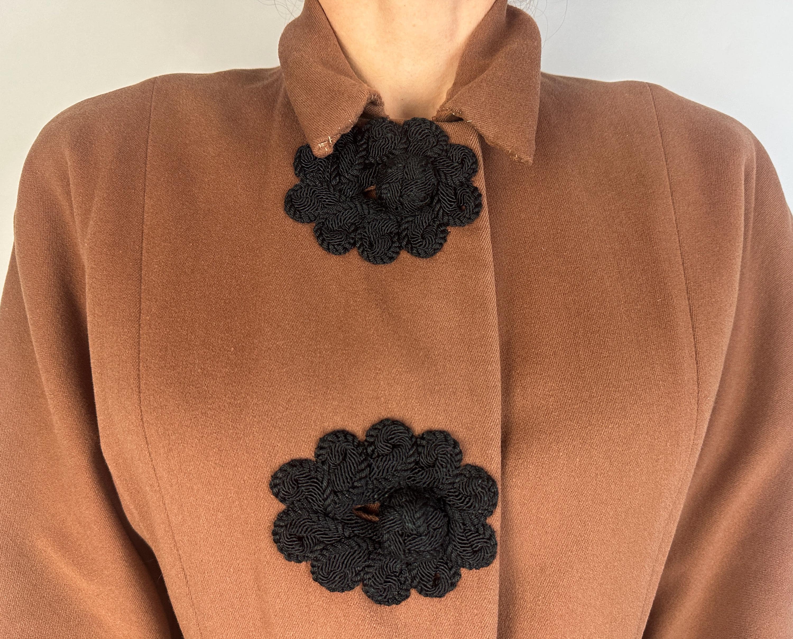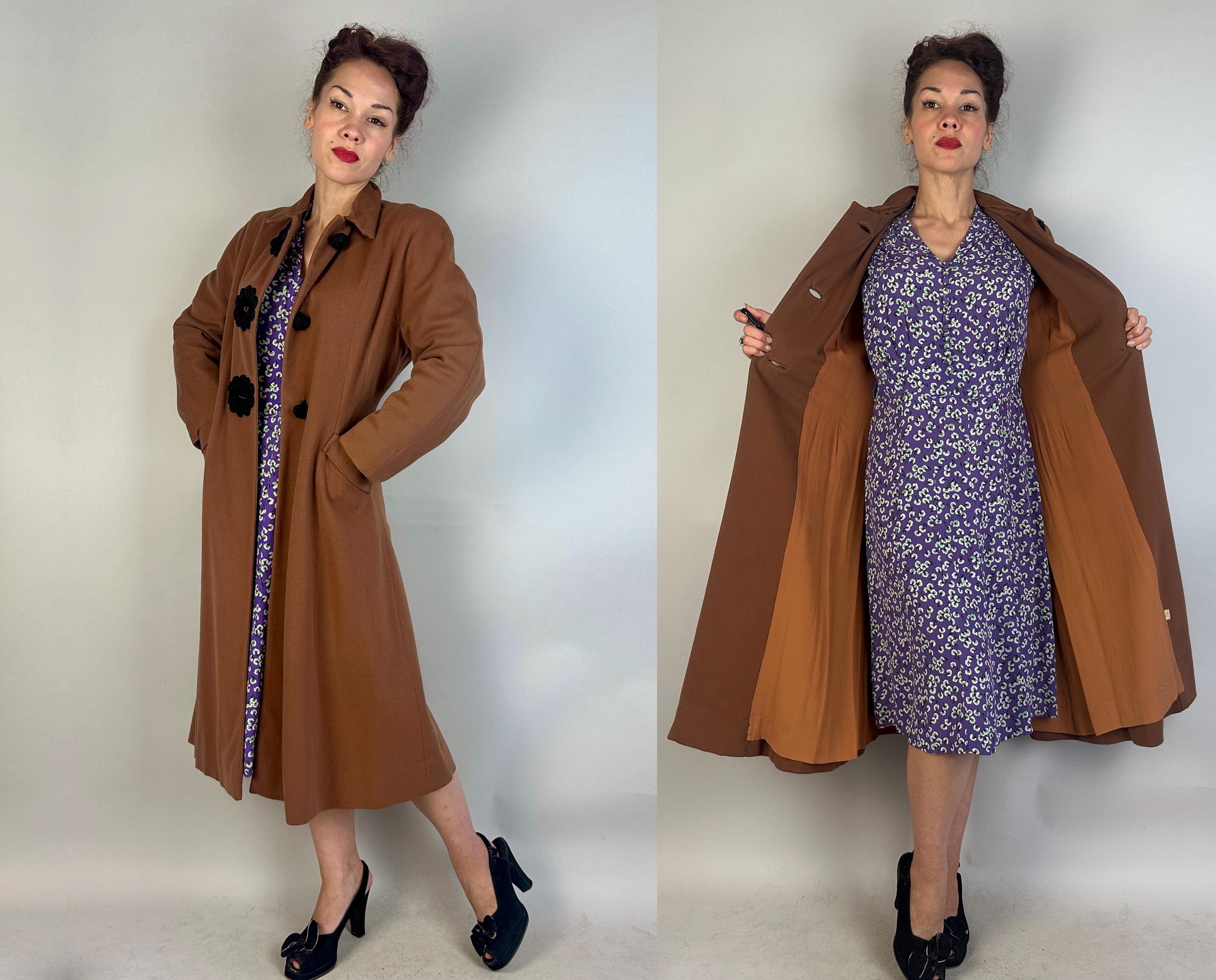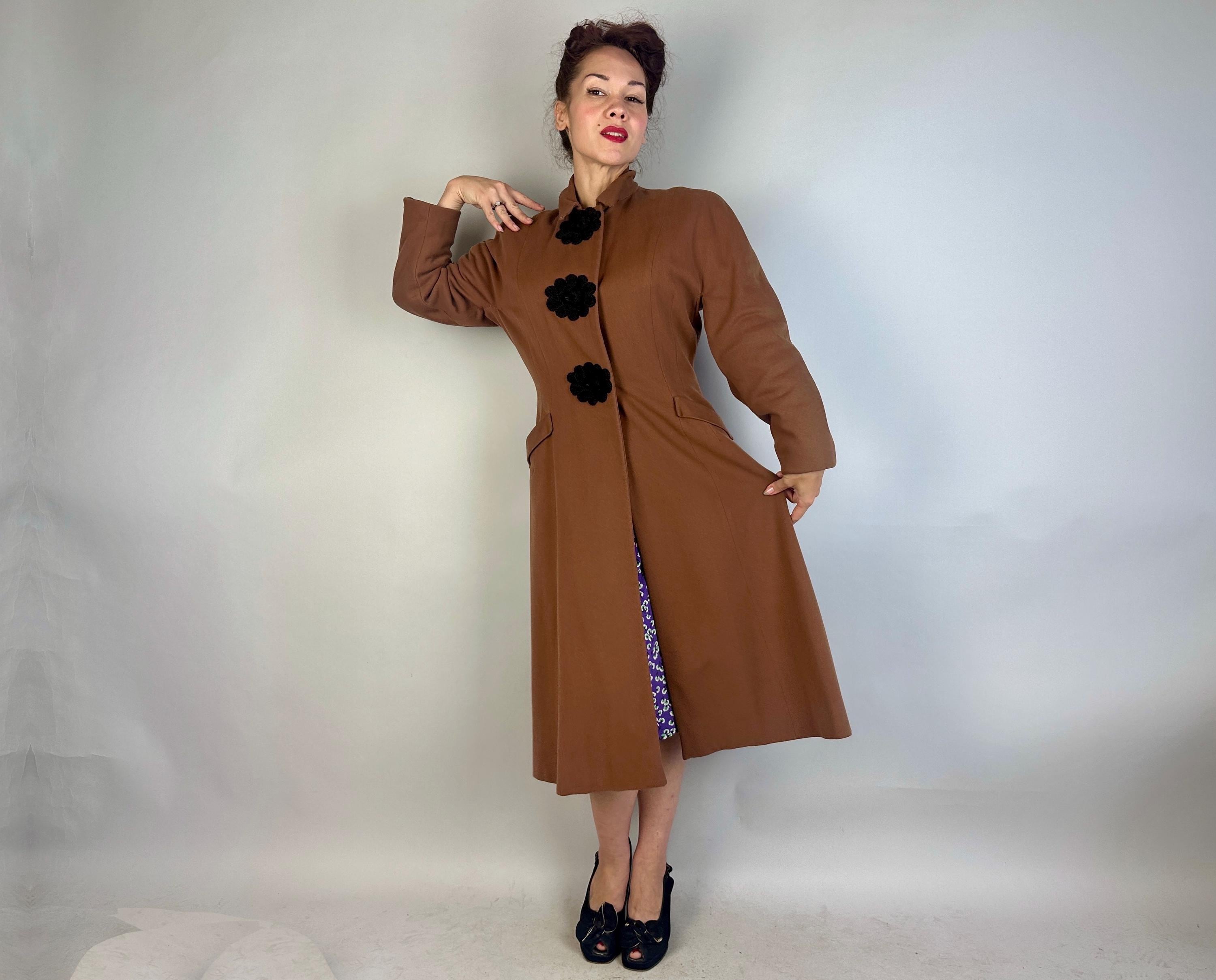 When winter comes you're sure to want to cuddle up in this darling 1930s coat! This wool coat is teddy bear brown with sleek seamwork making a sophisticated silhouette. The shoulders are very lightly padded but have a sloped cut while the sleeve is a narrow dolman. Slanted hip pockets are accented with a turned down cuff and the three button closure makes a standout decoration of black braided cord tightly swirled and curled around the button holes and making up the button themselves. Fully lined with rayon crepe. This coat is in great vintage condition, with no holes, stains, or odors to note.