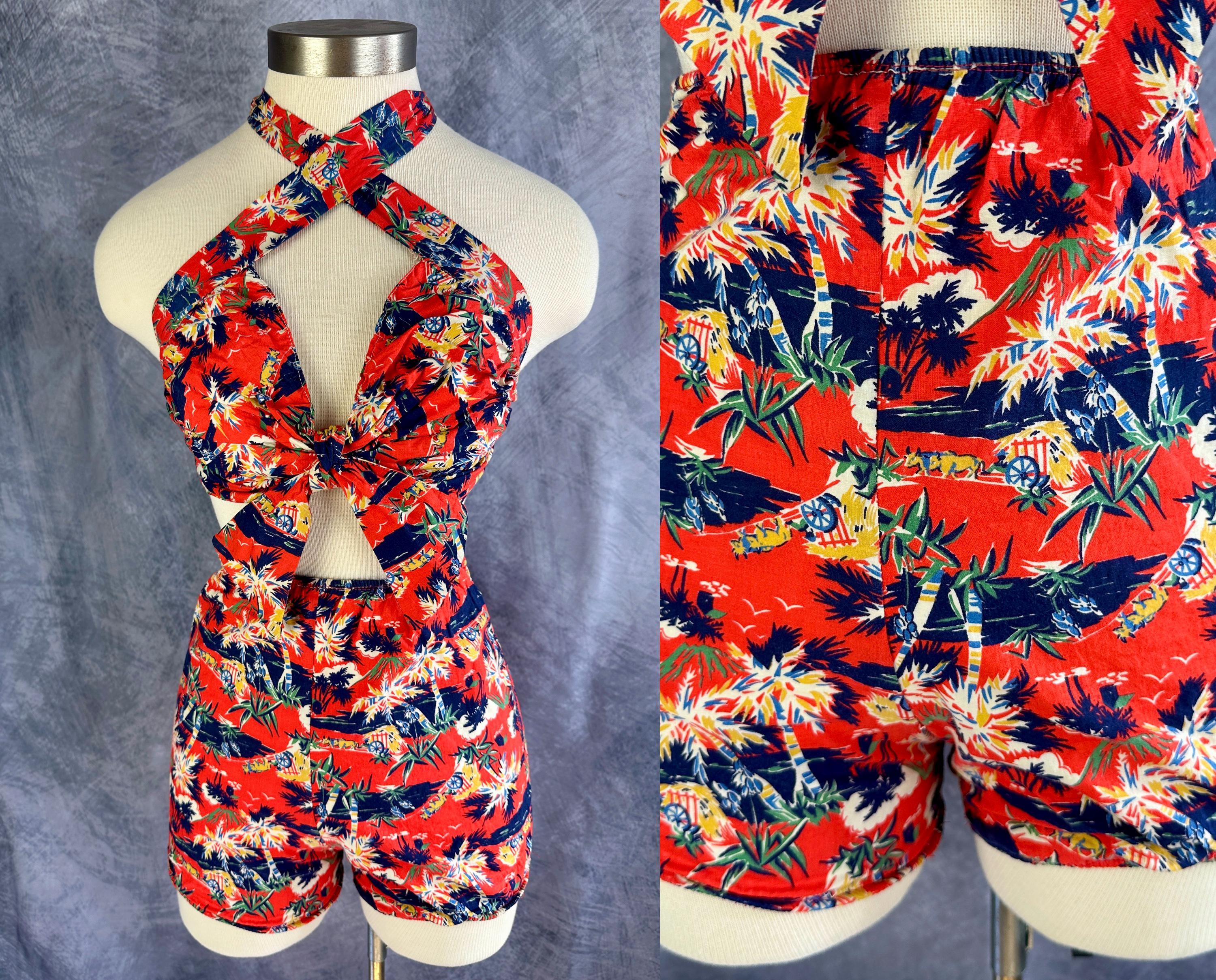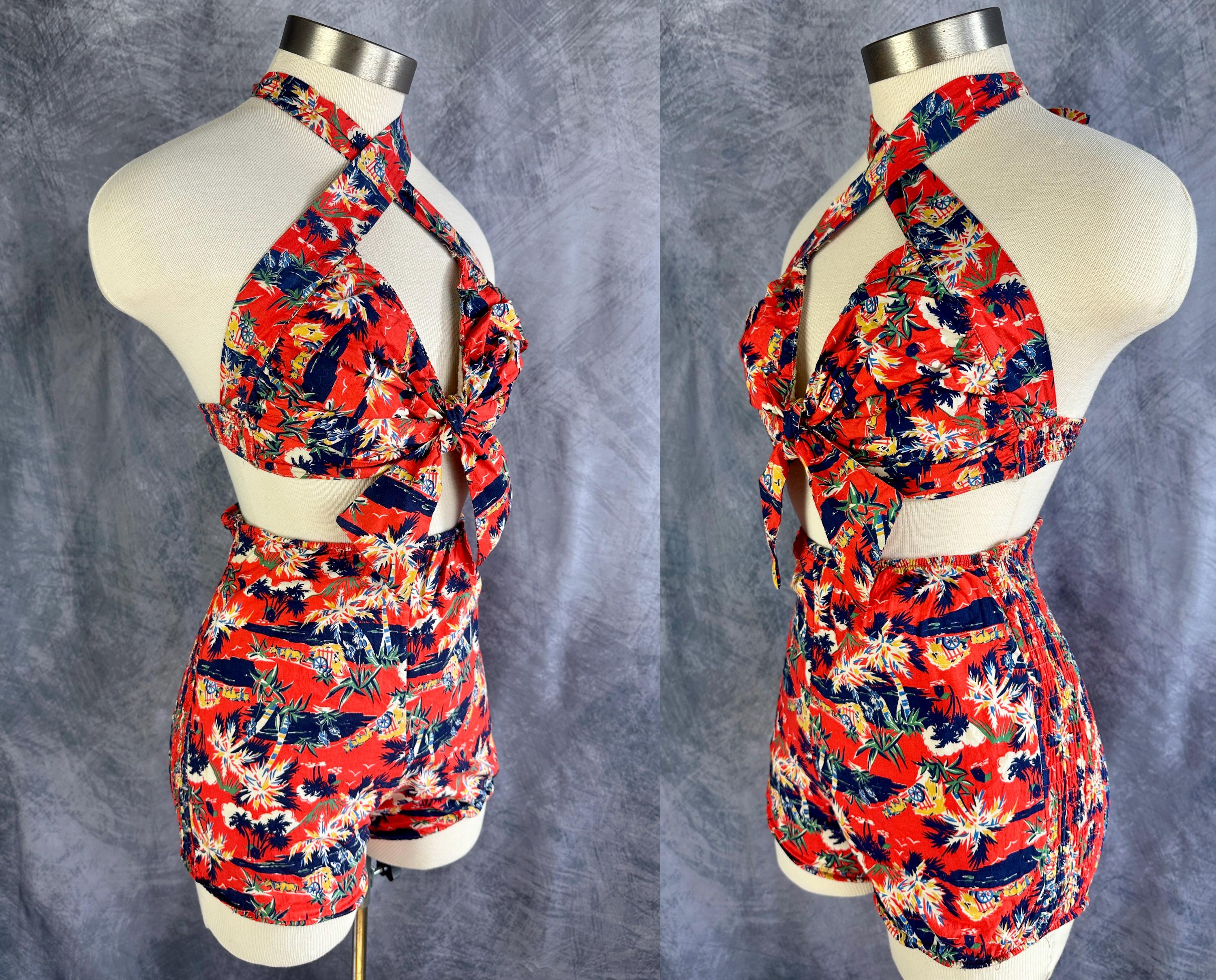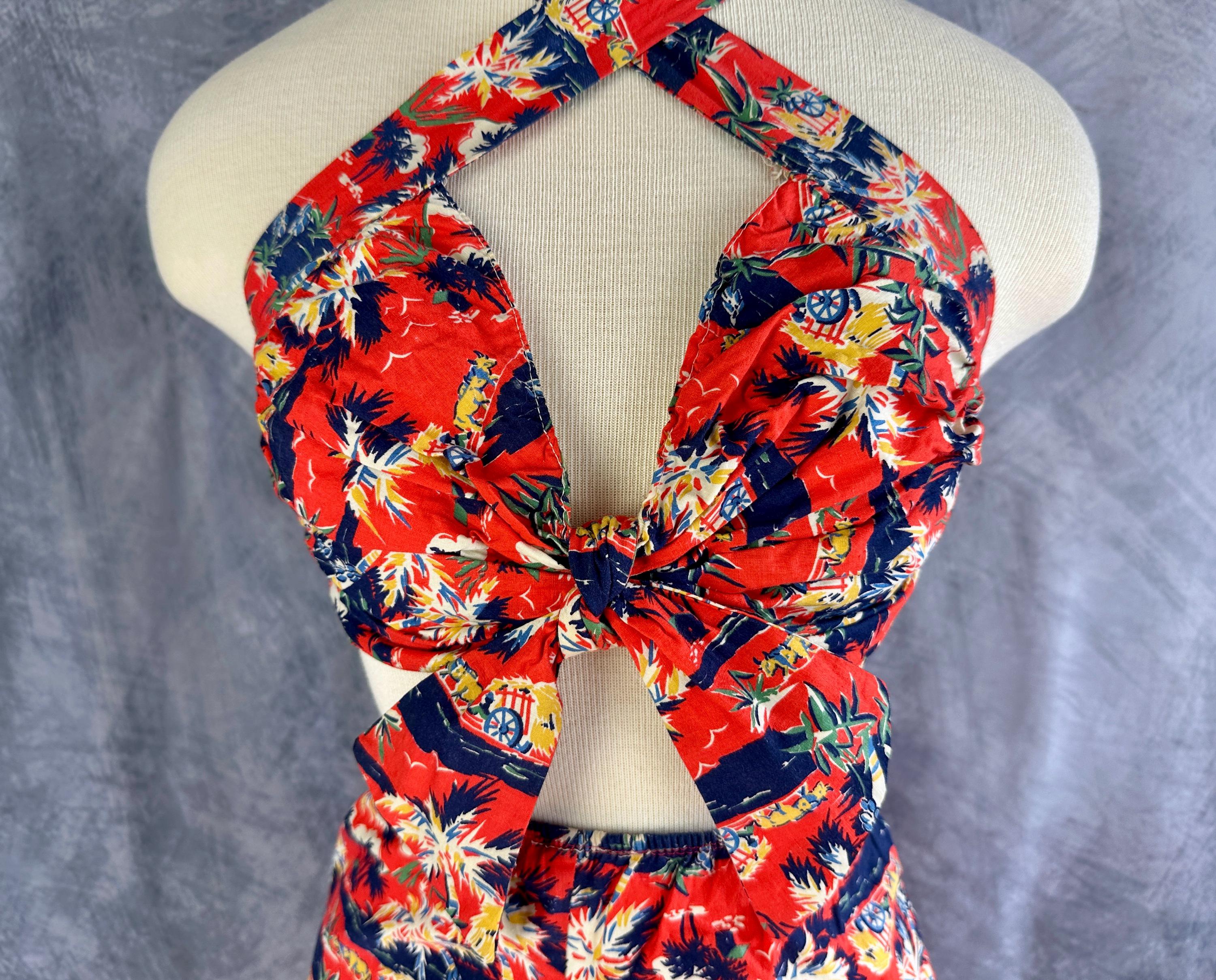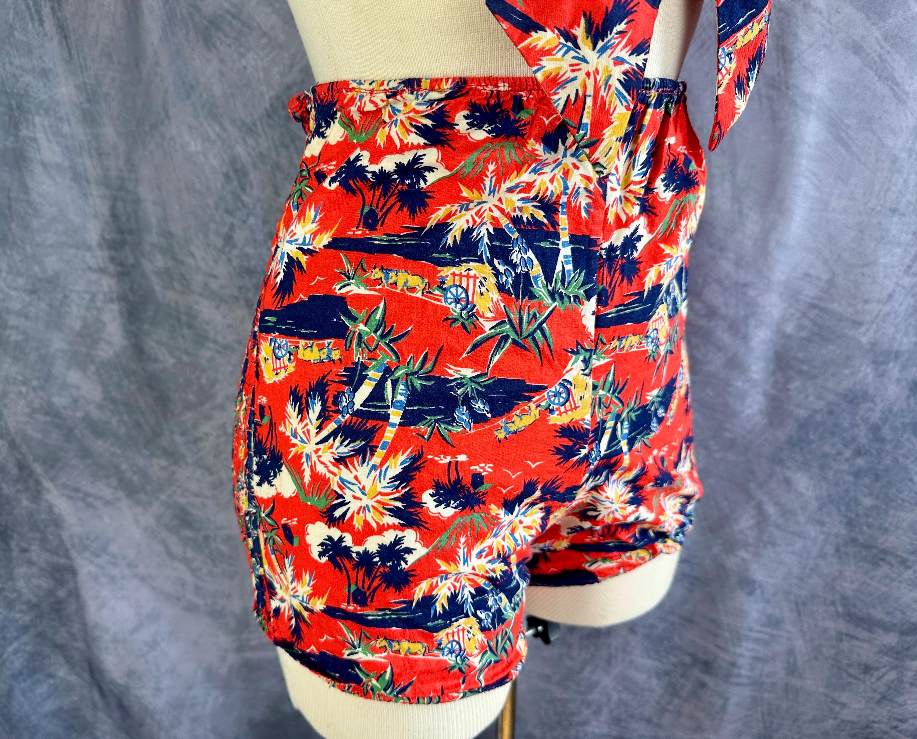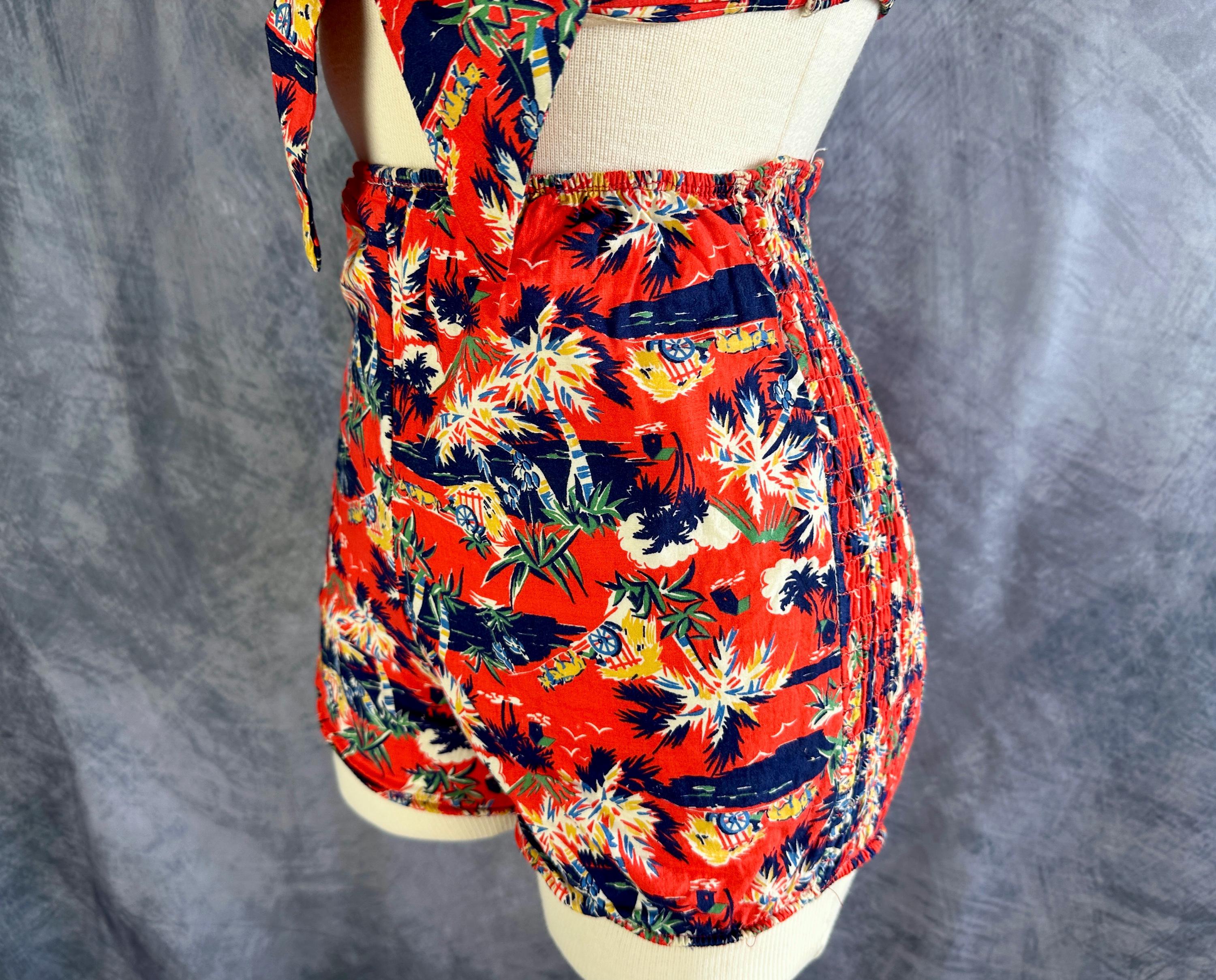 This 1940s "Malibu" bikini is just the thing to cause a little mayhem at the beach! Tagged "The beach of the stars and styled in Hollywood", it won't matter where you choose to take a dip because the tropical print is sure to send you to paradise. Made of cotton in hues of tomato red, navy blue, yellow ochre, white, and cedar green, it features palm trees, oxen pulled carts, and birds in the clouds. The top has halter ties with the option of criss crossing in the front or a standard sweetheart front, gathered cups with center knot, and shirred elastic straps that fasten with two applejuice bakelite buttons. The bottoms have an ultra high waist and are cut similar to hot pants/boy shorts. The back is fully elastic with shirring for a perfect and comfortable fit. This set is in great vintage condition, with still lots of elasticity. No holes, stains, or odors to note.