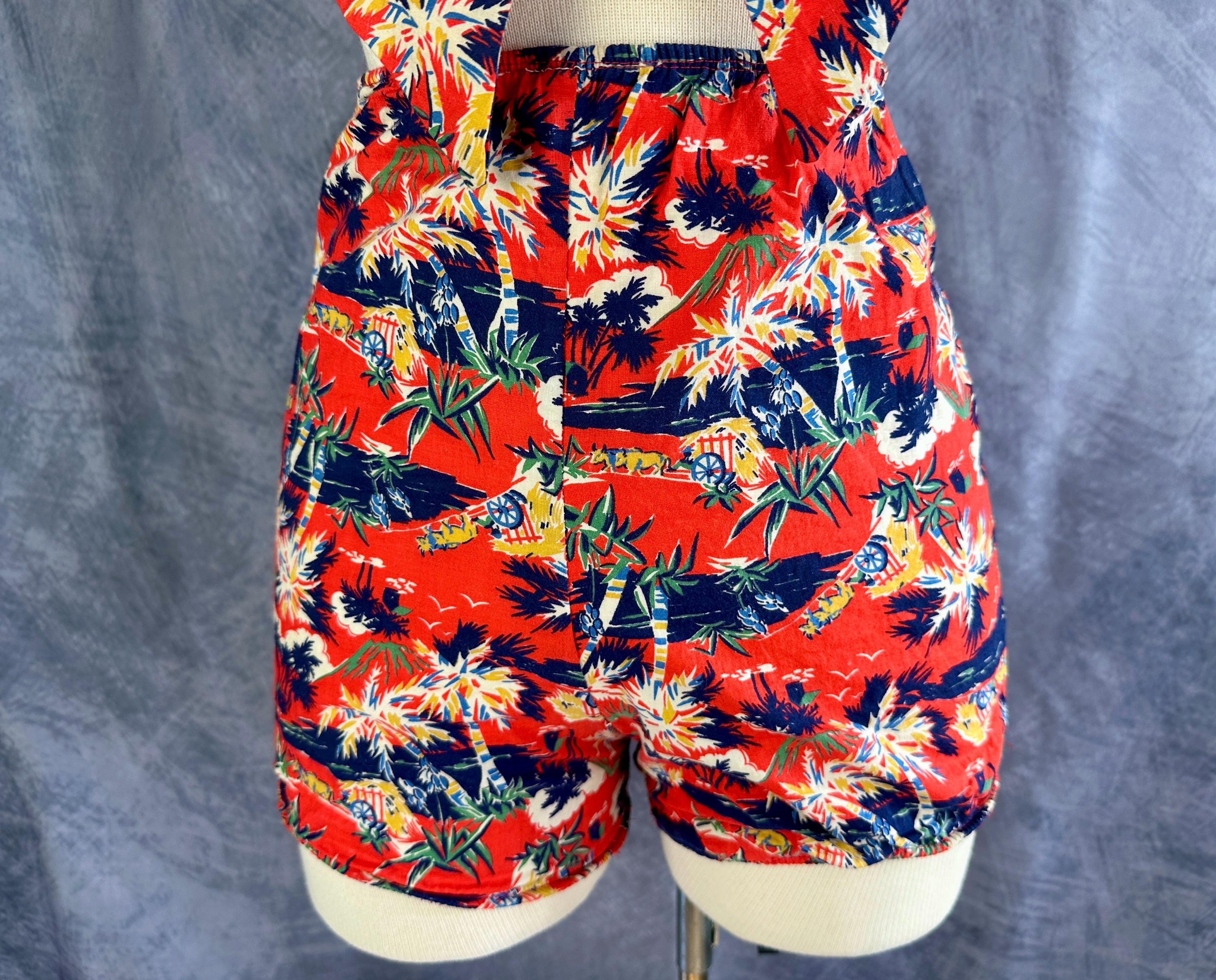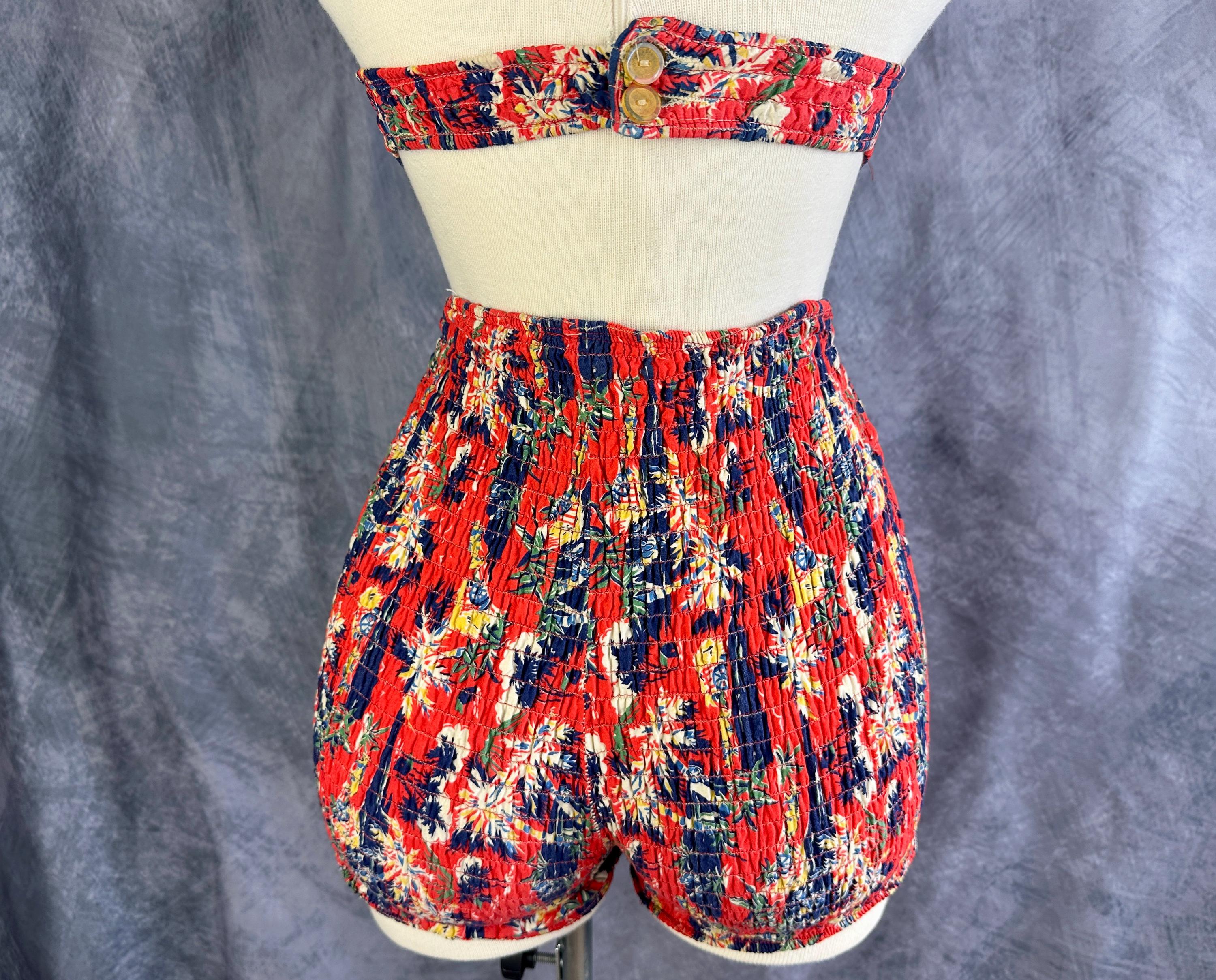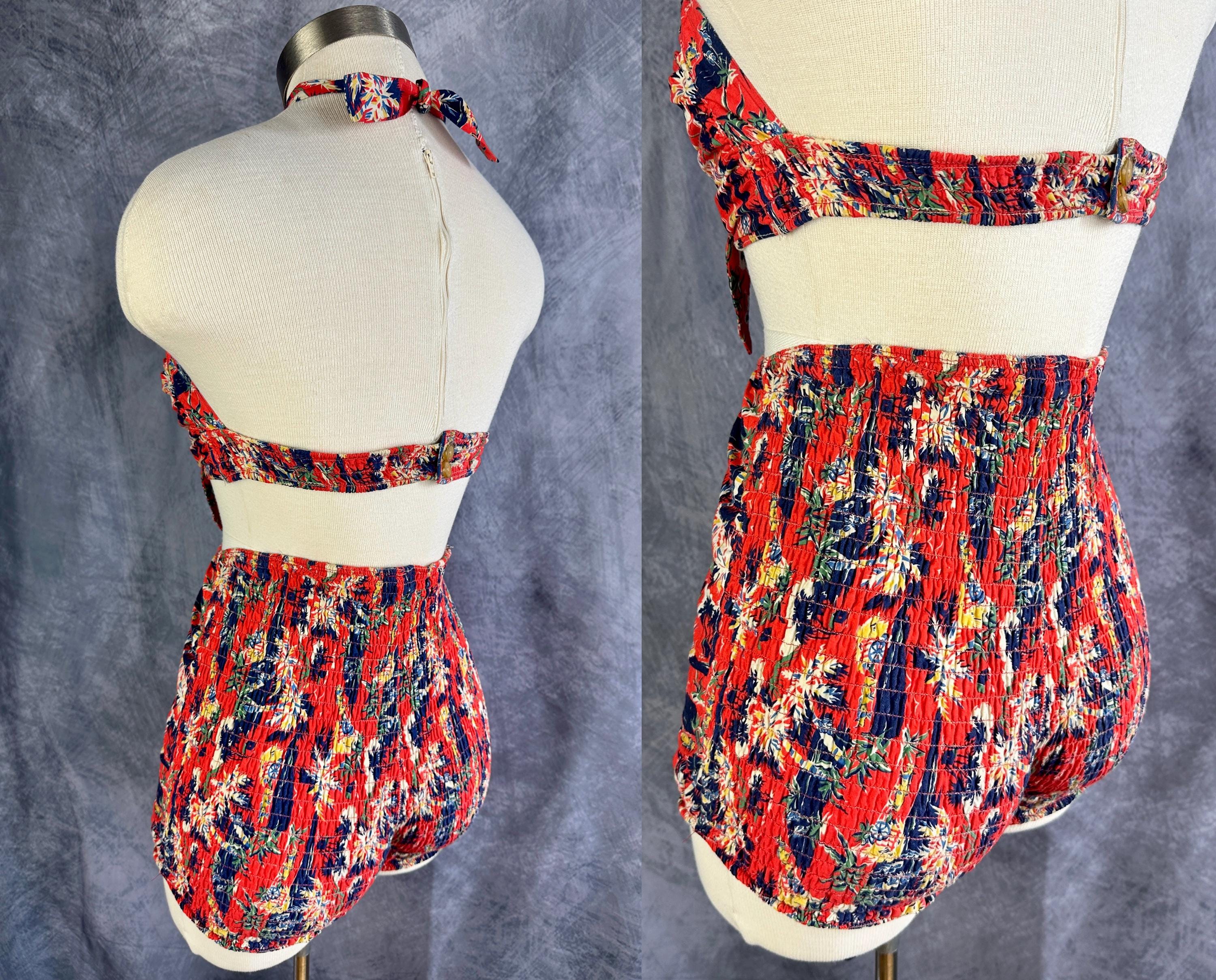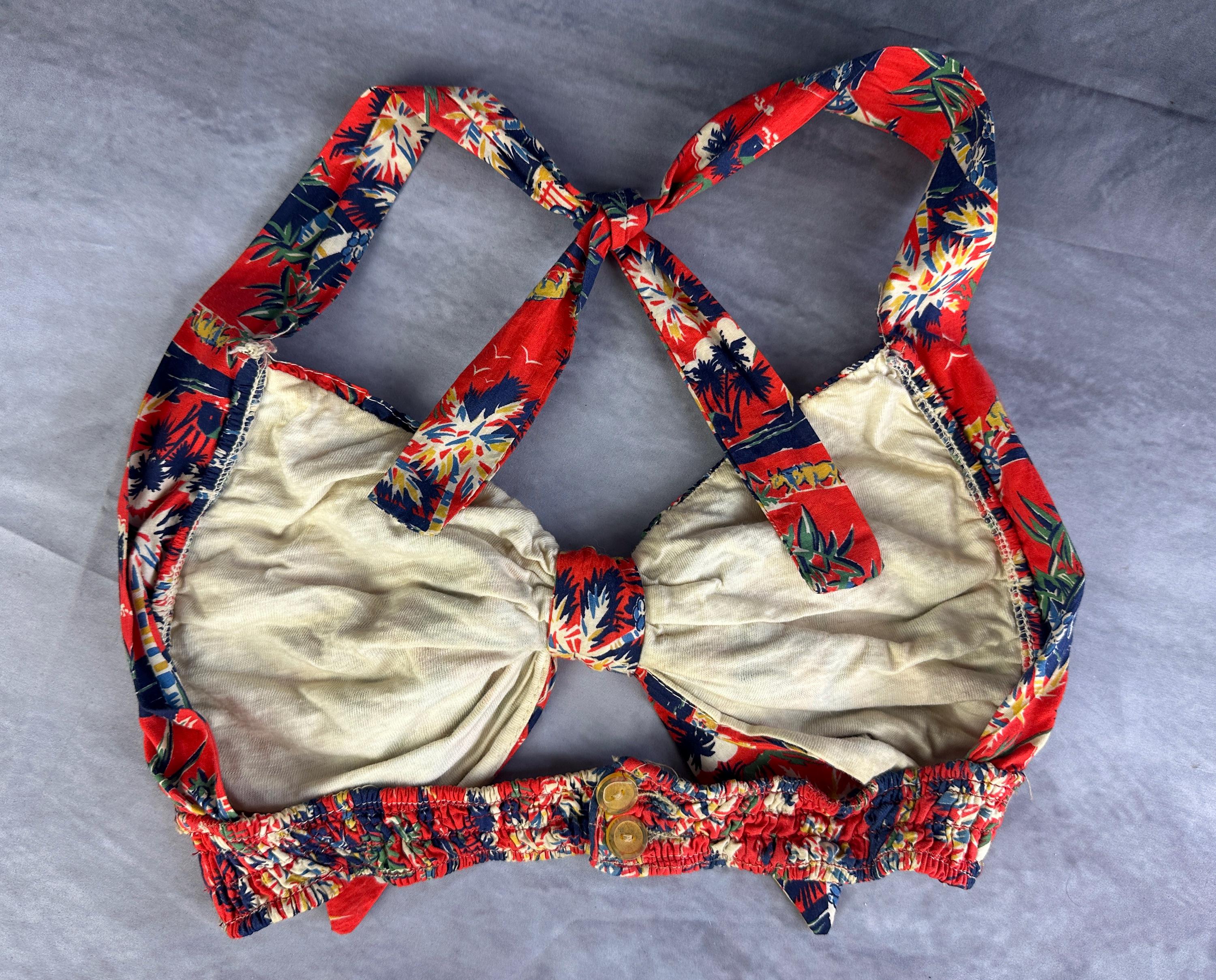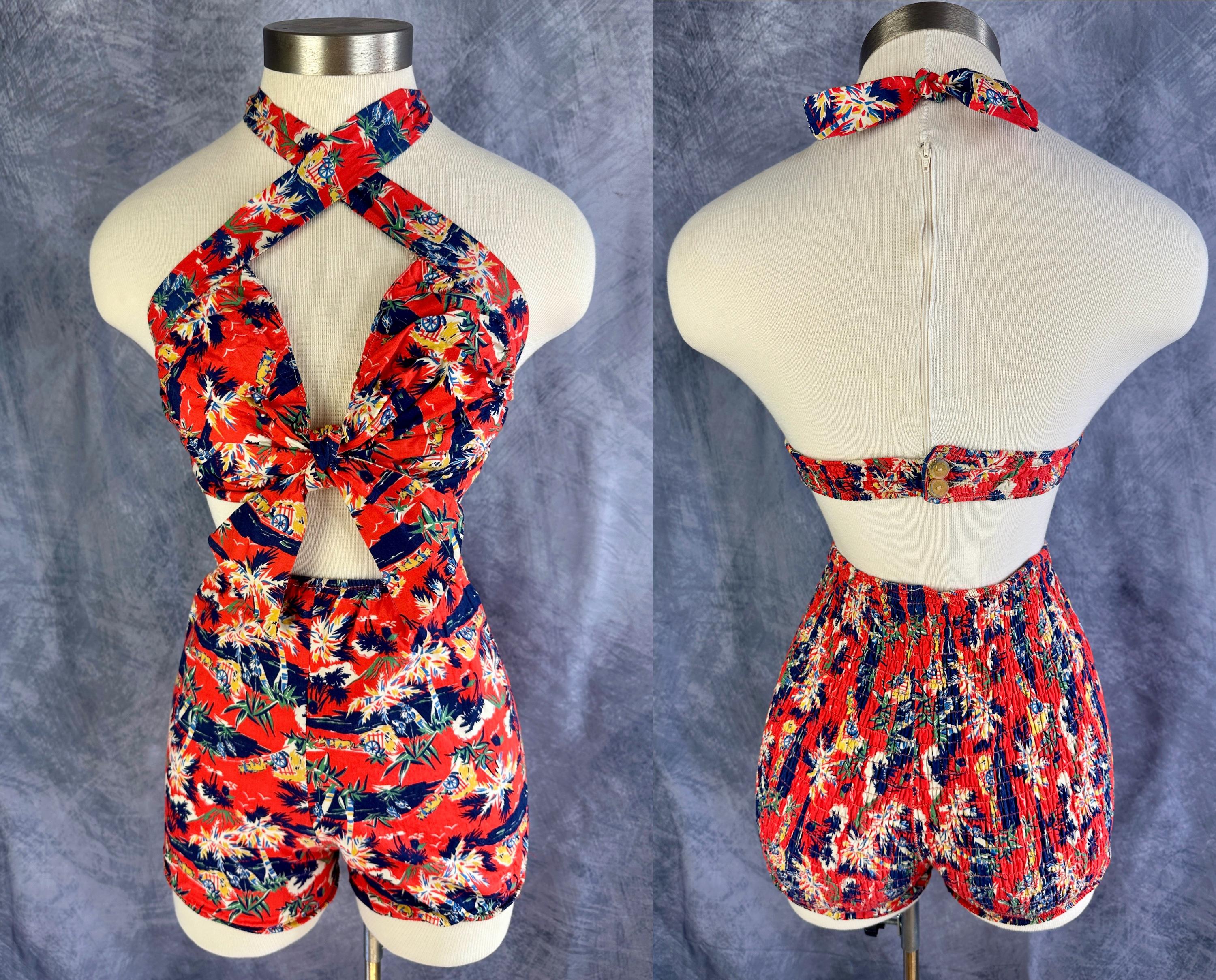 This 1940s "Malibu" bikini is just the thing to cause a little mayhem at the beach! Tagged "The beach of the stars and styled in Hollywood", it won't matter where you choose to take a dip because the tropical print is sure to send you to paradise. Made of cotton in hues of tomato red, navy blue, yellow ochre, white, and cedar green, it features palm trees, oxen pulled carts, and birds in the clouds. The top has halter ties with the option of criss crossing in the front or a standard sweetheart front, gathered cups with center knot, and shirred elastic straps that fasten with two applejuice bakelite buttons. The bottoms have an ultra high waist and are cut similar to hot pants/boy shorts. The back is fully elastic with shirring for a perfect and comfortable fit. This set is in great vintage condition, with still lots of elasticity. No holes, stains, or odors to note.