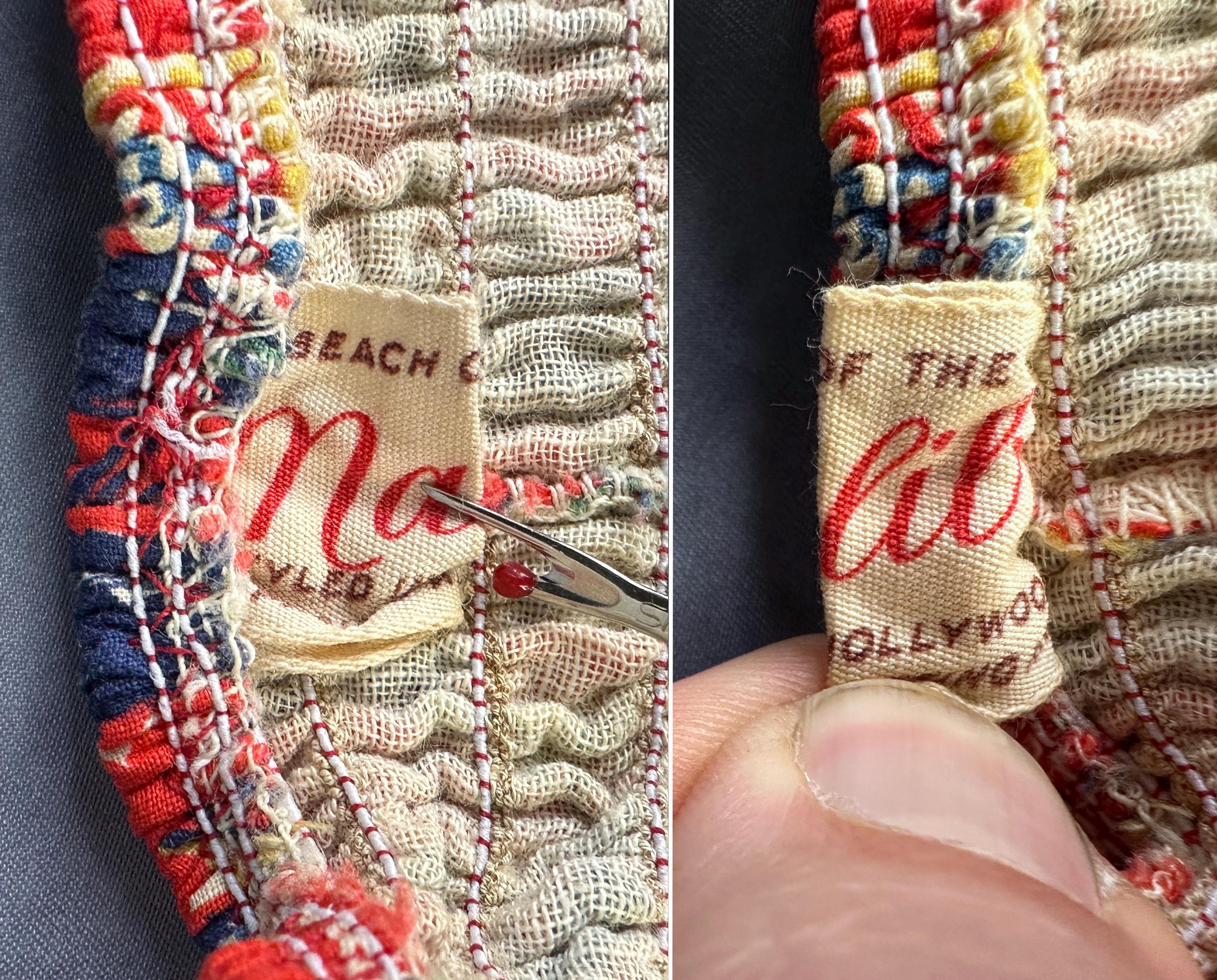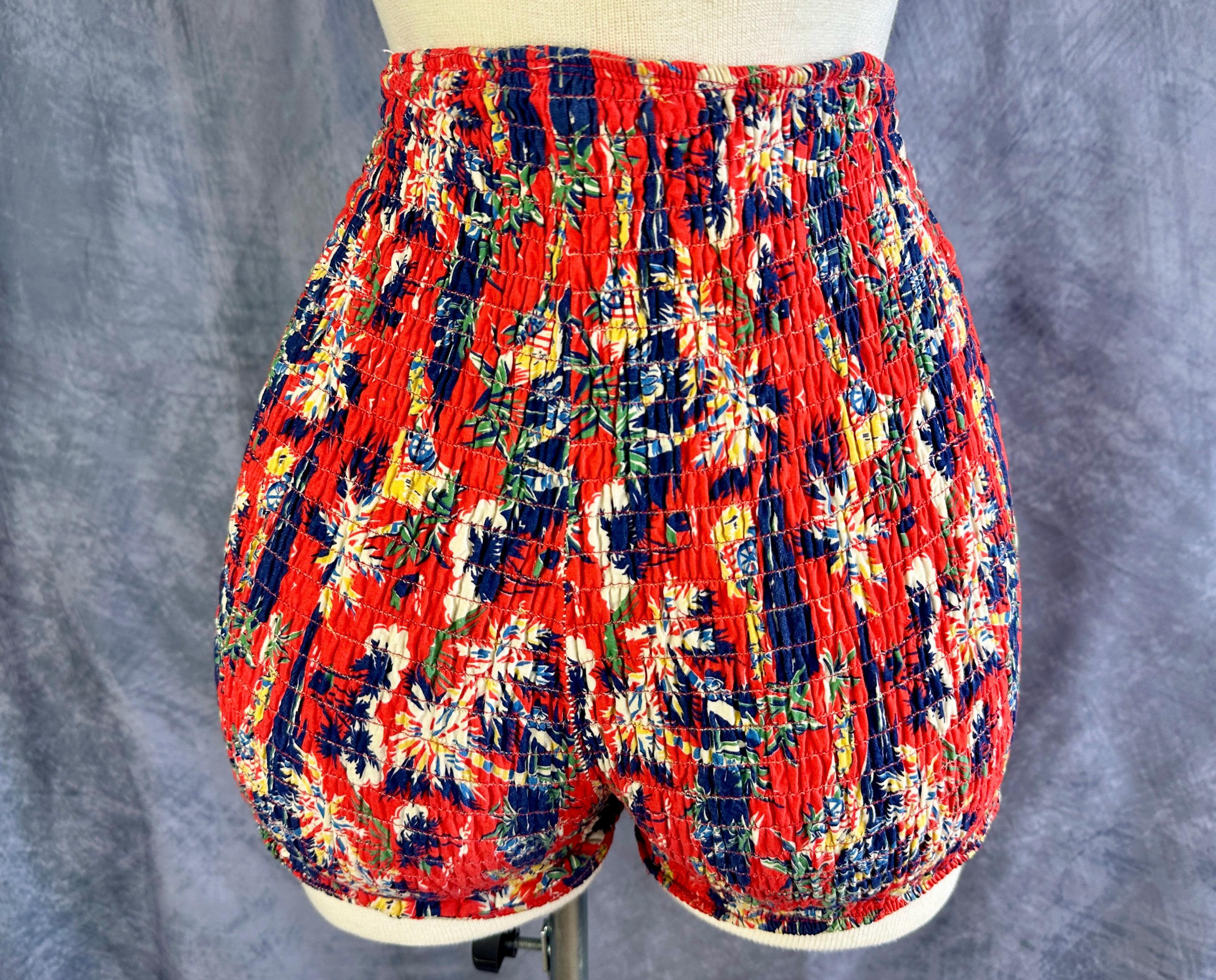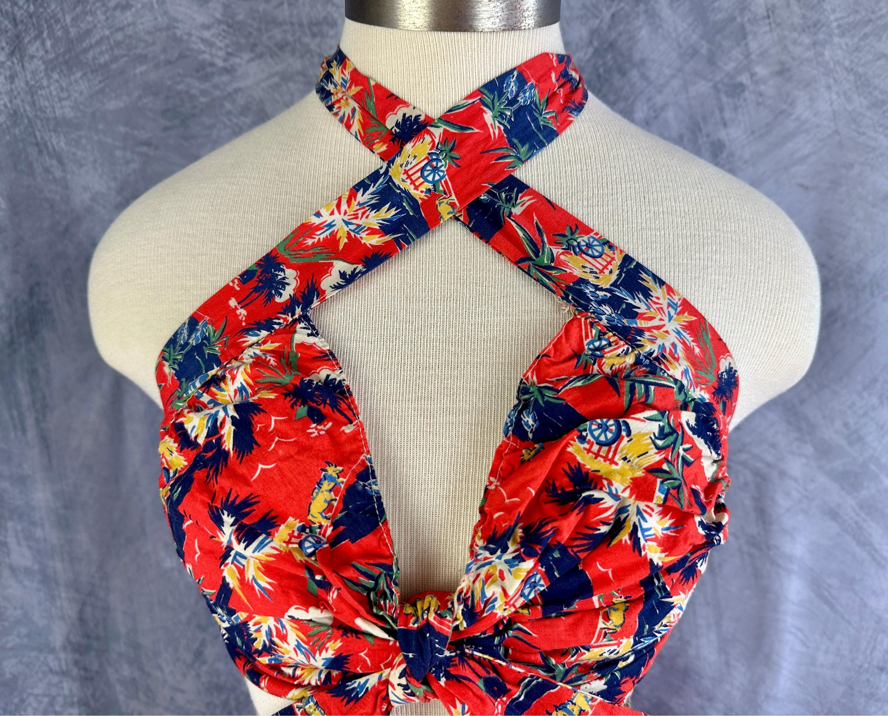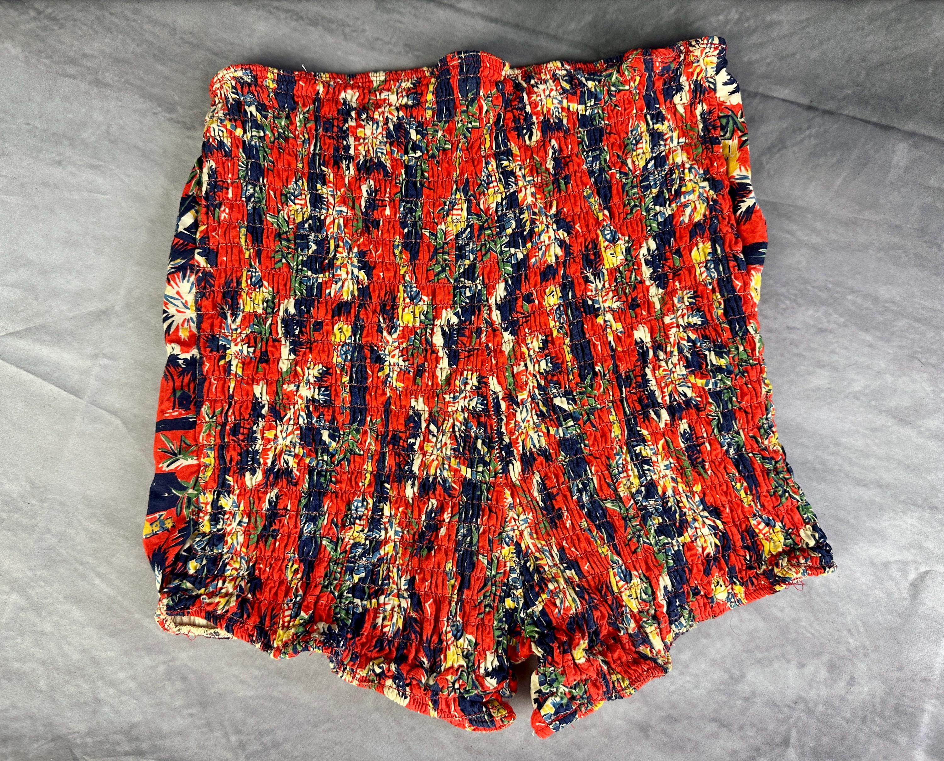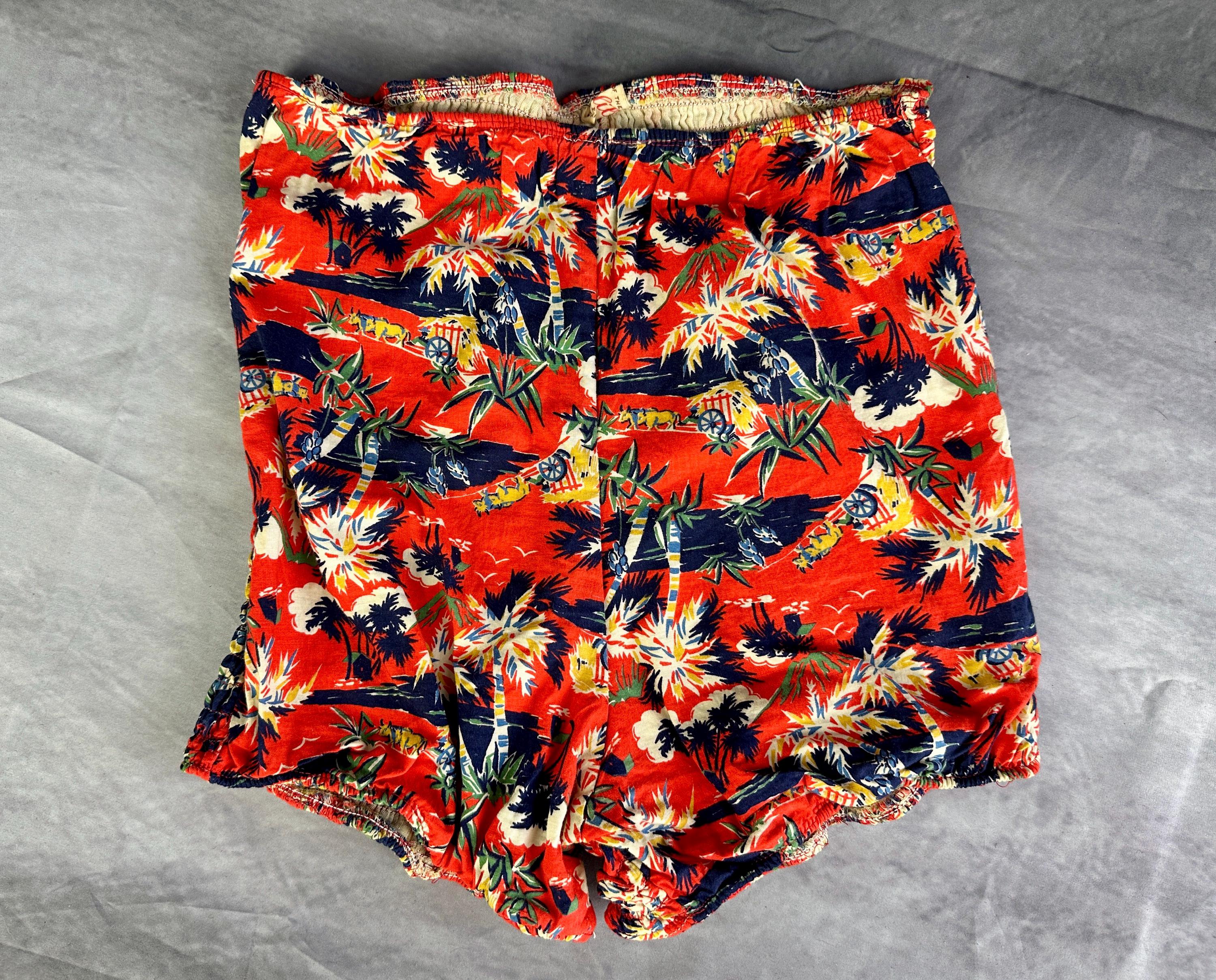 This 1940s "Malibu" bikini is just the thing to cause a little mayhem at the beach! Tagged "The beach of the stars and styled in Hollywood", it won't matter where you choose to take a dip because the tropical print is sure to send you to paradise. Made of cotton in hues of tomato red, navy blue, yellow ochre, white, and cedar green, it features palm trees, oxen pulled carts, and birds in the clouds. The top has halter ties with the option of criss crossing in the front or a standard sweetheart front, gathered cups with center knot, and shirred elastic straps that fasten with two applejuice bakelite buttons. The bottoms have an ultra high waist and are cut similar to hot pants/boy shorts. The back is fully elastic with shirring for a perfect and comfortable fit. This set is in great vintage condition, with still lots of elasticity. No holes, stains, or odors to note.