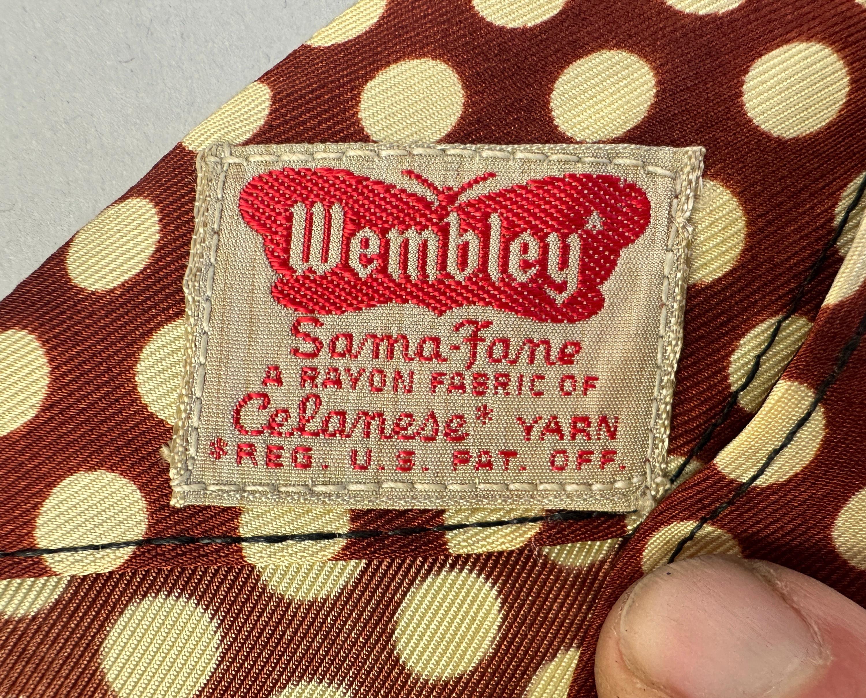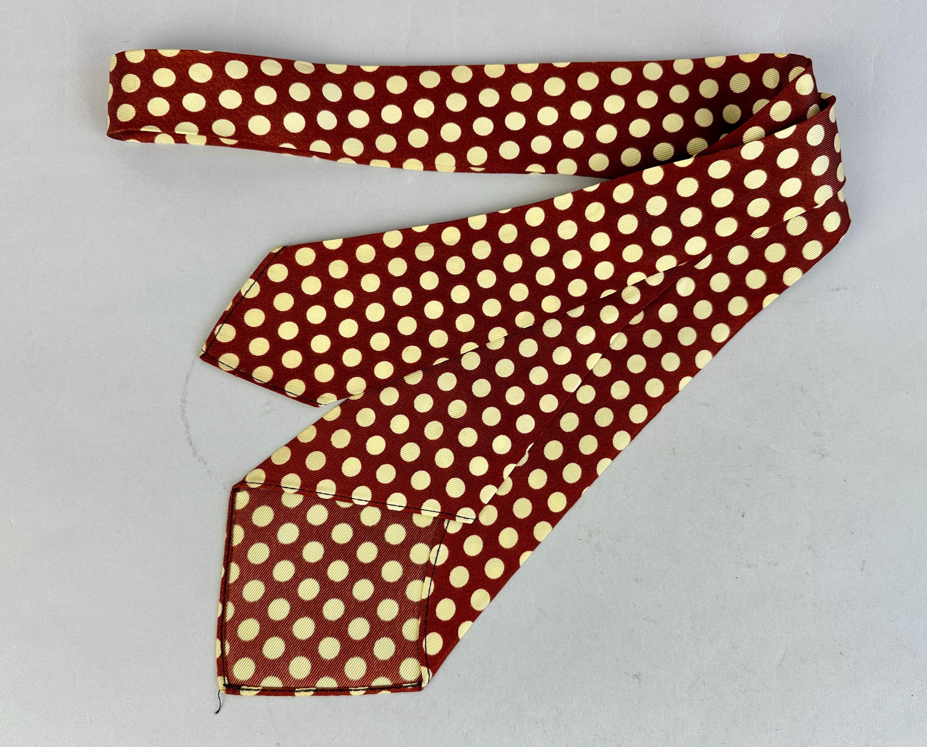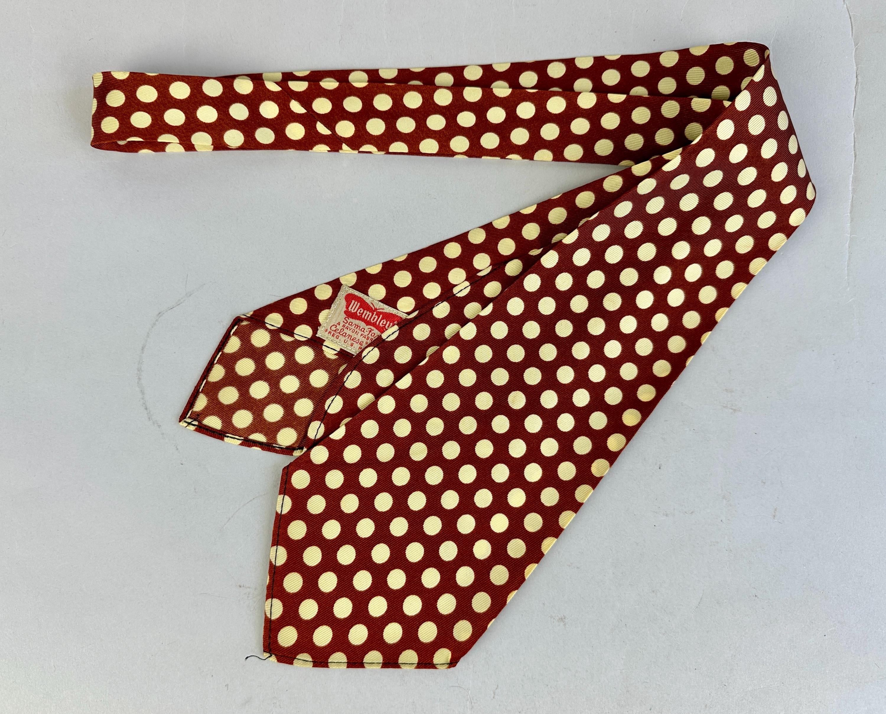 This spiffy 1930s tie will have your ensemble on the spot! Made of rayon celanese in copper and topped with large ivory polkadots. Unlined and labeled "Wembley". Pairs well with a wide variety of Art Deco and Mid-Century suit colors and fabric types. This tie is in great vintage condition with no flaws found!