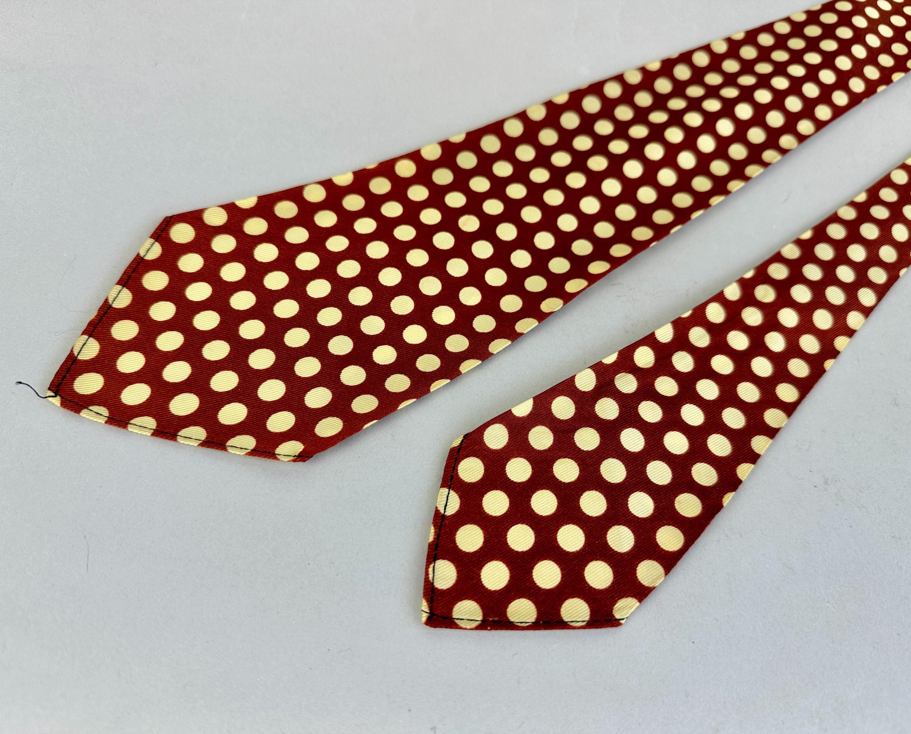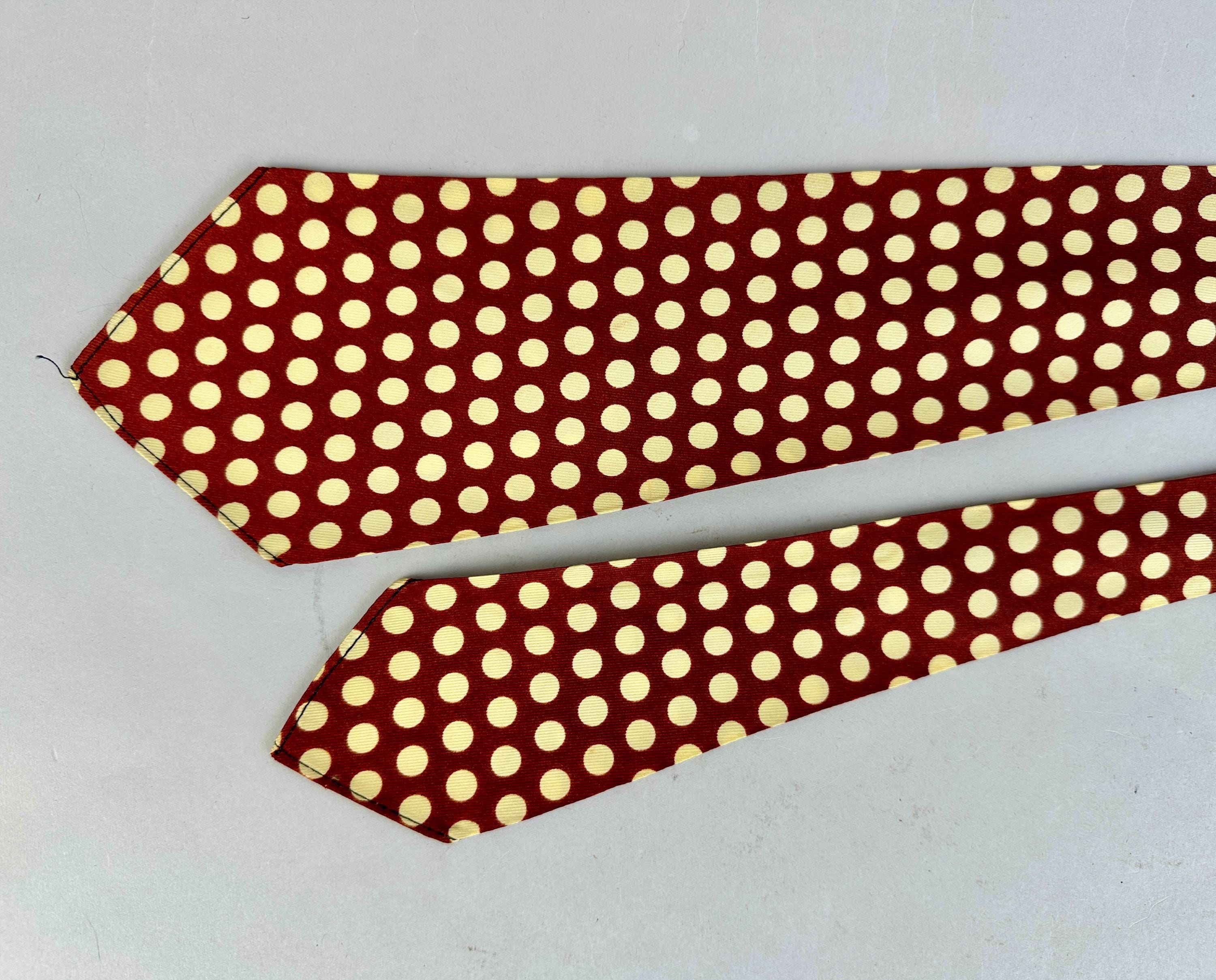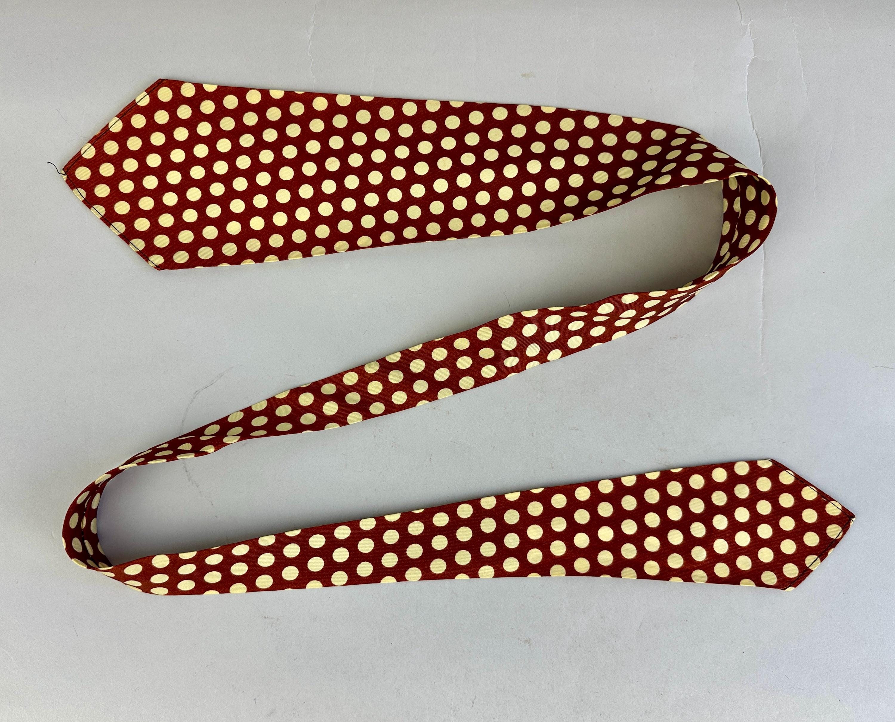 This spiffy 1930s tie will have your ensemble on the spot! Made of rayon celanese in copper and topped with large ivory polkadots. Unlined and labeled "Wembley". Pairs well with a wide variety of Art Deco and Mid-Century suit colors and fabric types. This tie is in great vintage condition with no flaws found!