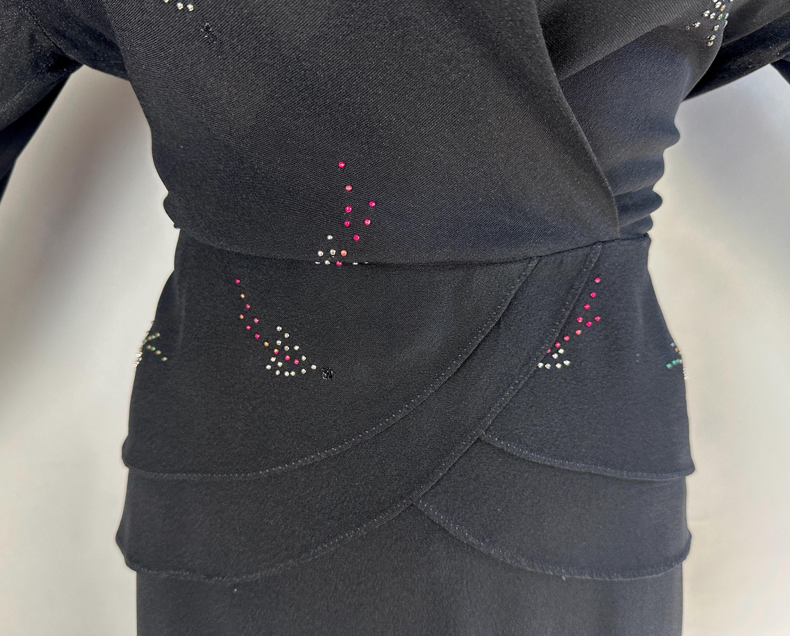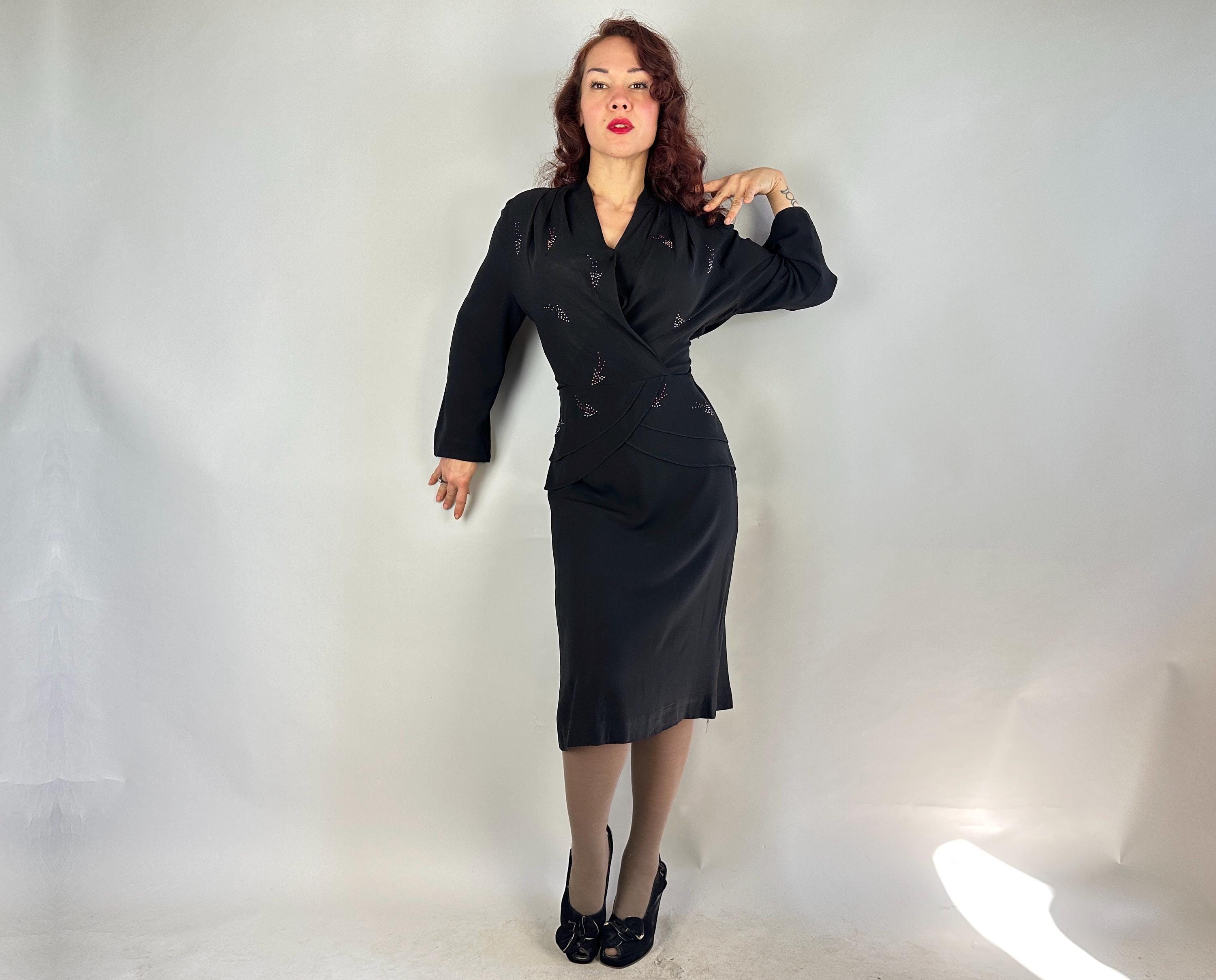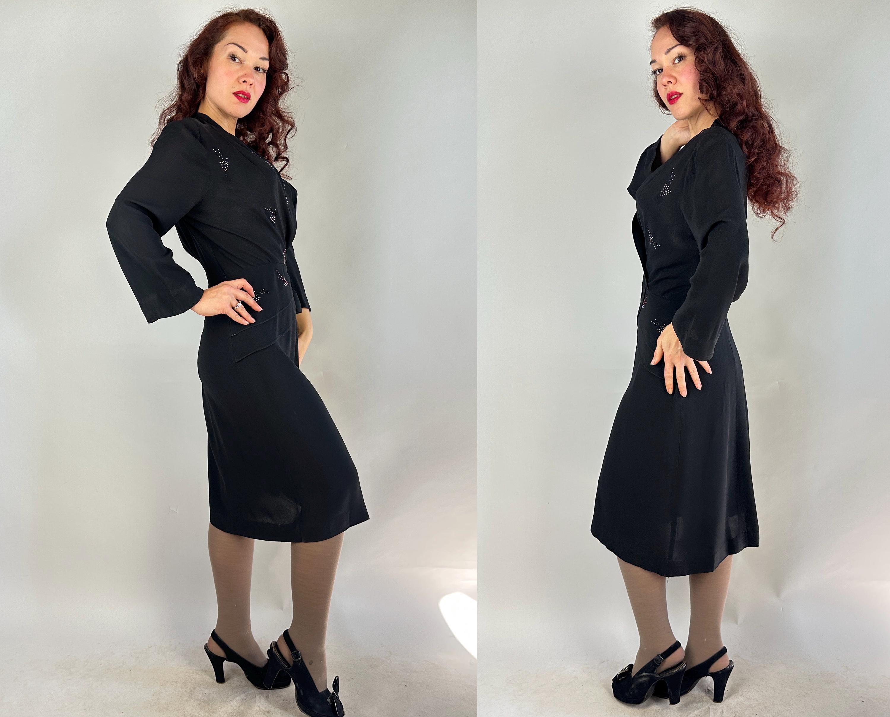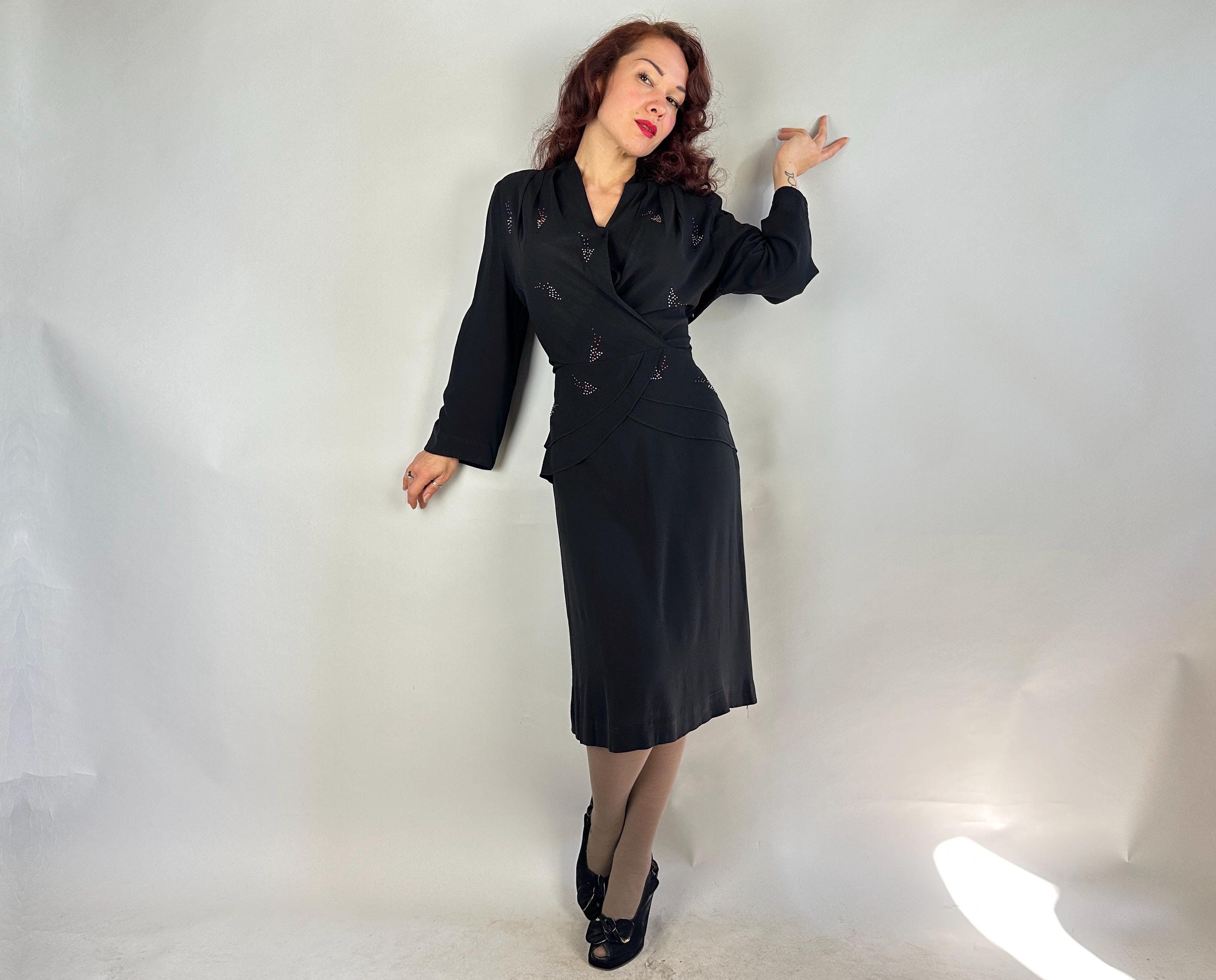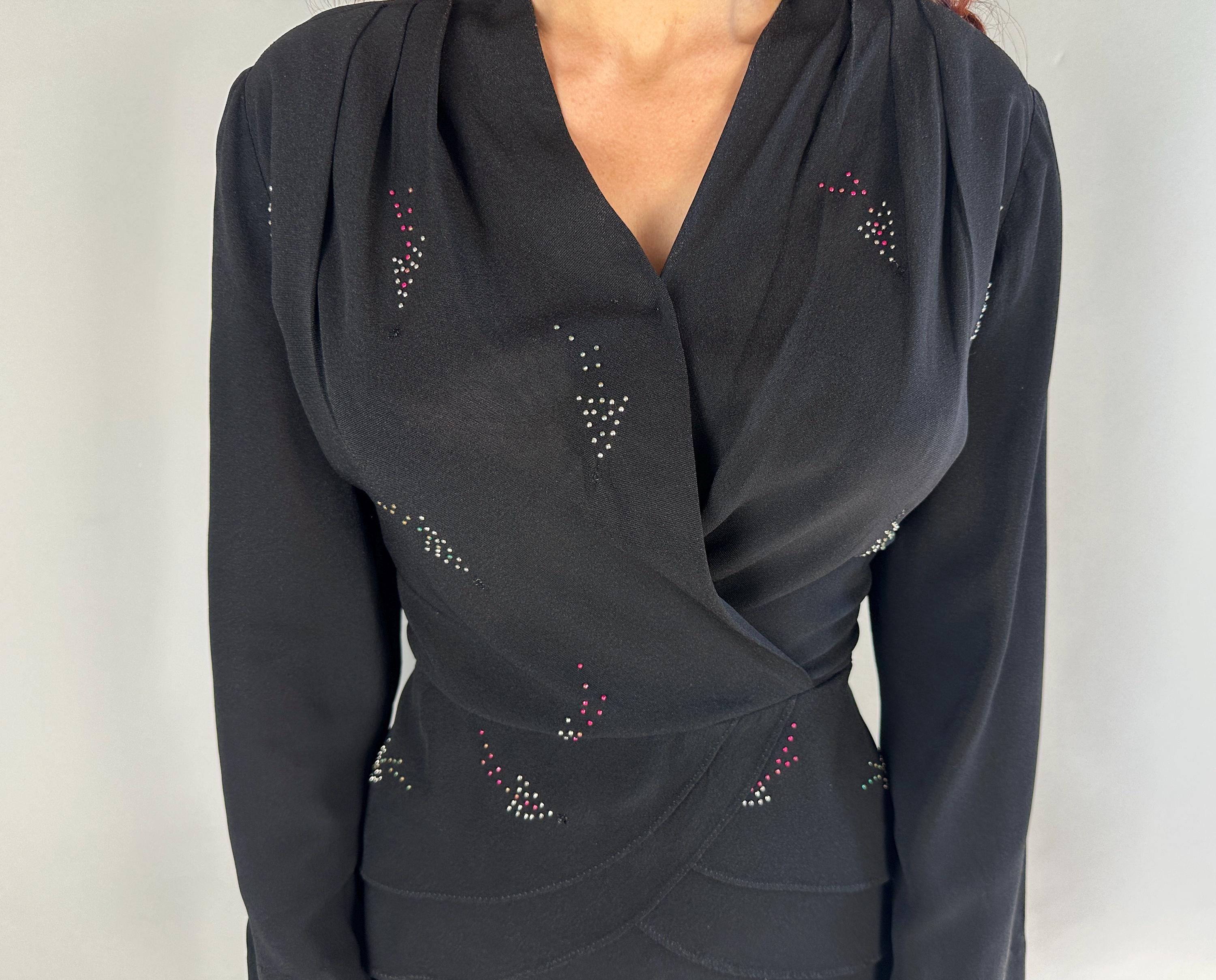 Get right to the point and show everyone the right direction when you wear this 1940s dress! Black rayon crepe has faux wrap styling with pleats extending from the shoulders making lovely drape around the deep neckline. A double layered peplum makes a tulip shape and bell cuff sleeves are an elegant touch. Adorned with studs of silver, brass, and hot pink, they make curving arrows for a unique L.B.D.! Metal zipper on the side. This dress is in great vintage condition, with pinholes that have been mended but are minutely visible. No holes, stains, odors to note. Dress has been pinned on model to show fit.
