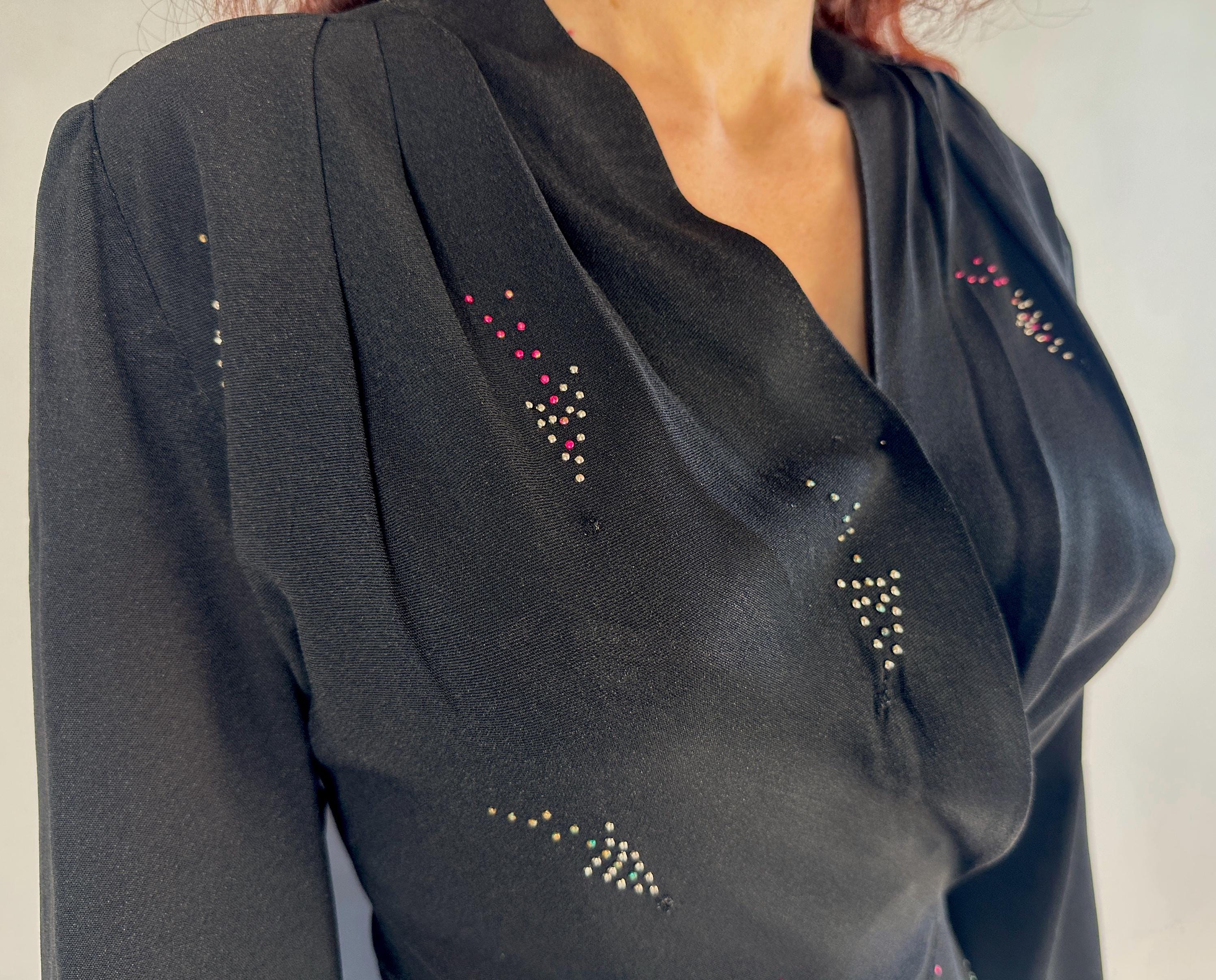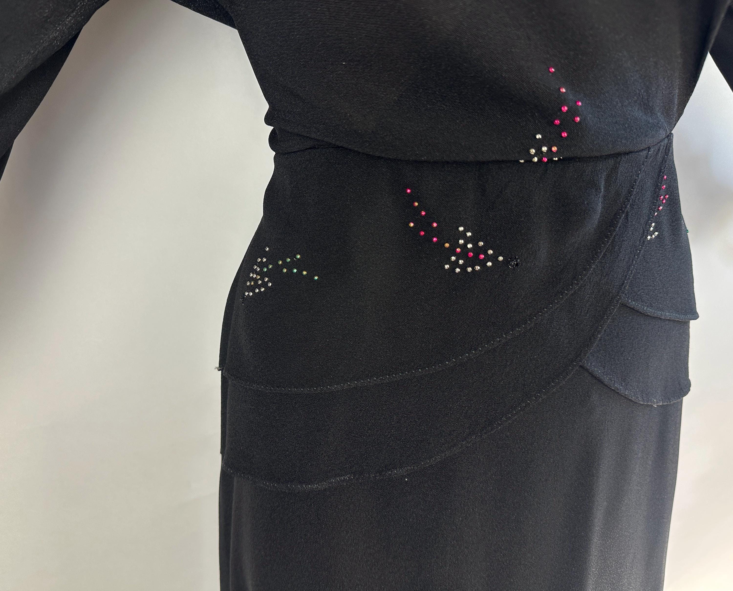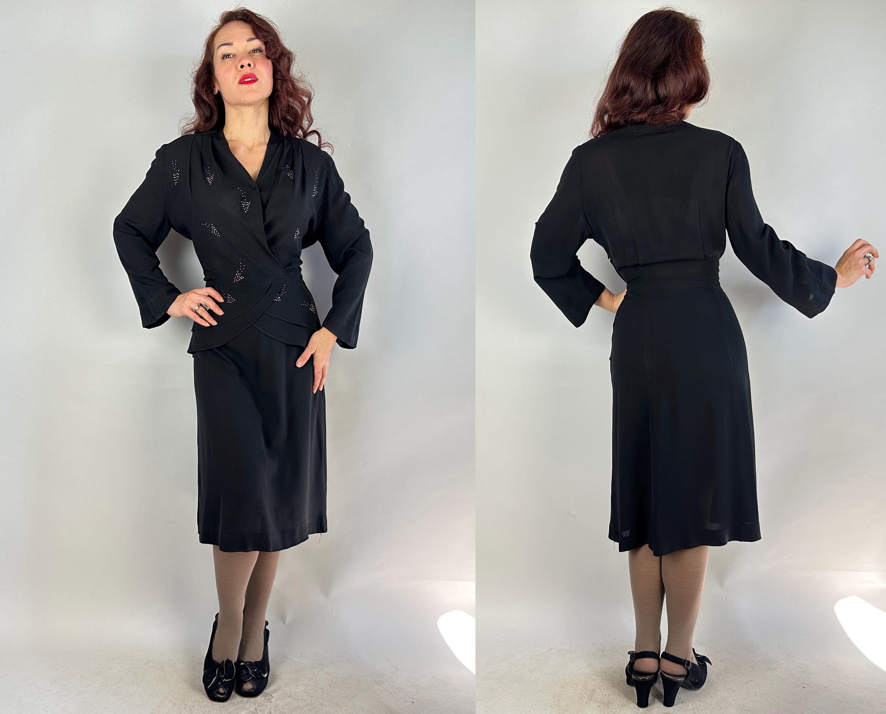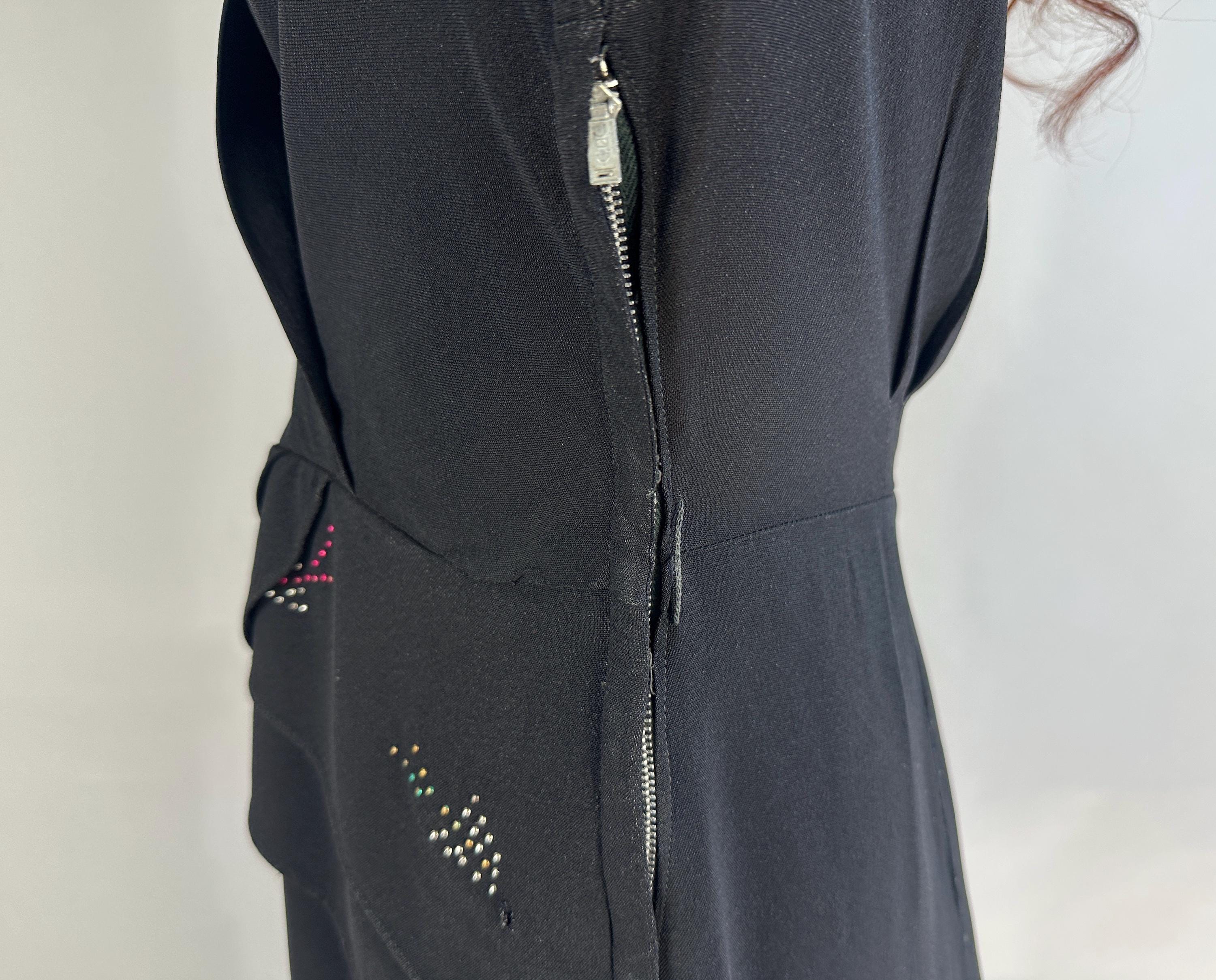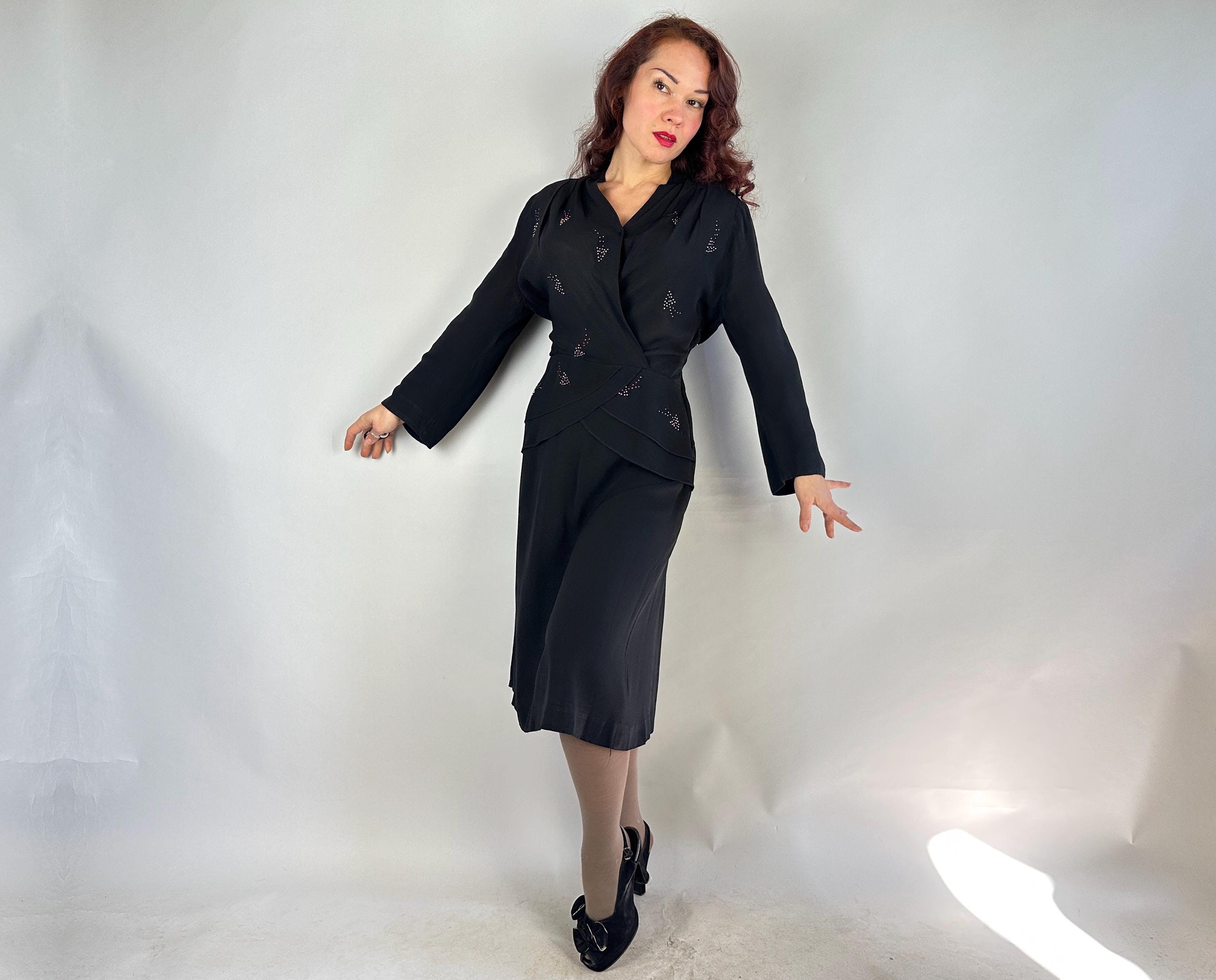Get right to the point and show everyone the right direction when you wear this 1940s dress! Black rayon crepe has faux wrap styling with pleats extending from the shoulders making lovely drape around the deep neckline. A double layered peplum makes a tulip shape and bell cuff sleeves are an elegant touch. Adorned with studs of silver, brass, and hot pink, they make curving arrows for a unique L.B.D.! Metal zipper on the side. This dress is in great vintage condition, with pinholes that have been mended but are minutely visible. No holes, stains, odors to note. Dress has been pinned on model to show fit.