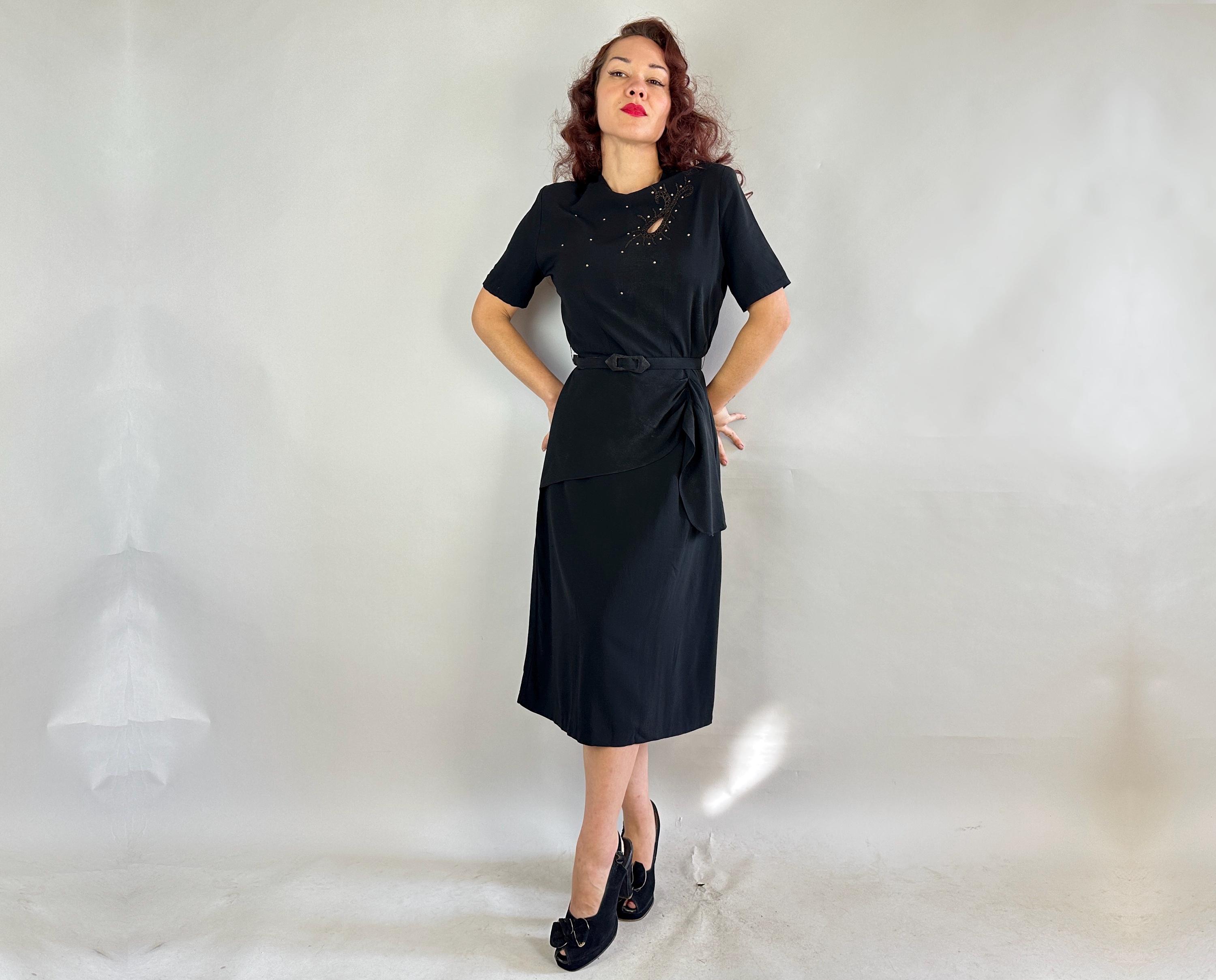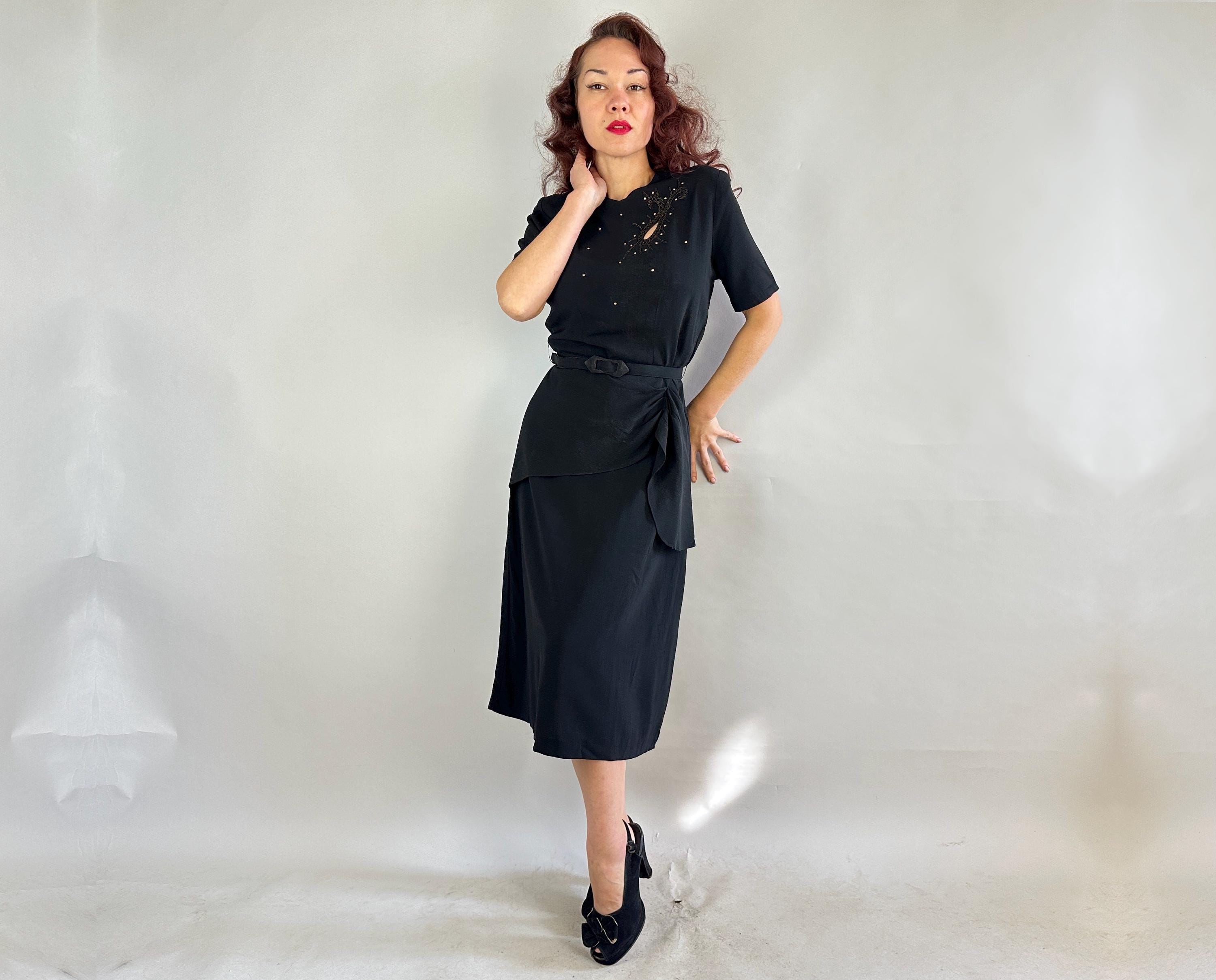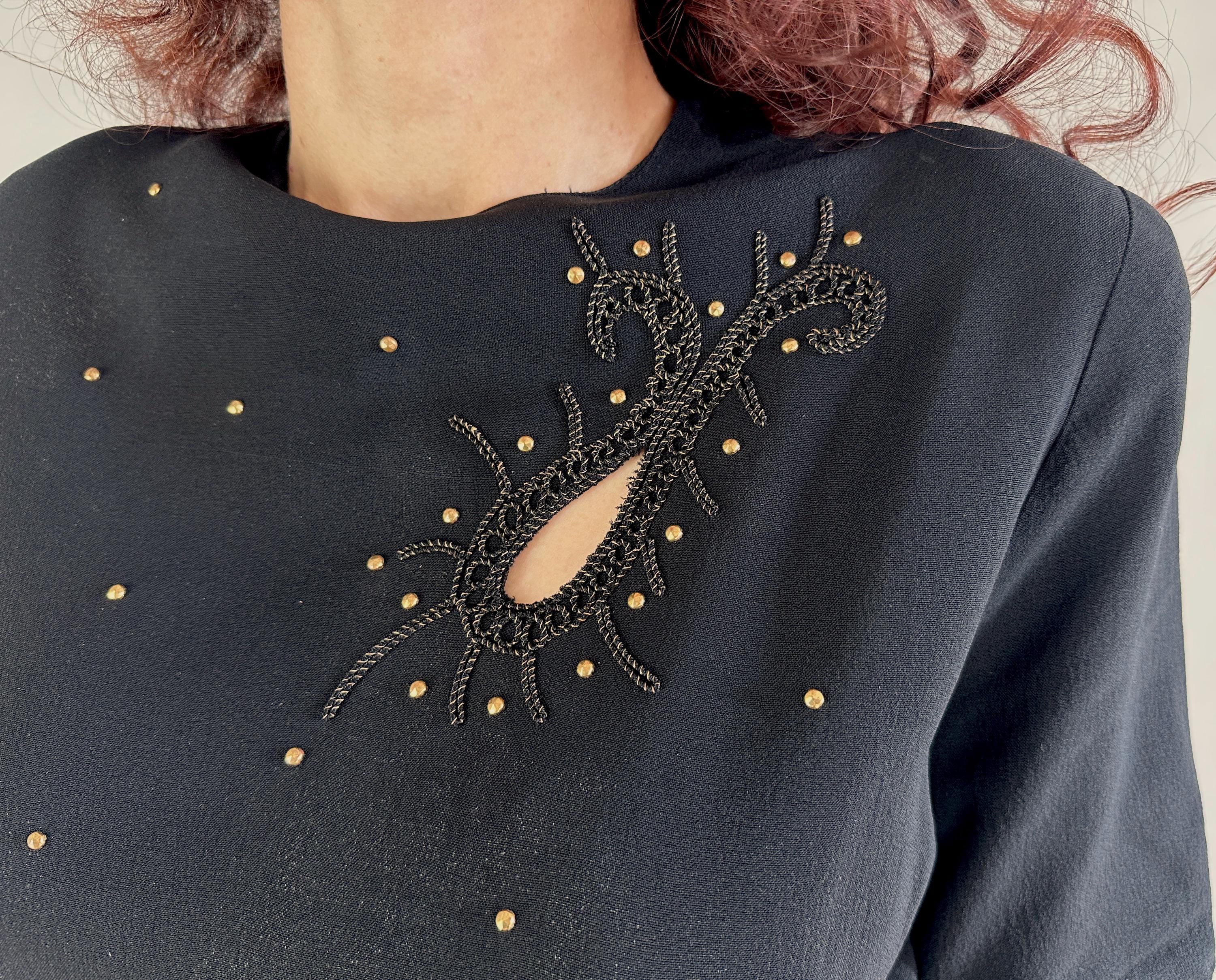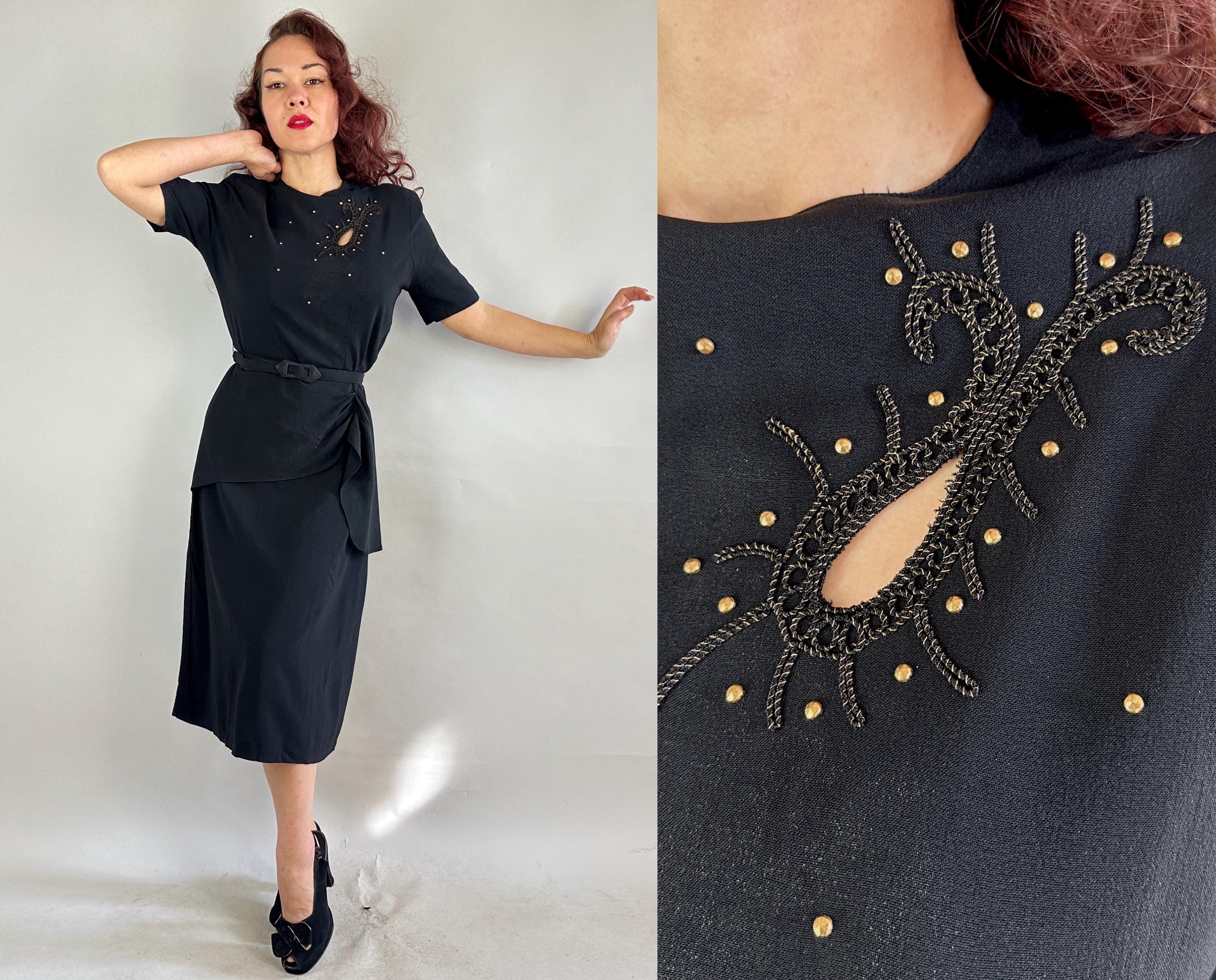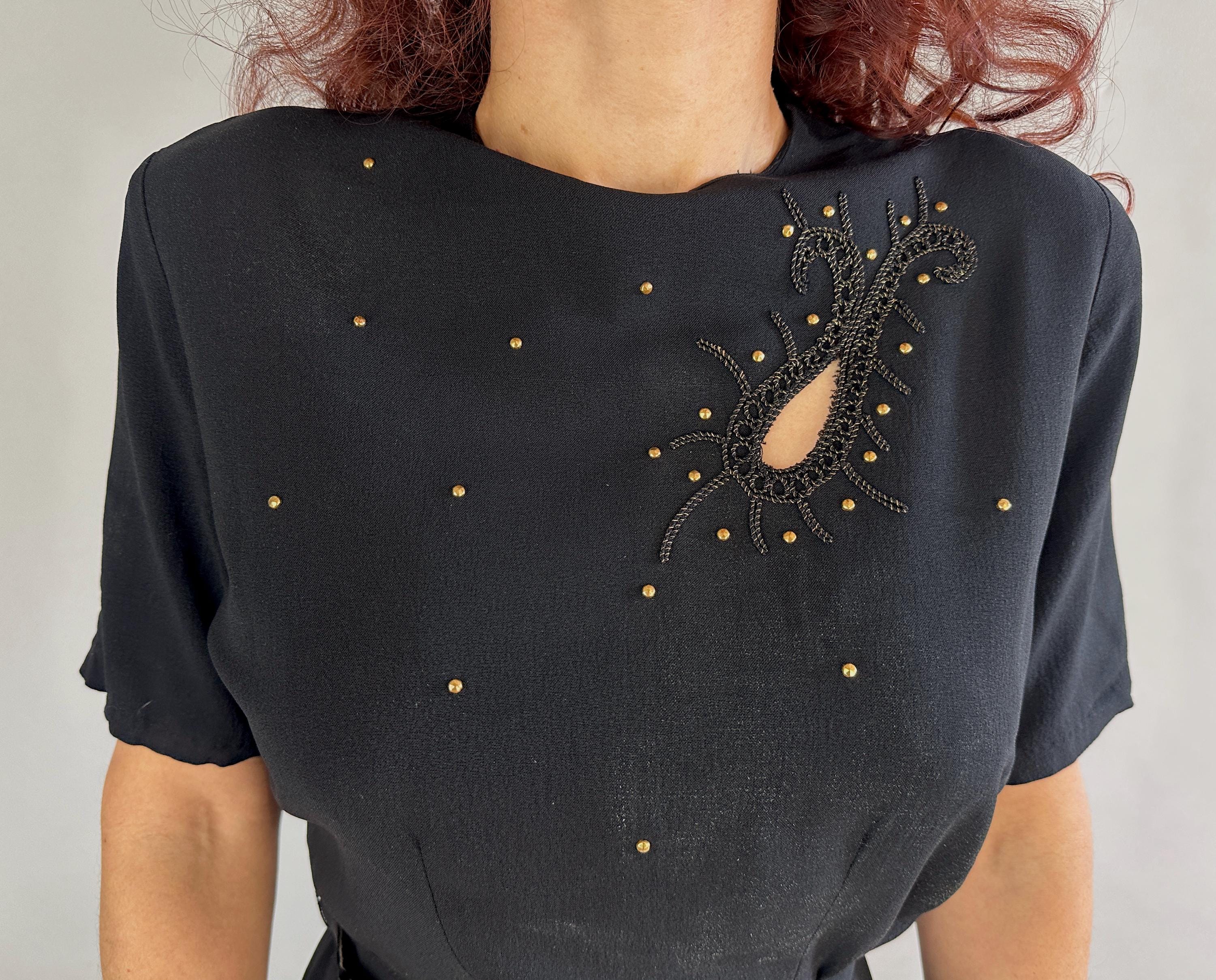 Beguile everyone around you with your star like sparkle in this 1940s dress! Made of black rayon crepe, the bodice is adorned with gold metal studs scattered like the night sky and a teardrop cutout is highlighted by gold wrapped black cord soutache in loops and tendrils. The shoulders are lightly padded and an asymmetric peplum ends on the left hip with a flirty swag. Brass zippers at the nape and on the side add function while complimenting the adornments. Comes with matching slide belt. This dress is in great vintage condition, with no holes, stains, odors to note.