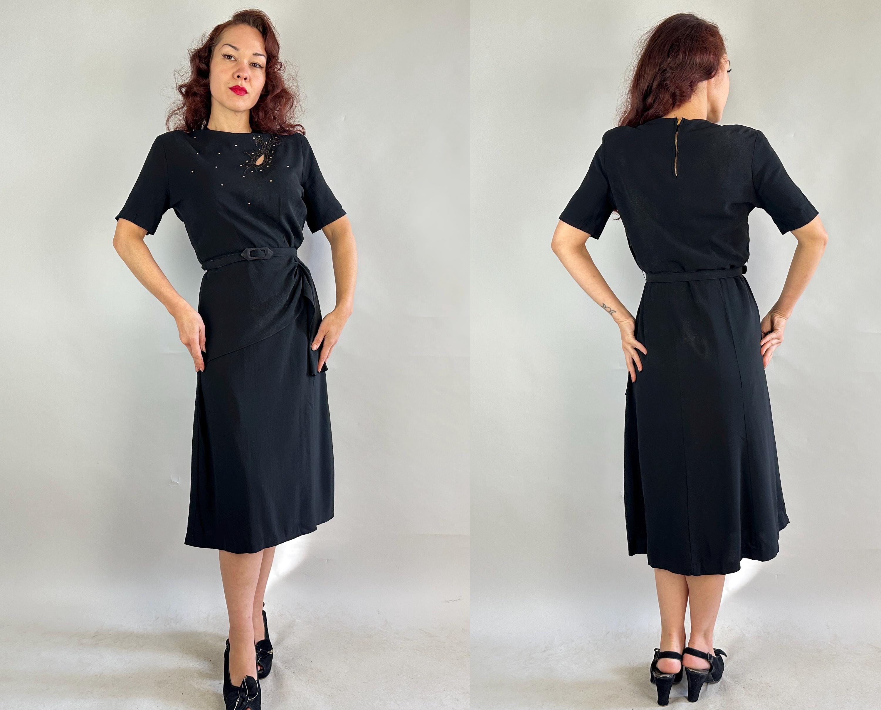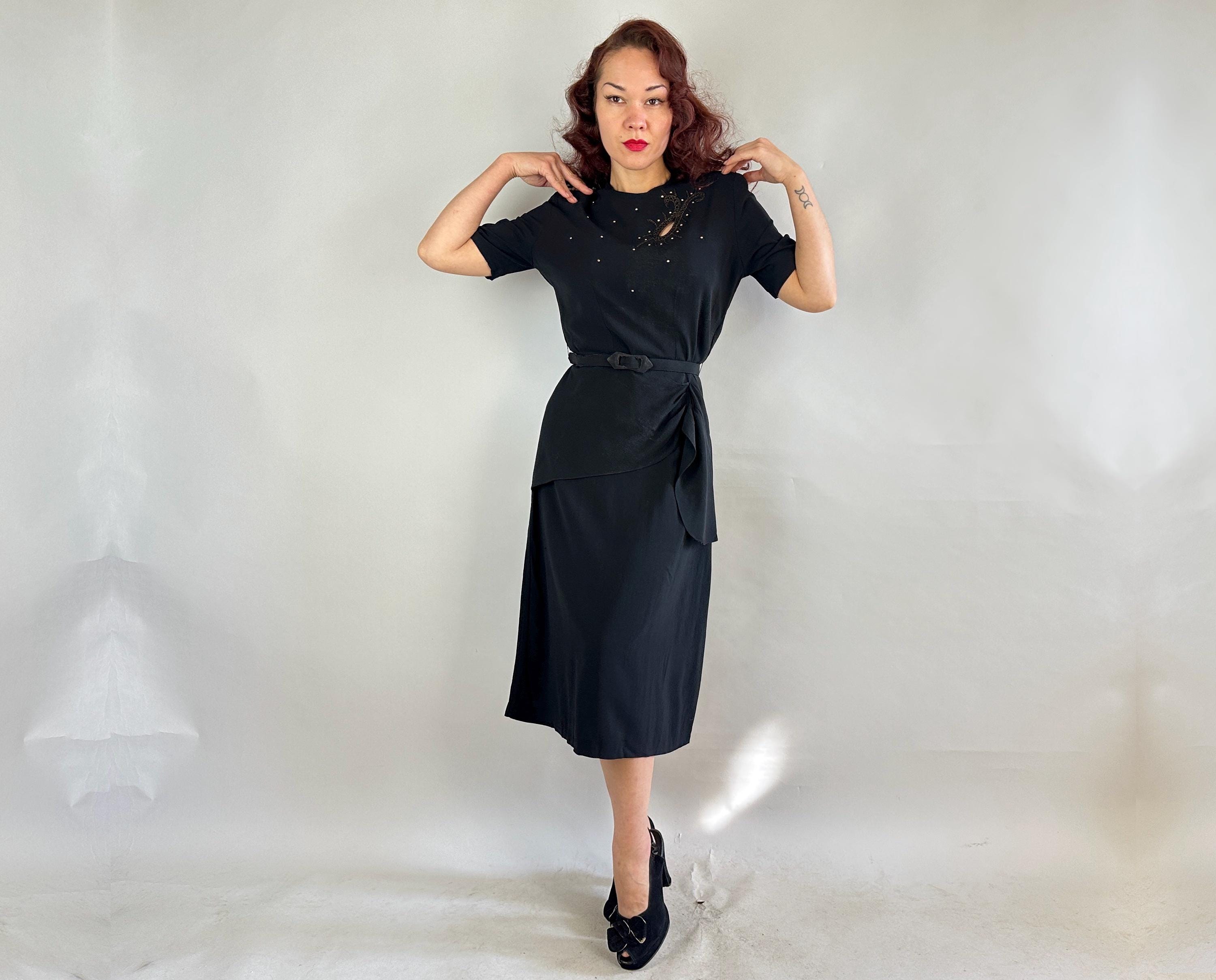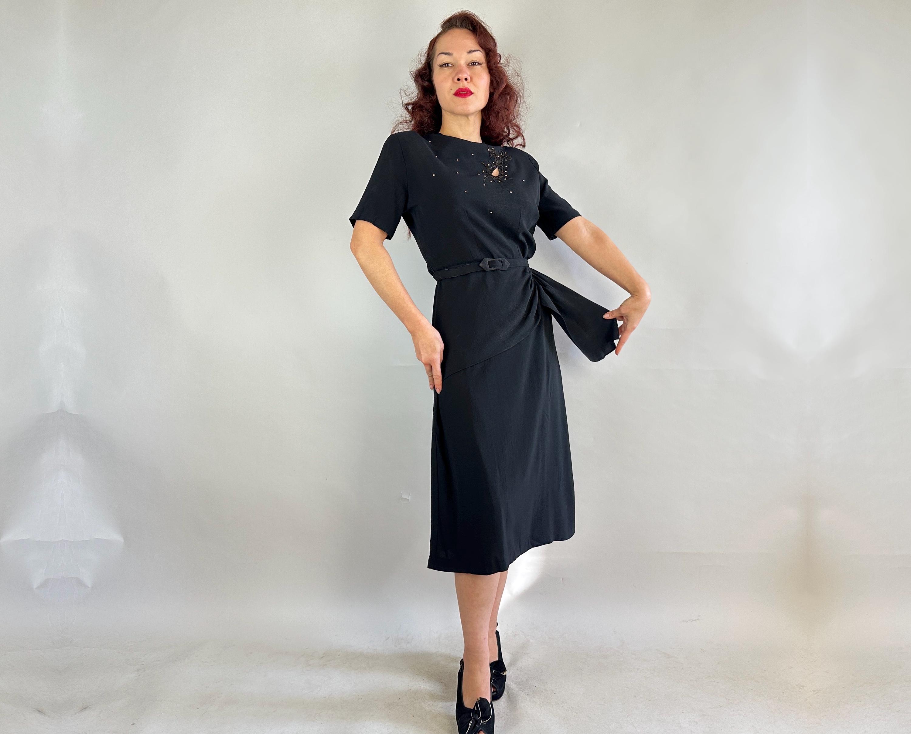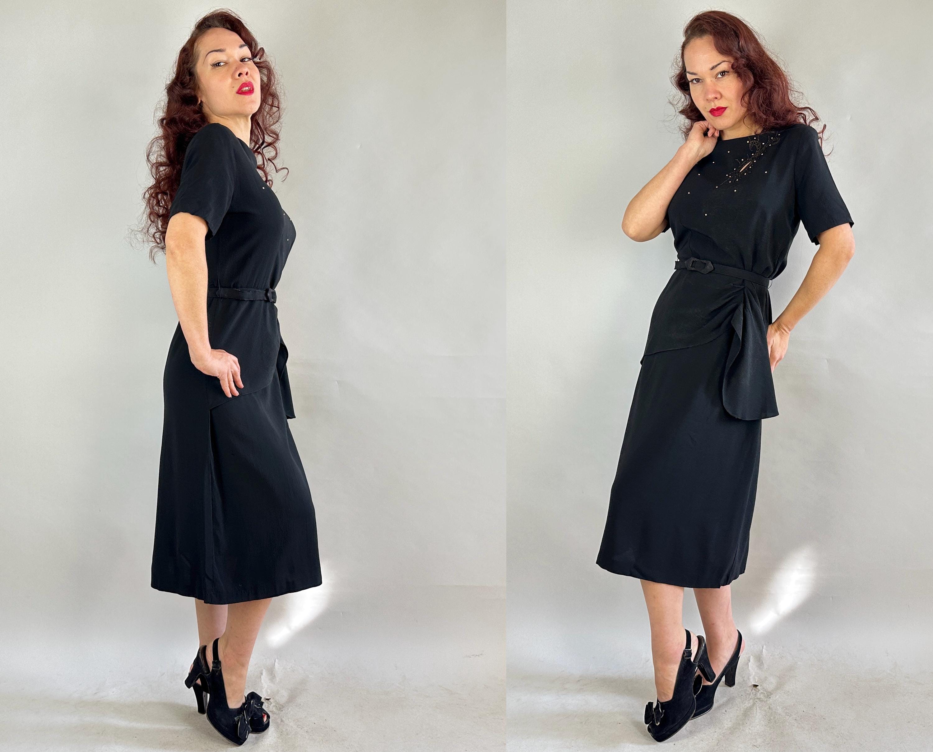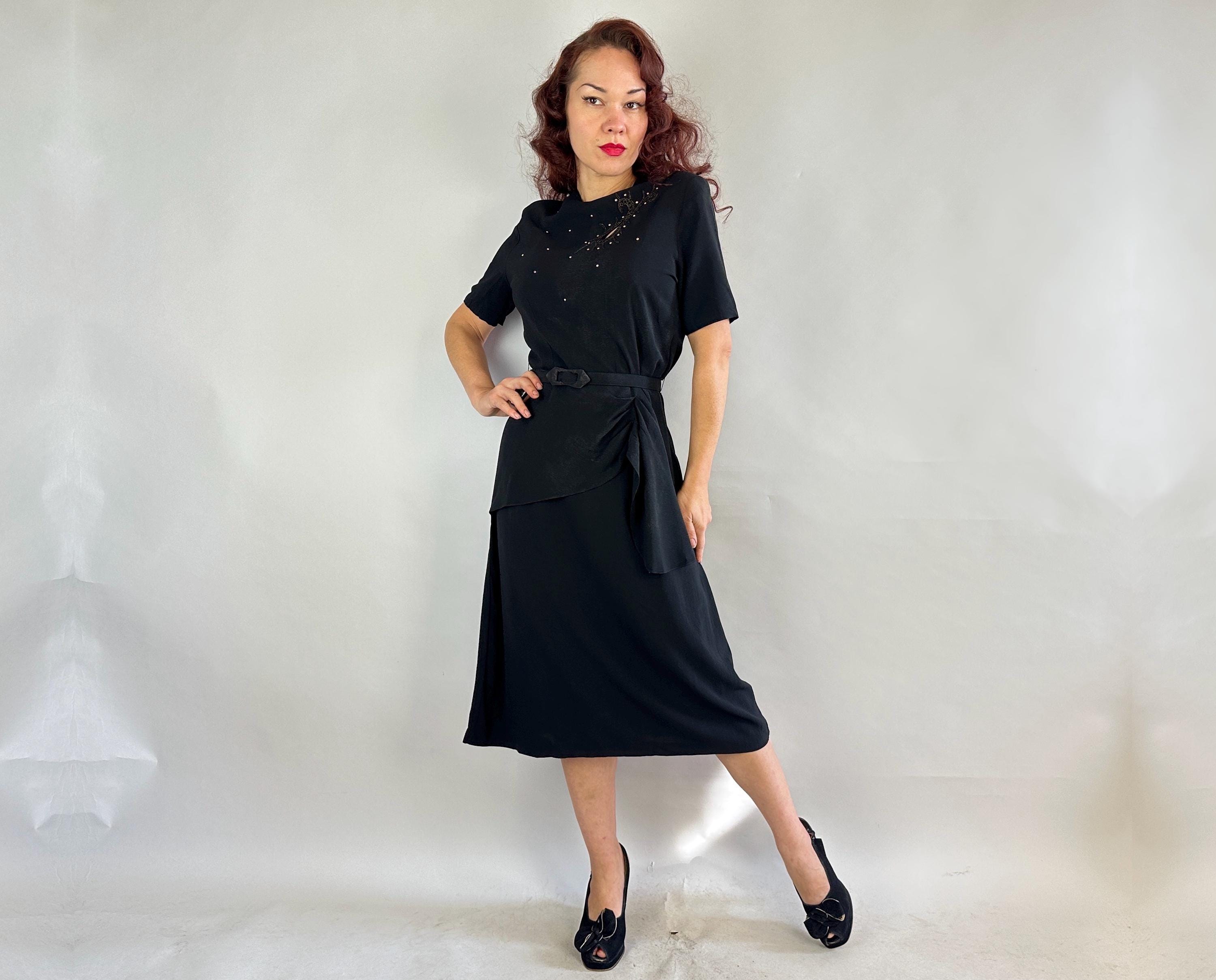 Beguile everyone around you with your star like sparkle in this 1940s dress! Made of black rayon crepe, the bodice is adorned with gold metal studs scattered like the night sky and a teardrop cutout is highlighted by gold wrapped black cord soutache in loops and tendrils. The shoulders are lightly padded and an asymmetric peplum ends on the left hip with a flirty swag. Brass zippers at the nape and on the side add function while complimenting the adornments. Comes with matching slide belt. This dress is in great vintage condition, with no holes, stains, odors to note.