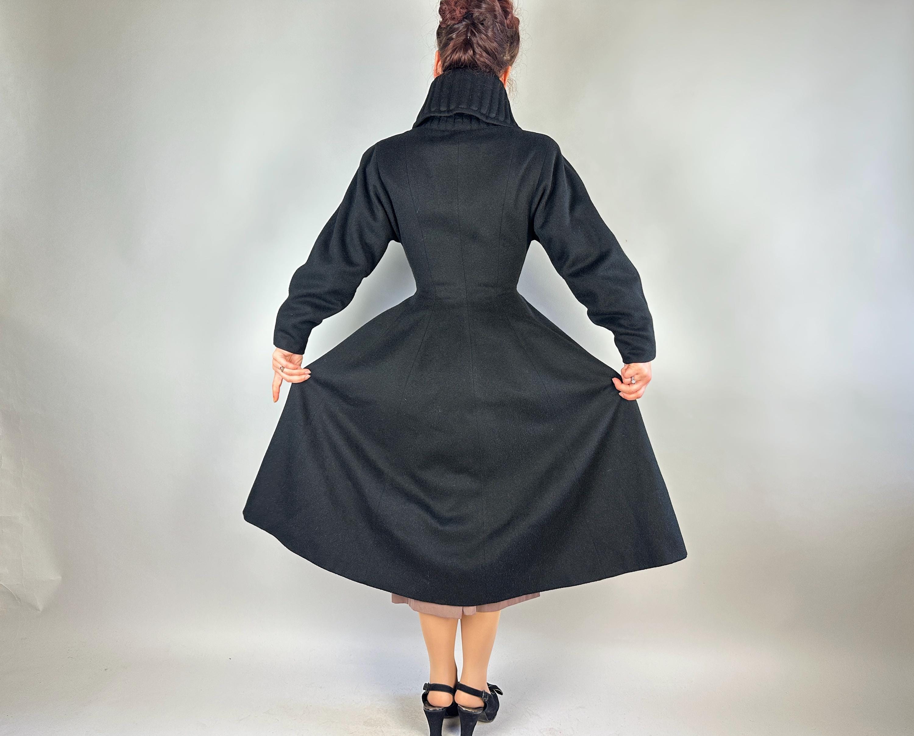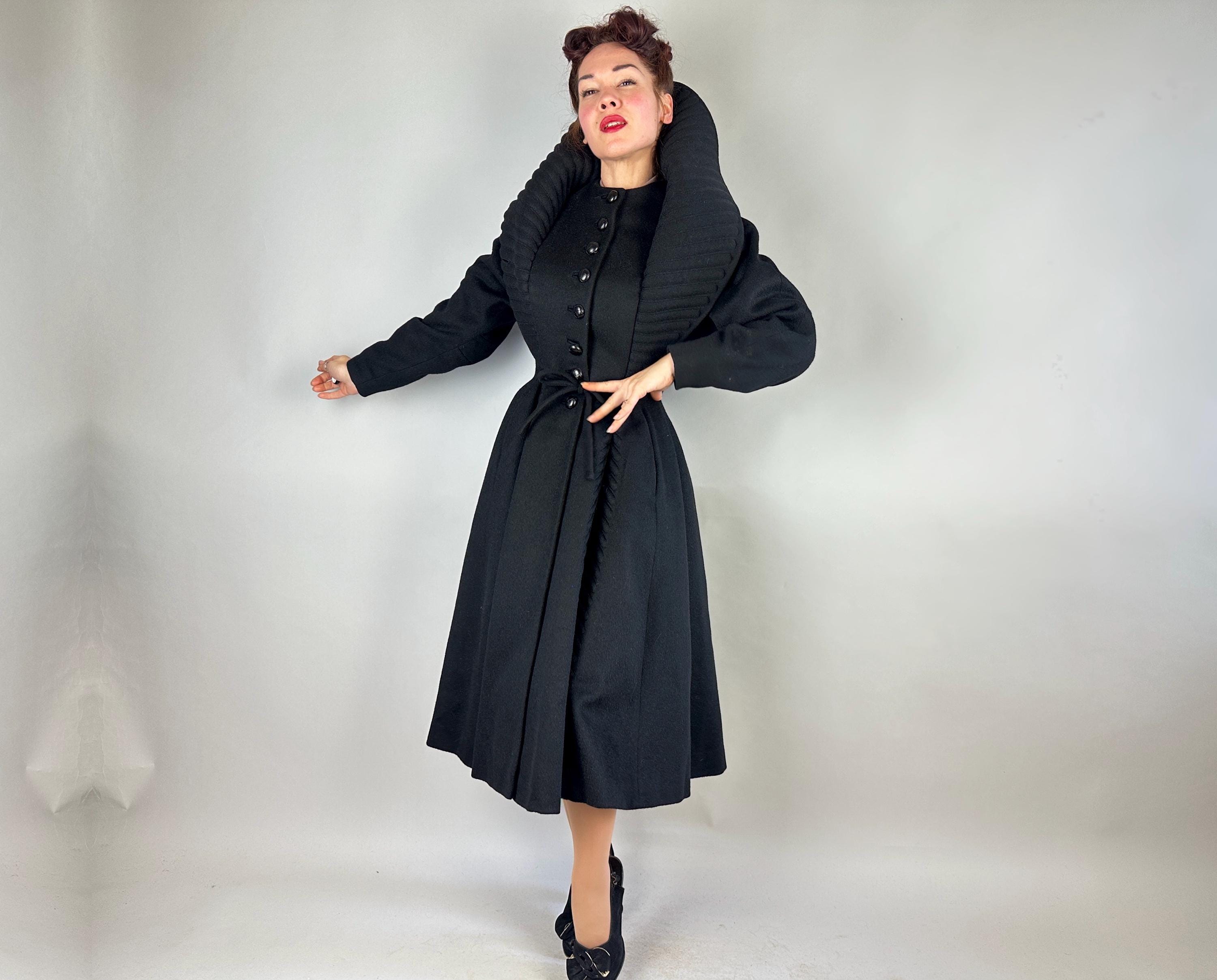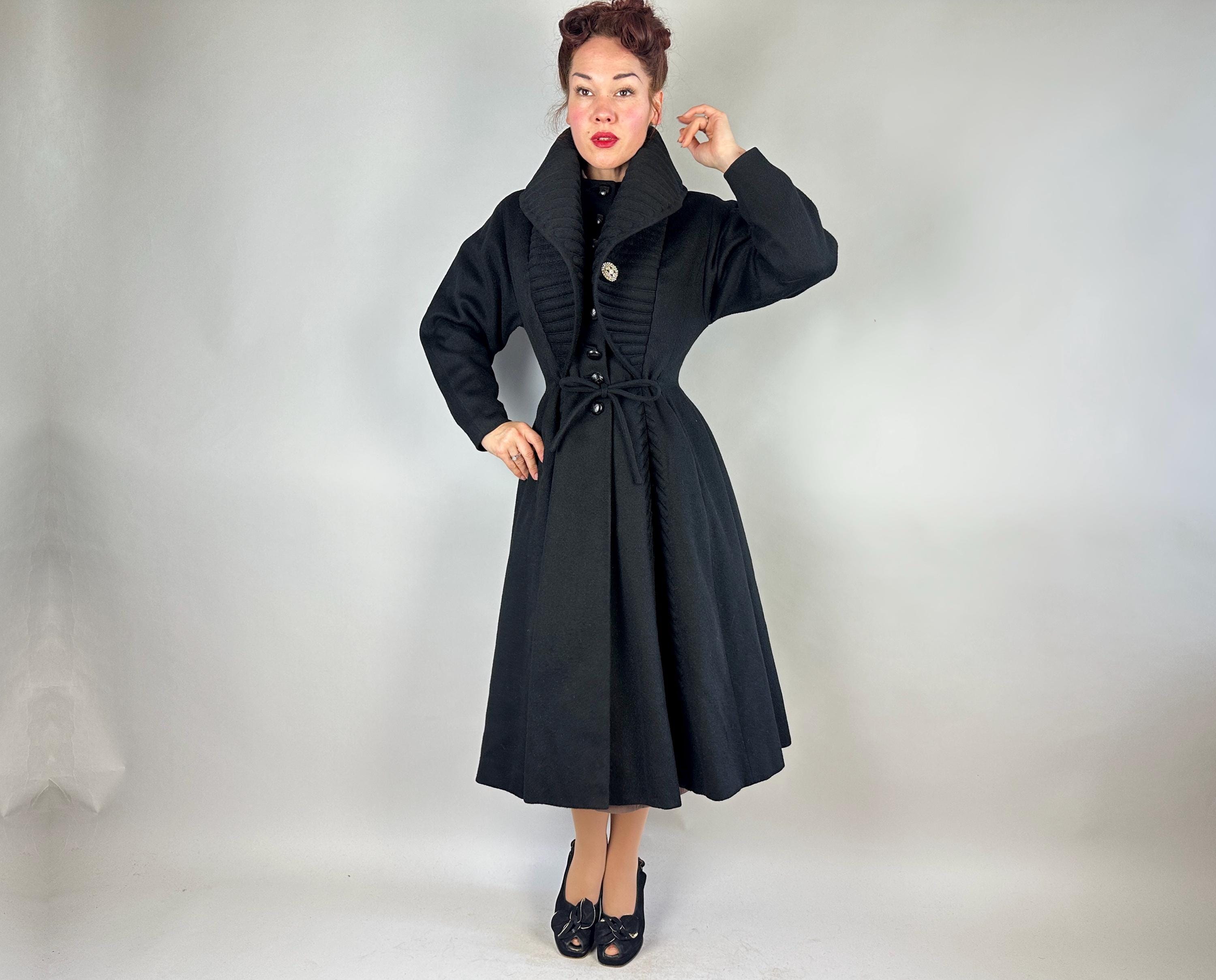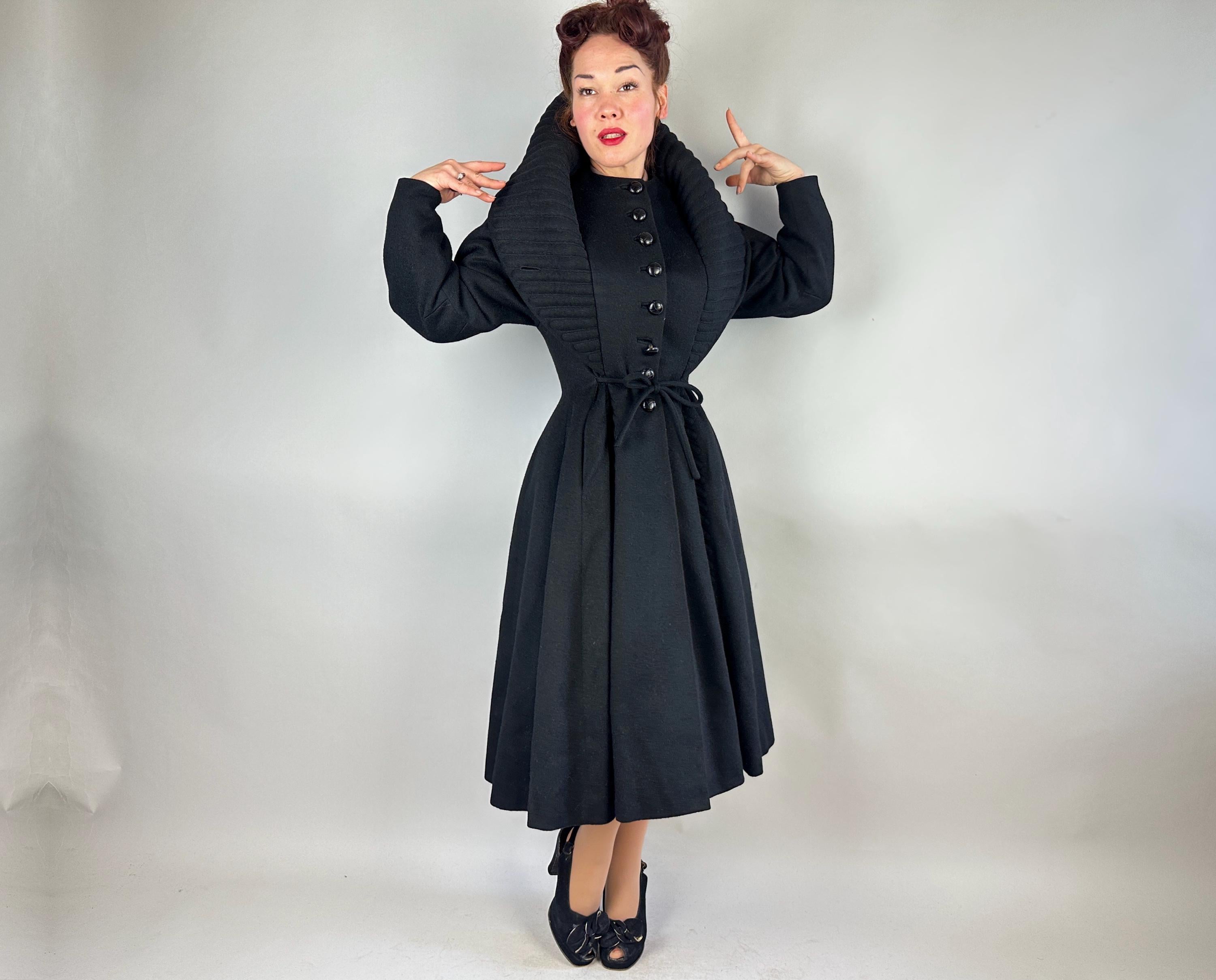 When winter's chill hits you can set a blaze by bringing all the drama in this absolutely iconic 1950s "Lilli Ann" princess coat! The soft wool and mohair blend in black has the slightest silver sheen from the medium length mohair nap and is cut in the epitome of the New Look silhouette. As usual with "Lilli Ann", the seamwork makes an hourglass waist to die for and the full skirt needs no crinoline but the addition of one would send this over the top. The shawl collar is an astounding piece of work both visually and structurally. Featuring trapunto quilting, it can be worn fully laid flat over the shoulders, rolled high over the neck showing off an opulent rhinestone button, or popped up creating seductive vampiric drama. Trapunto accenting is also used on the skirt, starting narrow at the waist and gradually going wide at the hem. Hand pockets are hidden in the skirt seams and waist ties further nip in. Lilli Ann was famous for their princess coats, and this is hands-down the very top princess coat around! We're honored to finally have one for sale <3 Fully lined in rayon satin. This coat is in great vintage condition, with no holes, stains, odors to note.