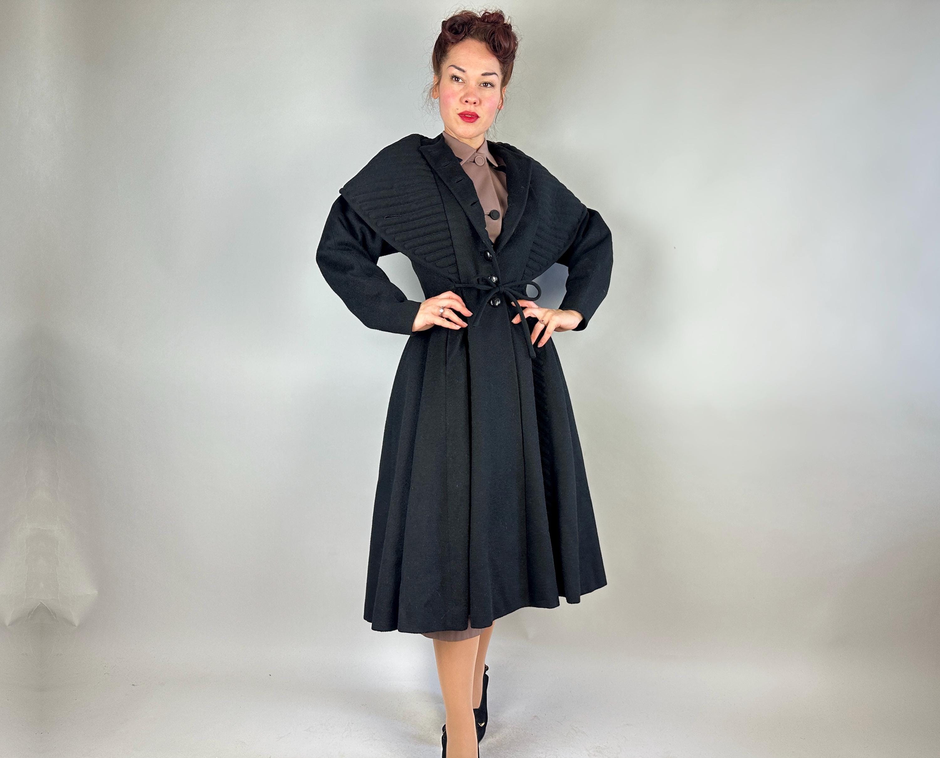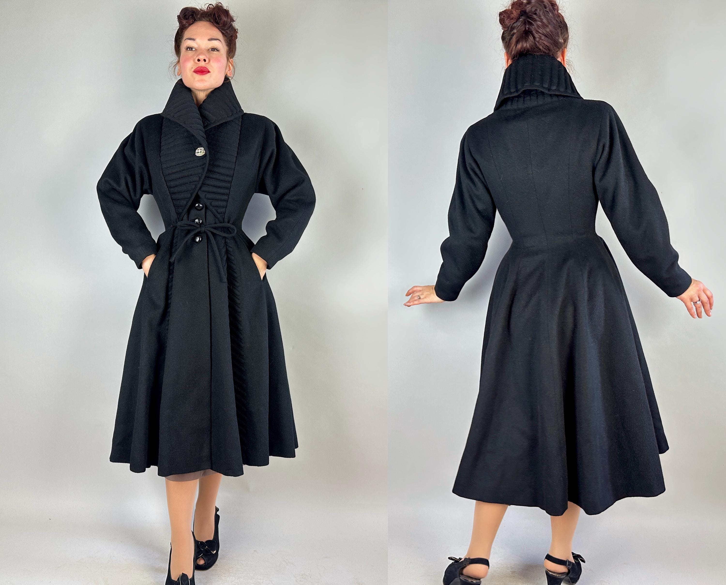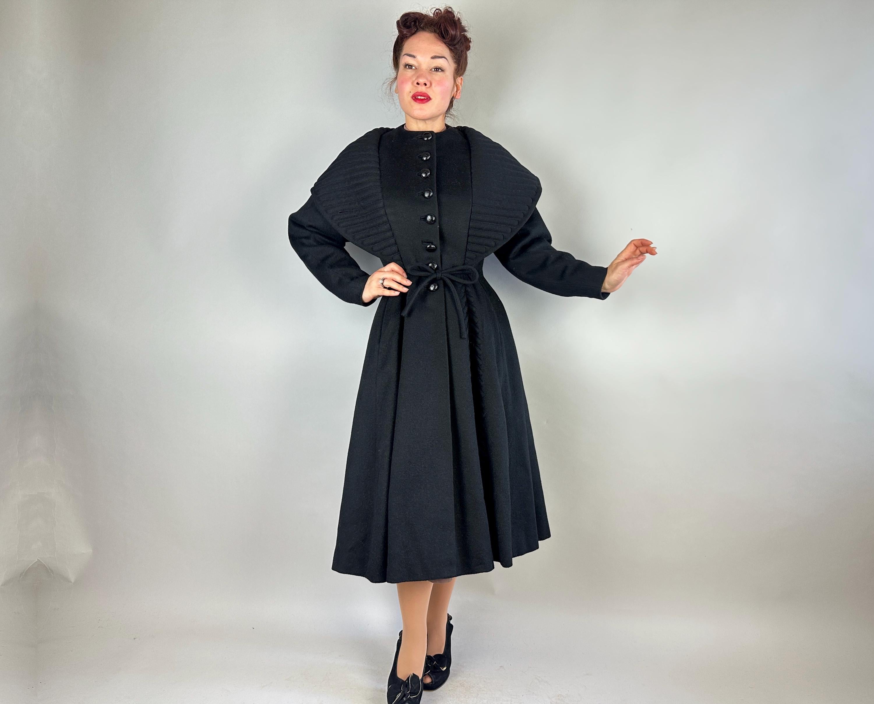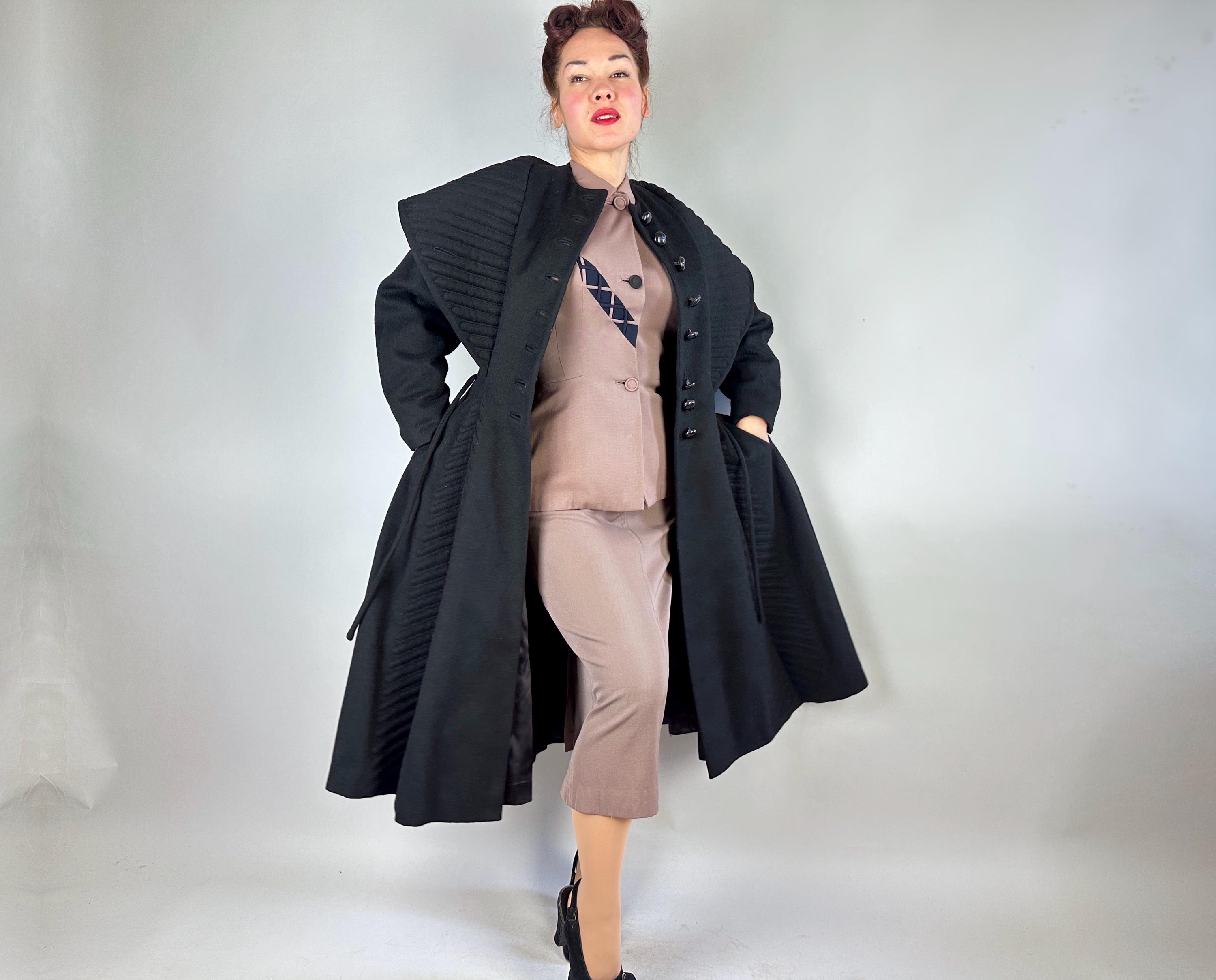 When winter's chill hits you can set a blaze by bringing all the drama in this absolutely iconic 1950s "Lilli Ann" princess coat! The soft wool and mohair blend in black has the slightest silver sheen from the medium length mohair nap and is cut in the epitome of the New Look silhouette. As usual with "Lilli Ann", the seamwork makes an hourglass waist to die for and the full skirt needs no crinoline but the addition of one would send this over the top. The shawl collar is an astounding piece of work both visually and structurally. Featuring trapunto quilting, it can be worn fully laid flat over the shoulders, rolled high over the neck showing off an opulent rhinestone button, or popped up creating seductive vampiric drama. Trapunto accenting is also used on the skirt, starting narrow at the waist and gradually going wide at the hem. Hand pockets are hidden in the skirt seams and waist ties further nip in. Lilli Ann was famous for their princess coats, and this is hands-down the very top princess coat around! We're honored to finally have one for sale <3 Fully lined in rayon satin. This coat is in great vintage condition, with no holes, stains, odors to note.