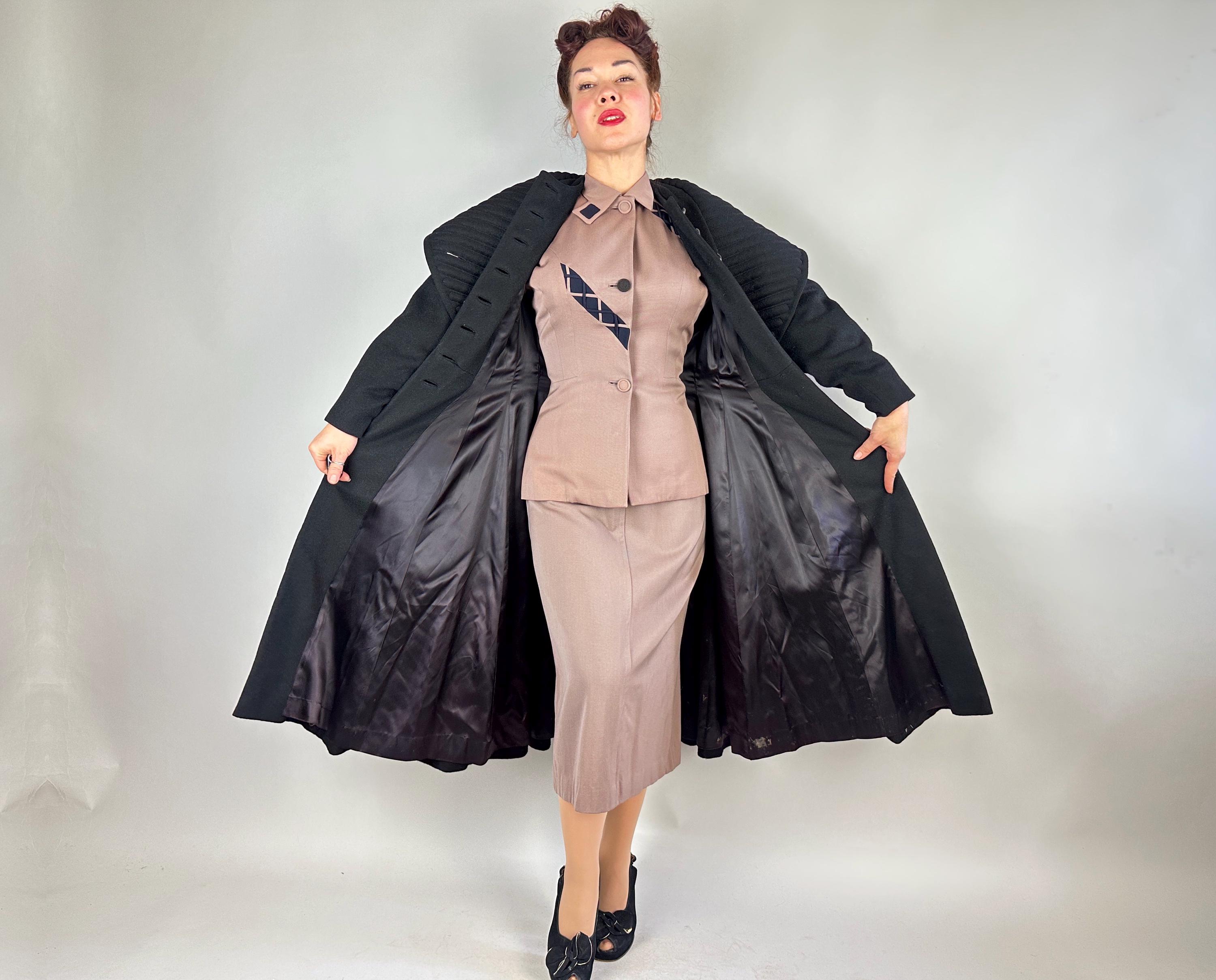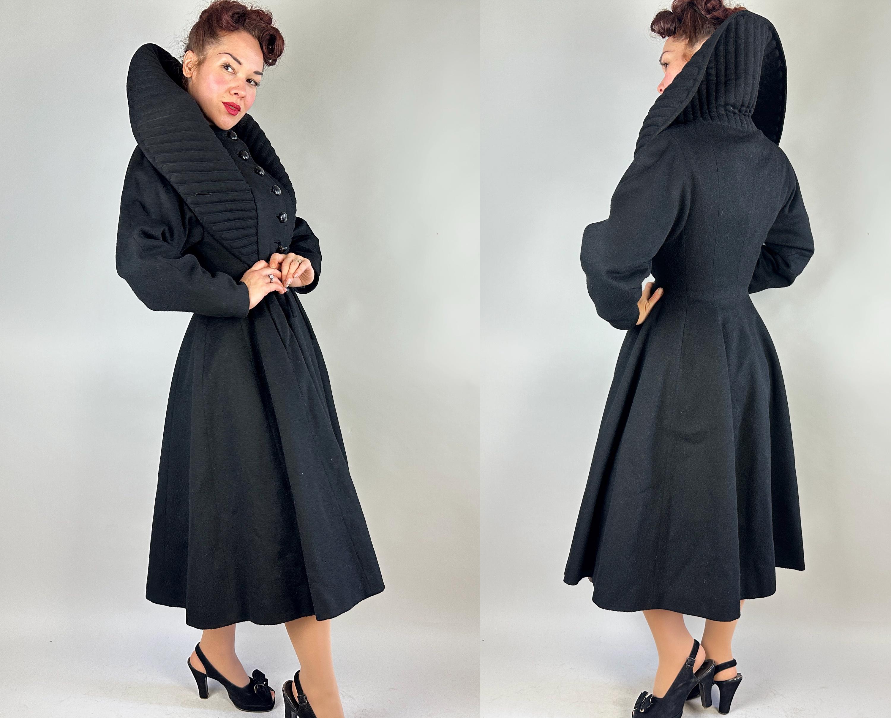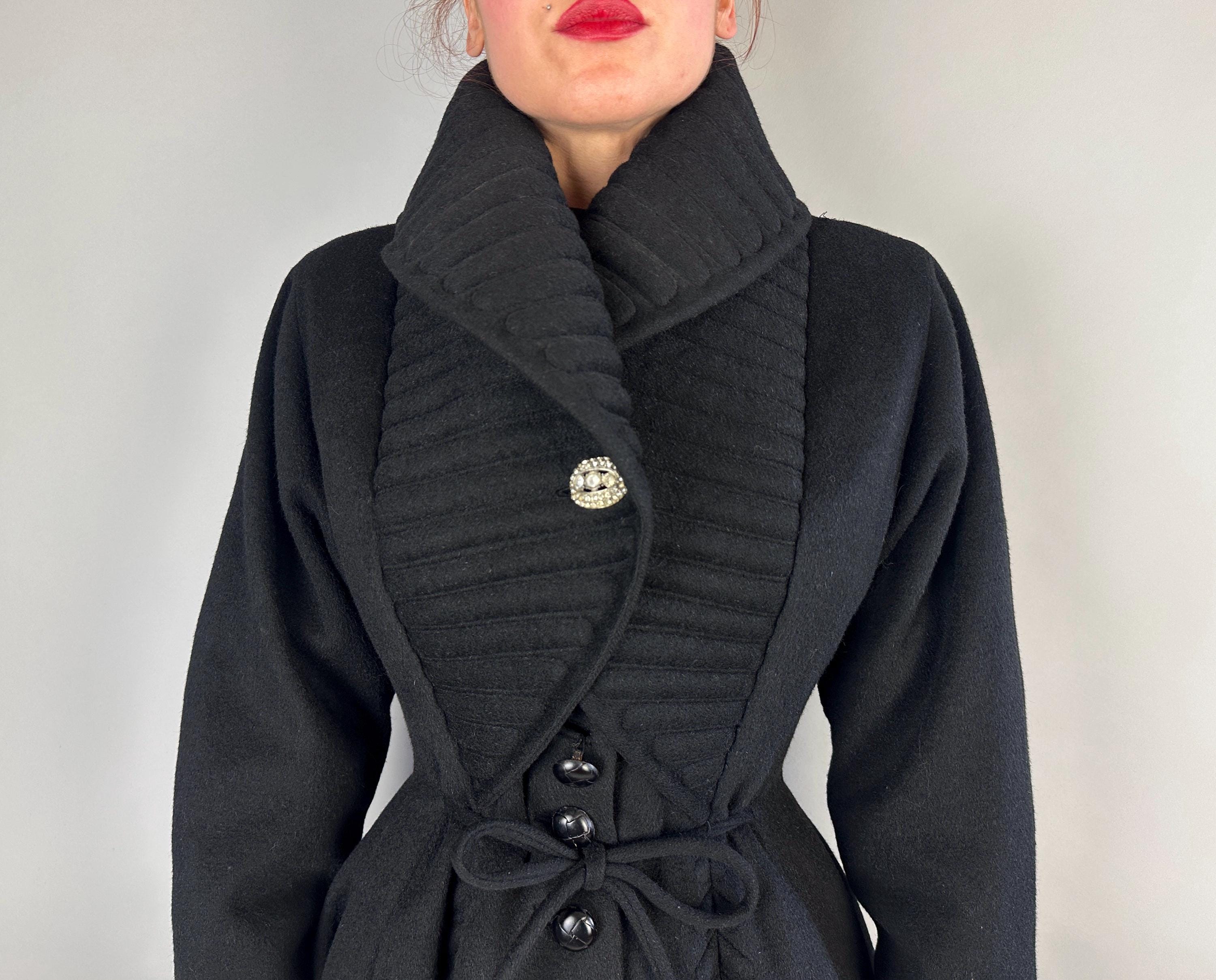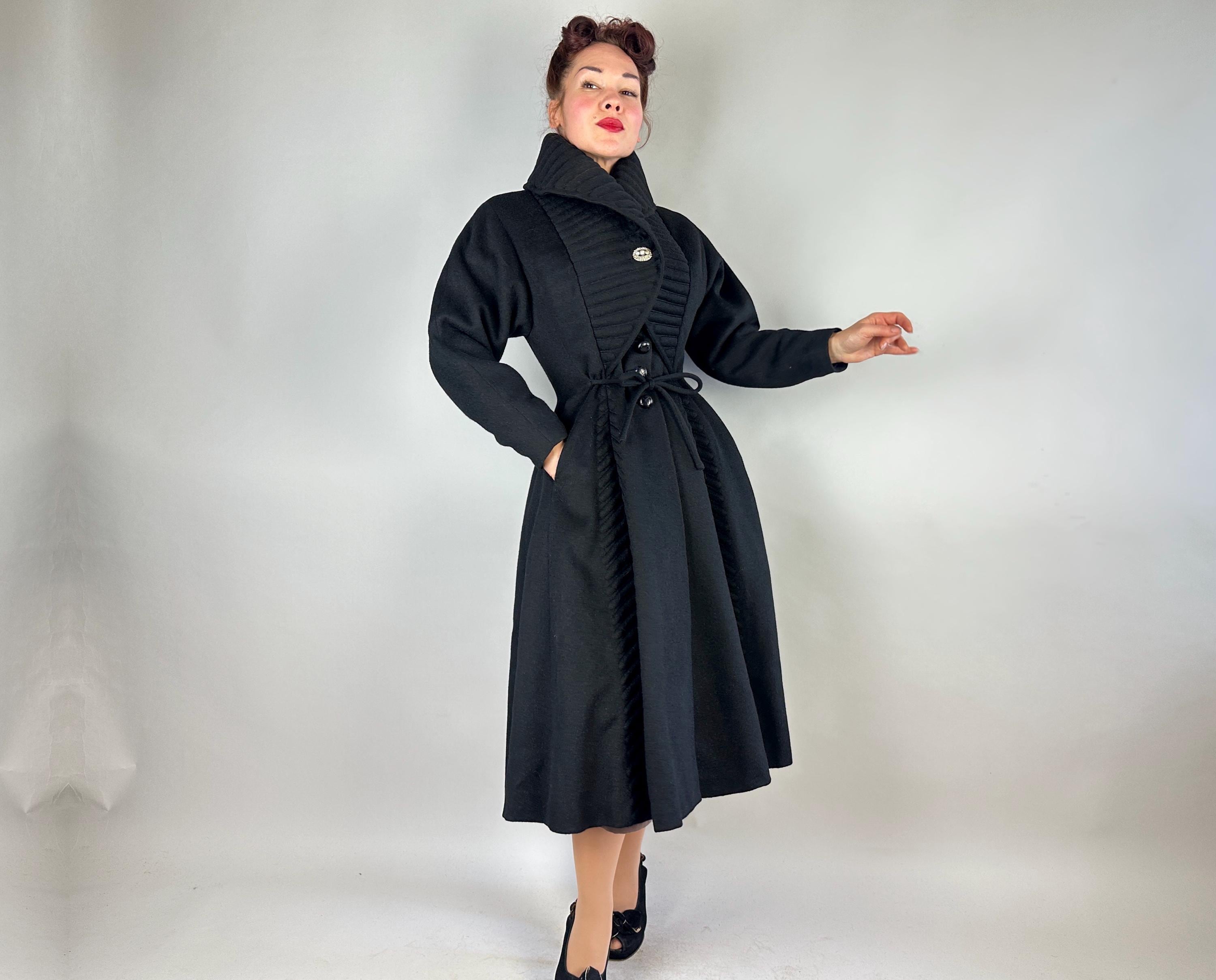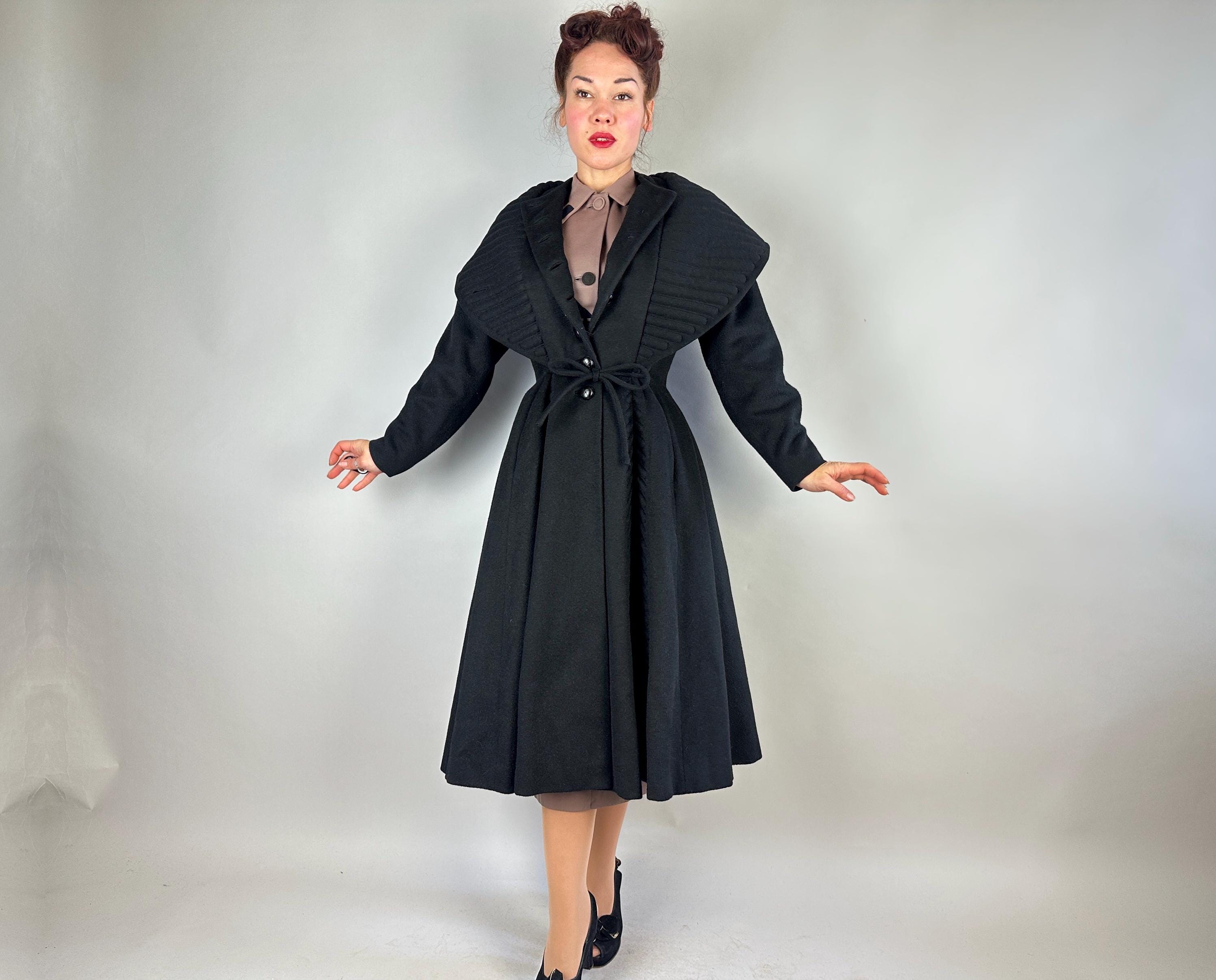 When winter's chill hits you can set a blaze by bringing all the drama in this absolutely iconic 1950s "Lilli Ann" princess coat! The soft wool and mohair blend in black has the slightest silver sheen from the medium length mohair nap and is cut in the epitome of the New Look silhouette. As usual with "Lilli Ann", the seamwork makes an hourglass waist to die for and the full skirt needs no crinoline but the addition of one would send this over the top. The shawl collar is an astounding piece of work both visually and structurally. Featuring trapunto quilting, it can be worn fully laid flat over the shoulders, rolled high over the neck showing off an opulent rhinestone button, or popped up creating seductive vampiric drama. Trapunto accenting is also used on the skirt, starting narrow at the waist and gradually going wide at the hem. Hand pockets are hidden in the skirt seams and waist ties further nip in. Lilli Ann was famous for their princess coats, and this is hands-down the very top princess coat around! We're honored to finally have one for sale <3 Fully lined in rayon satin. This coat is in great vintage condition, with no holes, stains, odors to note.