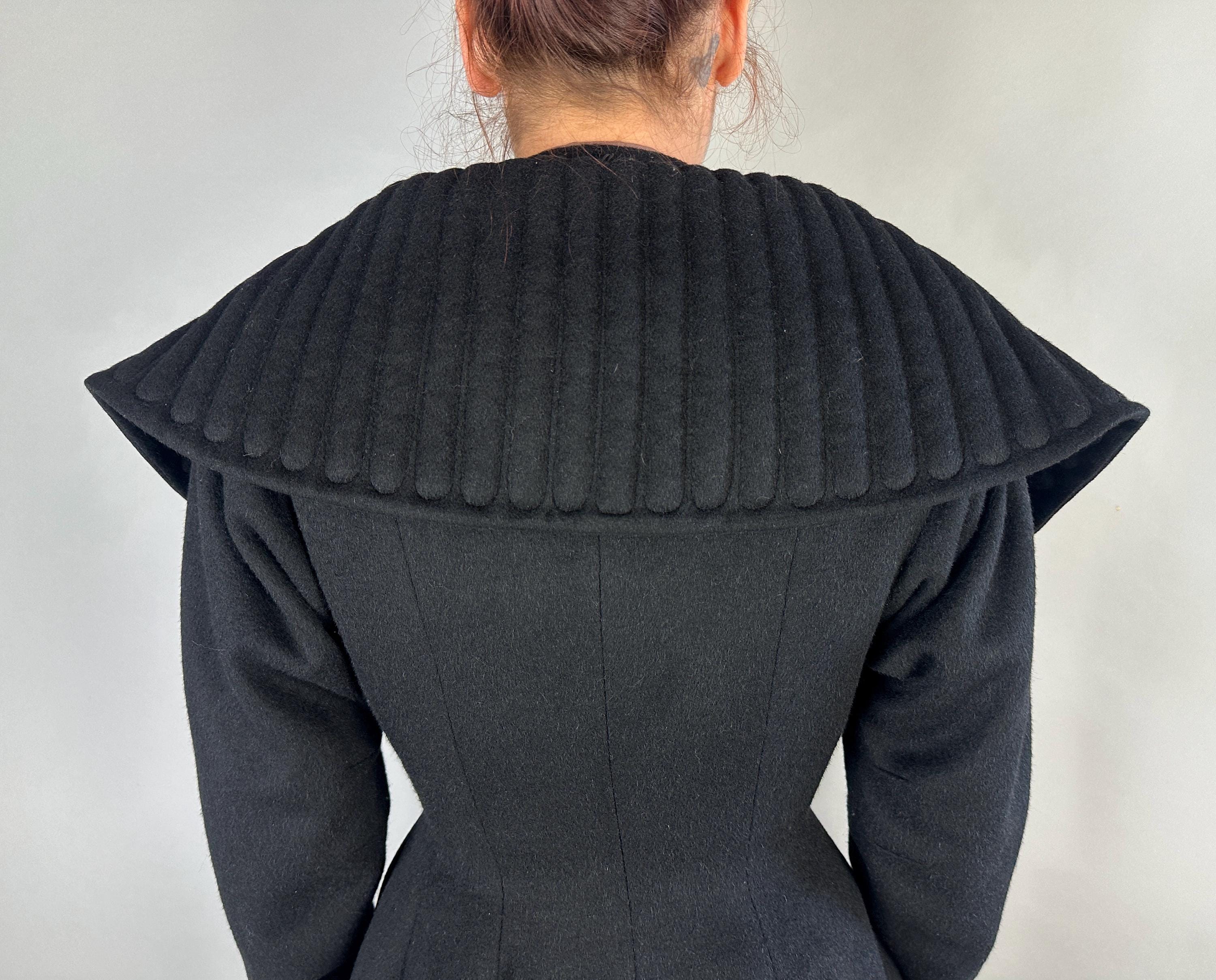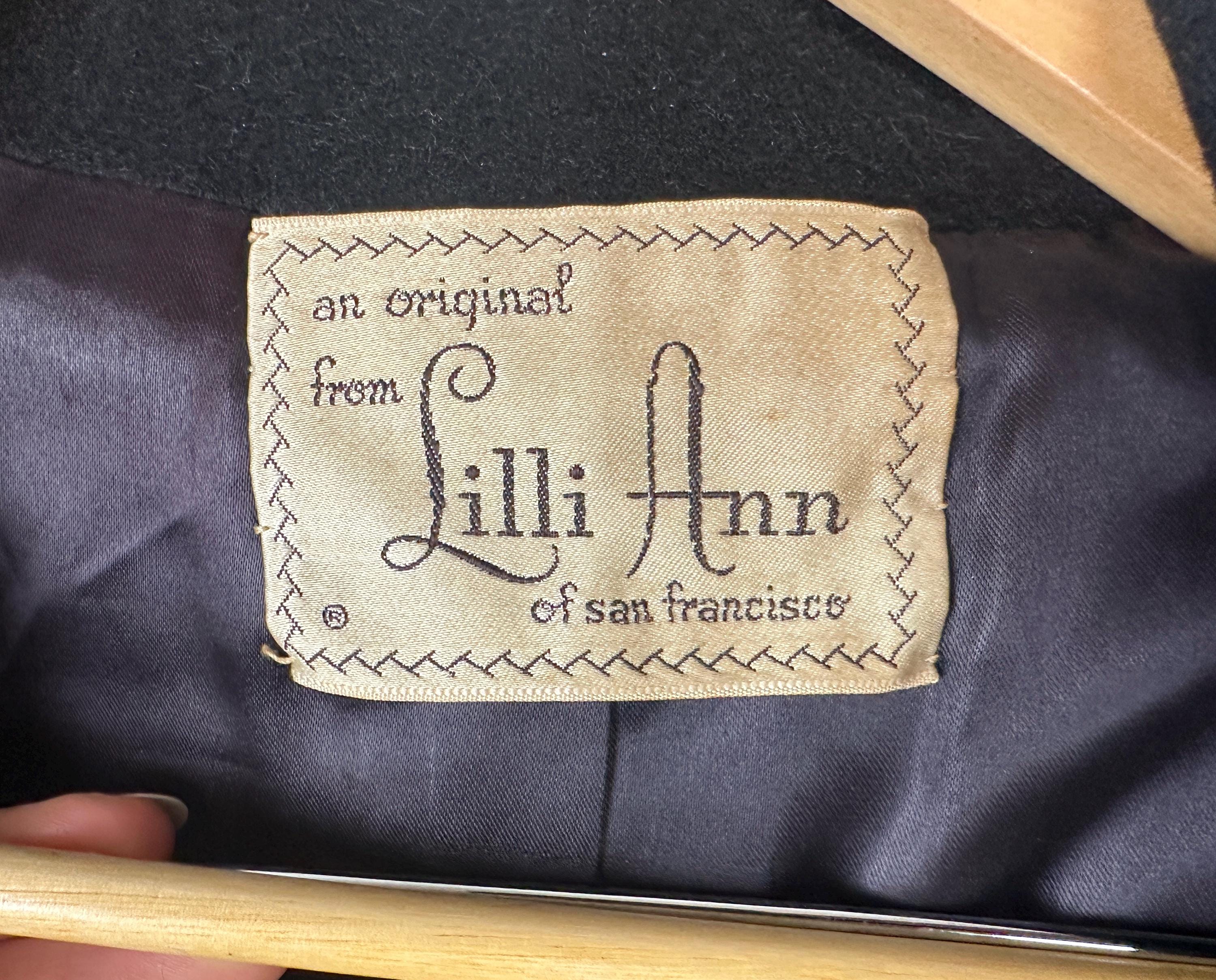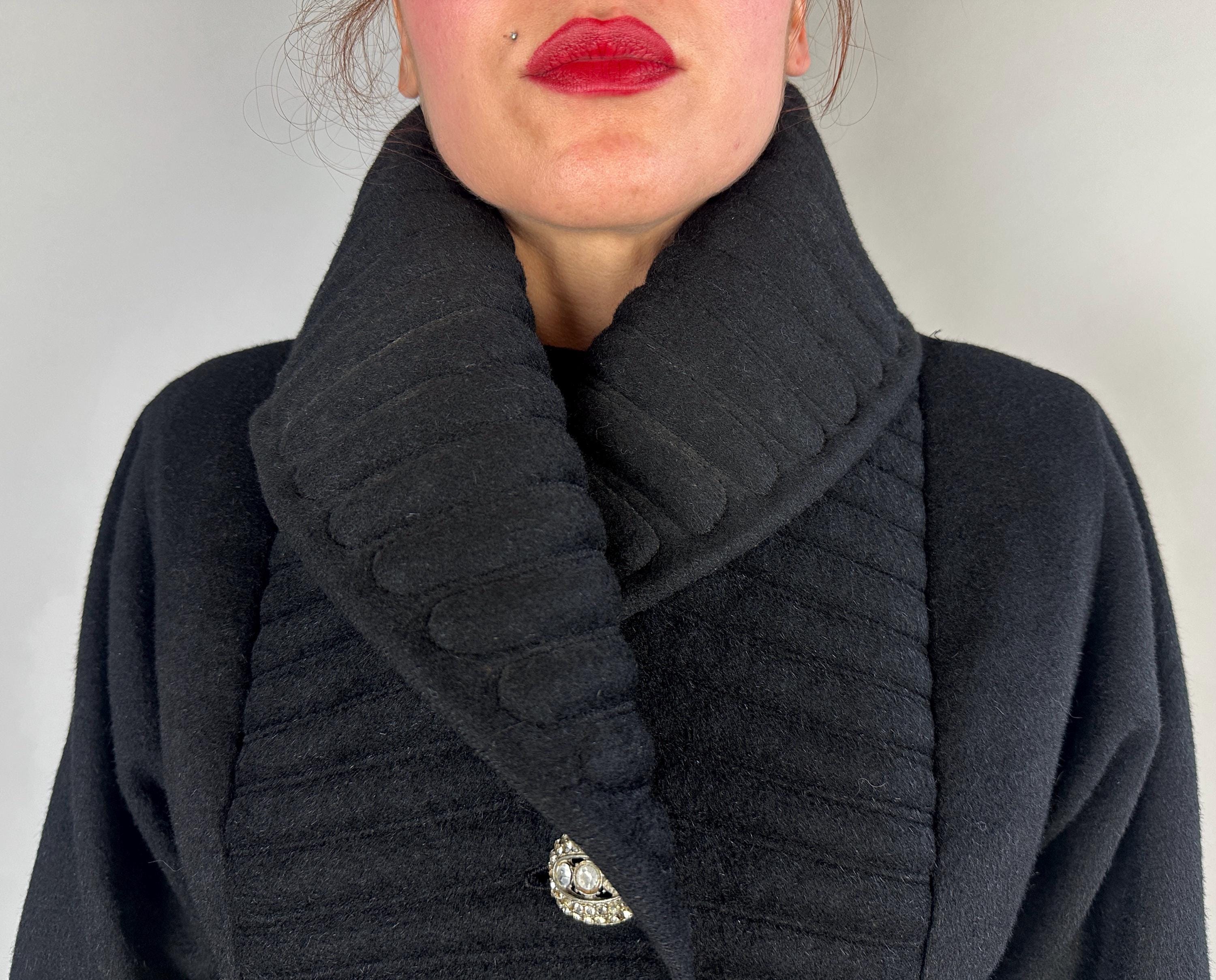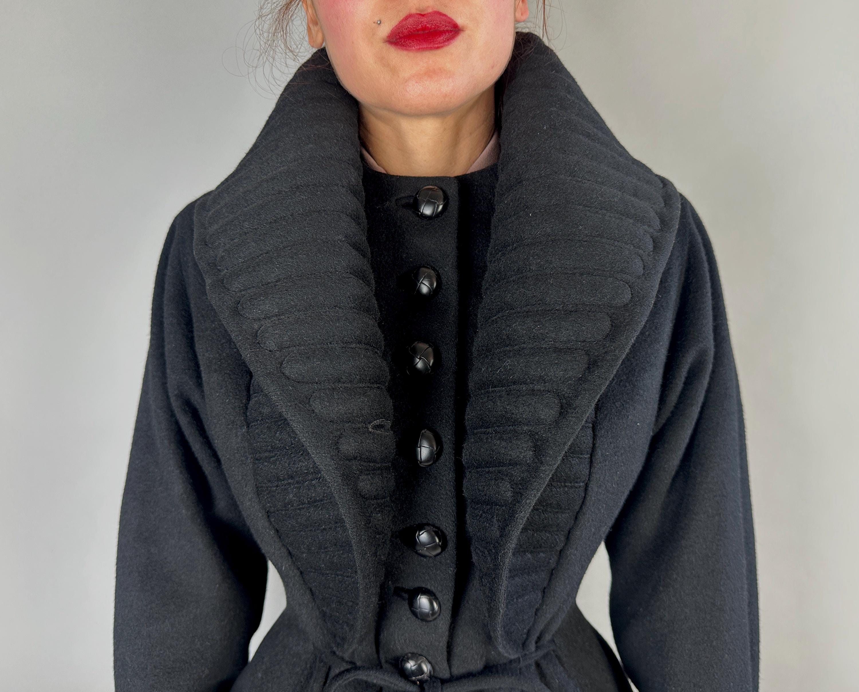 When winter's chill hits you can set a blaze by bringing all the drama in this absolutely iconic 1950s "Lilli Ann" princess coat! The soft wool and mohair blend in black has the slightest silver sheen from the medium length mohair nap and is cut in the epitome of the New Look silhouette. As usual with "Lilli Ann", the seamwork makes an hourglass waist to die for and the full skirt needs no crinoline but the addition of one would send this over the top. The shawl collar is an astounding piece of work both visually and structurally. Featuring trapunto quilting, it can be worn fully laid flat over the shoulders, rolled high over the neck showing off an opulent rhinestone button, or popped up creating seductive vampiric drama. Trapunto accenting is also used on the skirt, starting narrow at the waist and gradually going wide at the hem. Hand pockets are hidden in the skirt seams and waist ties further nip in. Lilli Ann was famous for their princess coats, and this is hands-down the very top princess coat around! We're honored to finally have one for sale <3 Fully lined in rayon satin. This coat is in great vintage condition, with no holes, stains, odors to note.