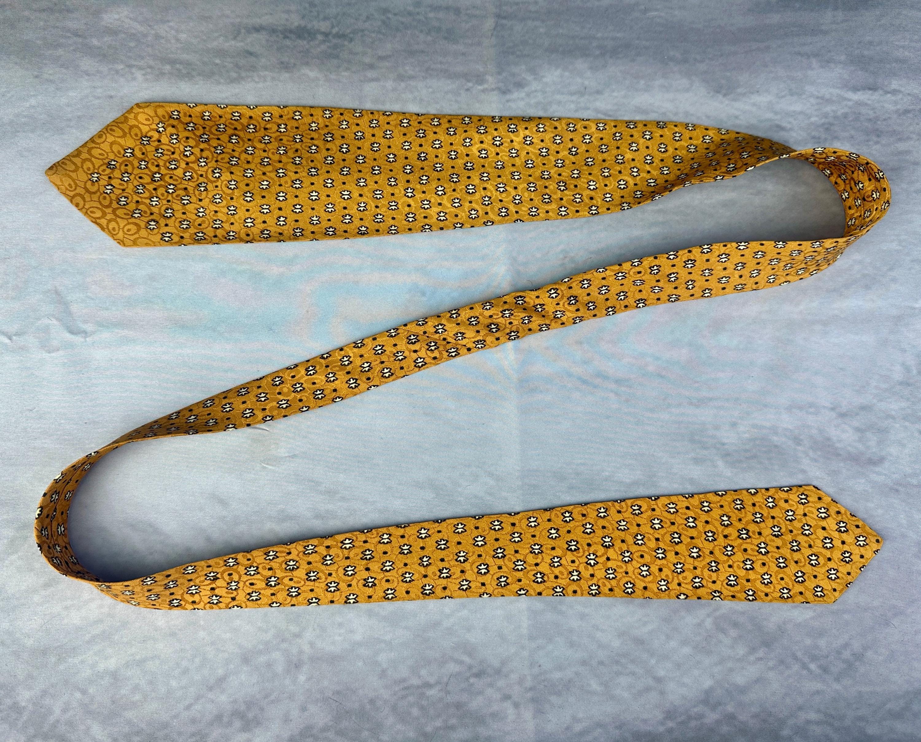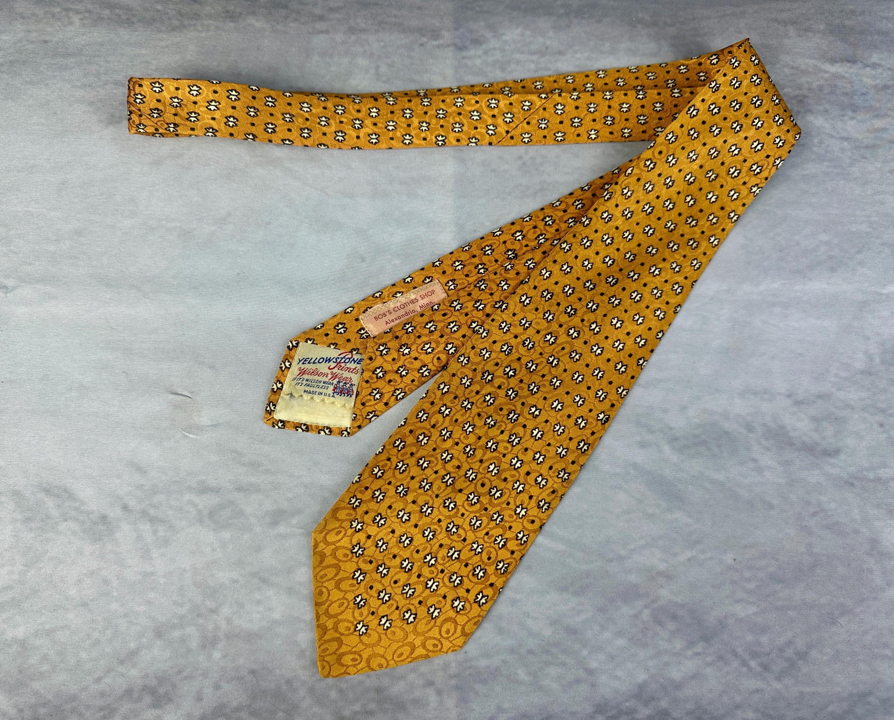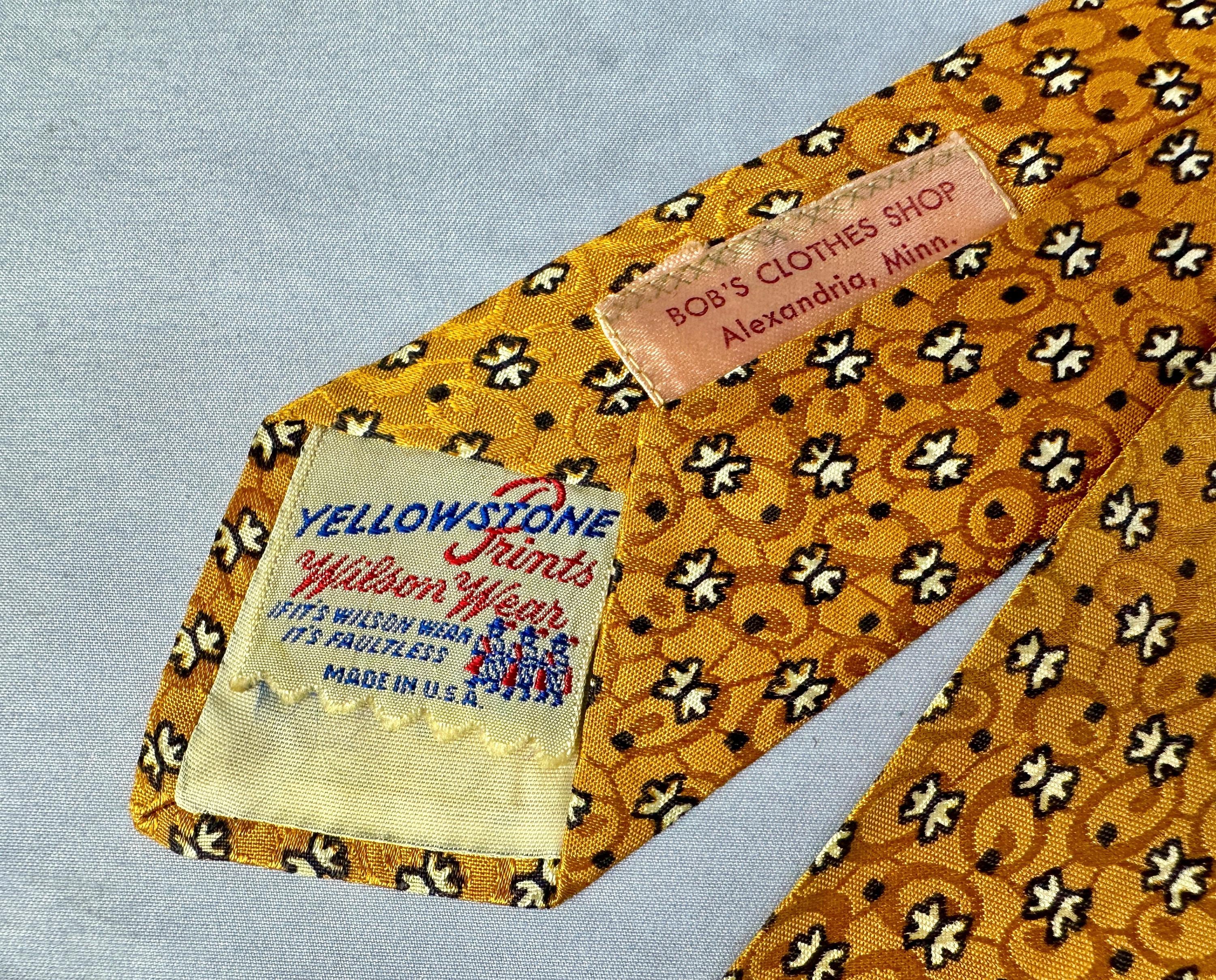 Frolic in springtime flowers with this fun 1940s necktie! Yellow ochre silk has a background tone on tone weave likened to olives on cobblestones and white butterfly shapes alternate with black spots in the foreground. Fully lined and labeled "Yellowstone Prints Wilson Wear" and sold by "Bob's Clothes Shop". Pairs well with a wide variety of Art Deco and Mid-Century suit colors and fabric types. This tie is in great vintage condition with no flaws to note.
