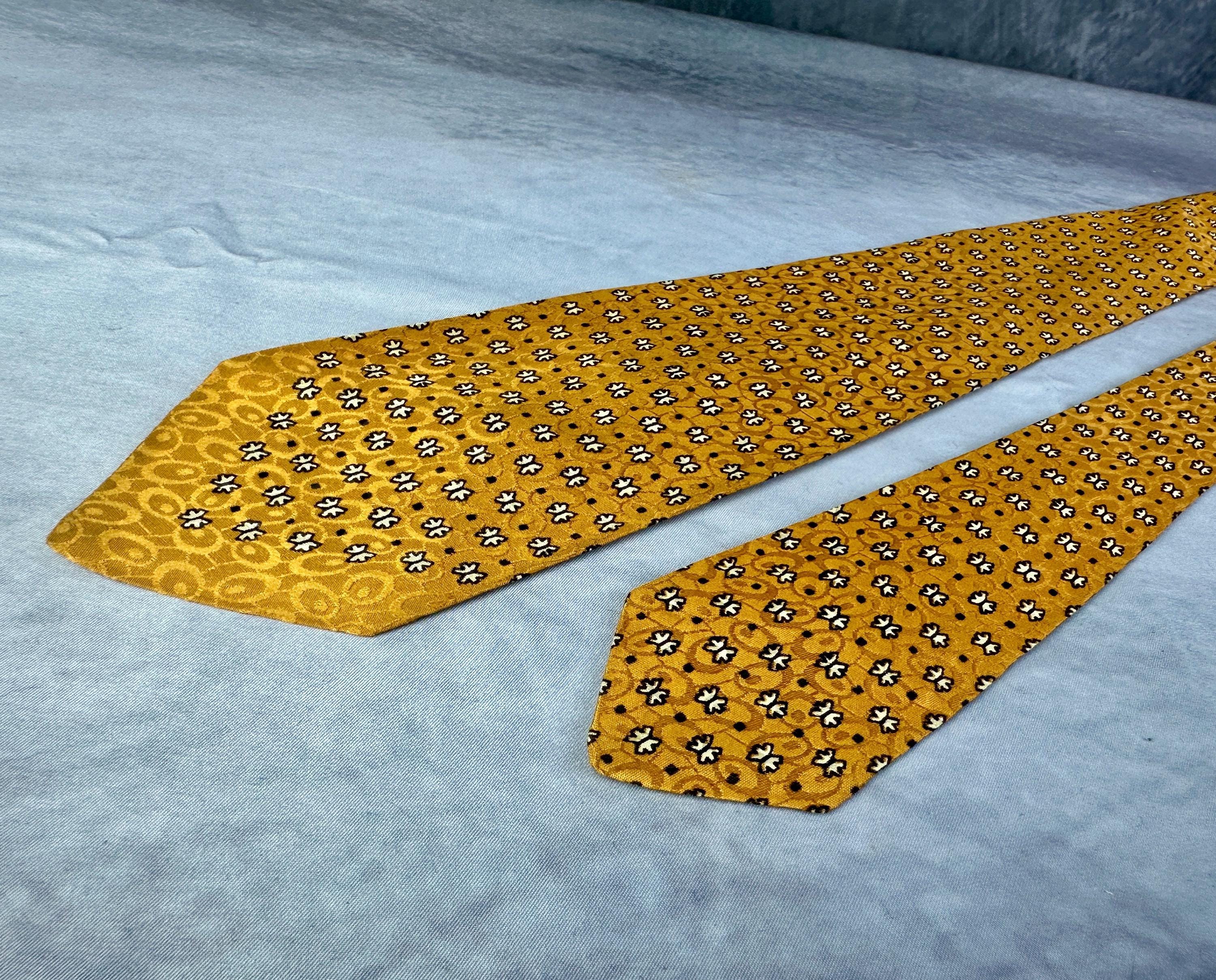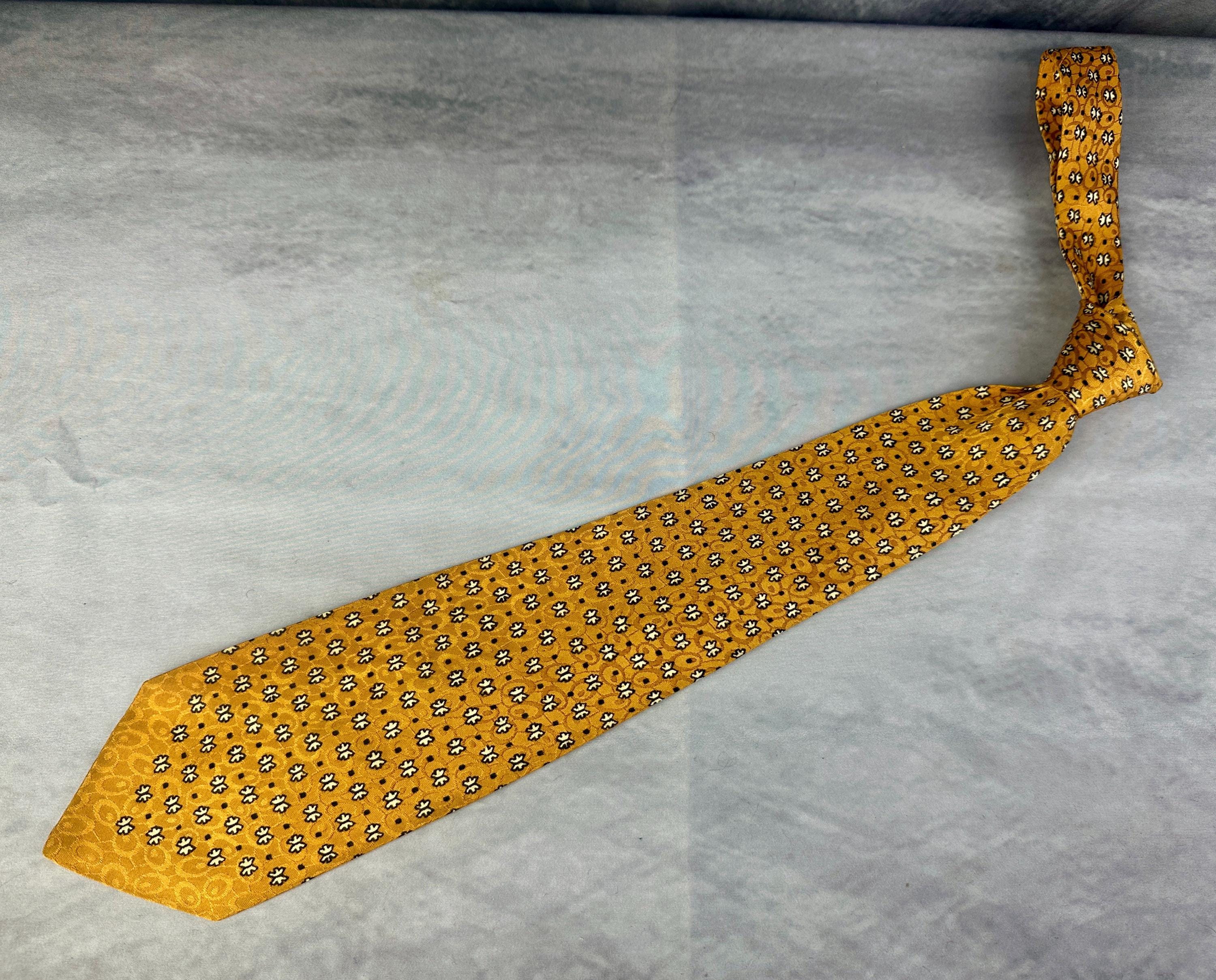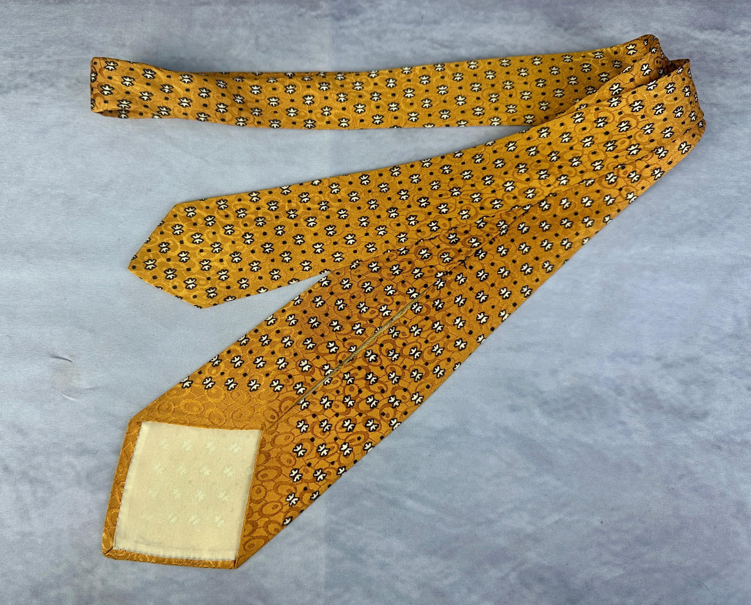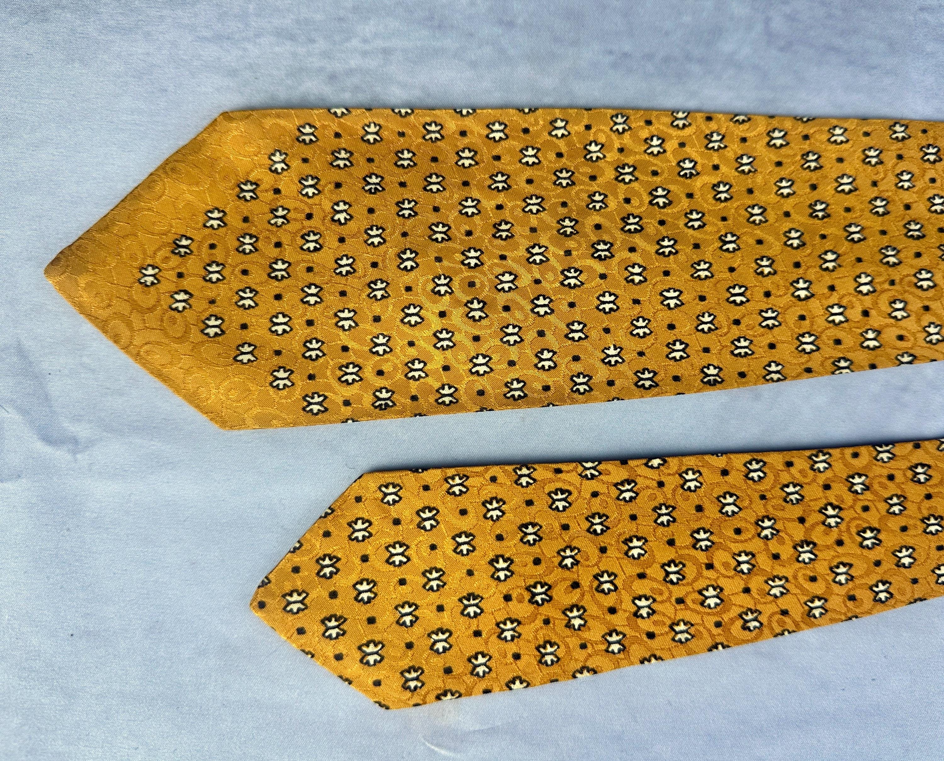 Frolic in springtime flowers with this fun 1940s necktie! Yellow ochre silk has a background tone on tone weave likened to olives on cobblestones and white butterfly shapes alternate with black spots in the foreground. Fully lined and labeled "Yellowstone Prints Wilson Wear" and sold by "Bob's Clothes Shop". Pairs well with a wide variety of Art Deco and Mid-Century suit colors and fabric types. This tie is in great vintage condition with no flaws to note.