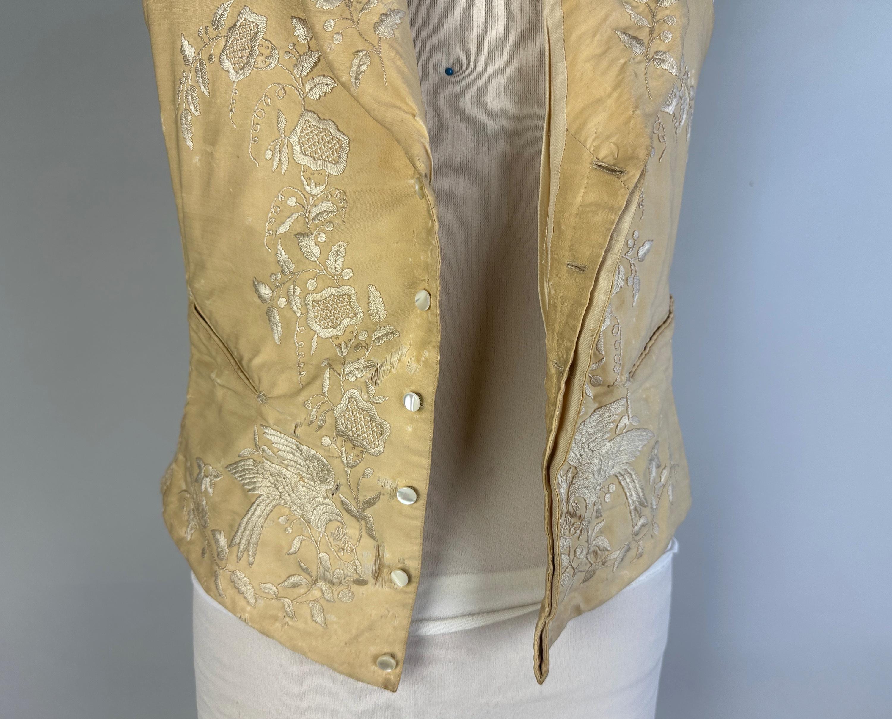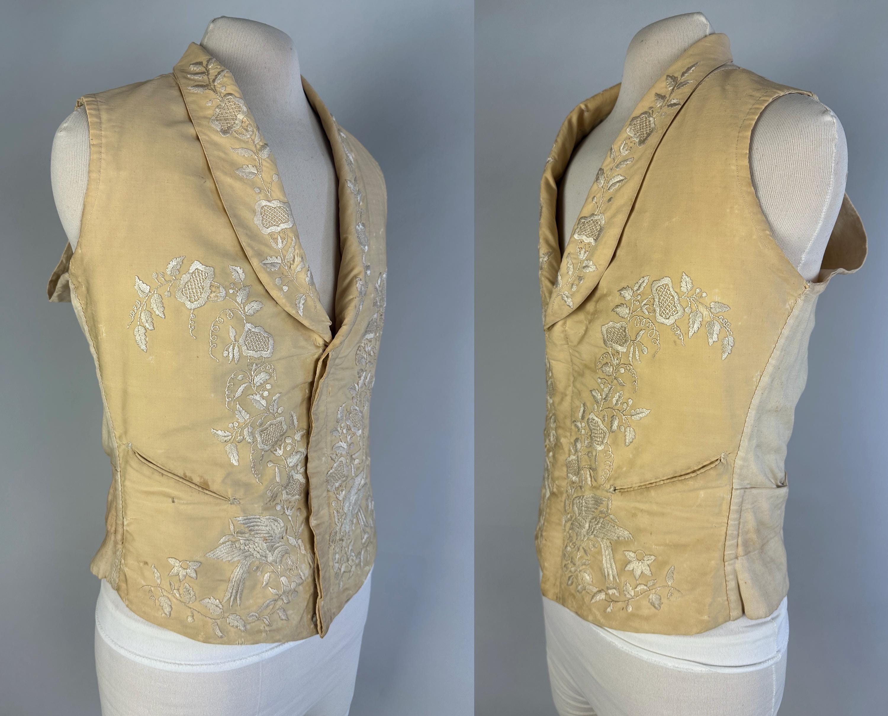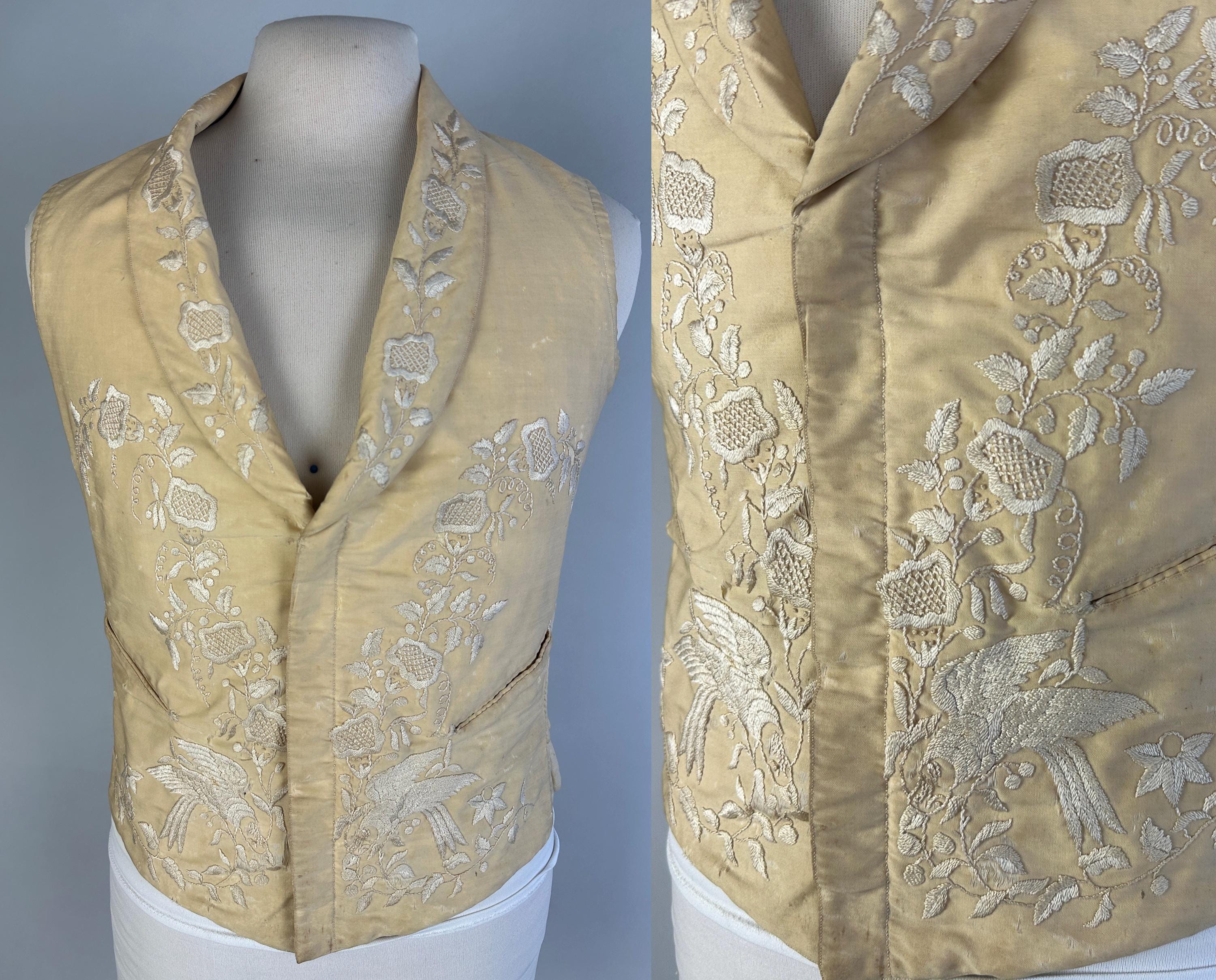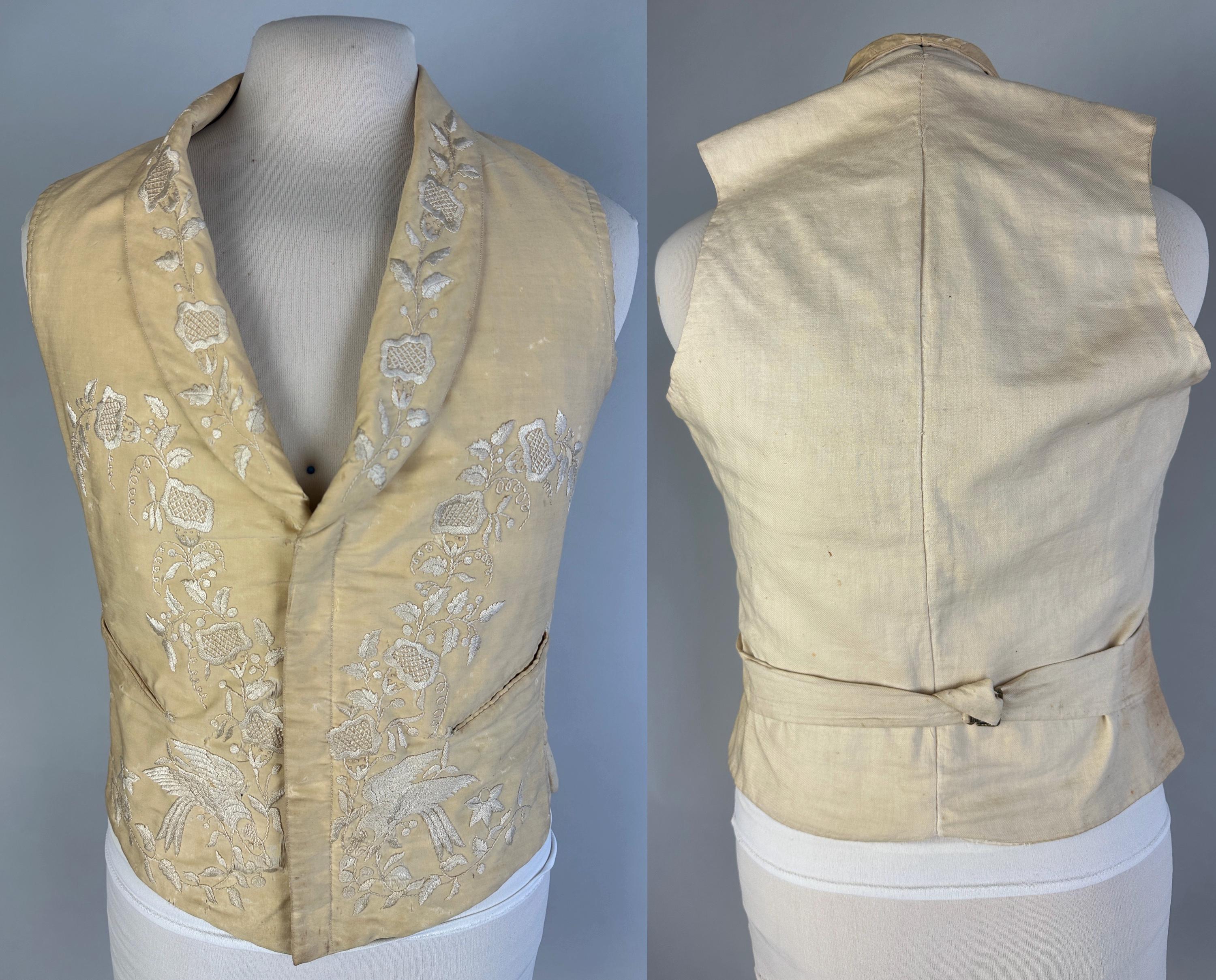 Be a beguiling guy embodying enchantment in this waistcoat from the 1800's! Ecru silk displays beautiful embroidery of flowering vines running parallel to the opening and topping the shawl lapel. Mirrored birds pluck berries from the vines and the white silk floss shimmers with each movement. Ivory cotton makes a full lining and is used for the back where adjuster straps cinch and fasten with a detailed brass buckle. Hidden by a placket are six shell buttons fastening the front and two curved welted pockets make a lovely enhancement. This vest is in good, very wearable antique condition and still presents beautifully though there is some small shattered spots that are structurally backed by cotton.