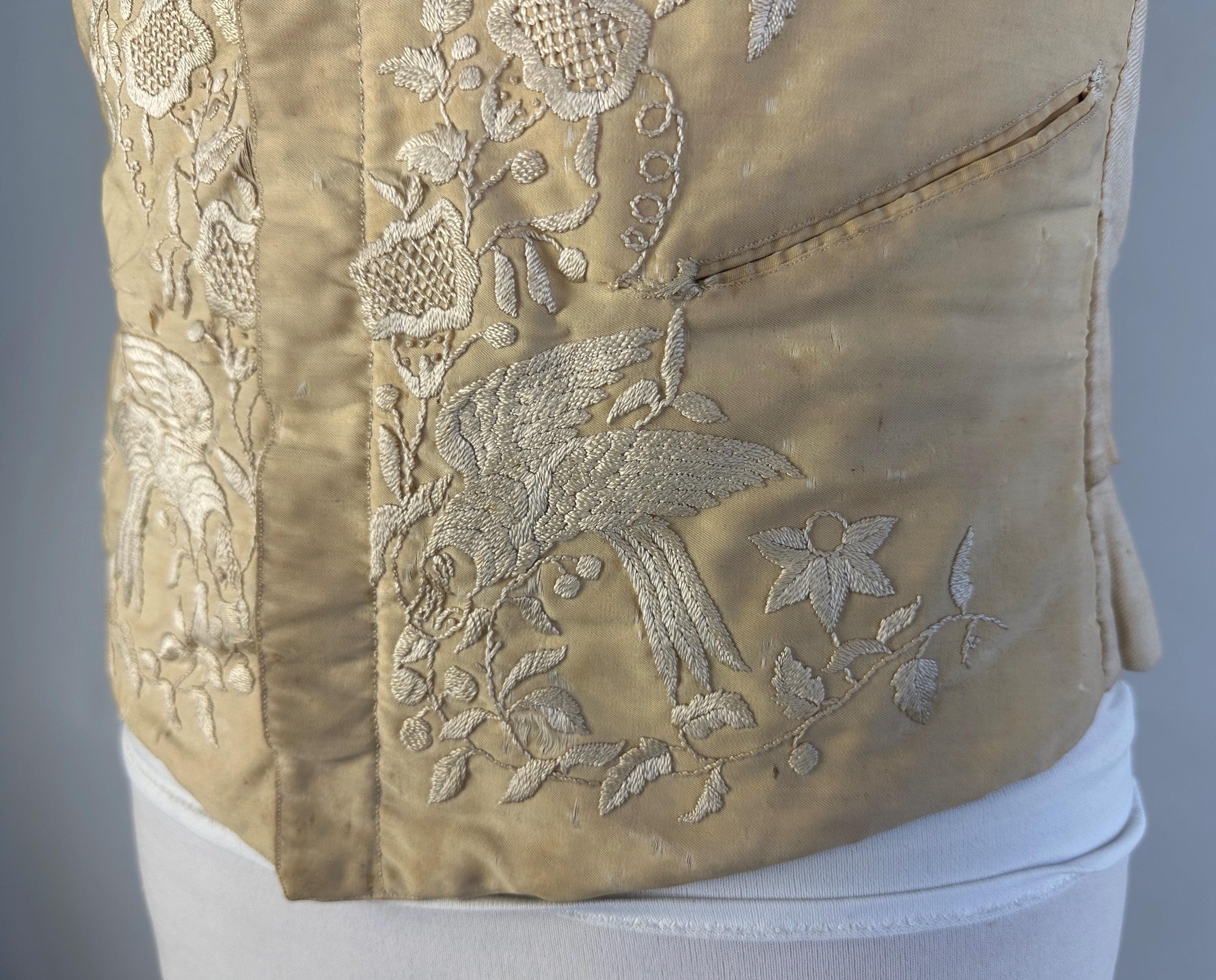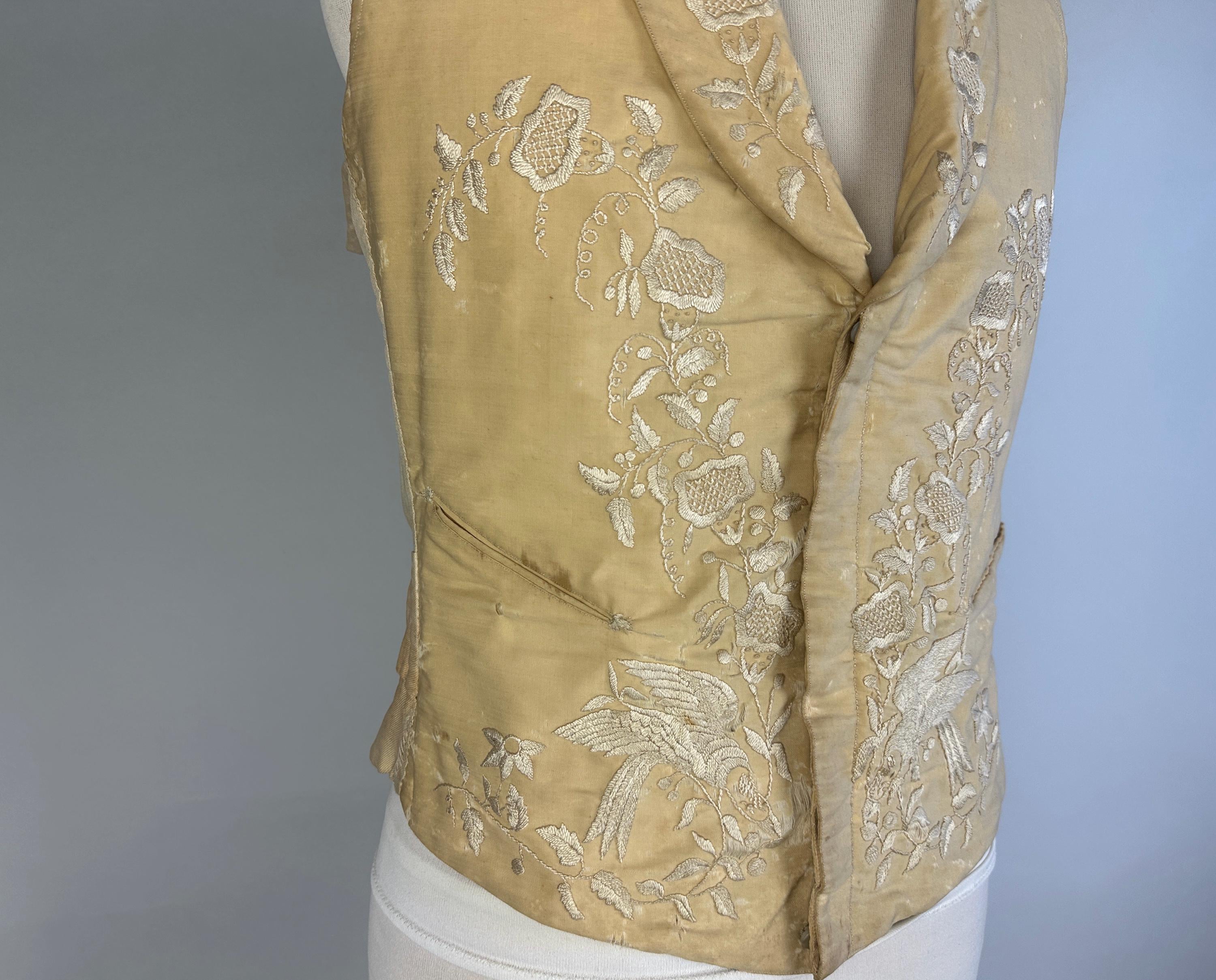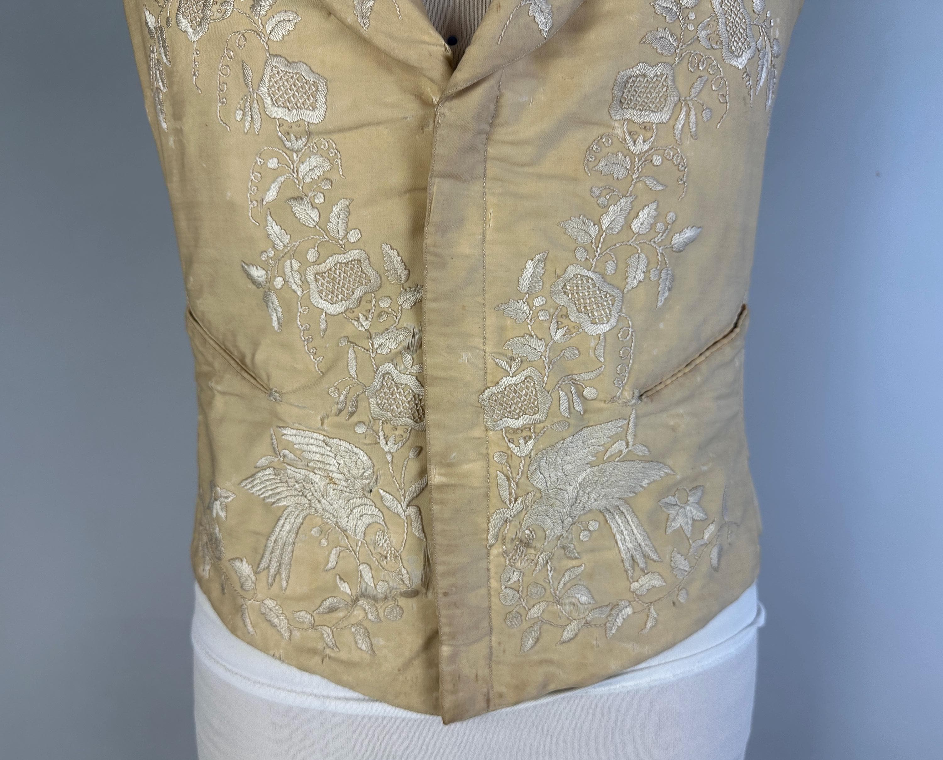 Be a beguiling guy embodying enchantment in this waistcoat from the 1800's! Ecru silk displays beautiful embroidery of flowering vines running parallel to the opening and topping the shawl lapel. Mirrored birds pluck berries from the vines and the white silk floss shimmers with each movement. Ivory cotton makes a full lining and is used for the back where adjuster straps cinch and fasten with a detailed brass buckle. Hidden by a placket are six shell buttons fastening the front and two curved welted pockets make a lovely enhancement. This vest is in good, very wearable antique condition and still presents beautifully though there is some small shattered spots that are structurally backed by cotton.